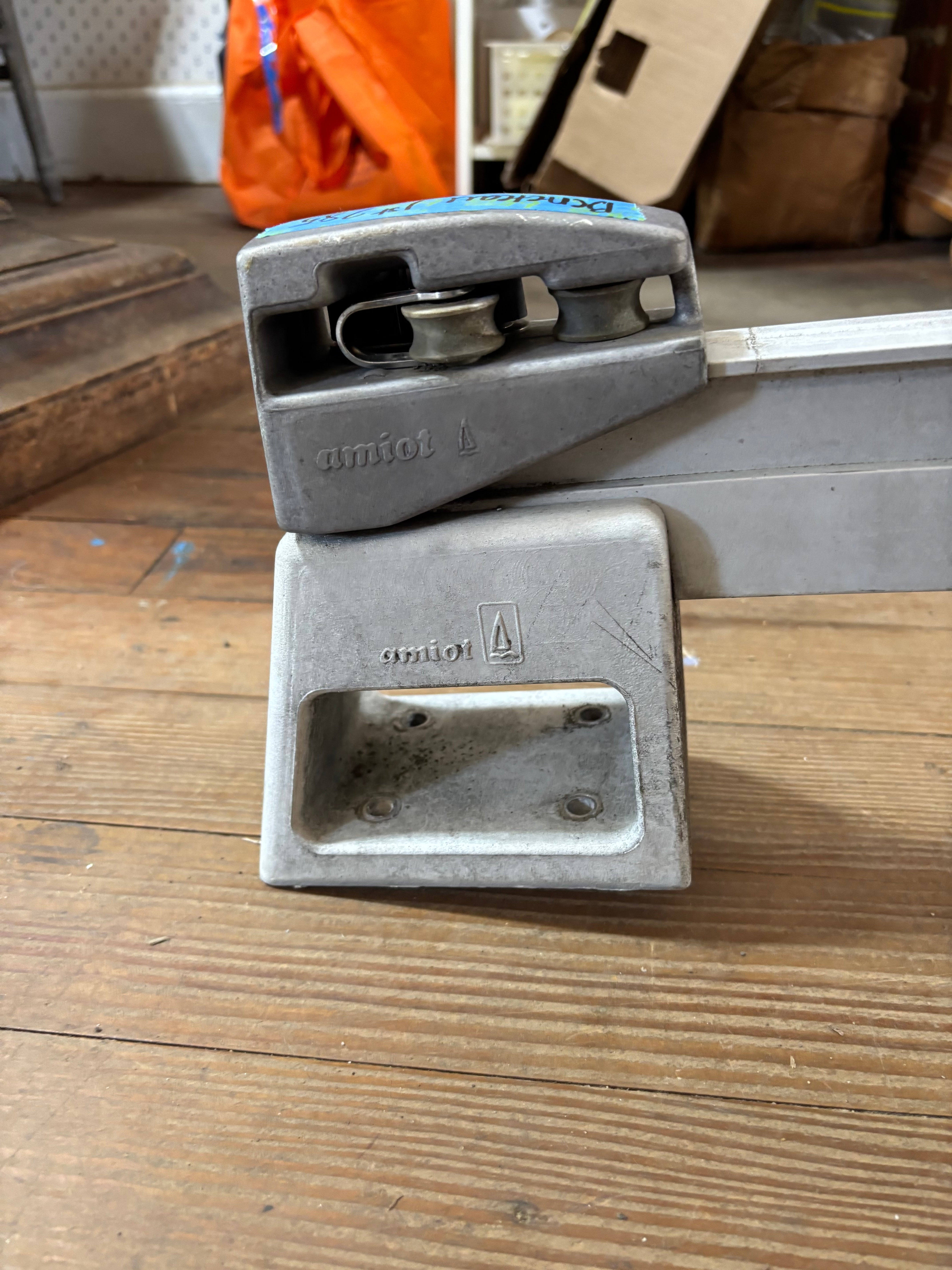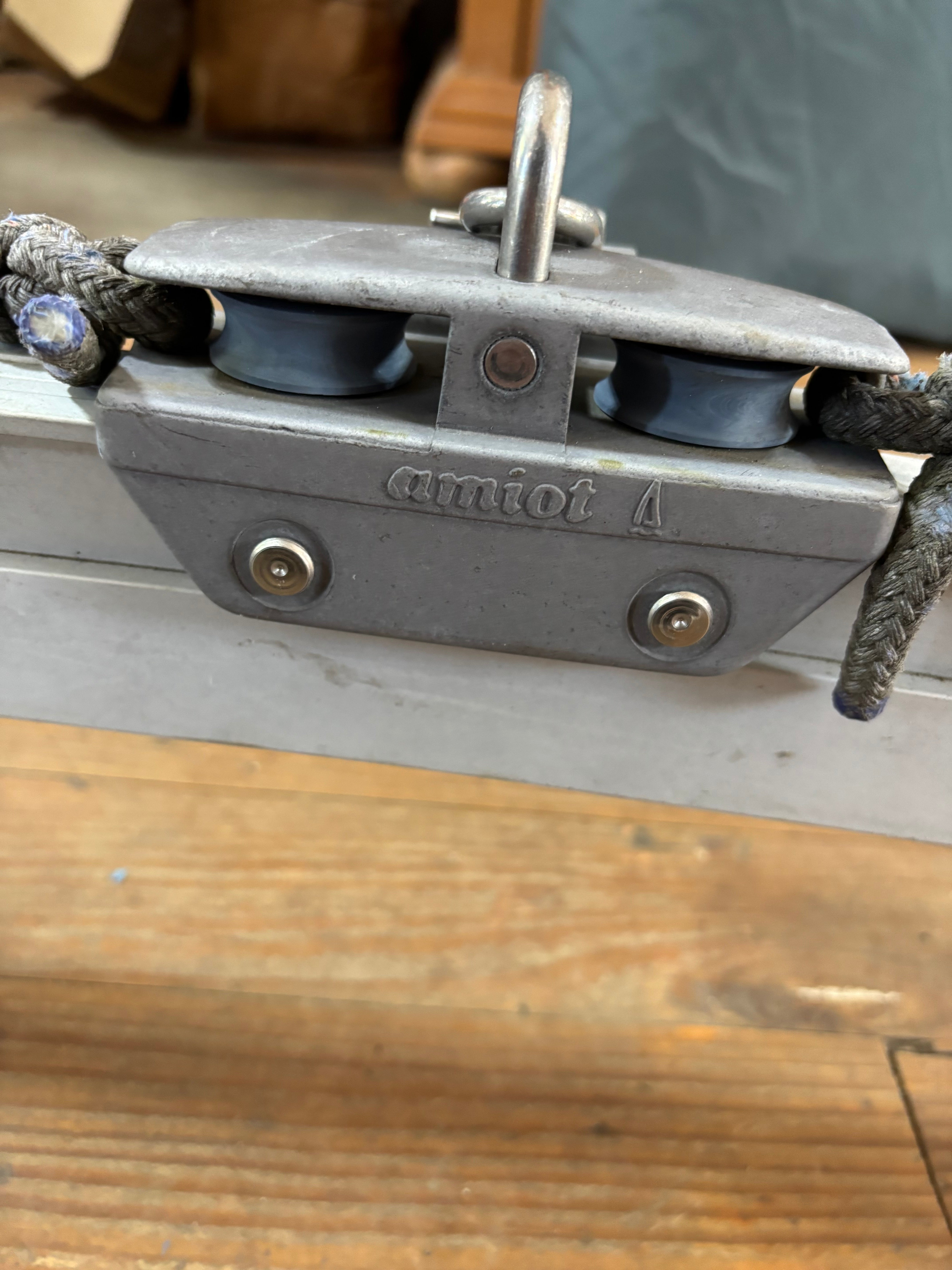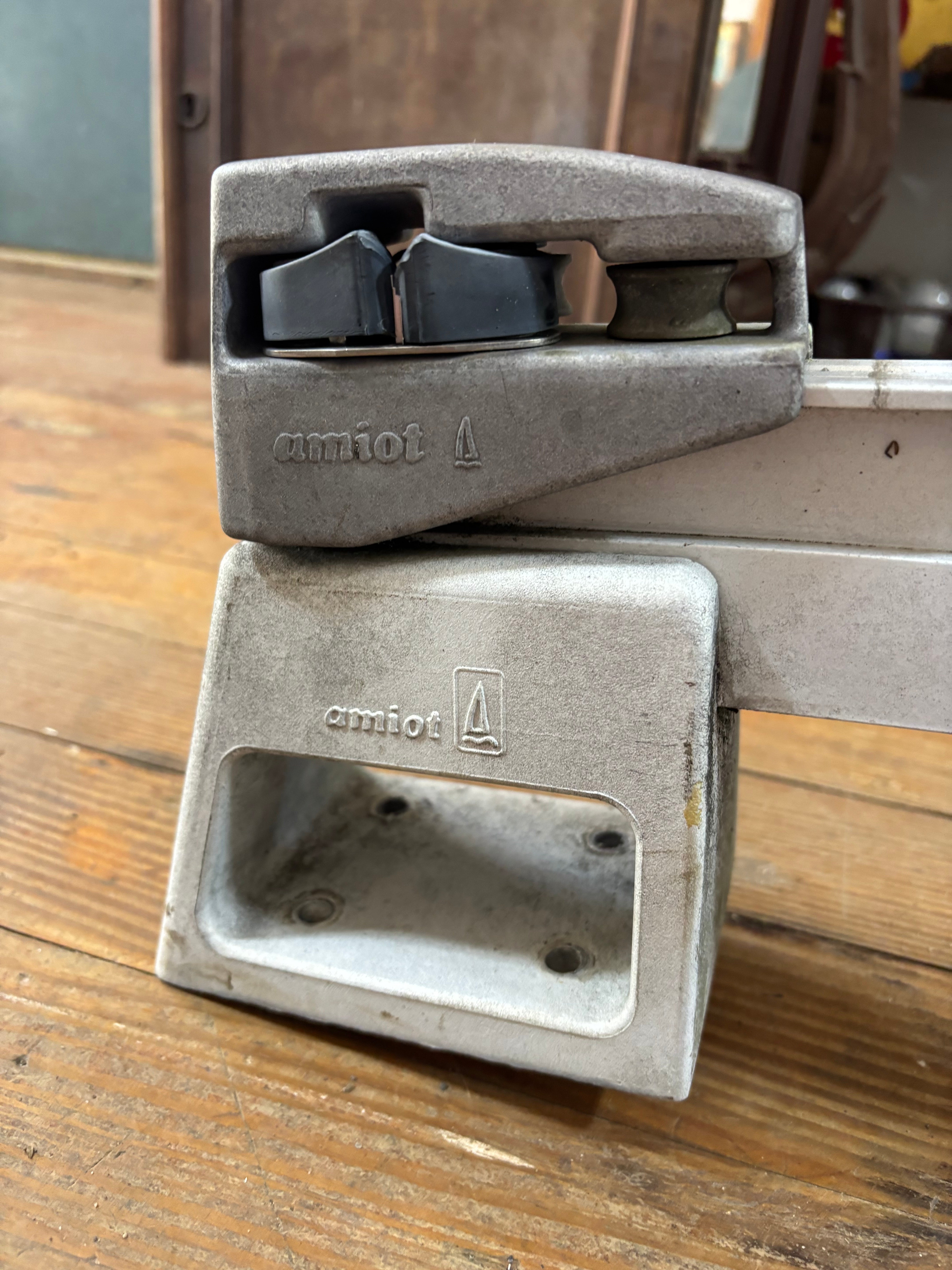 This amiot traveller is in great condition. It is slightly curved and is mounted on raised bases. This traveller was removed off of a beneteau 285 first. The traveller is 41” total length and has a 1 1/4” track size. The ends of this traveller are fixed with a cam cleat on each and a 1/2” shave. The center car rolls smoothly and will come with a lewmar double block. The block has a 2 1/4” sheave and fits MAX 1/2” line diameter. The mounting bases are 4 3/4” long x 3 1/2” wide and are 4 5/8” tall. They mount with 4 bolts, the bolt pattern is 2 5/8” long x 2” wide. Requires a 5/16” bolt. Total height of this traveller (measured right in the middle) is 7 5/8” tall.
