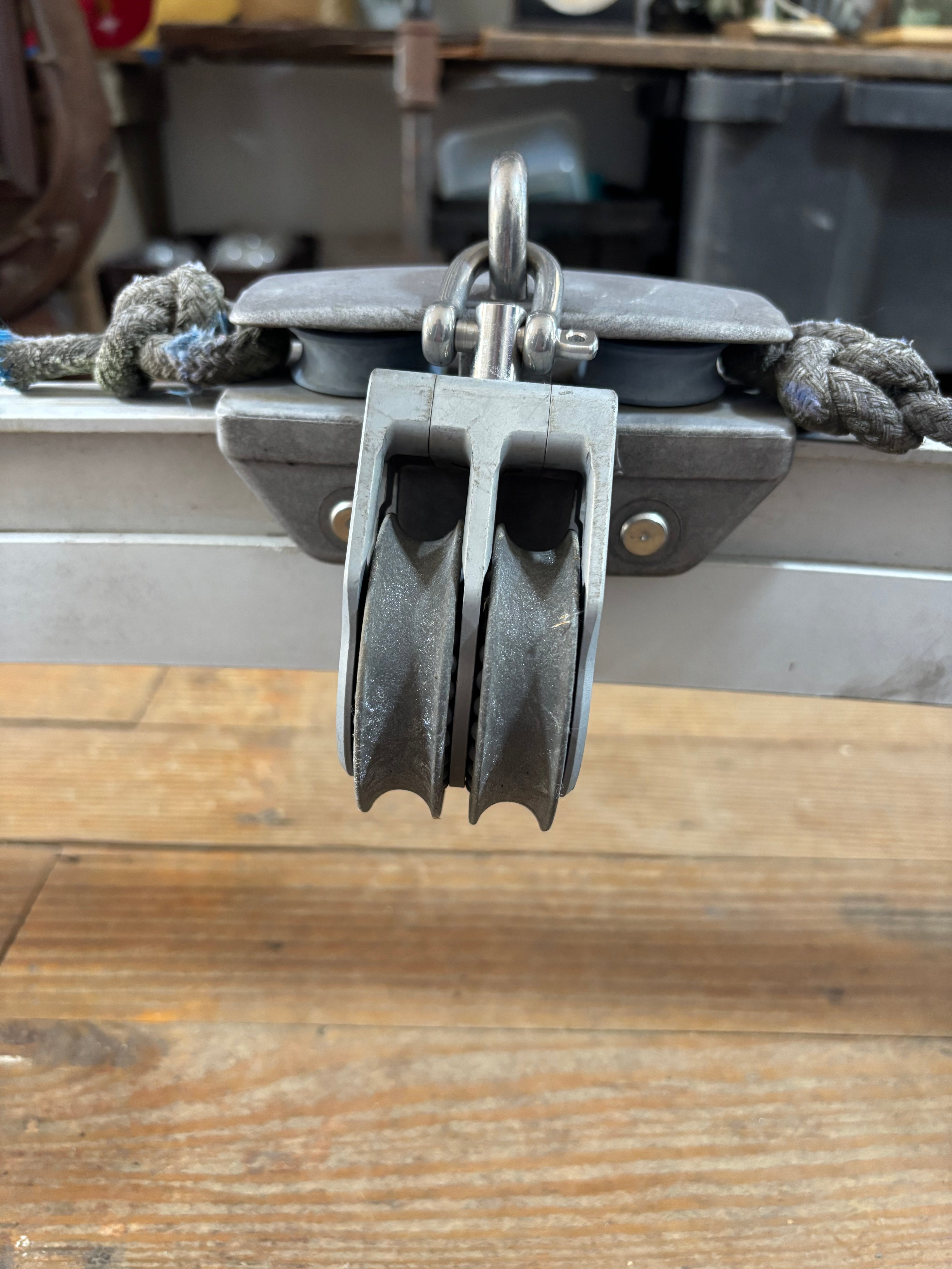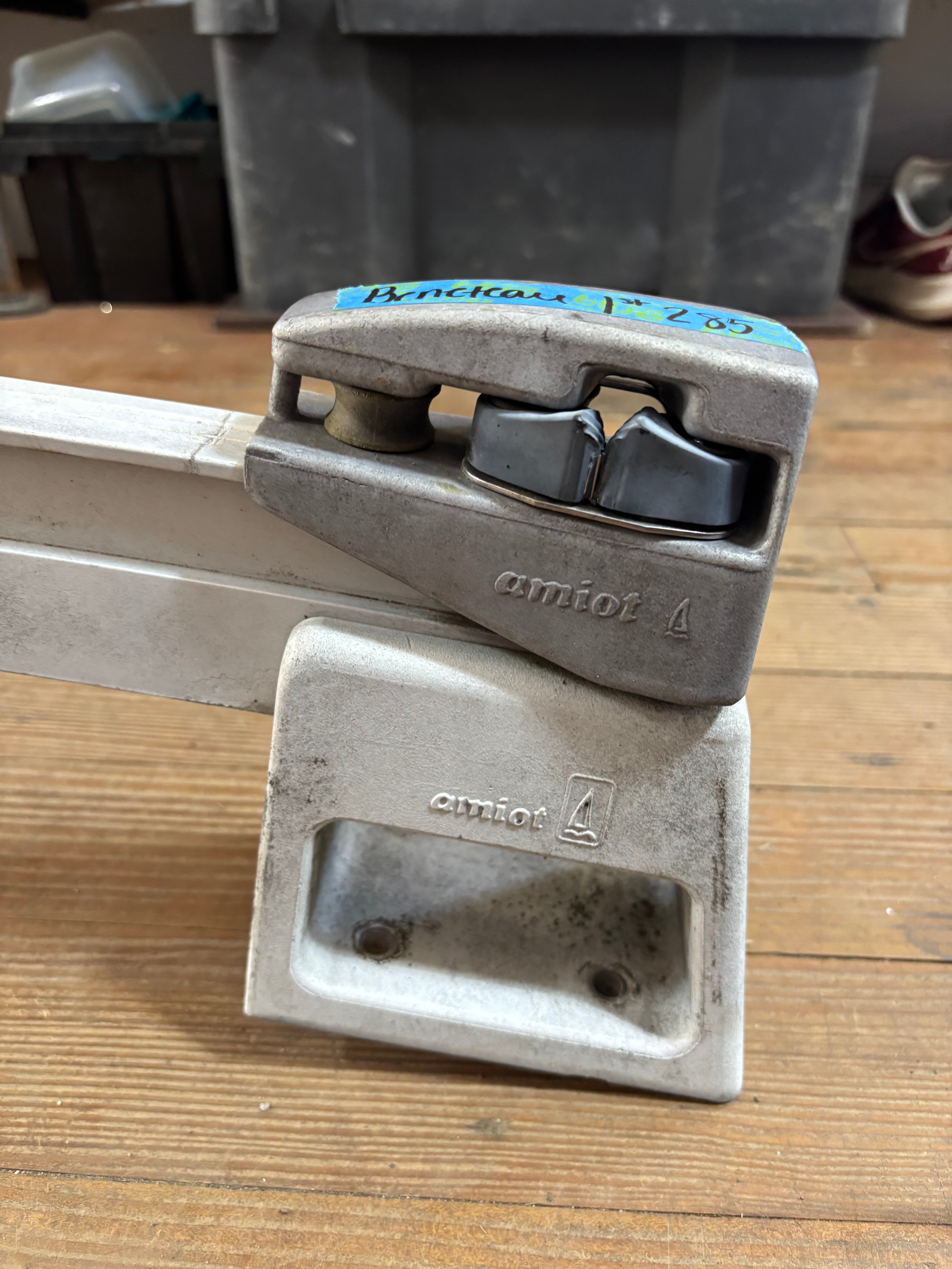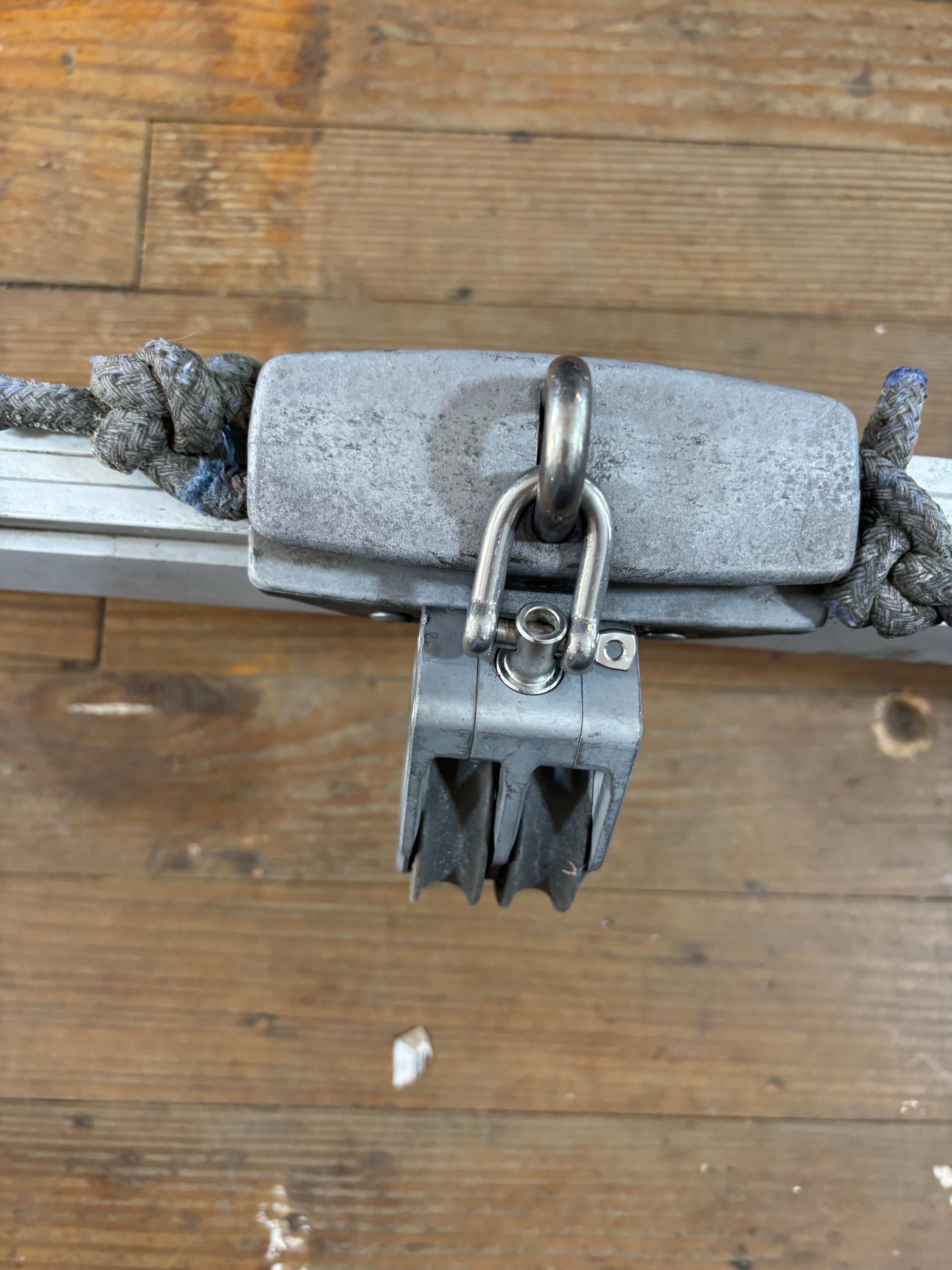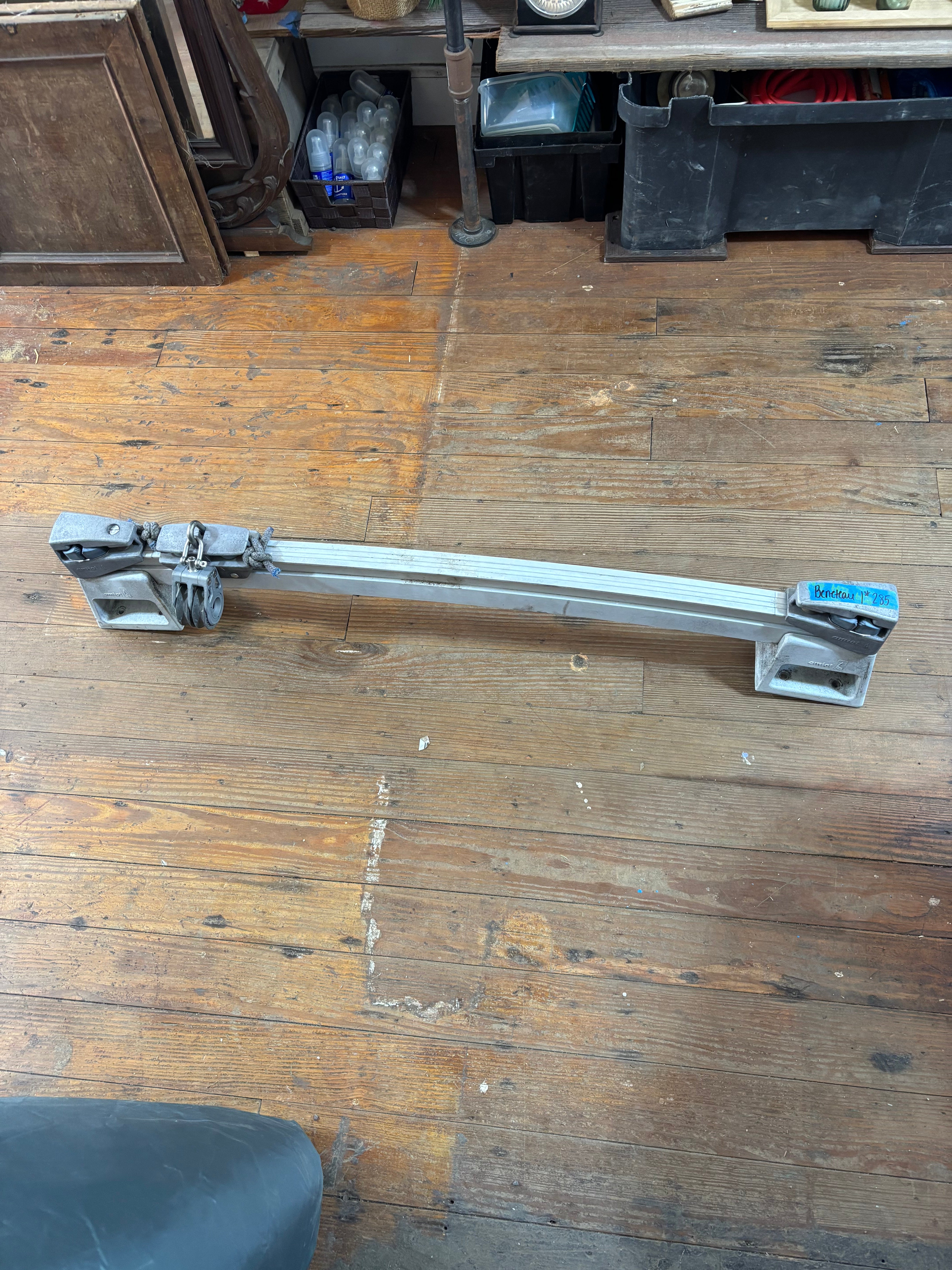 This amiot traveller is in great condition. It is slightly curved and is mounted on raised bases. This traveller was removed off of a beneteau 285 first. The traveller is 41” total length and has a 1 1/4” track size. The ends of this traveller are fixed with a cam cleat on each and a 1/2” shave. The center car rolls smoothly and will come with a lewmar double block. The block has a 2 1/4” sheave and fits MAX 1/2” line diameter. The mounting bases are 4 3/4” long x 3 1/2” wide and are 4 5/8” tall. They mount with 4 bolts, the bolt pattern is 2 5/8” long x 2” wide. Requires a 5/16” bolt. Total height of this traveller (measured right in the middle) is 7 5/8” tall.