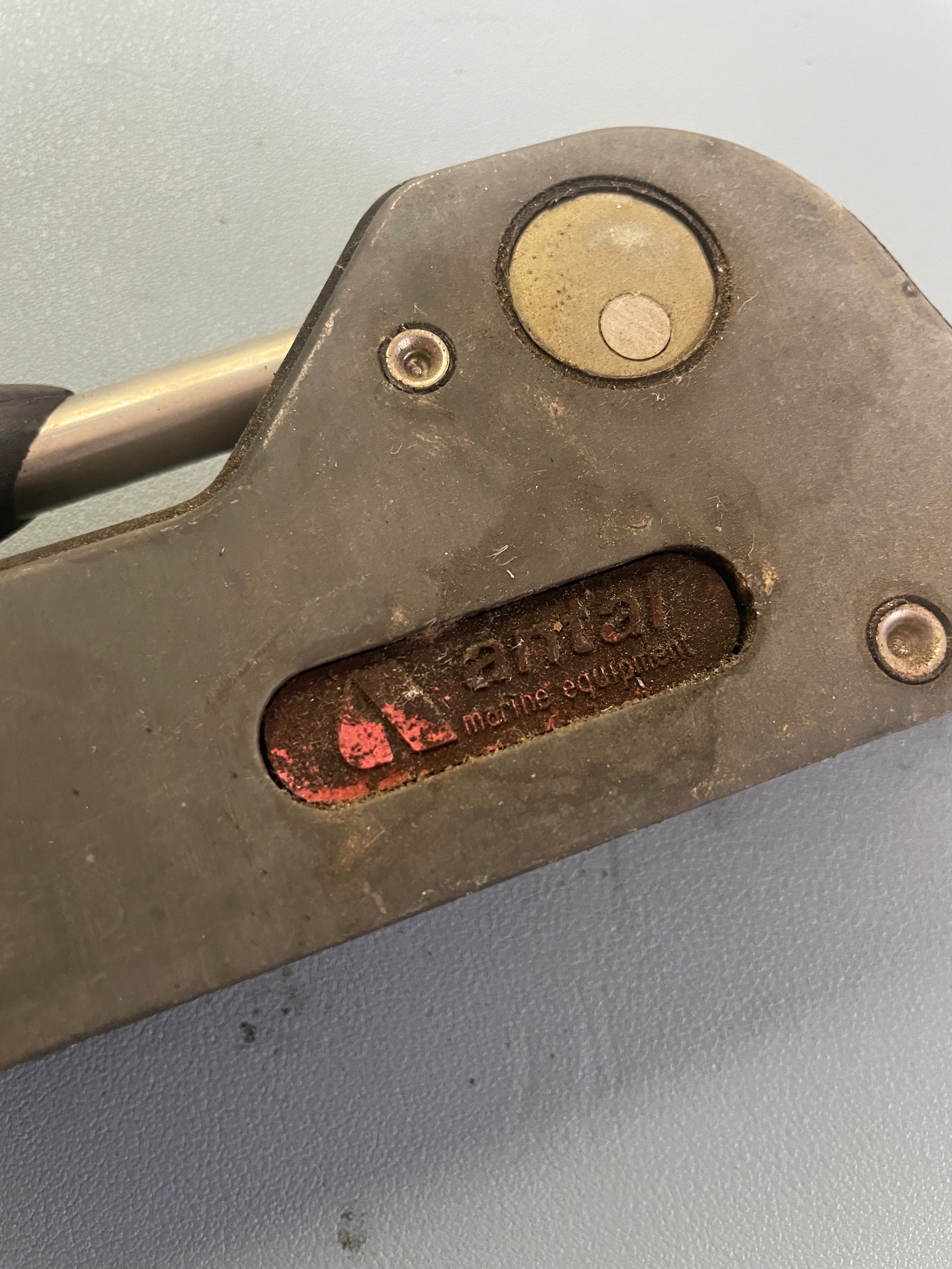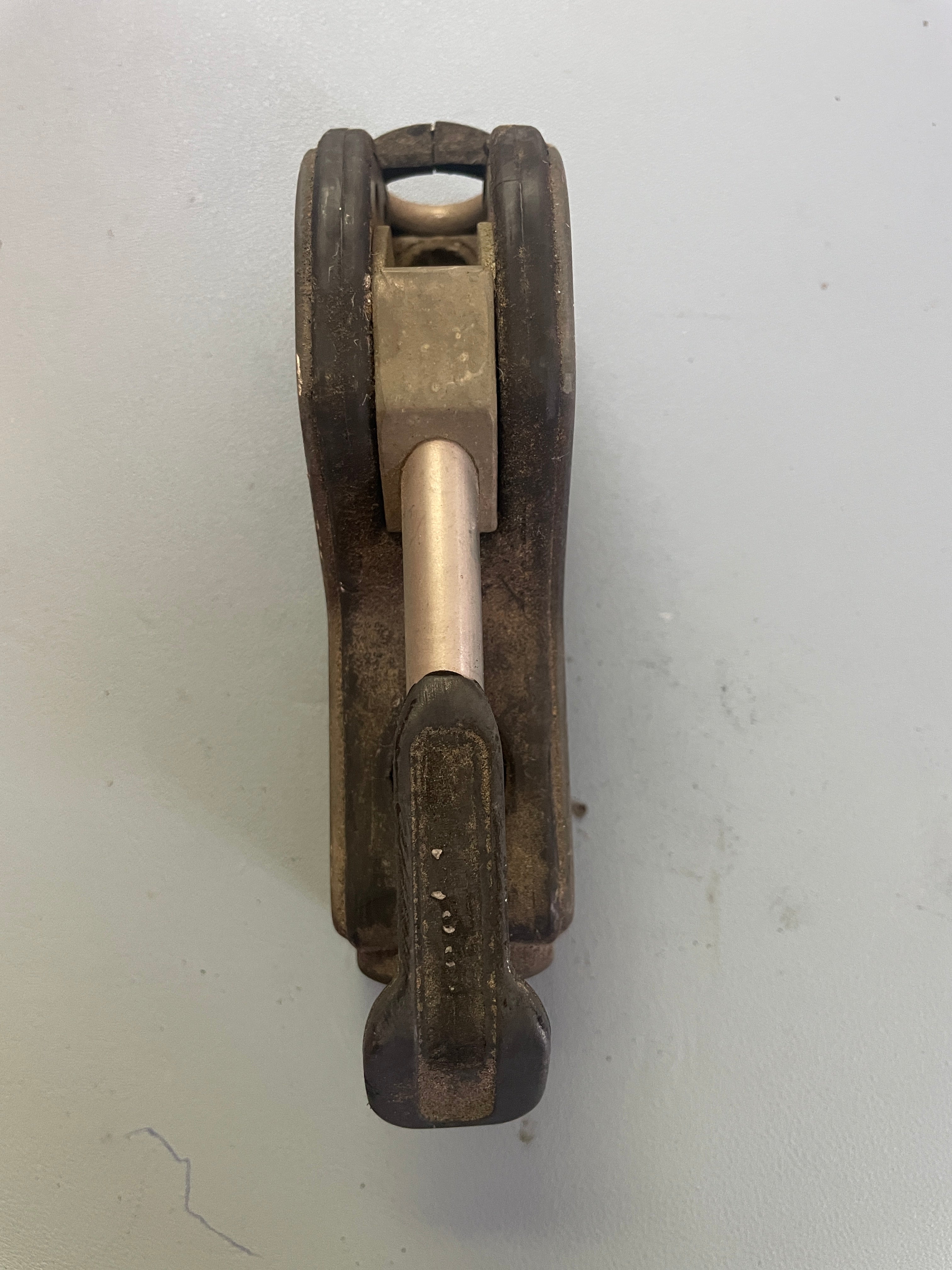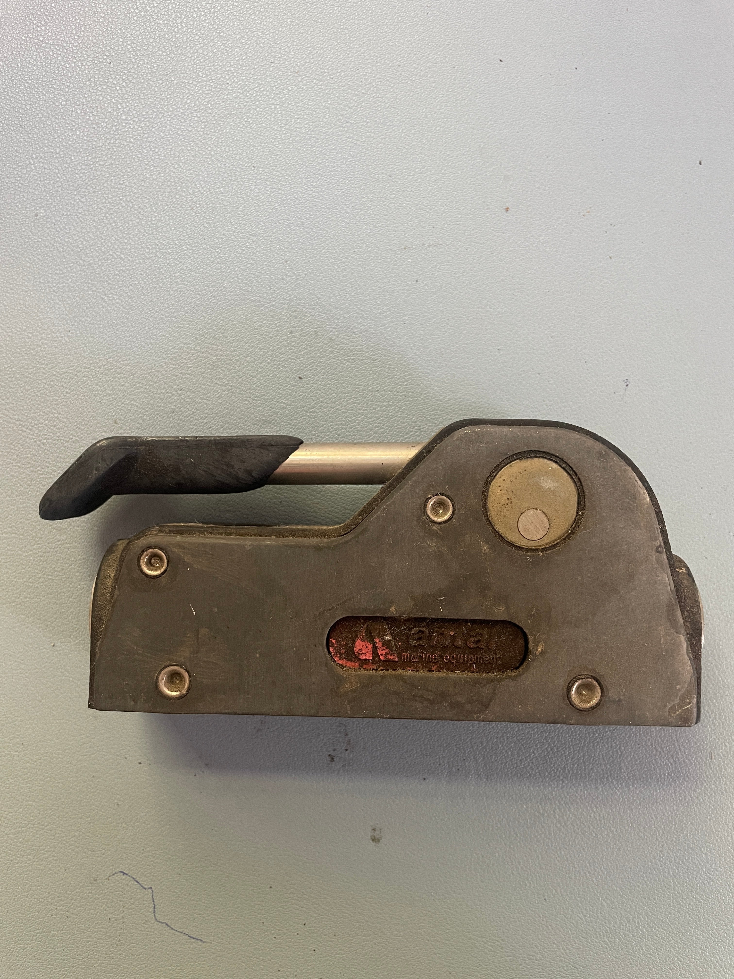 This Antal single rope clutch is in good working condition (it is incredibly dirty but works fine). The base is 5 1/8" long x 1 3/8" wide x 2 5/8" tall. It says 12mm and measuring the hole it is 11/16" diameter.