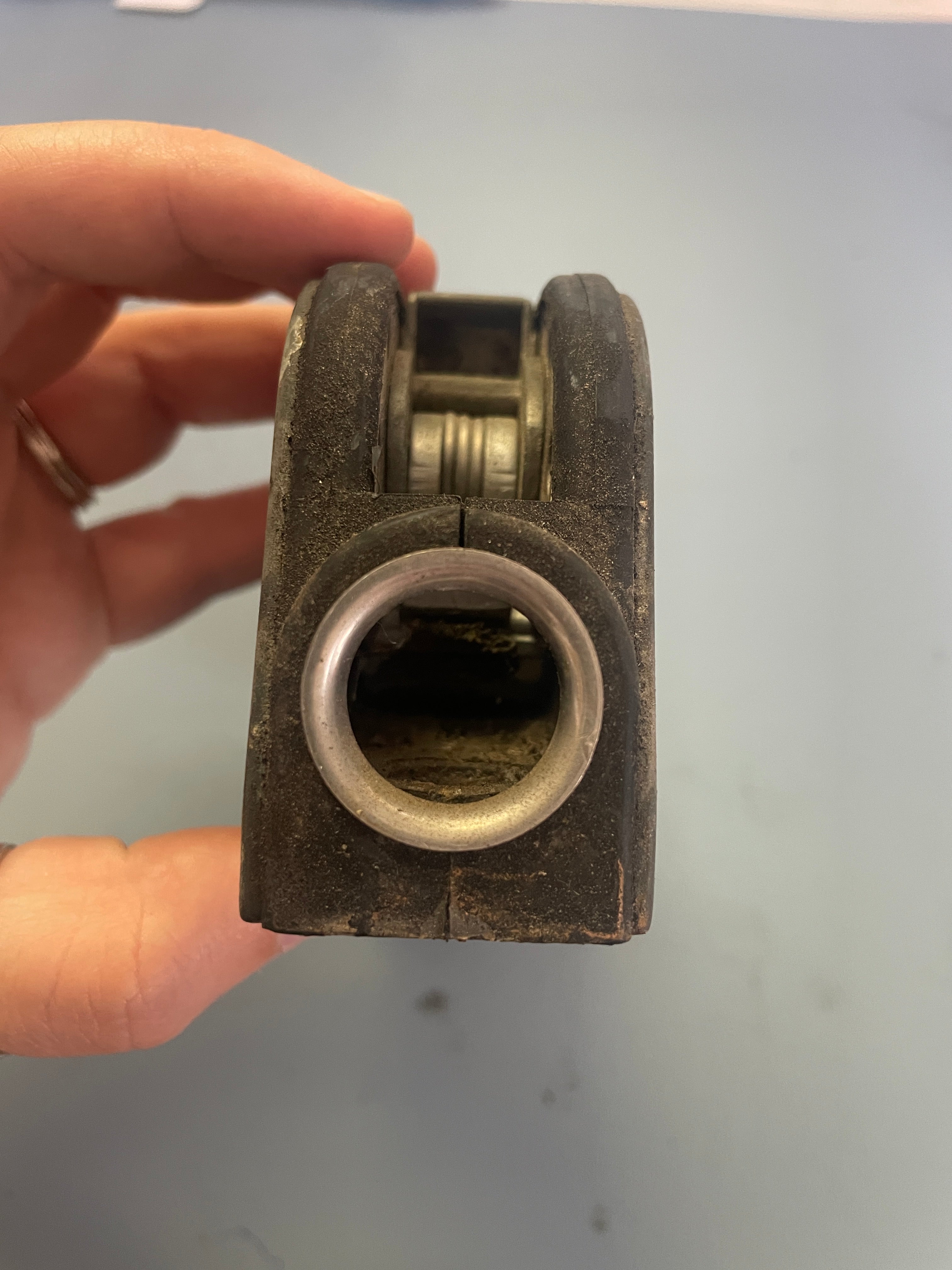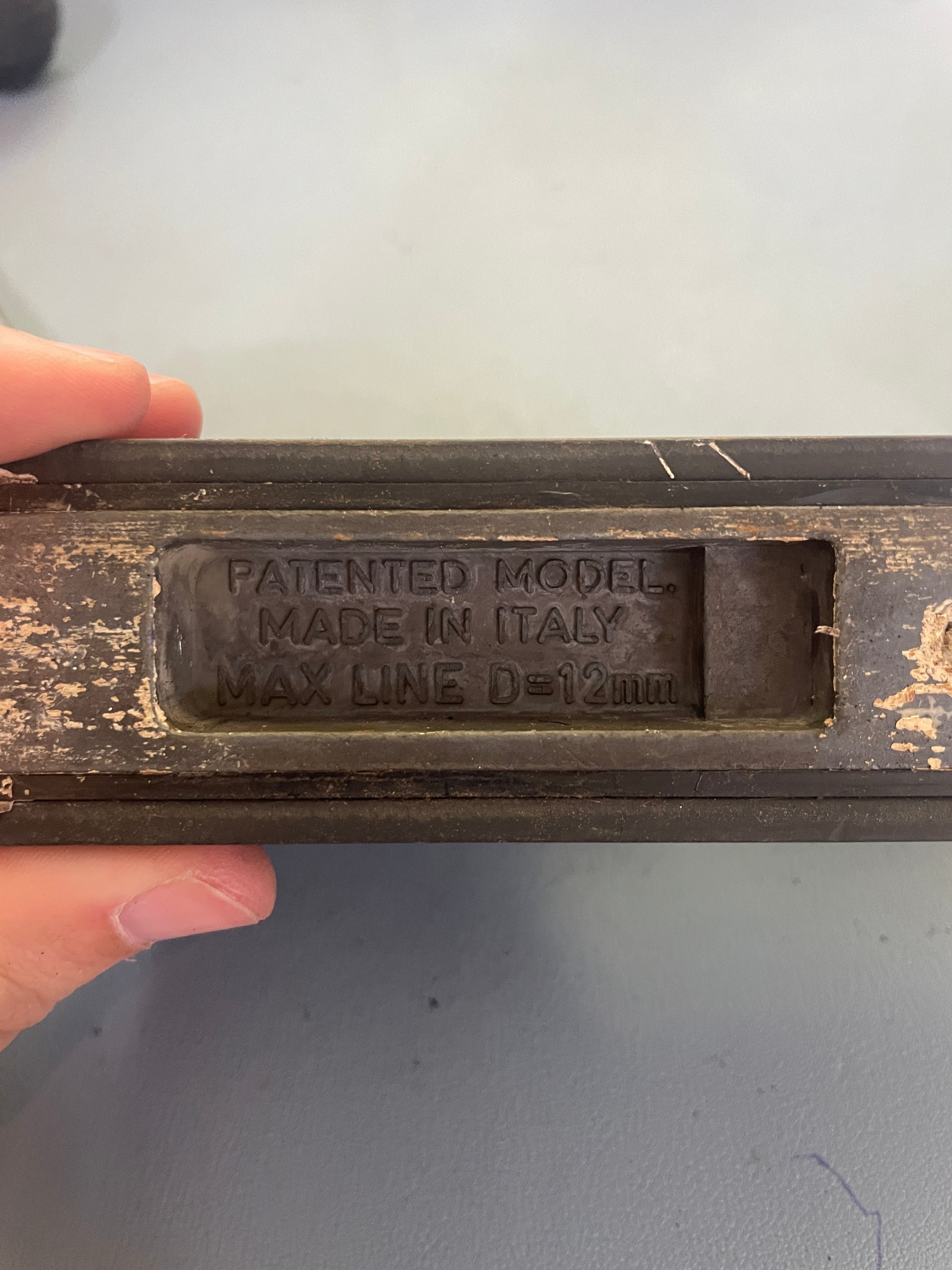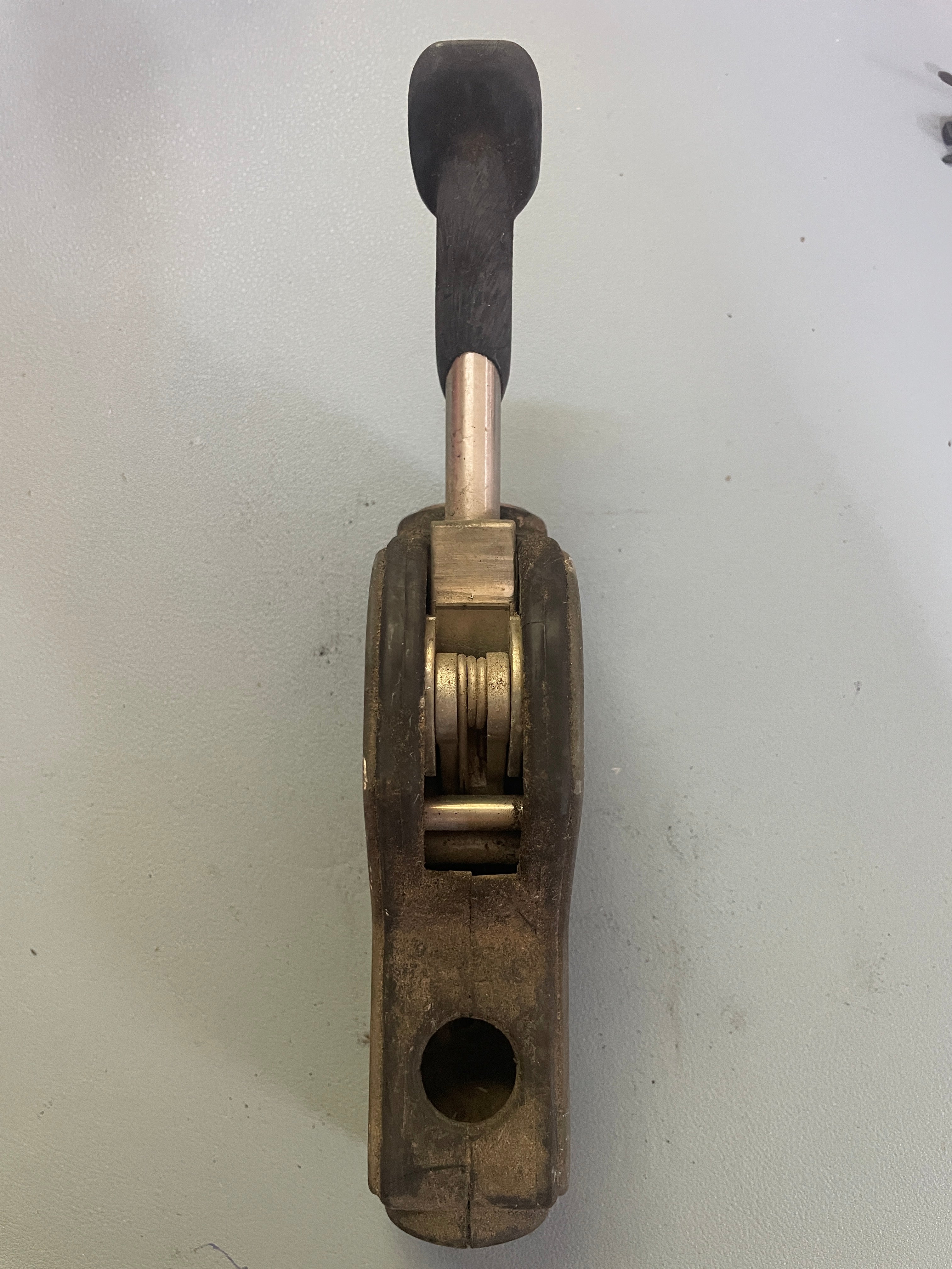 This Antal single rope clutch is in good working condition (it is incredibly dirty but works fine). The base is 5 1/8" long x 1 3/8" wide x 2 5/8" tall. It says 12mm and measuring the hole it is 11/16" diameter.