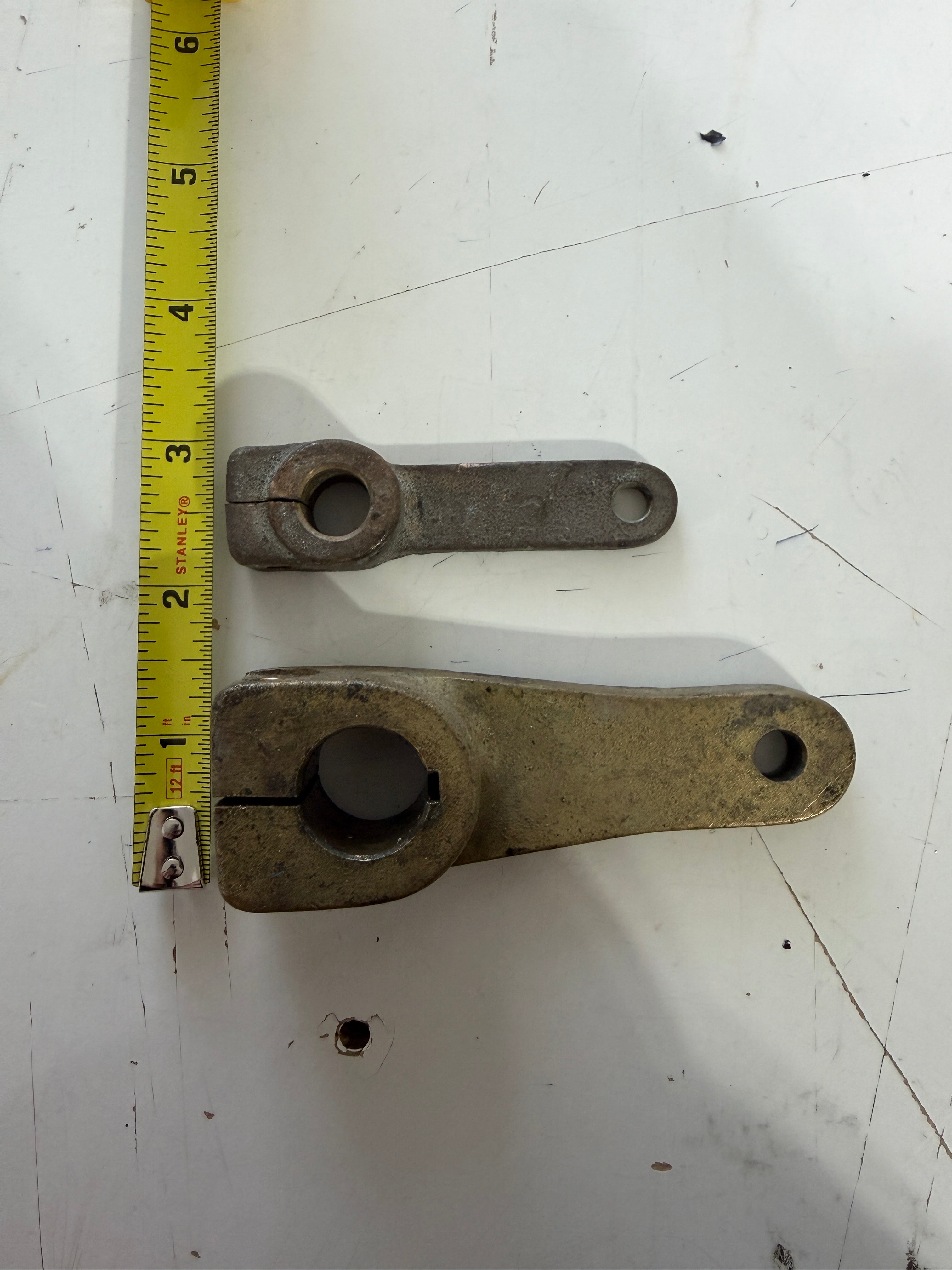 B: The larger arm is 4 1/8" long. The center hole is 3/4" diameter. The bottom hole is 5/16" diameter.