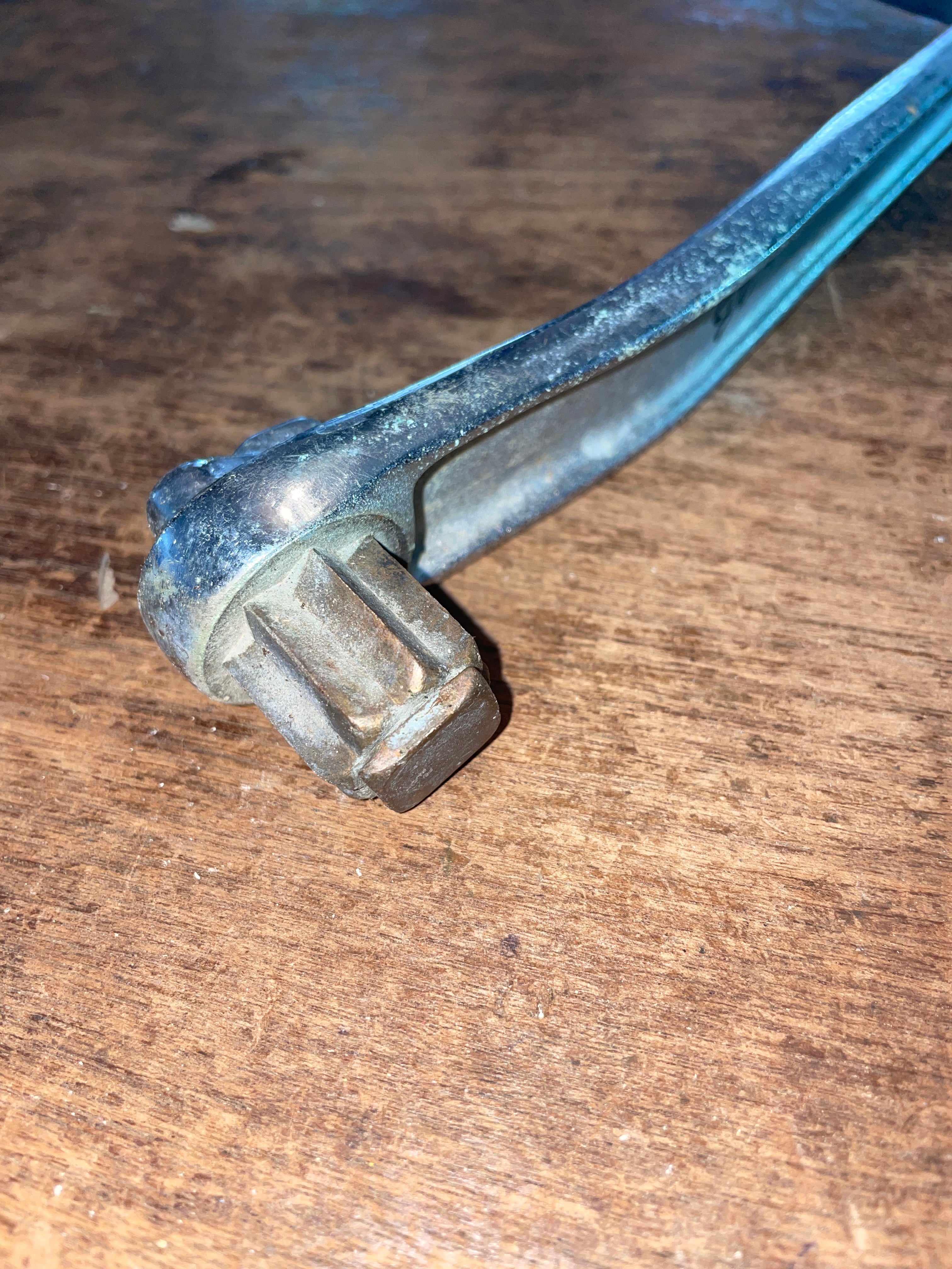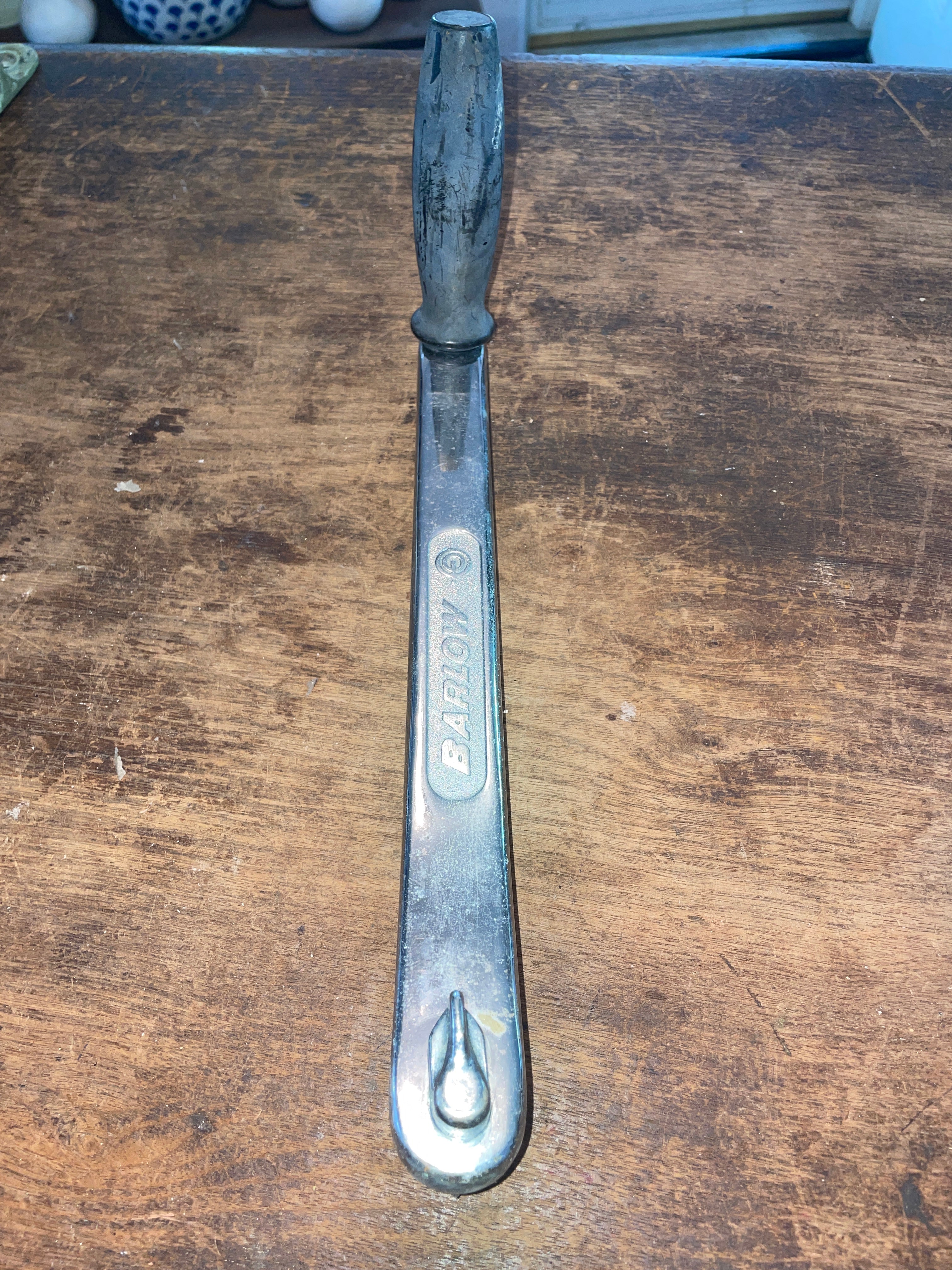 This Barlow locking winch handle works as should. It is 11 1/4” long. Stainless has usual scratching from use. Star base. Plastic Handle.