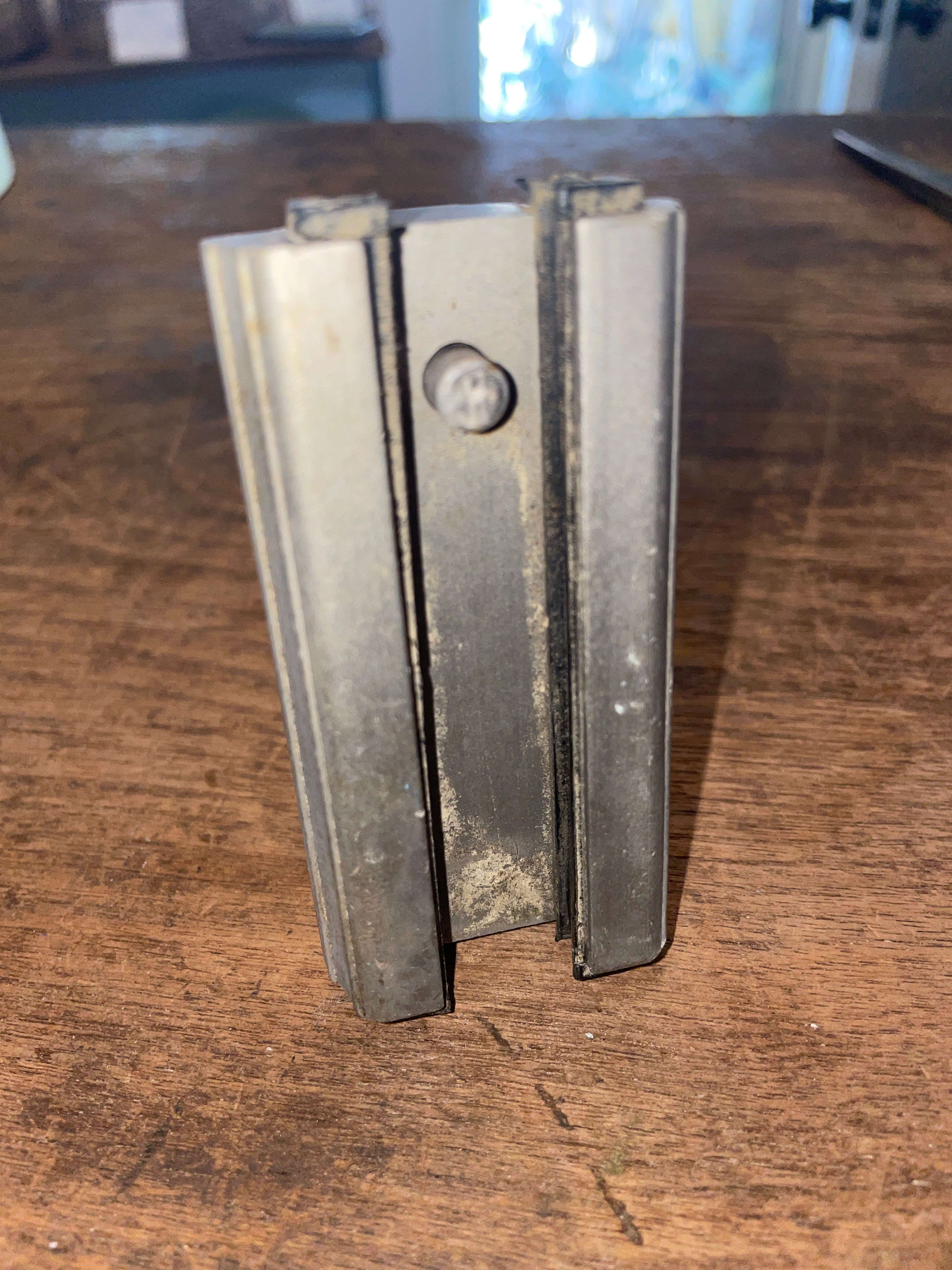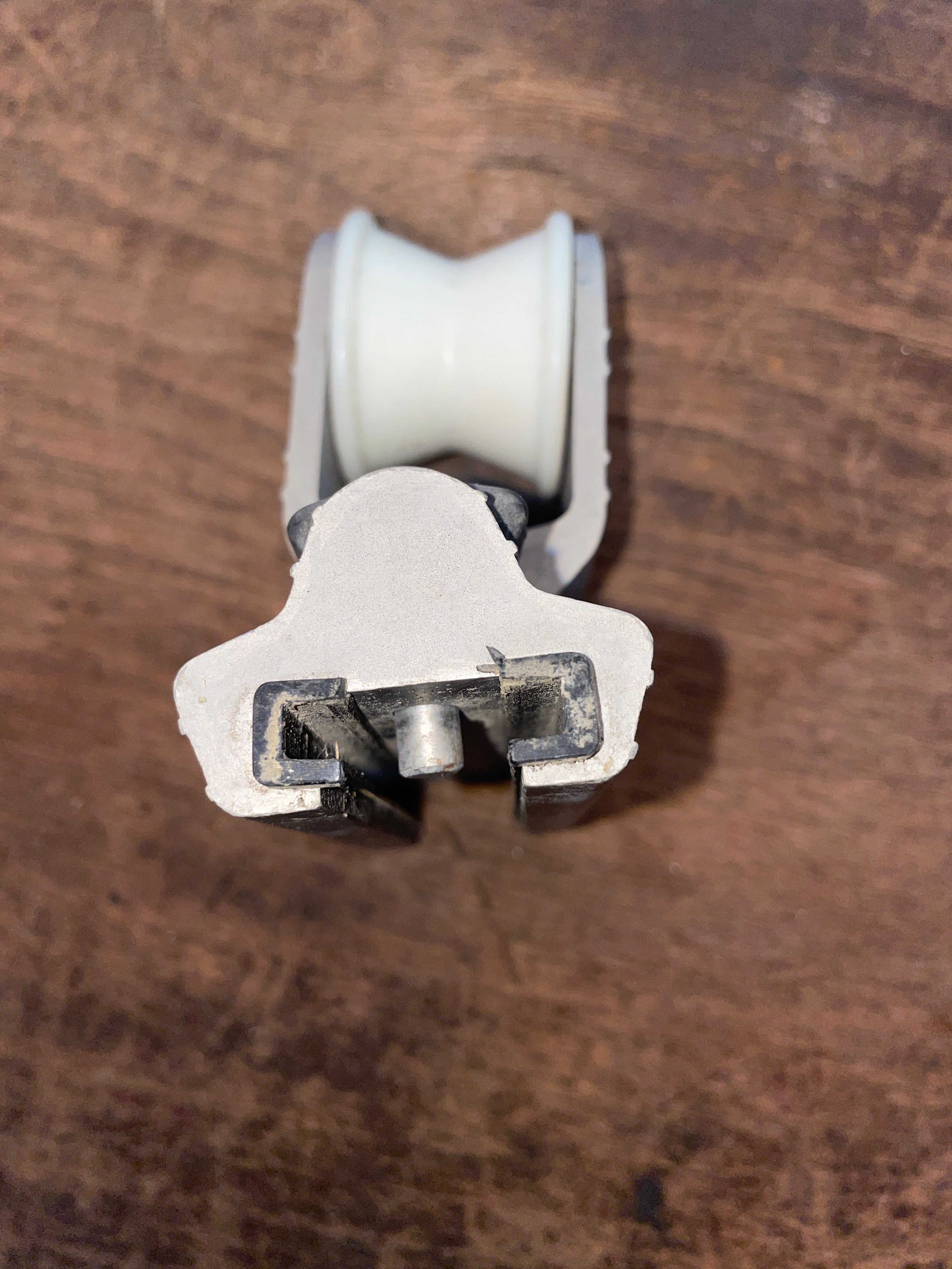 This aluminum Barton sheet block is in great condition. The track is 1” without the slides in. The track is 7/8” with the slides (but they can be removed). The track Length is 3 1/4” long. Stands 3 3/8” tall. Block width is 1”.