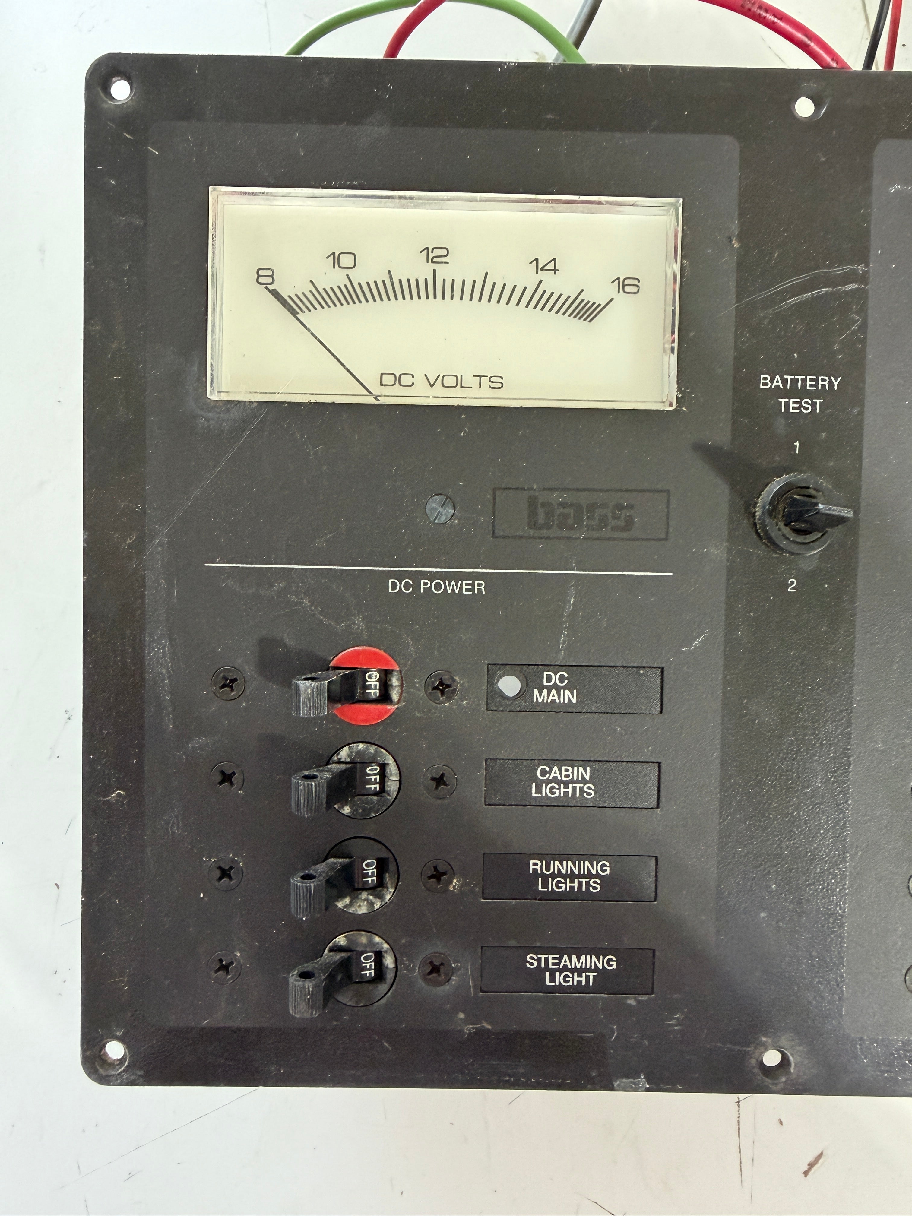 This bass products Dc panel is in good condition. It does have some scratching and dirty areas. I think it could be cleaned up well. The panel is 13 switch and has the 2 switch battery test. Has the DC volt meter. Model 90-2010J28-1. It measures 11" long x 8" wide x 4" deep.