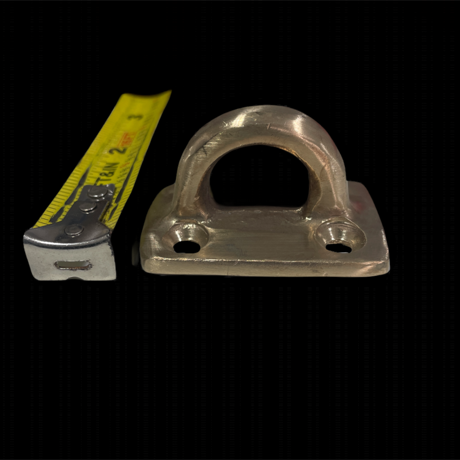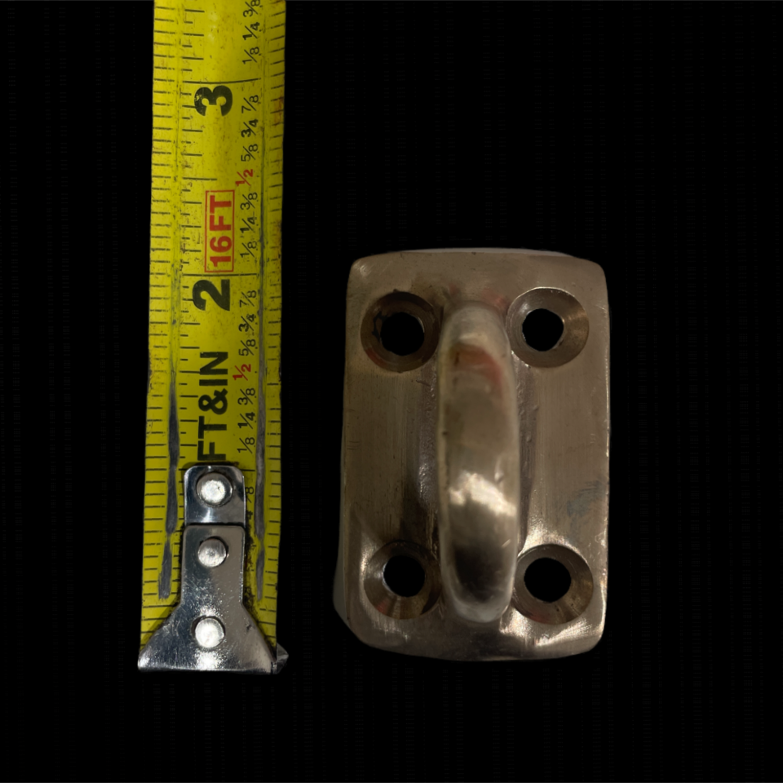 Bristol bronze BB1304 rectangle pad eye. 2 1/8" long x 1 3/8" wide. Has a 5/8" clearance under center bail. 1/4" bail diameter. It takes #10 screws (not included).