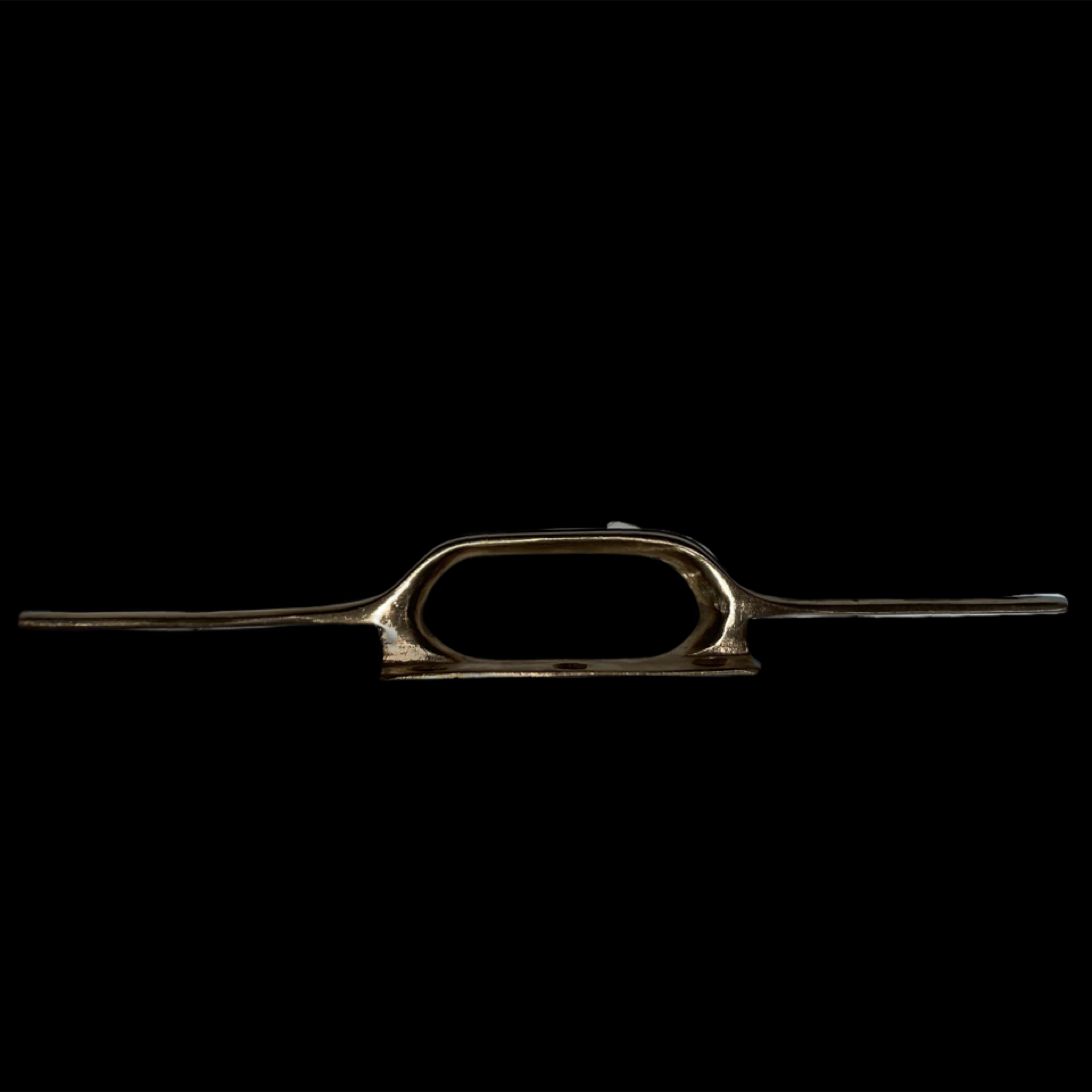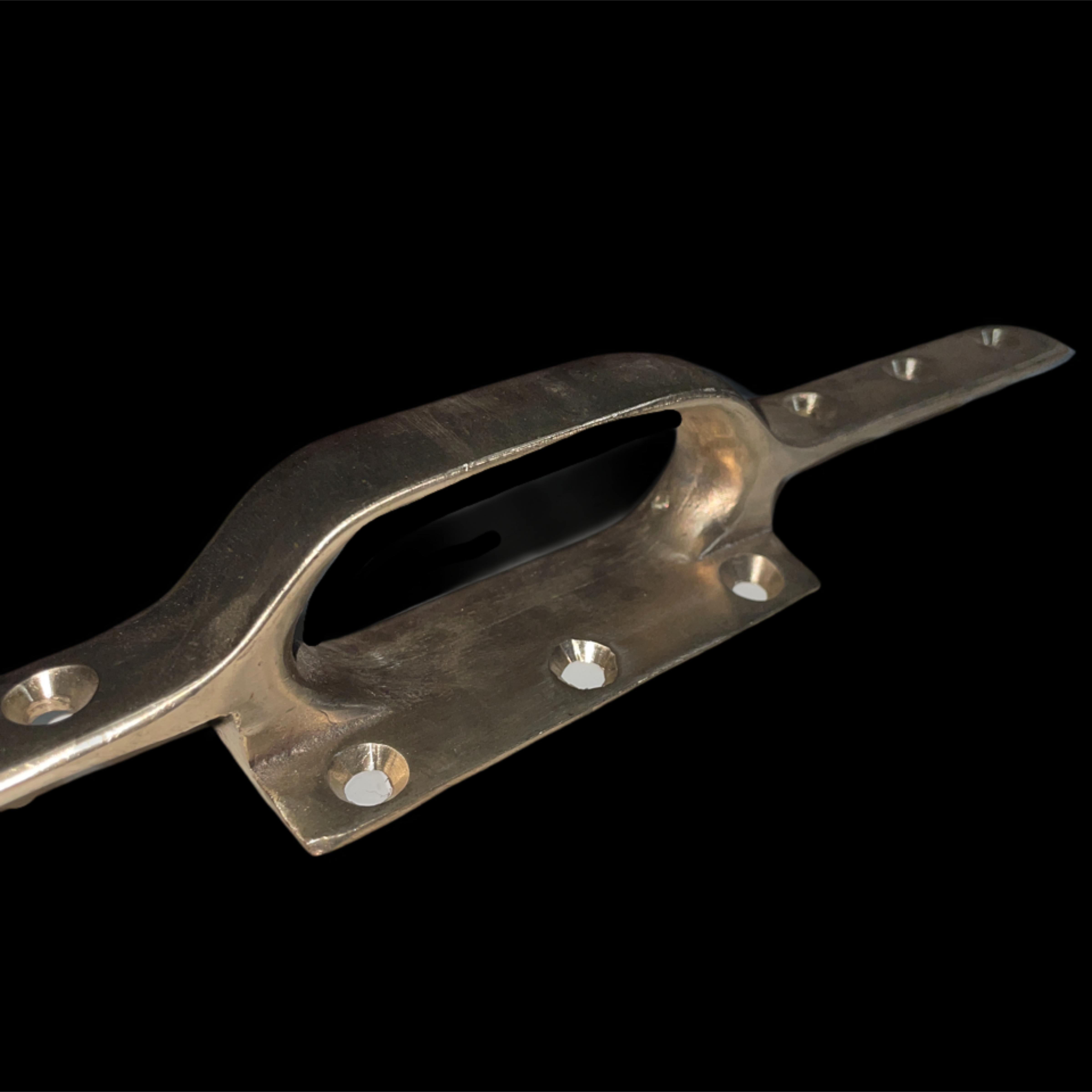 Bristol bronze BB4397 mid rail chock cleat. Used midship or aft set into toe rail to guide spring lines/stern lines and keep away from bright work. This cleat measures 10 1/4" long x 5/8" wide. The base is 1 1/4" x 1 5/16". The inside diameter of the chock is 2 7/8" x 1".