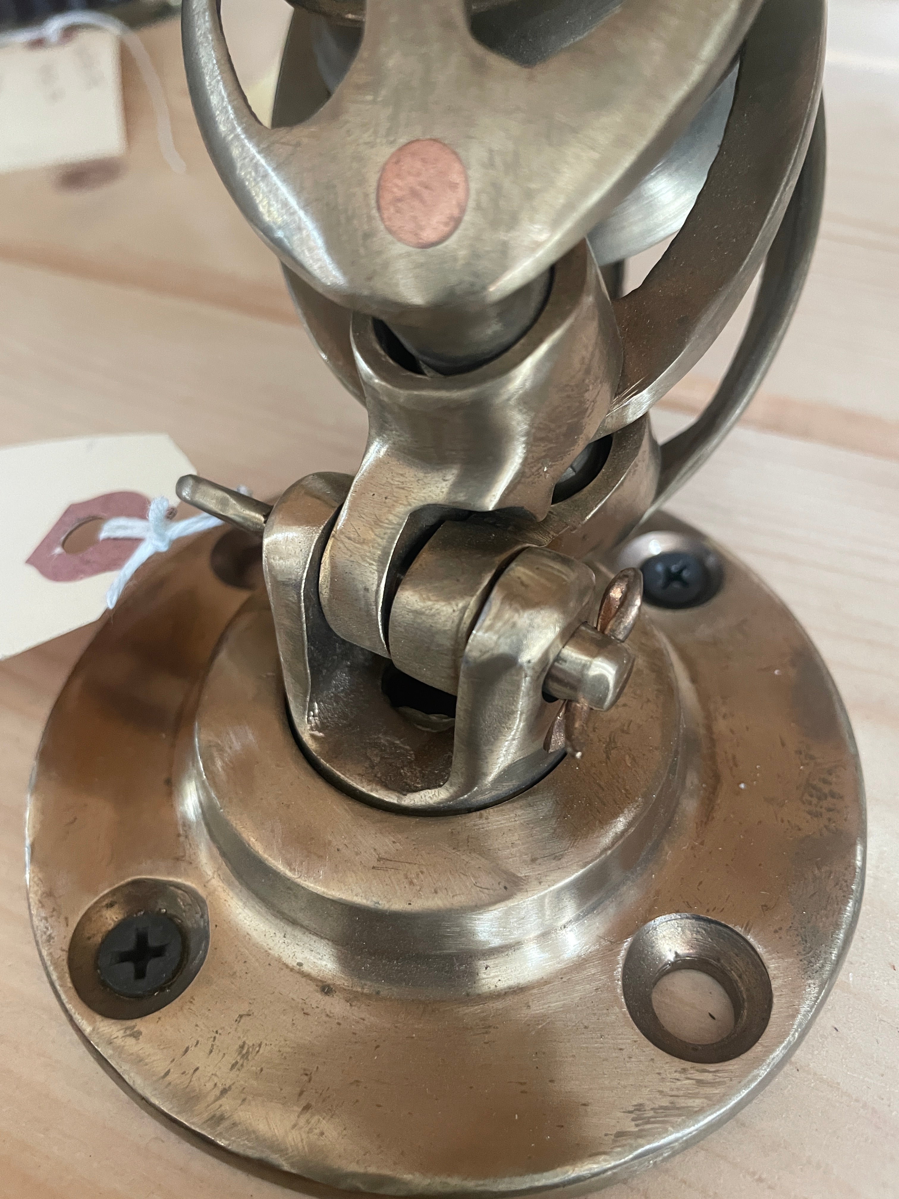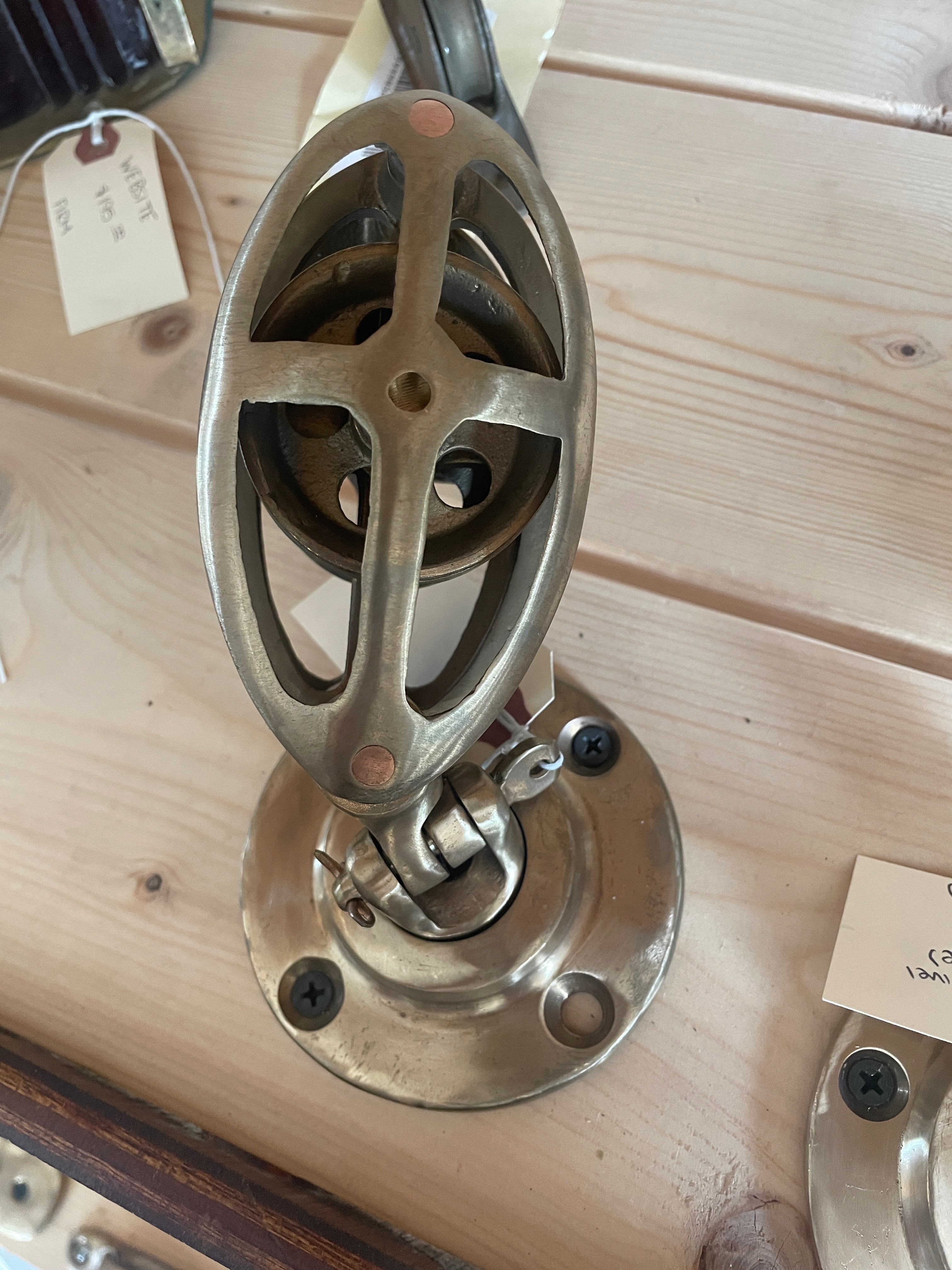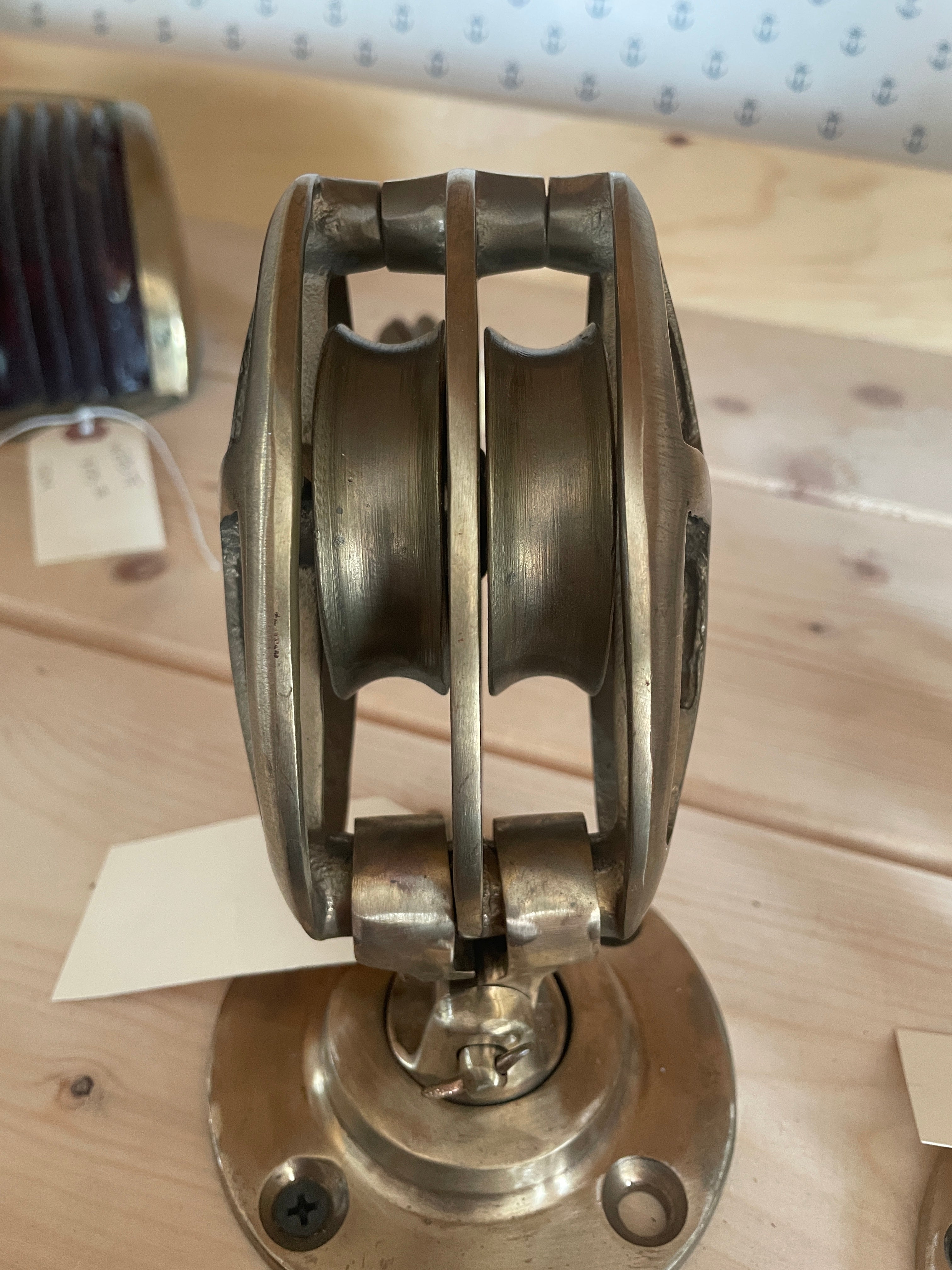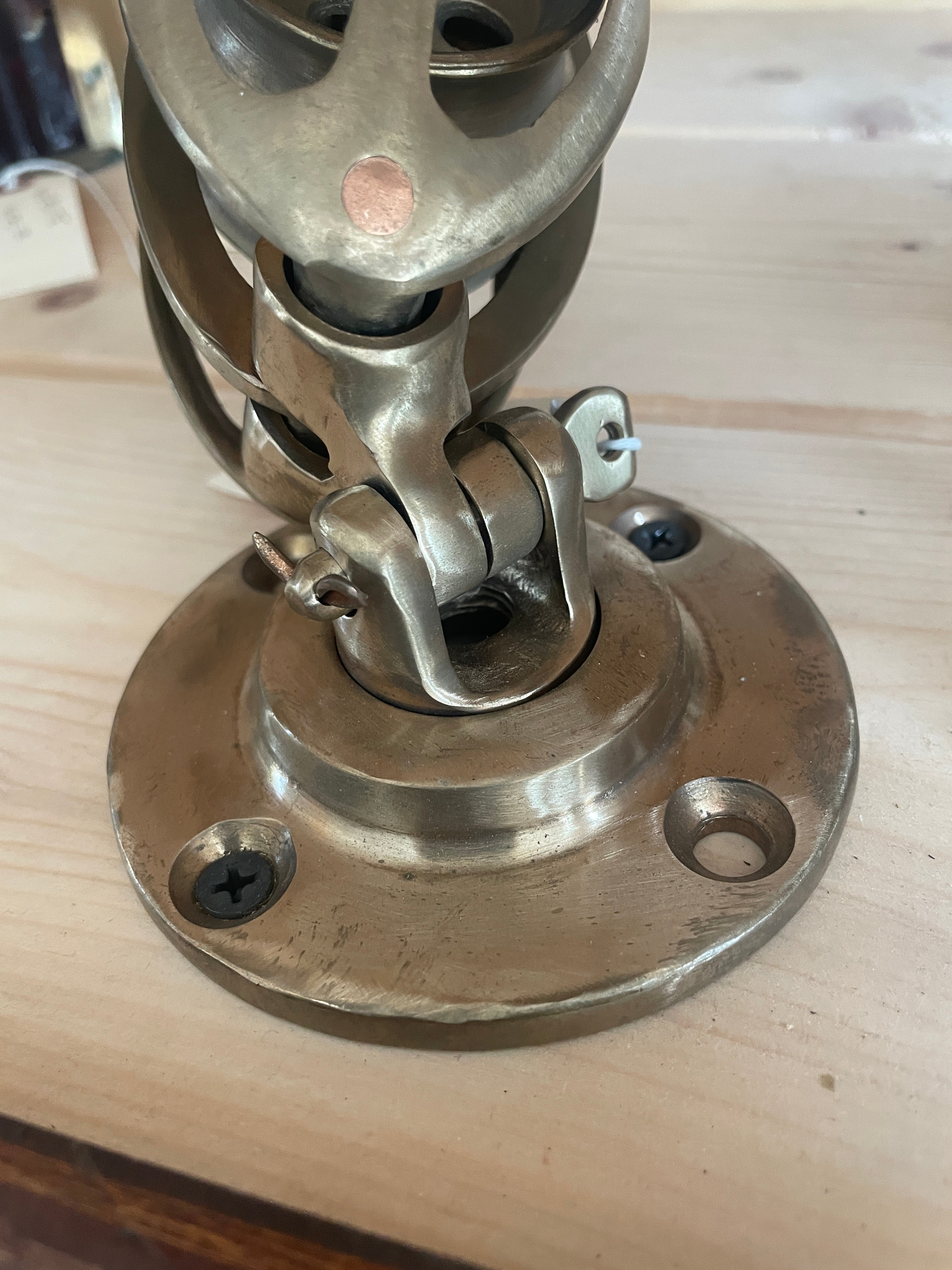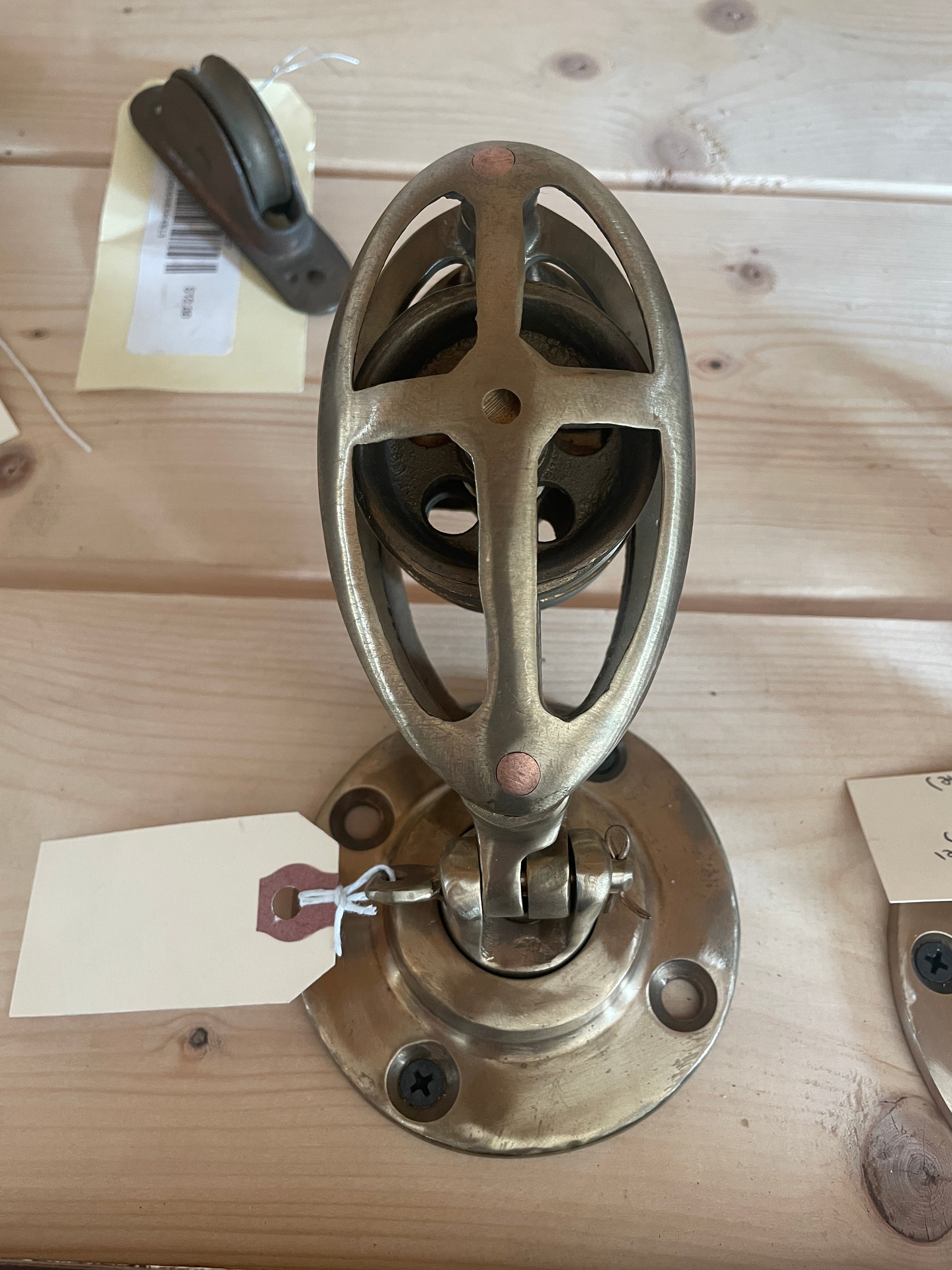 BB6401A Double Cage Deck Swivel Block. This block had 2, 2" sheaves that fit max 5/8" line. The base is 3 5/8" diameter. Stands 6" tall when mounted.