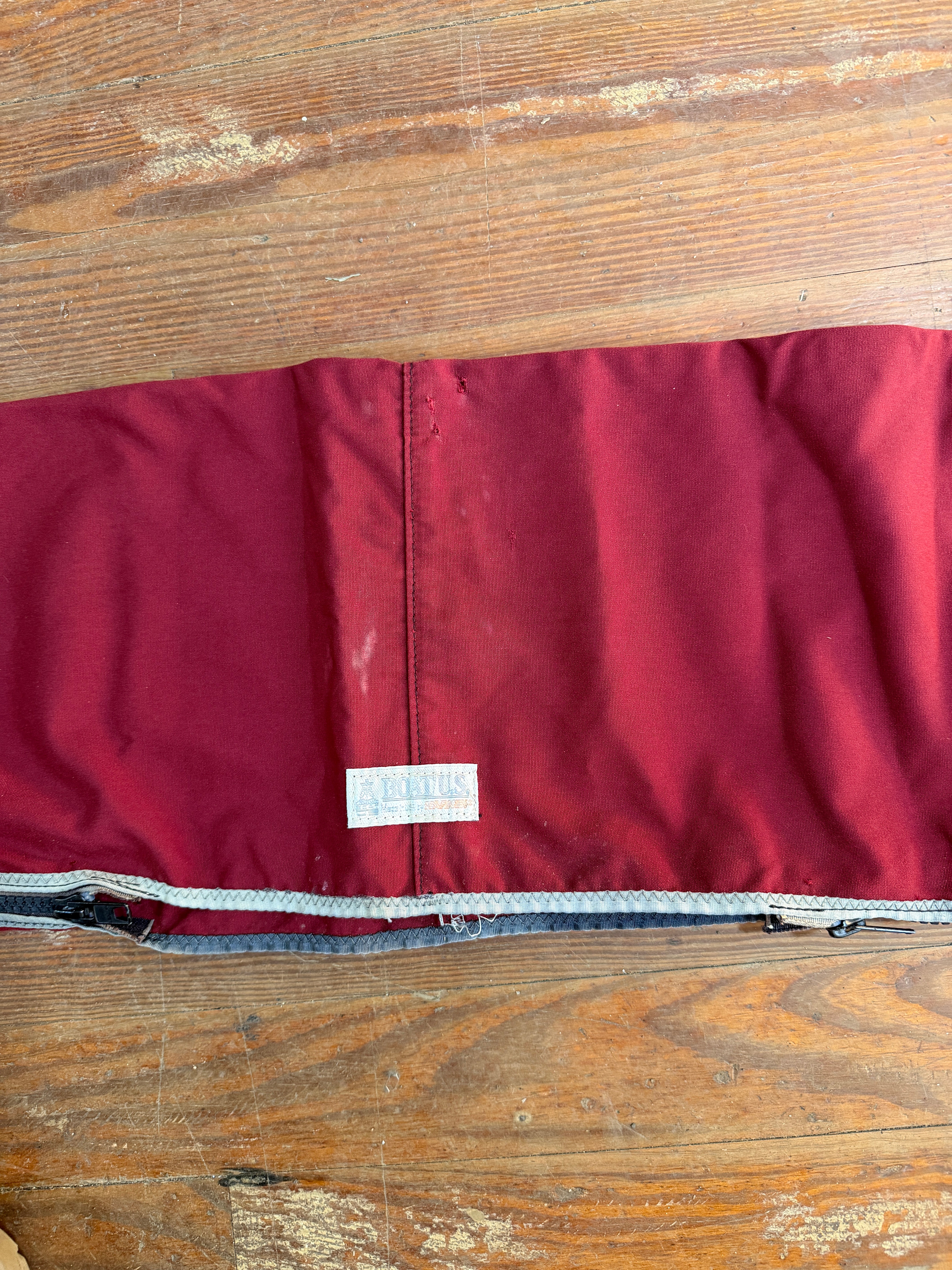 This Bimini dodger protective cover is in good condition. It has some very small minimal holes. Burgundy color. The cover is 7' total length from the outer most corner. The inside diameter length is 5' 6". There is 2 zipper sections. The width in is 11" (this is right in the center of the cover). The area where the poles will stick out is 8" wide.