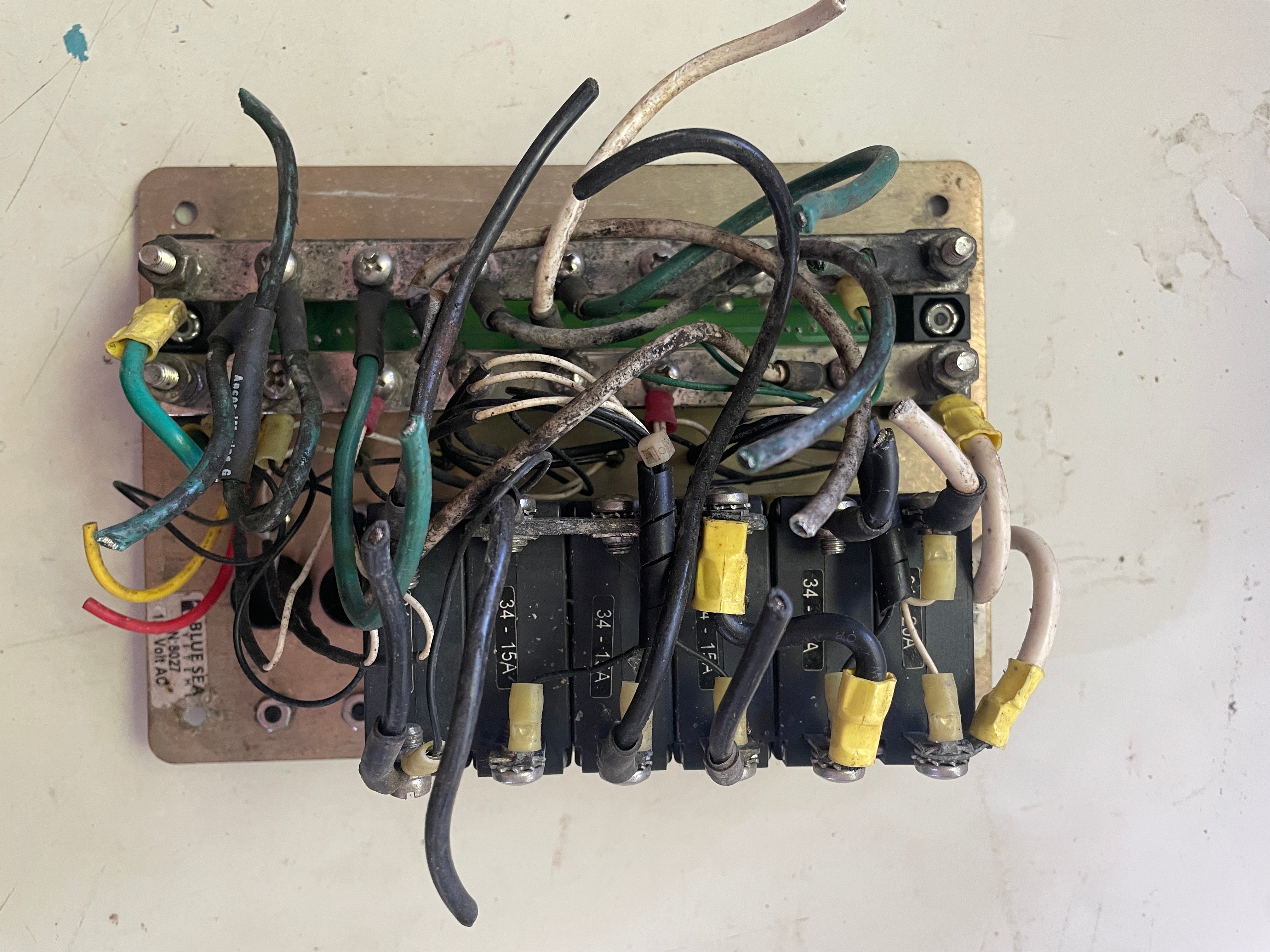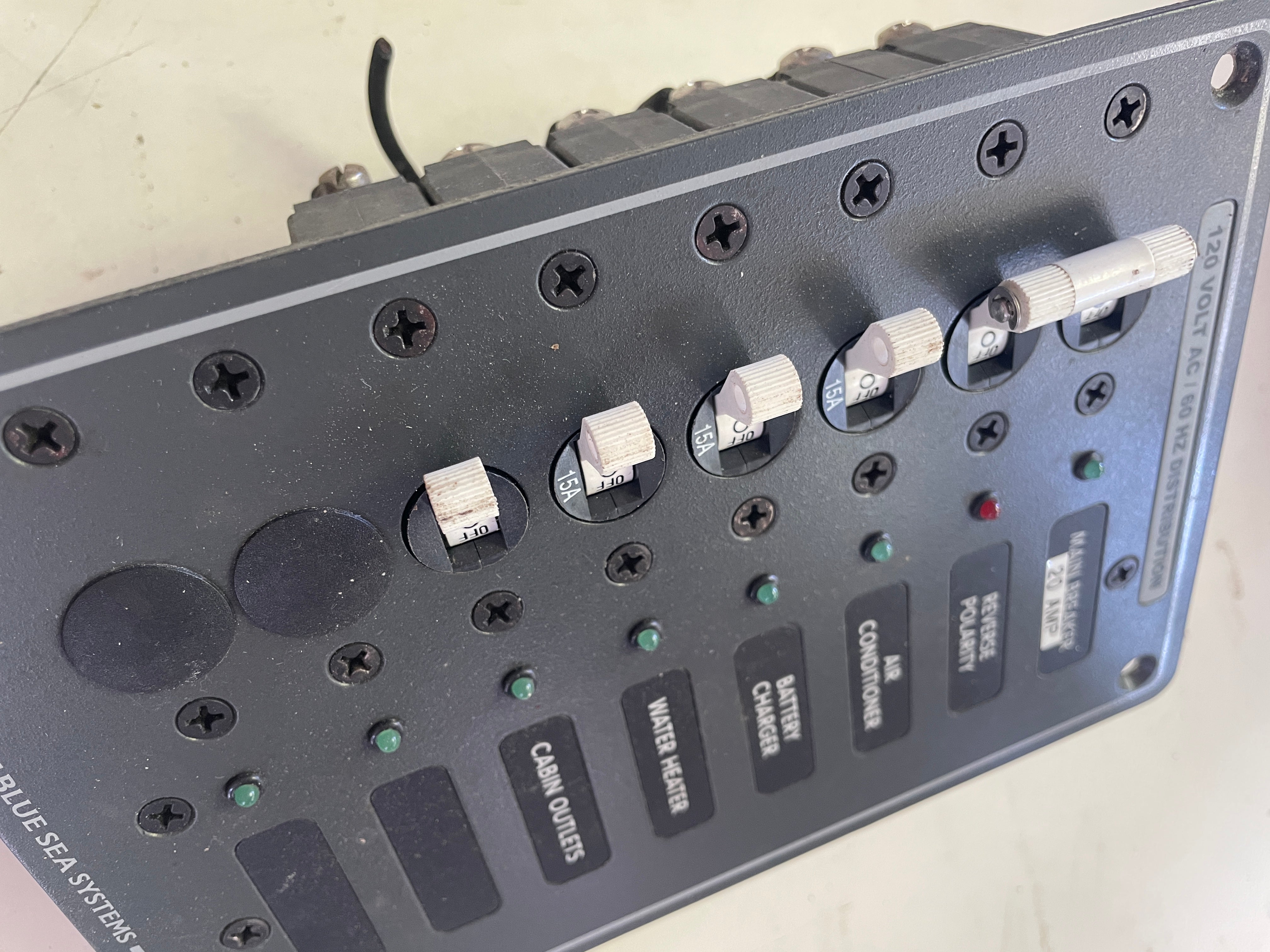 This blue sea systems 8 switch distribution panel is in great condition, super clean. There is room for 8 switches however there are currently only 6 installed. All wires have been cut. The PN is 8027. This panel is 120 VAC and 60 HZ. It measures 7 3/8” long x 5 1/4” wide x 3” deep.