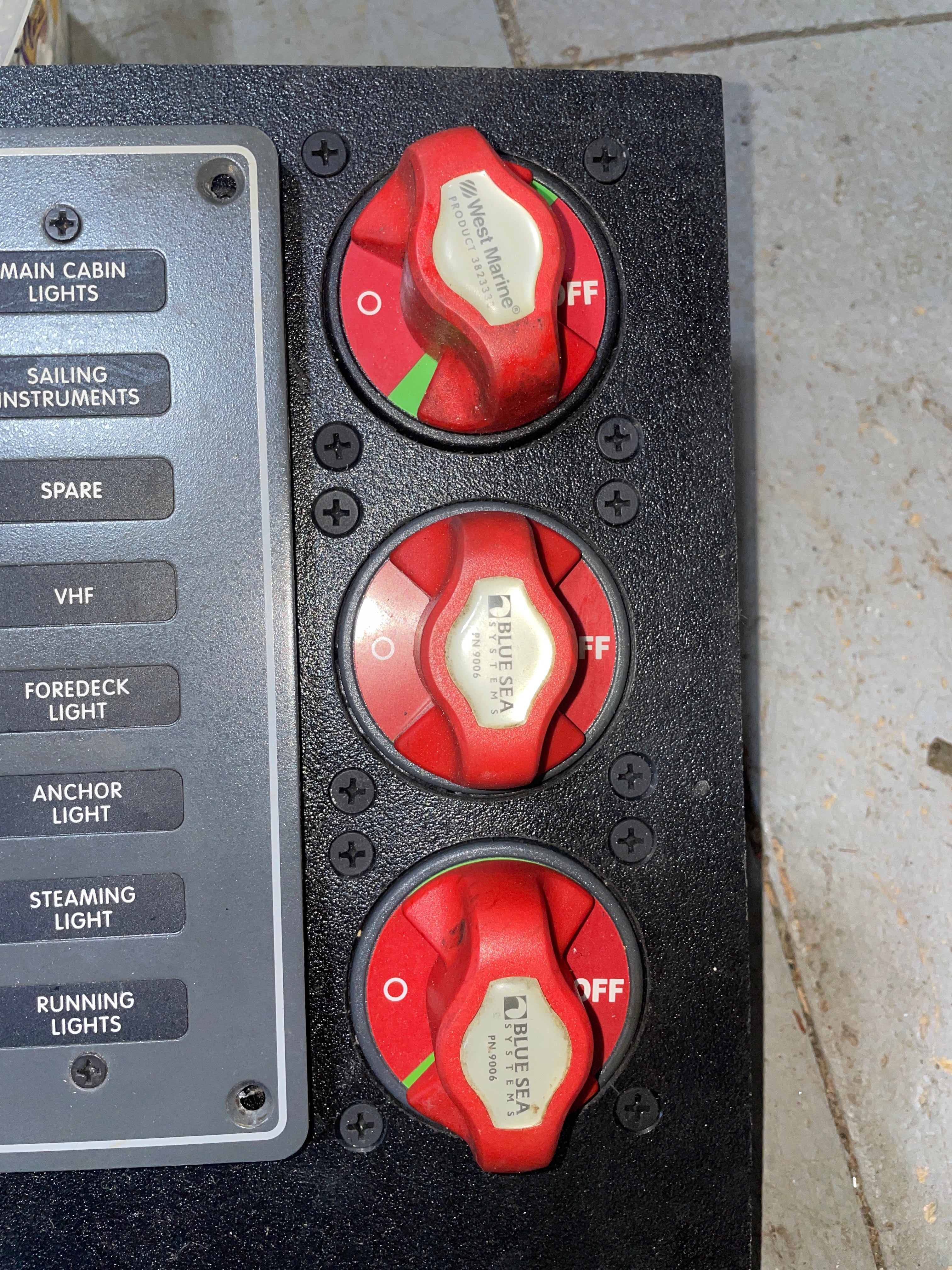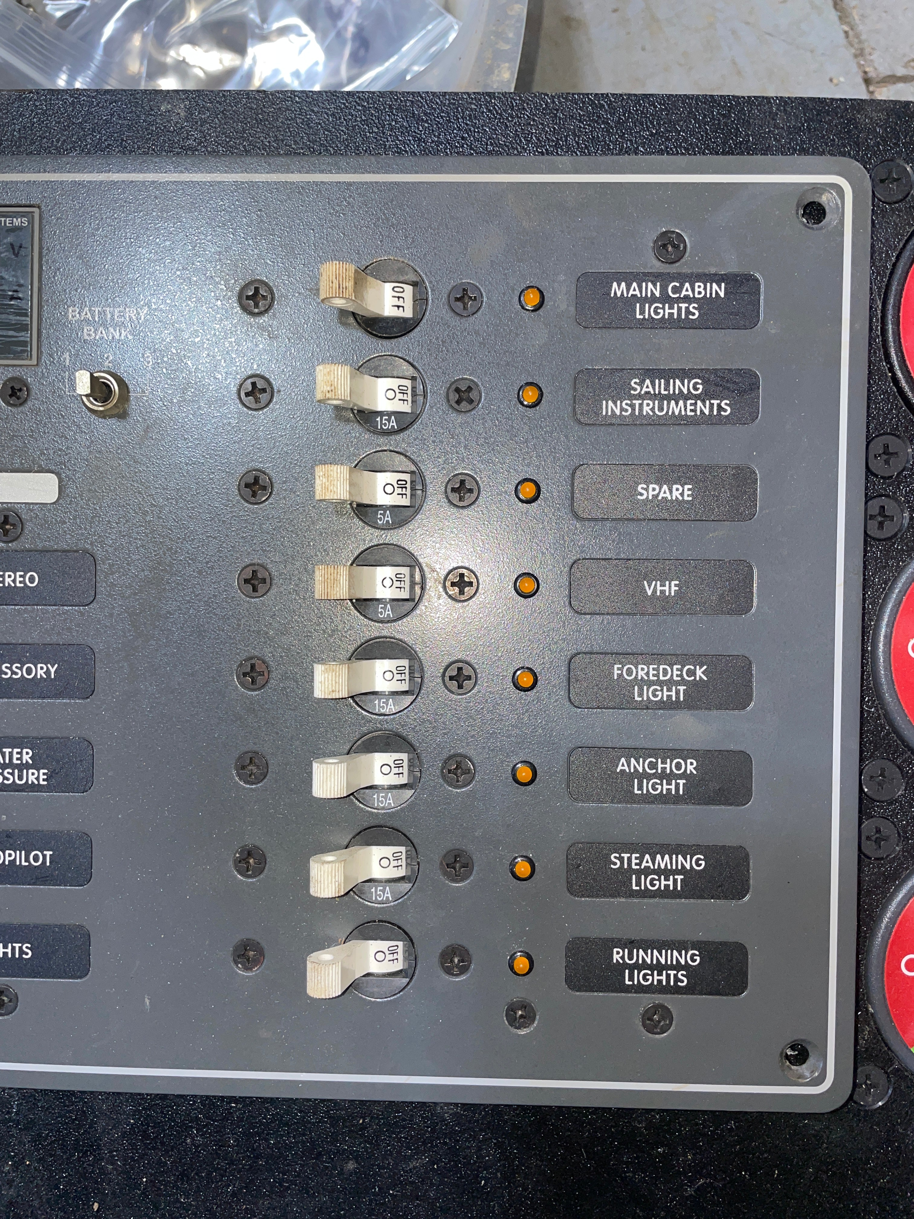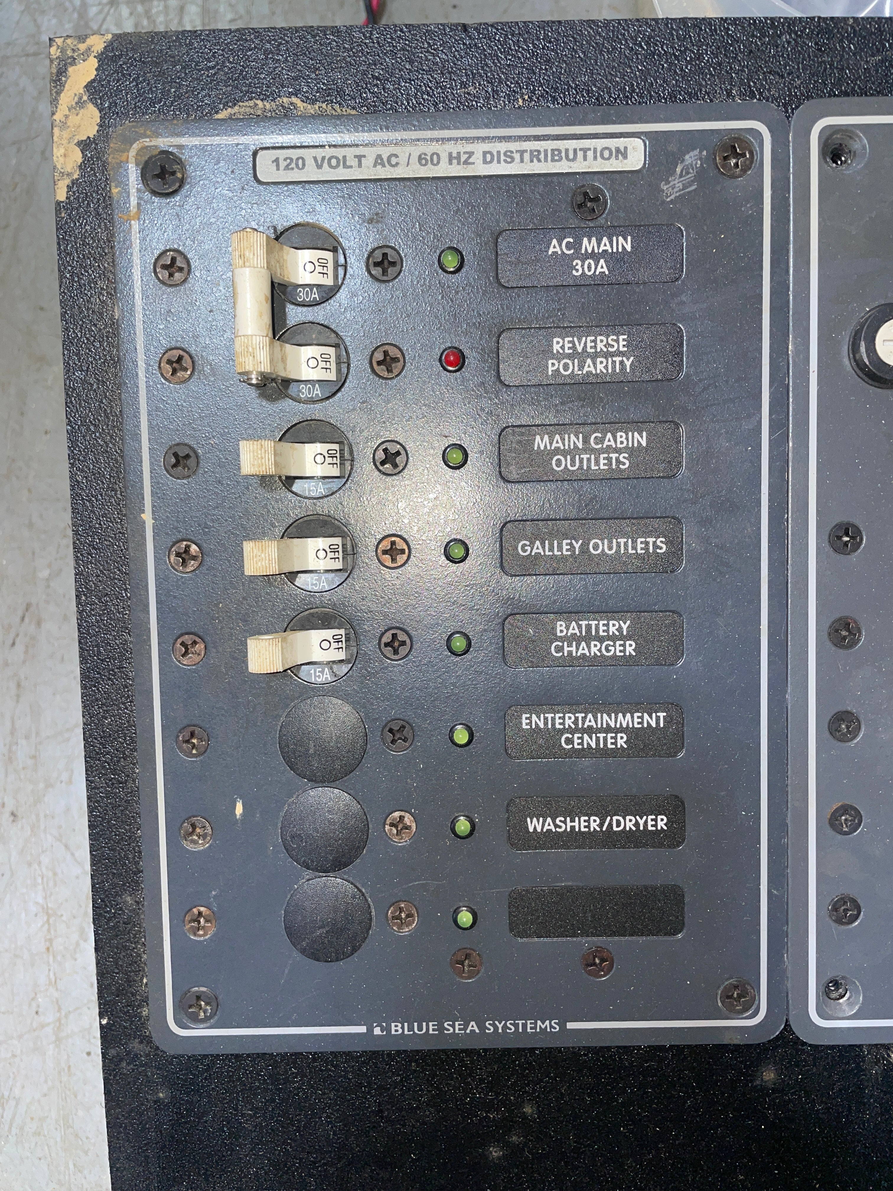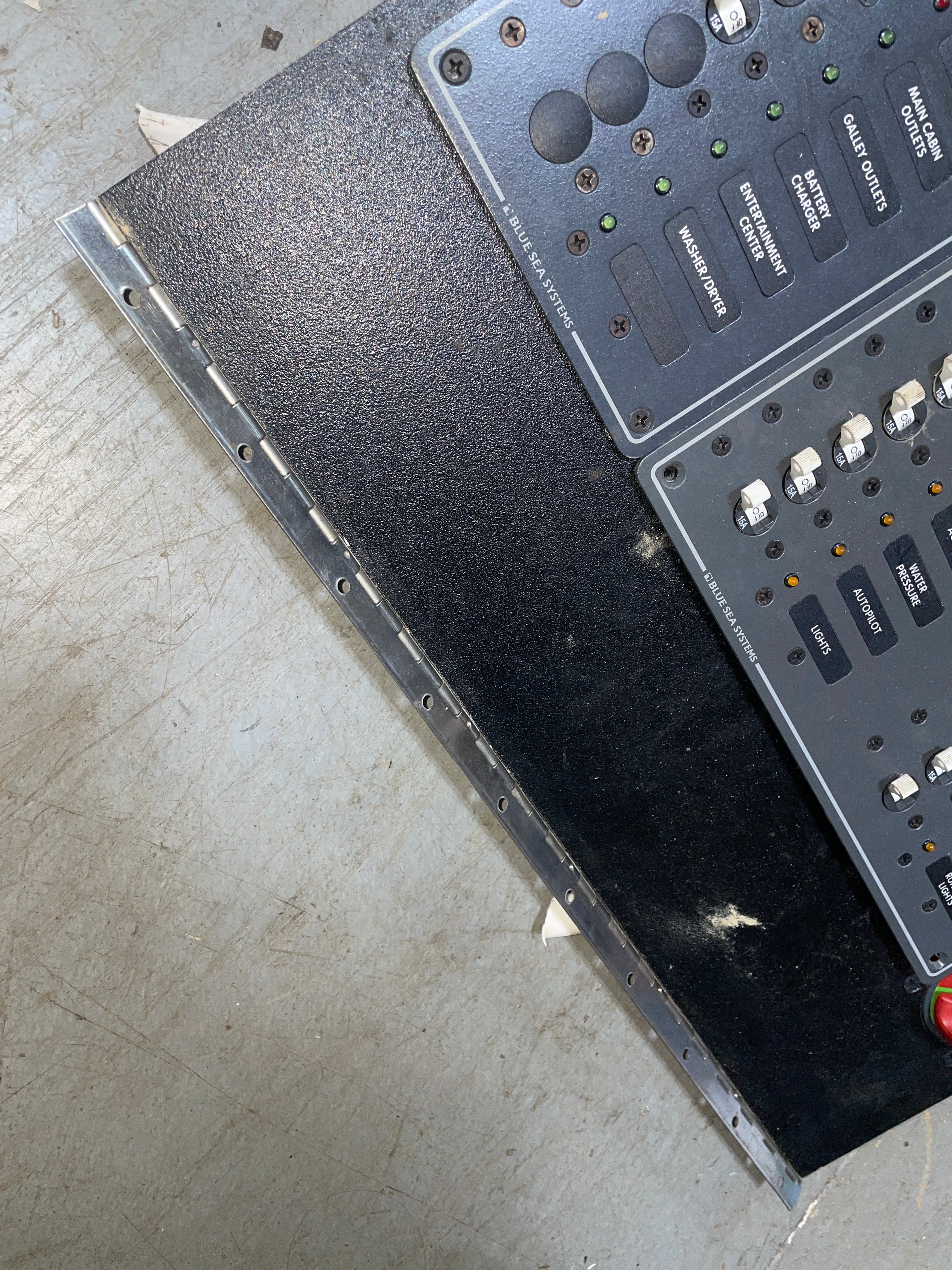 This blue sea systems panels are in great condition. The smaller panel is 120 Volt AC / 60HZ. It has 5 switch areas but there is room for 3 more to be added. This panel measures 7 1/2" tall x 5 1/4" wide. The larger panel is 12VDC and is a 13 switch panel. It measures 7 1/2" tall x 10 1/2" wide. Also comes with 3 PN 9006 battery disconnect switches. Comes on a hinged plastic door that measures 19 3/4" long x 12" wide x 2 1/2" deep. All wires ha e been cut.