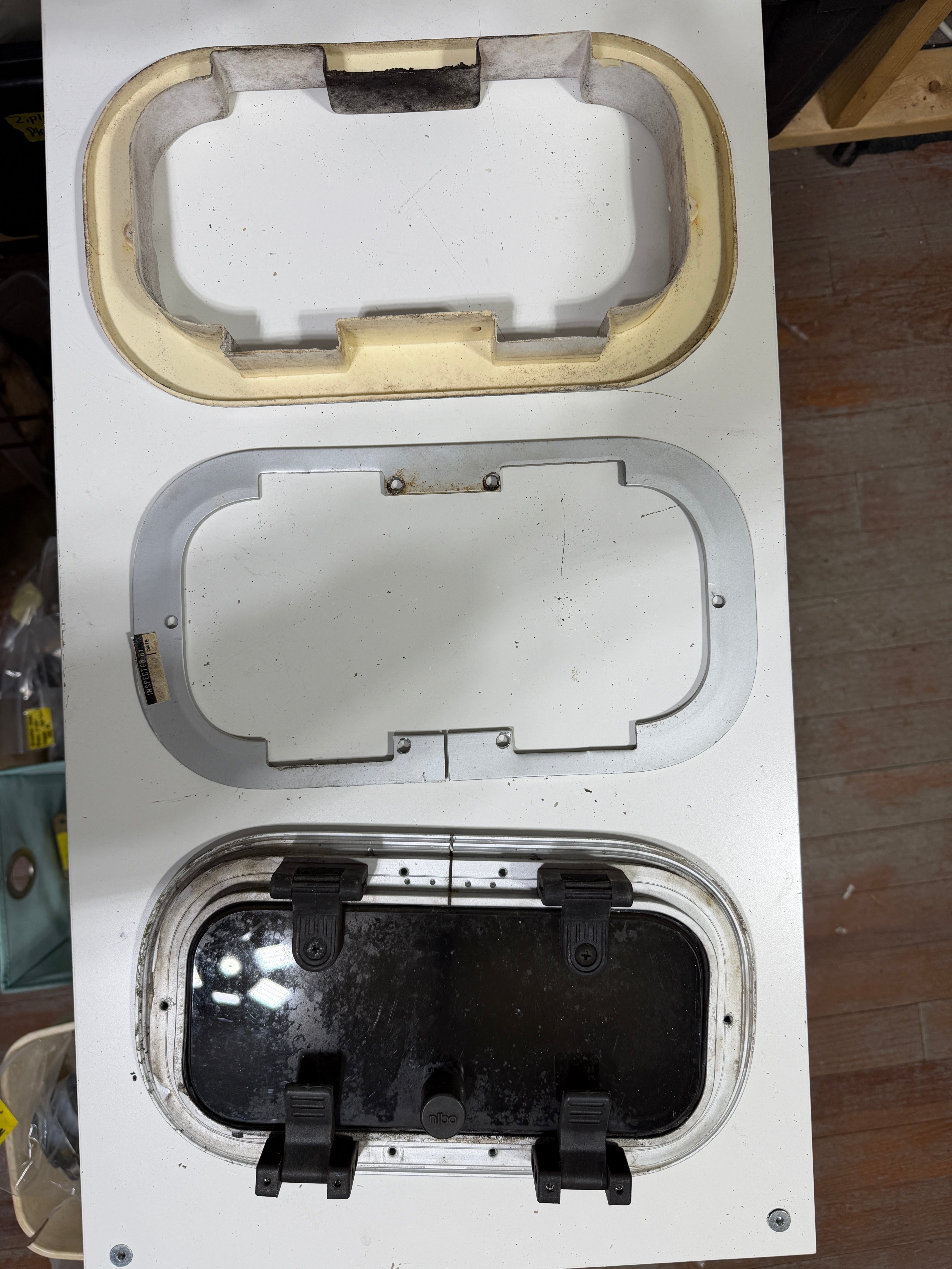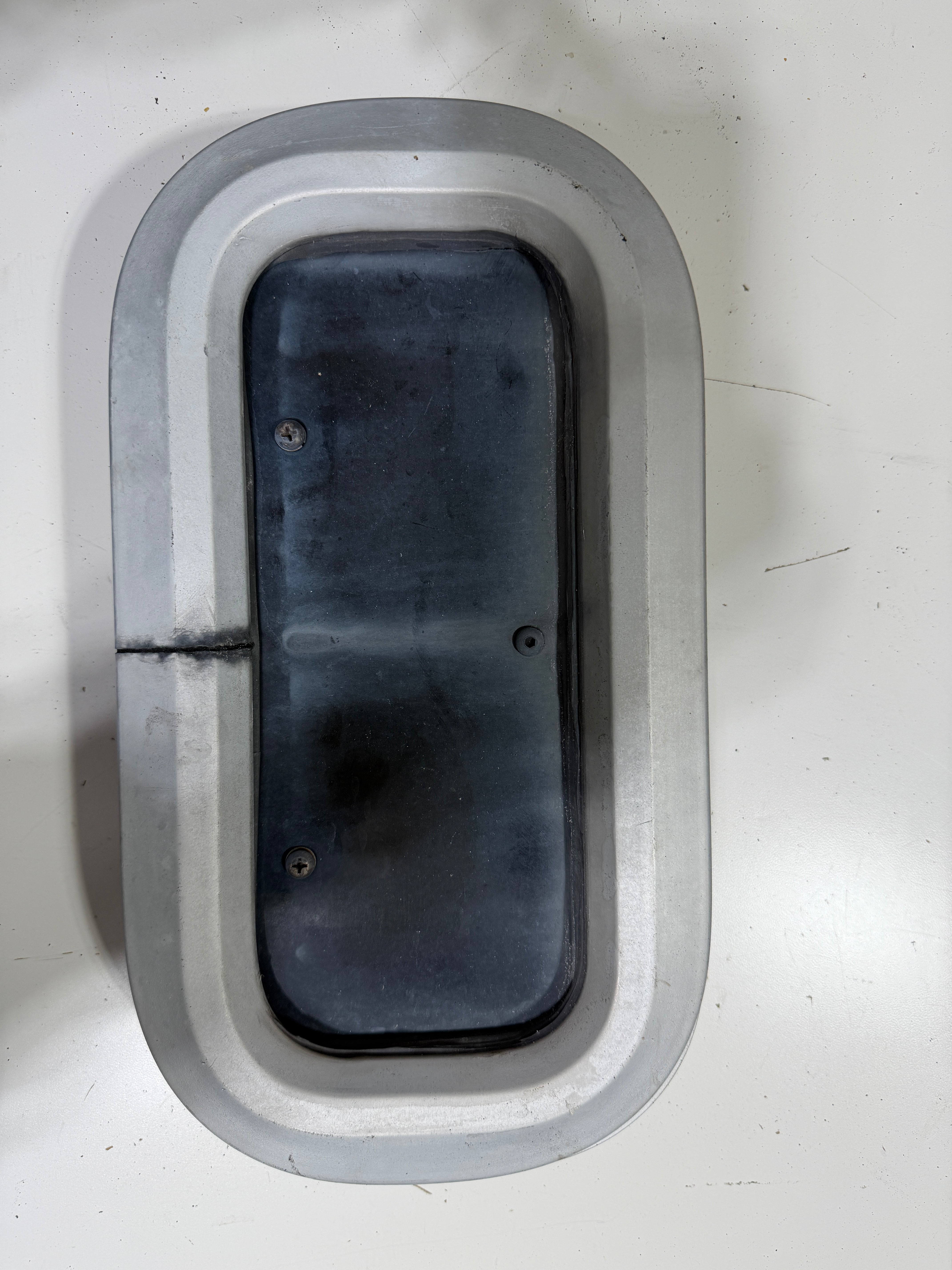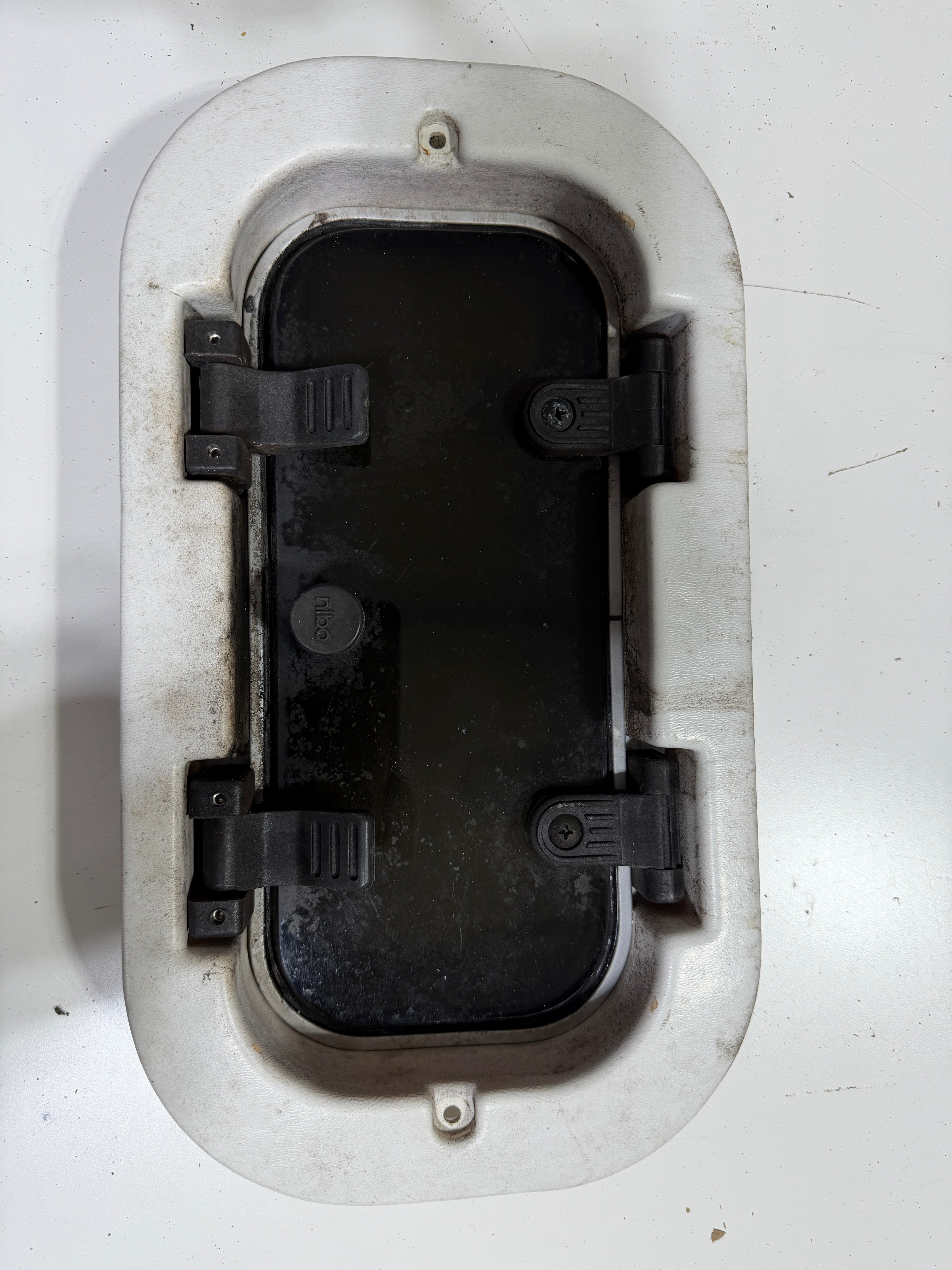 Bomar Nibo Opening Port Light. Inside diameter measures 10 3/4" long x 4 7/8" wide. The outside diameter measures 12 7/8" long x 7" wide. Plexiglass is foggy. All the hinges and latches work as they should. Comes with the backing plate and plastic backing.