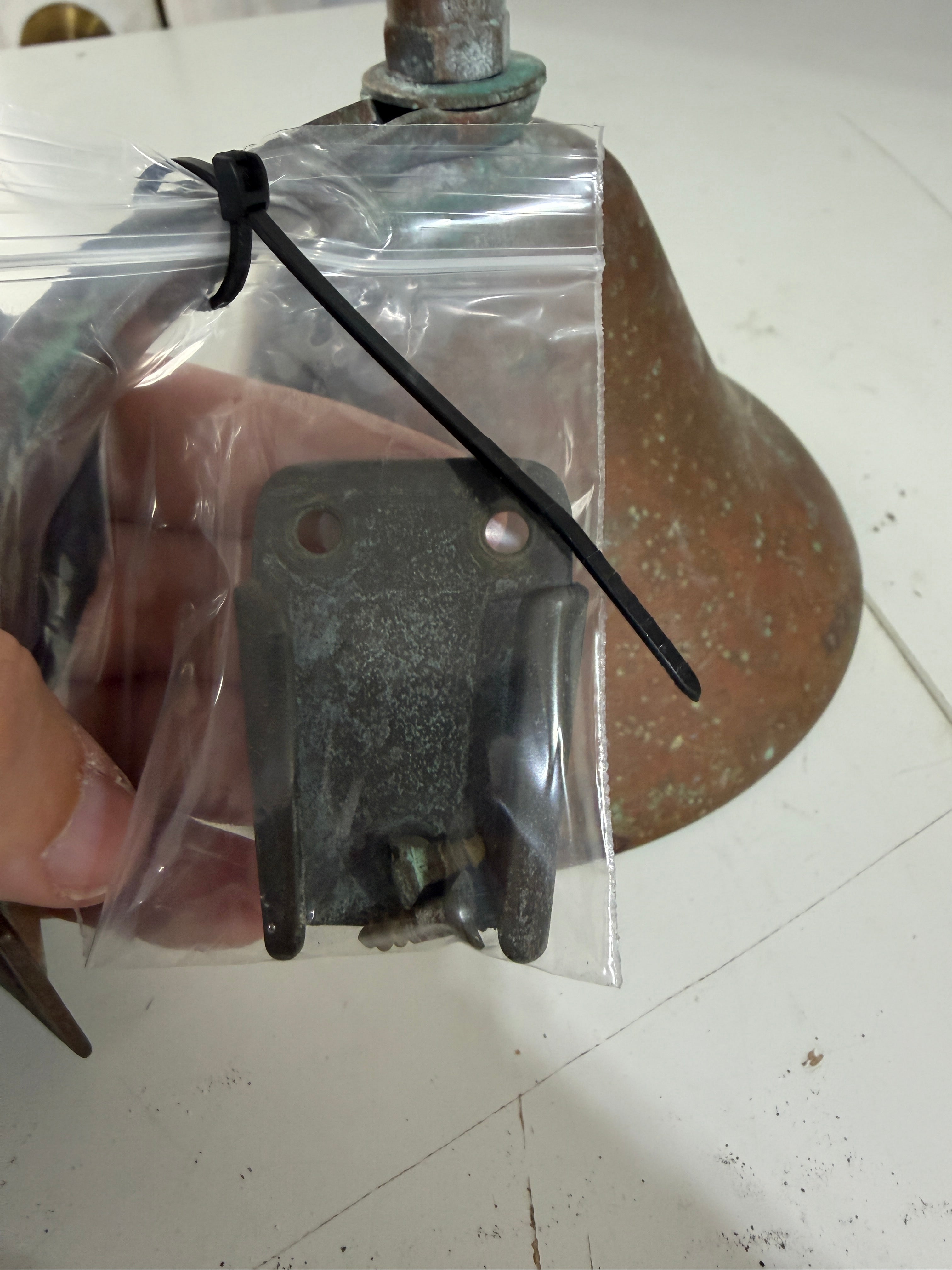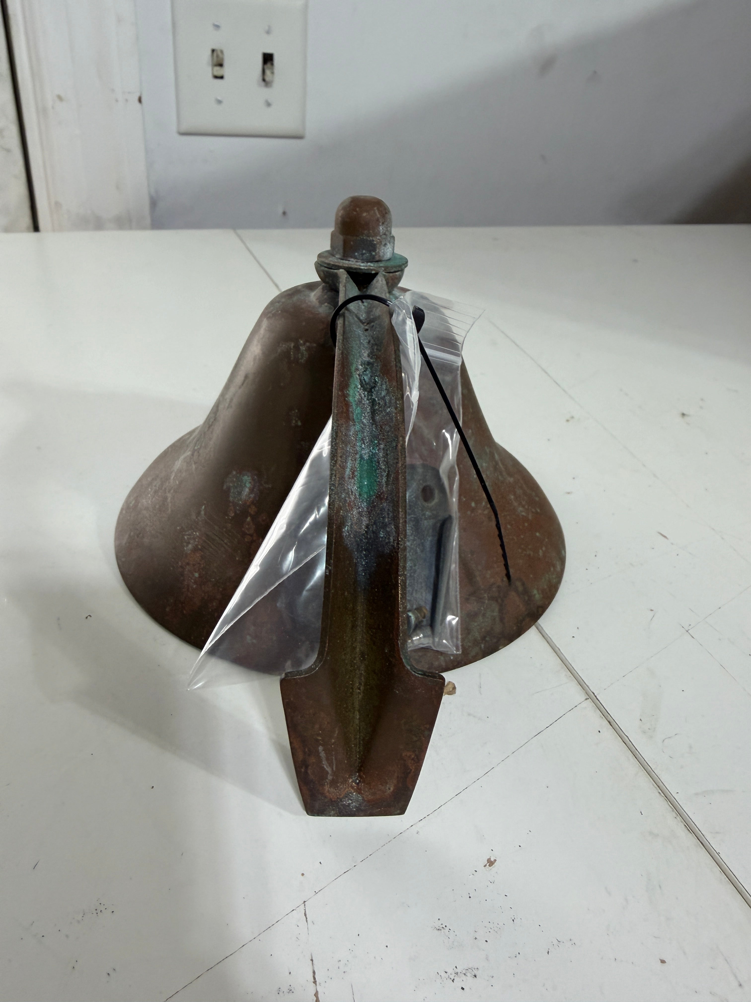 This brass exterior bell is in great condition. The bell has a stainless still dinger. Comes with bracket for mounting. The bell diameter is 5 1/2" When mounted the bell will sit 7 1/4" off the wall. The bell is 4" tall. Loud ring.