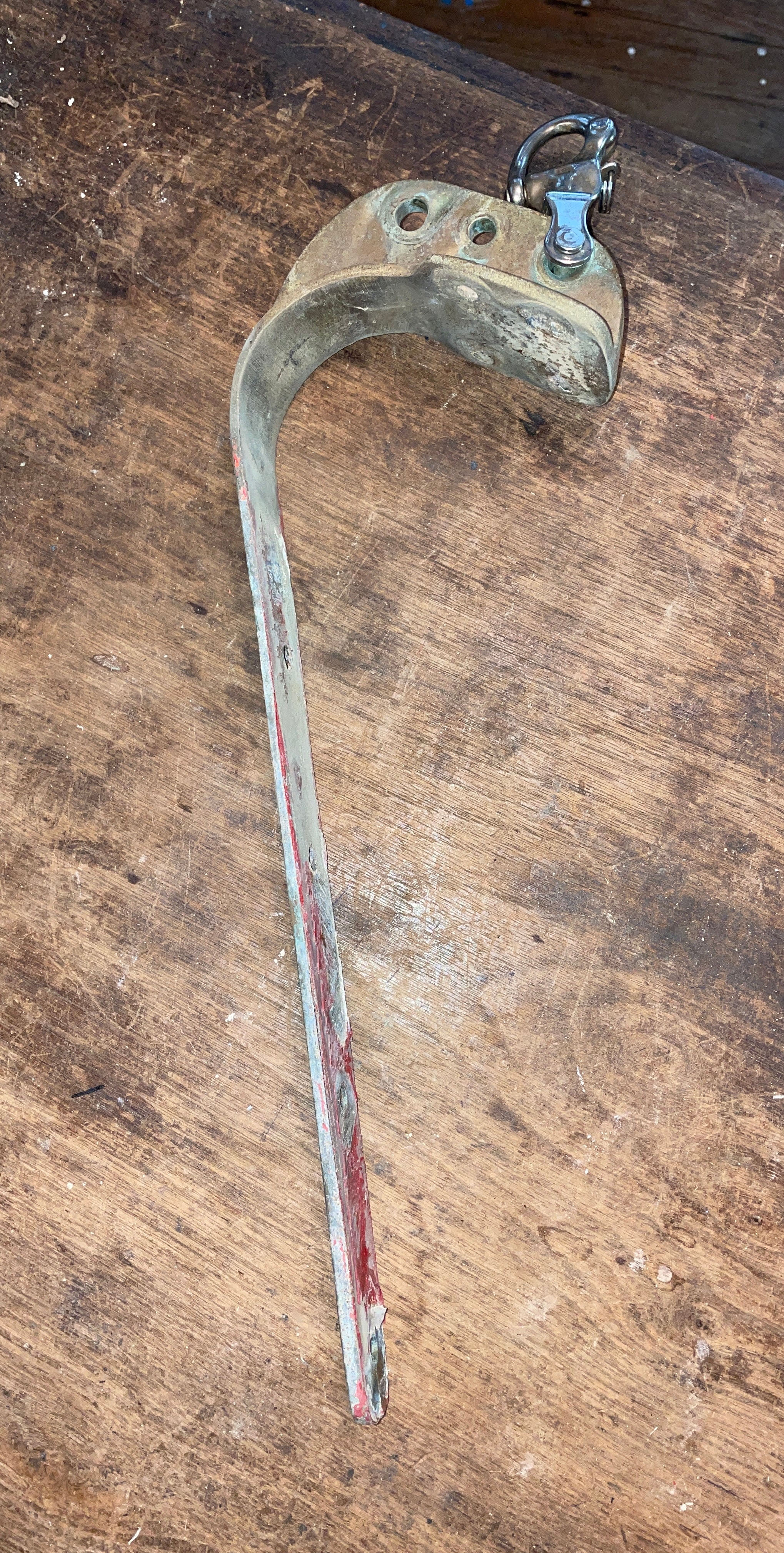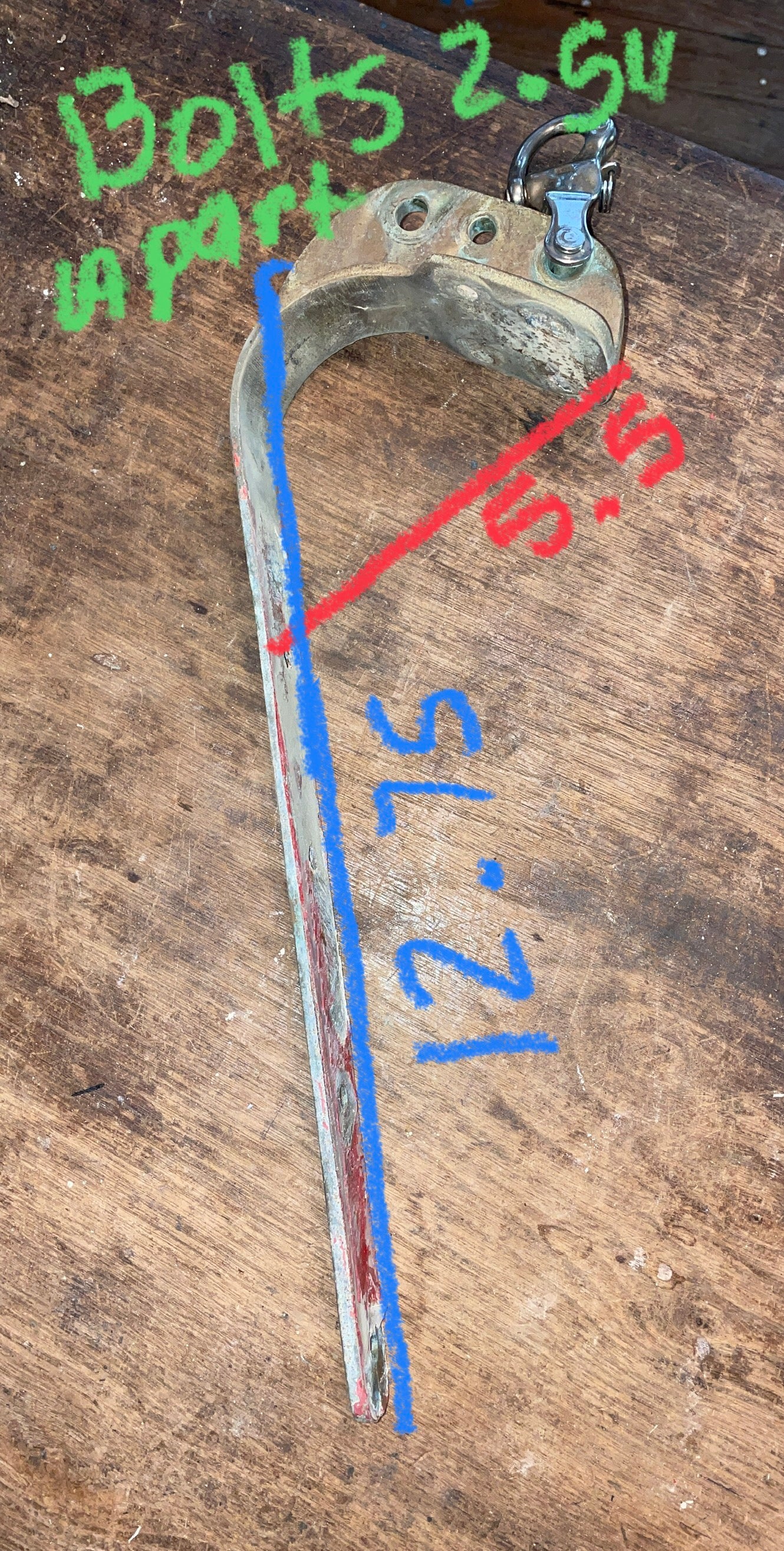 This solid brass chain plate is in great condition. It has 4 bolts down the long part that are 2 1/2” apart. That portion of the plate is 12 3/4” long. The curved area has another 4 bolts at the top that are 1 3/4” apart (side x side) and 1 1/4” apart wide. The curved area (measured from the tip of top to the first bolt) is 5 1/2”. The 3 holes at the top are 3/8” and 5/16”. SS Wichard shackle works as should.