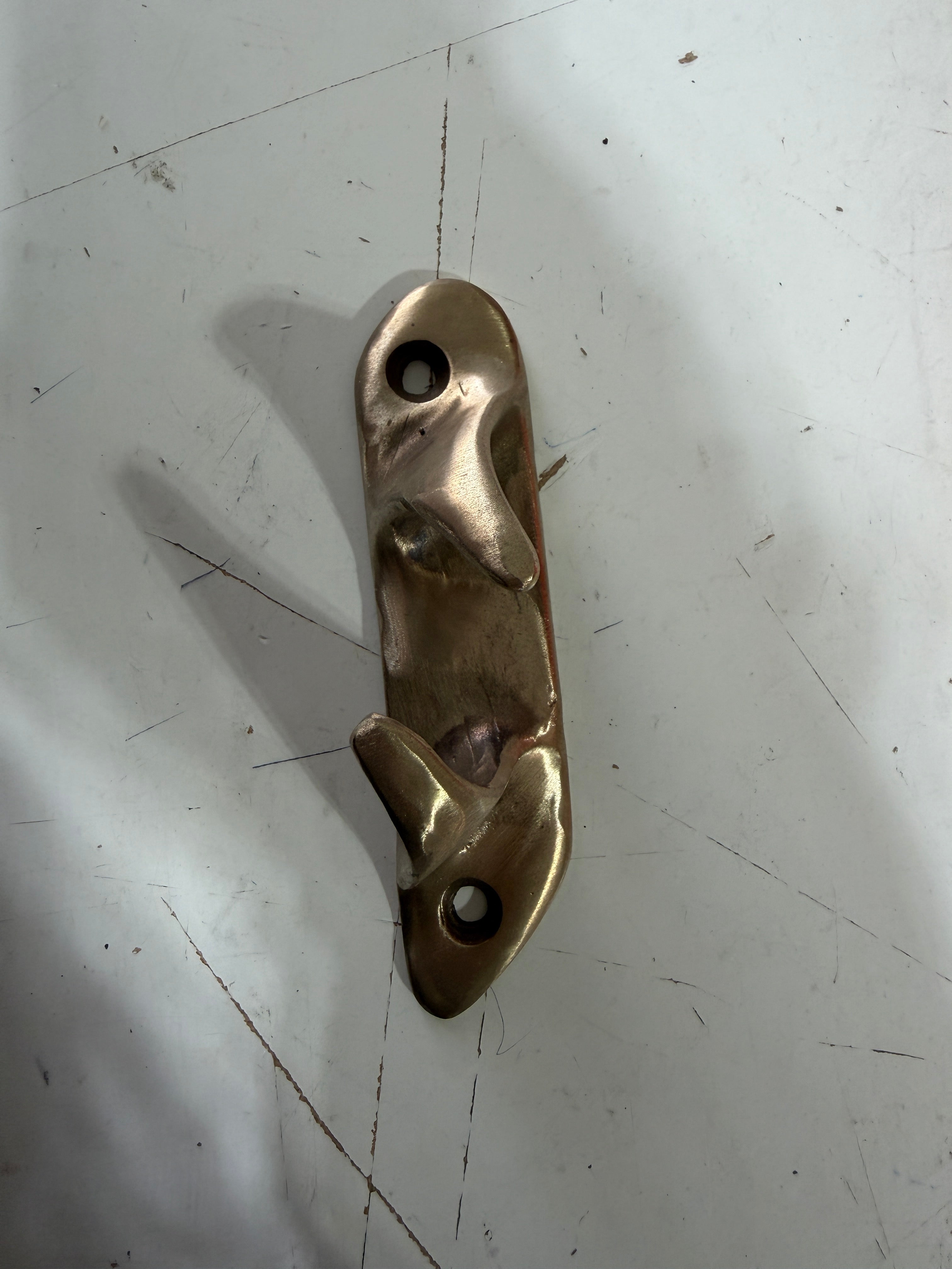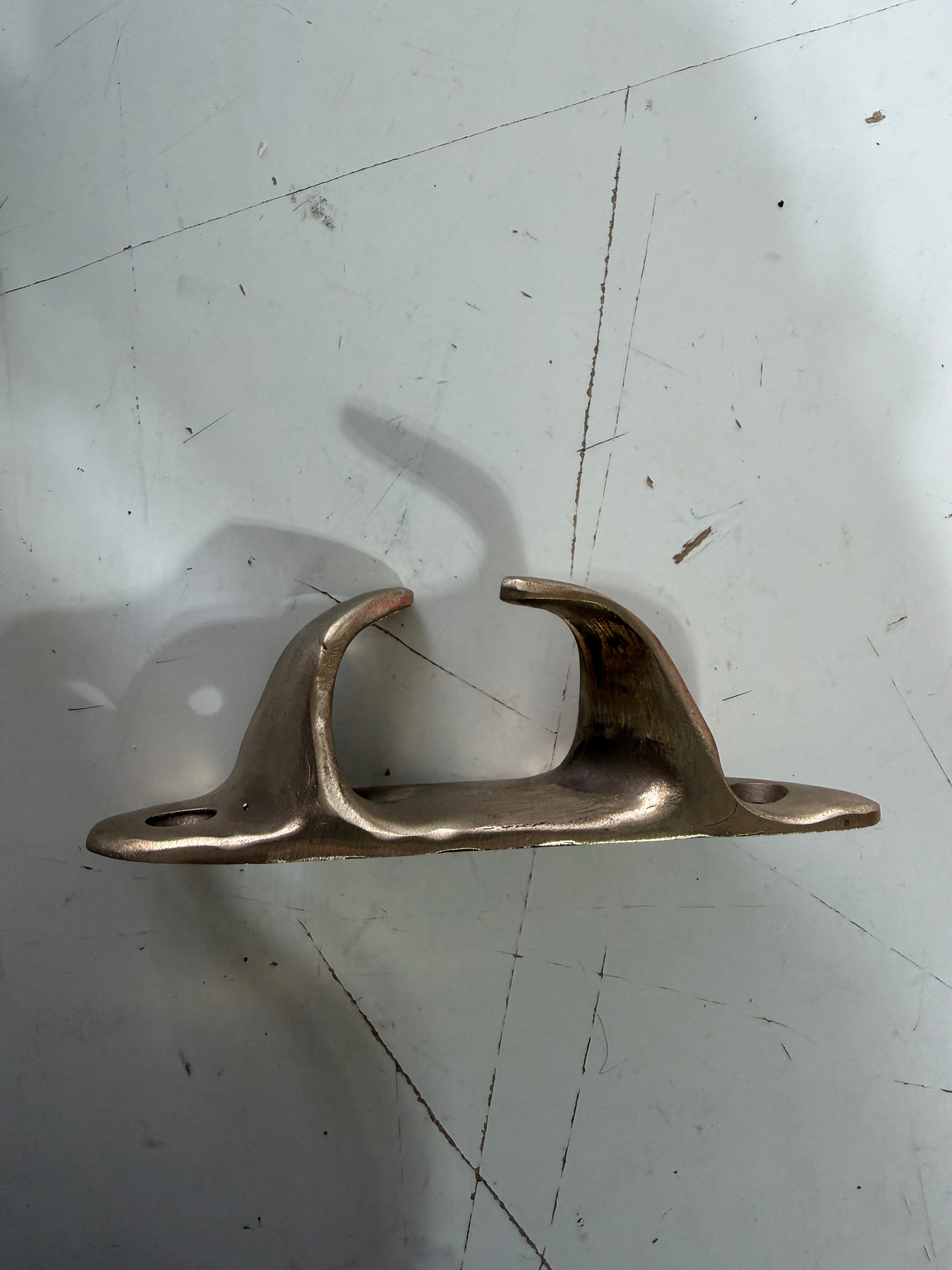 Hand casted in USA. 4 1/4" solid bronze skeene chock cleat. We only have the starboard side of this style. The cleat fits 3/4" line diameter. The mounting is 3" apart. The cleat stands 1 1/2" tall.