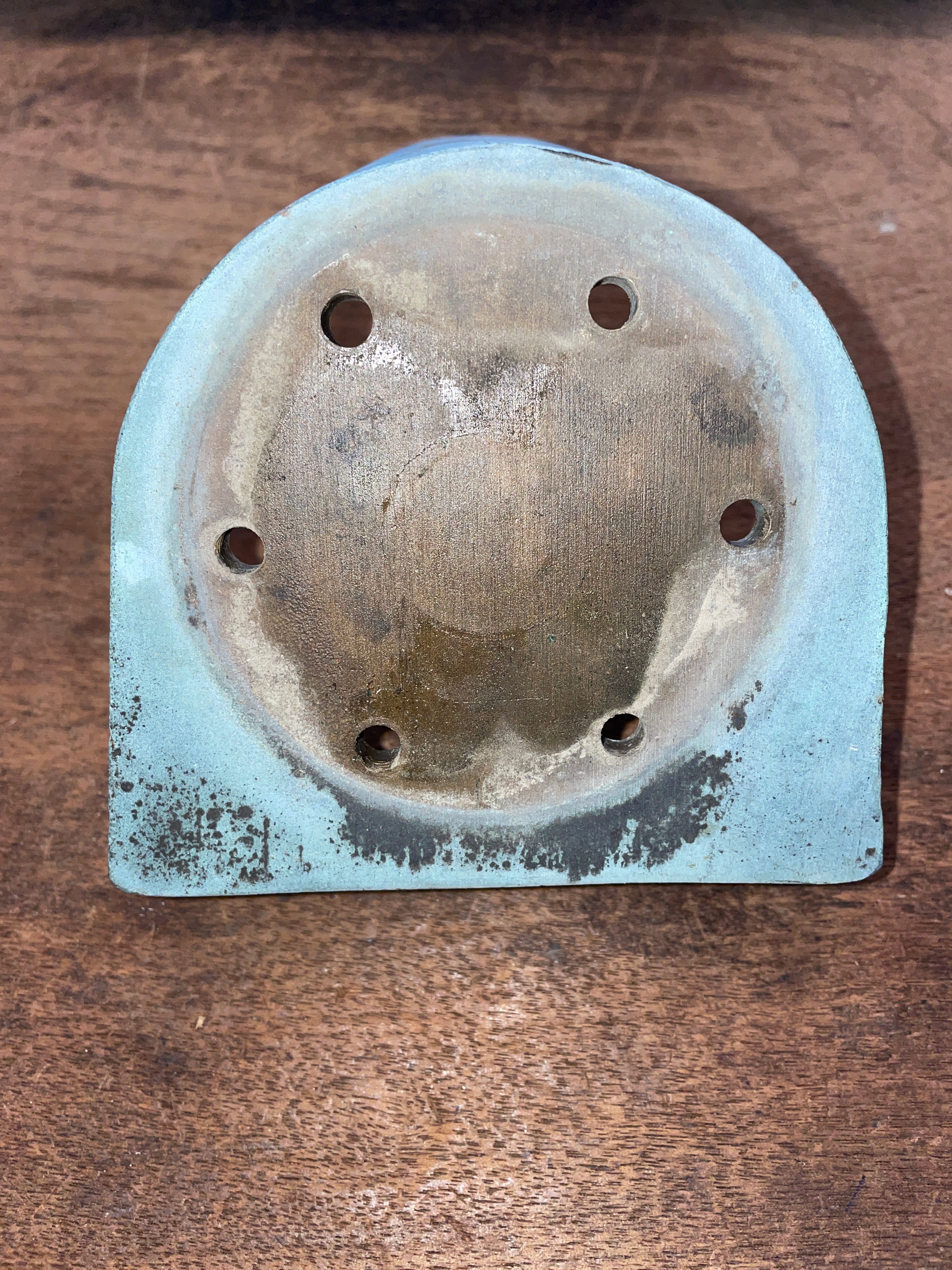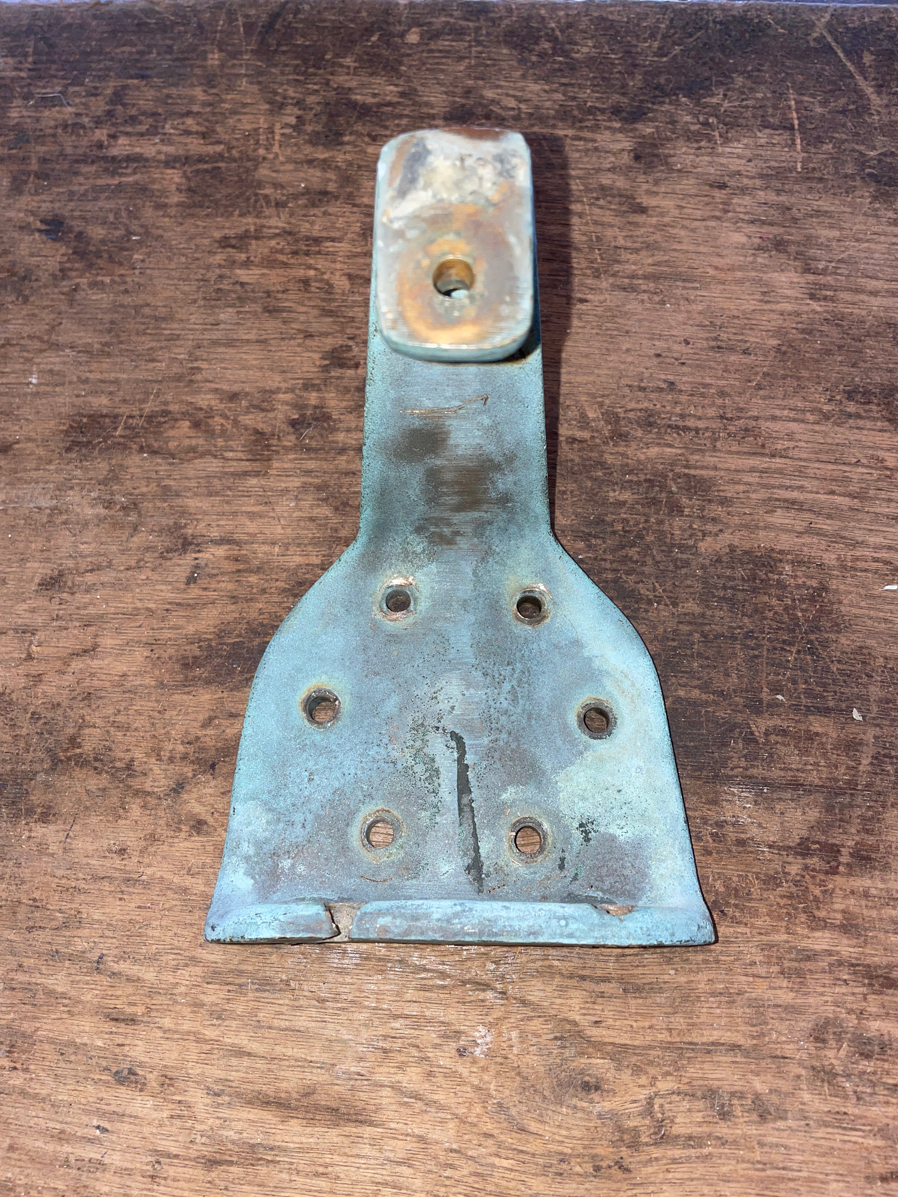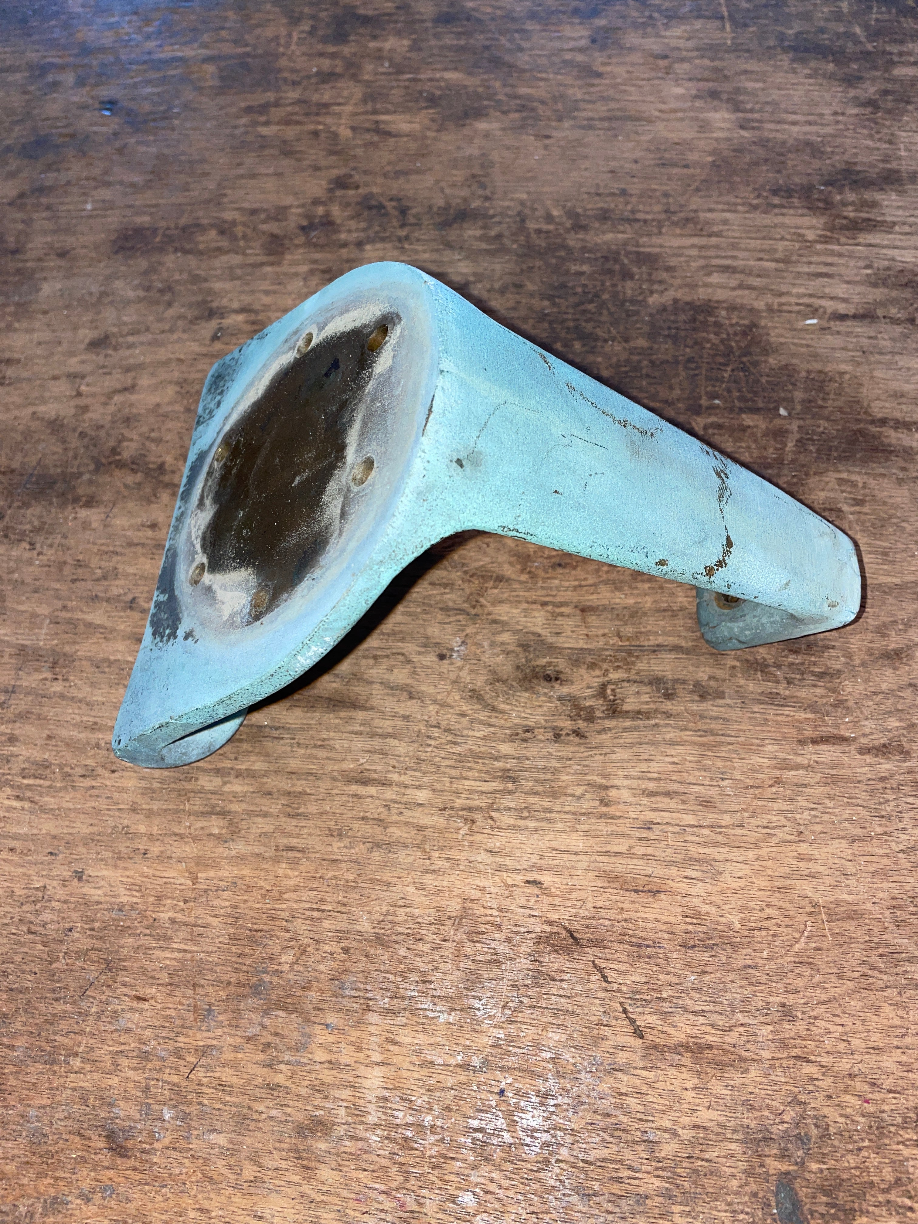 This solid bronze combing mount is in fair condition. Fits for a very small winch that has a 6 bolt pattern that is 1 3/8” apart (side x side). The mount has some damage where someone else tried to drill a different bolt pattern at the base for mounting. The original bolt holes, one is damaged from the new hole and the other is perfectly fine. Could probably just drill a new whole in the middle for a secure hold.