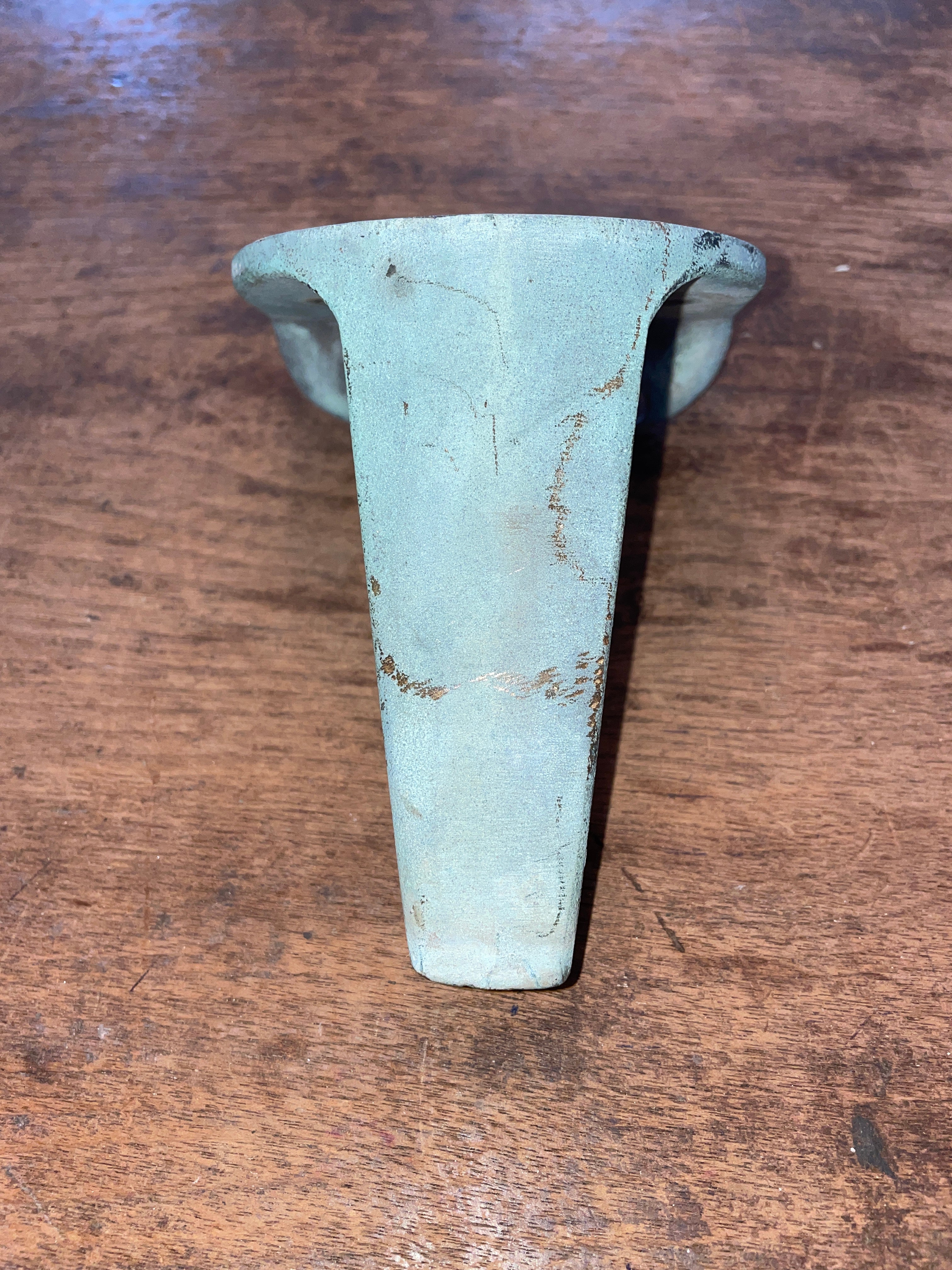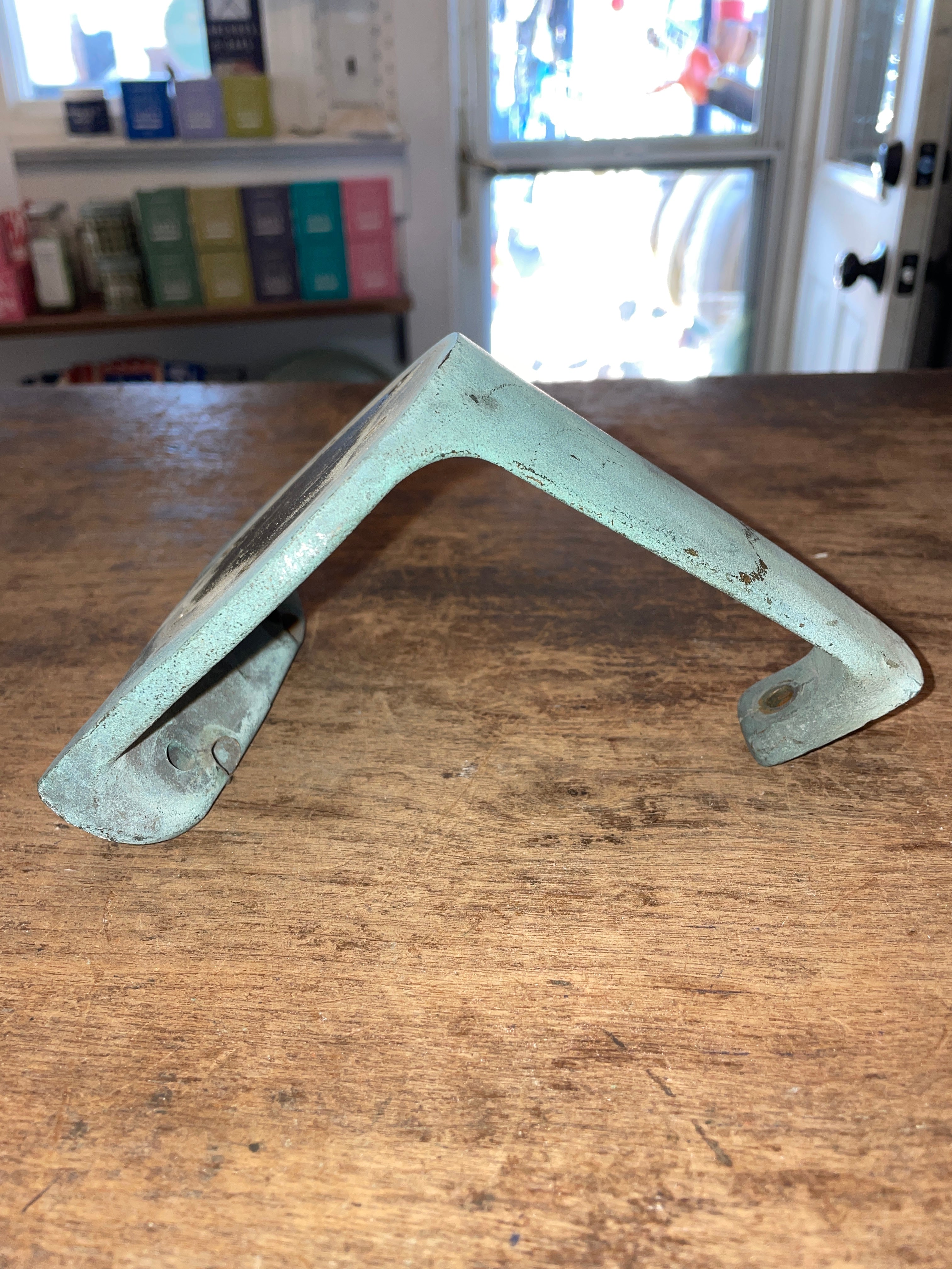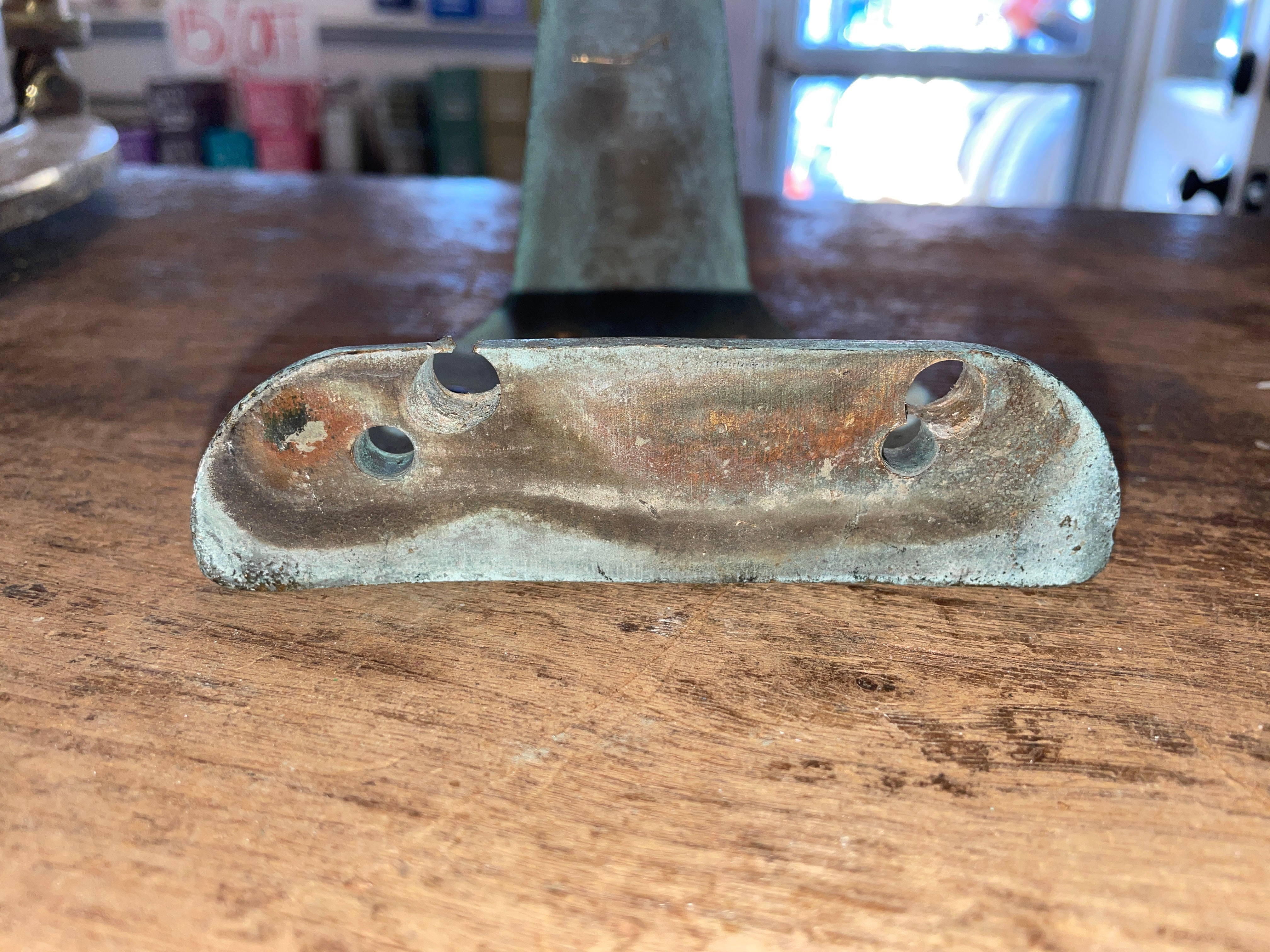 This solid bronze combing mount is in fair condition. Fits for a very small winch that has a 6 bolt pattern that is 1 3/8” apart (side x side). The mount has some damage where someone else tried to drill a different bolt pattern at the base for mounting. The original bolt holes, one is damaged from the new hole and the other is perfectly fine. Could probably just drill a new whole in the middle for a secure hold.