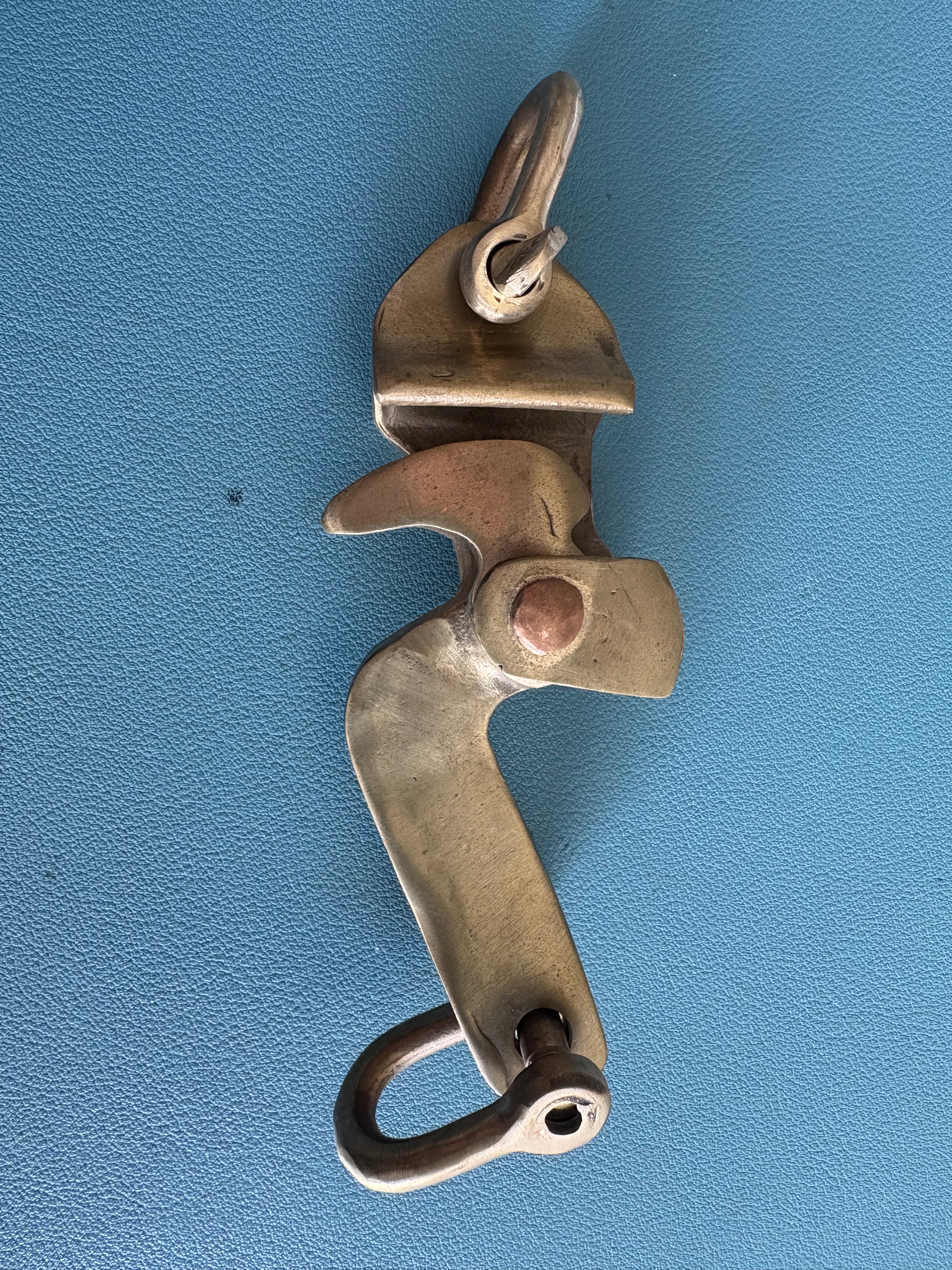 This unique fitting was used in the 1800s to hand an anchor light from a stay.It is used today to hang swim ladders, cockpit awnings, or anything else that needs to hang temporarily from a stay. May be used on stays or line from 3/16" to 1/2" (the larger the better). The shackle at the left is for a lanyard to tie the clamp to the stay. The object to be hung is attached to the shackle at the right. The heavier the load the better it works.