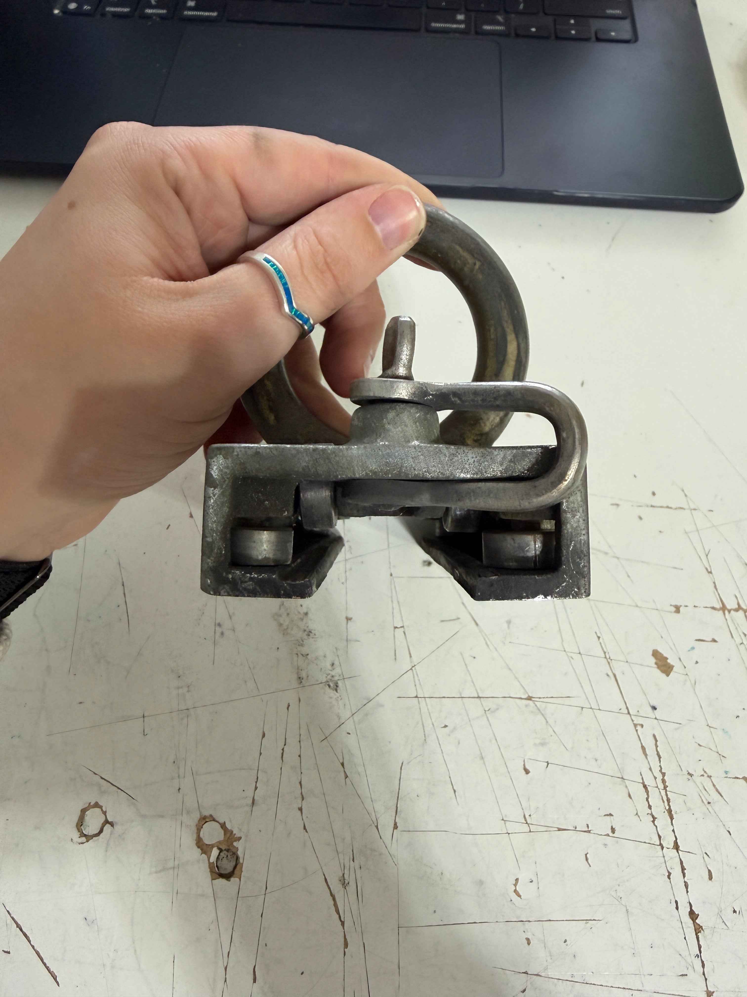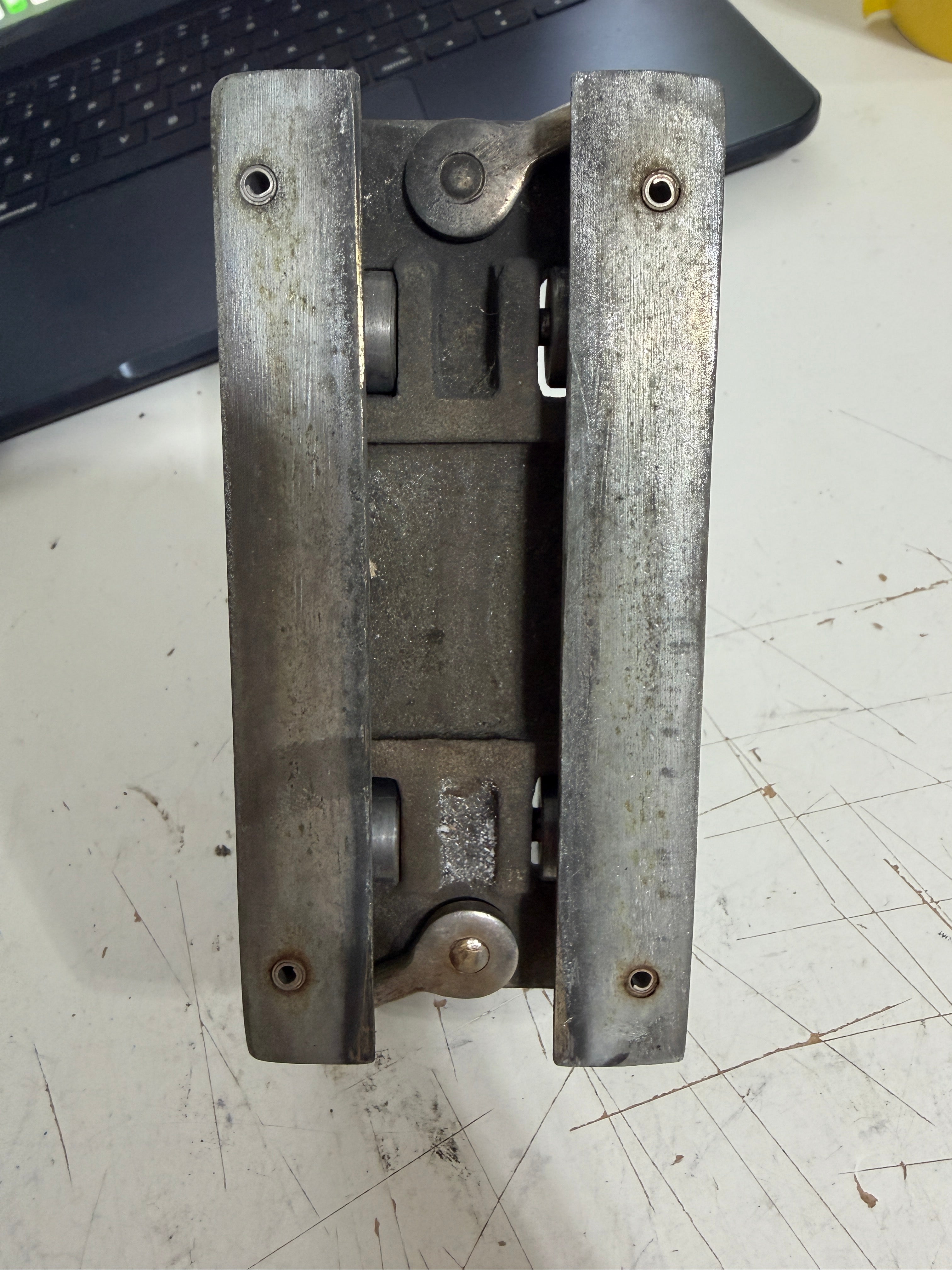 Great condition. heavy duty bronze. Has rollers inside and all around where it mounts to the track. It looks to fit a 1 1/4" diameter track size. The eye is 1 3/4" diameter. The car length is 4 7/8" long x 2 3/8" wide. Stands 3 1/4" total height.