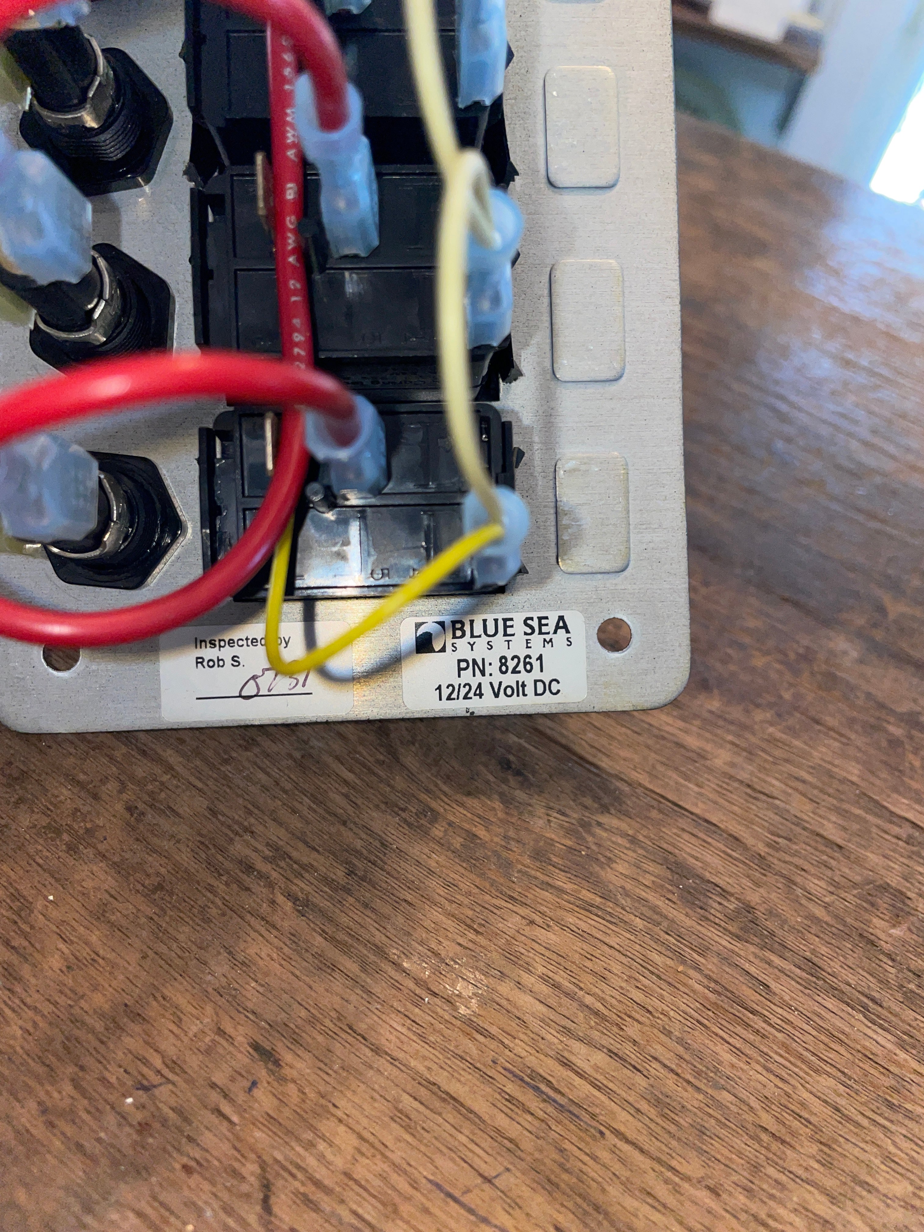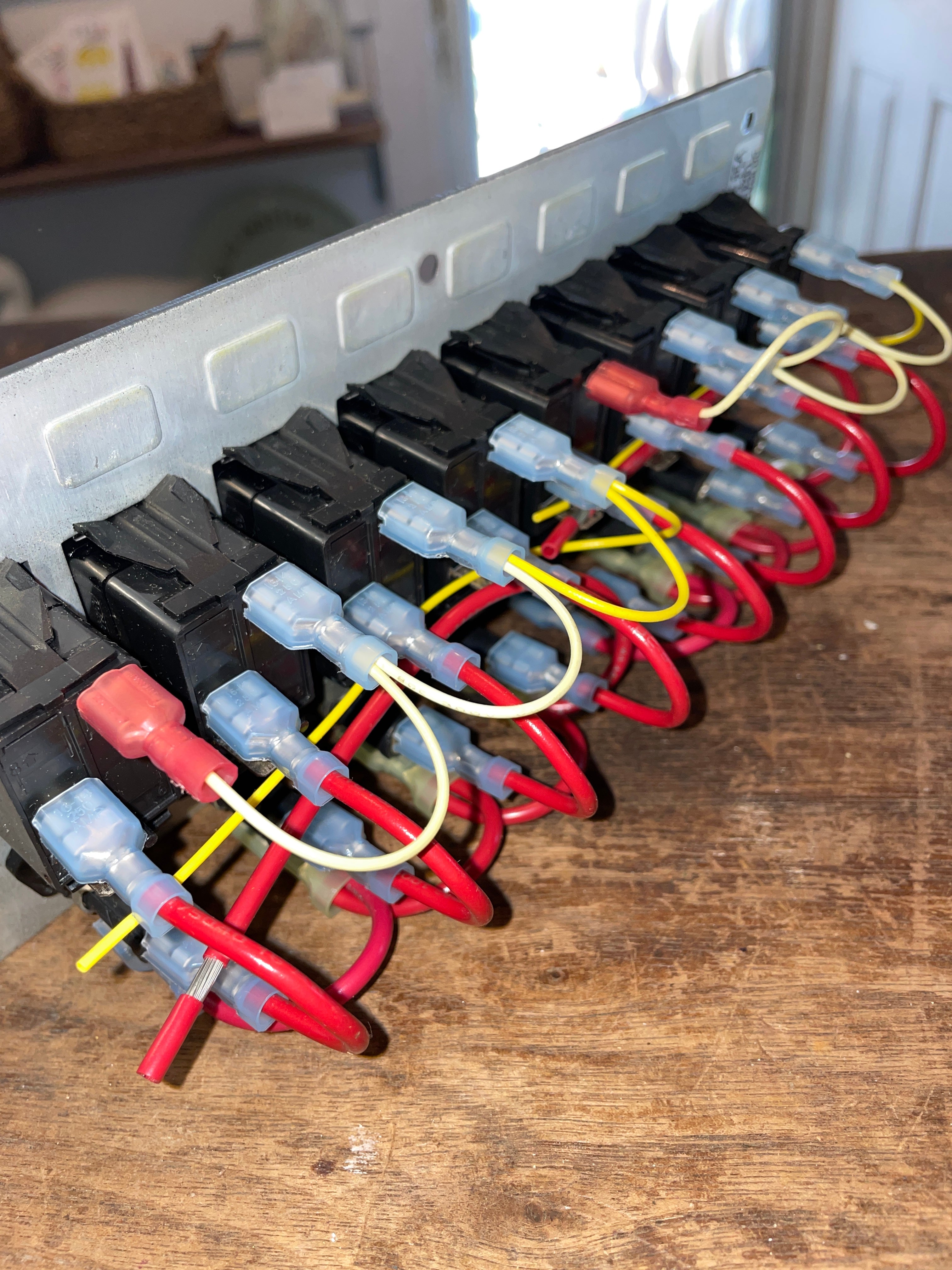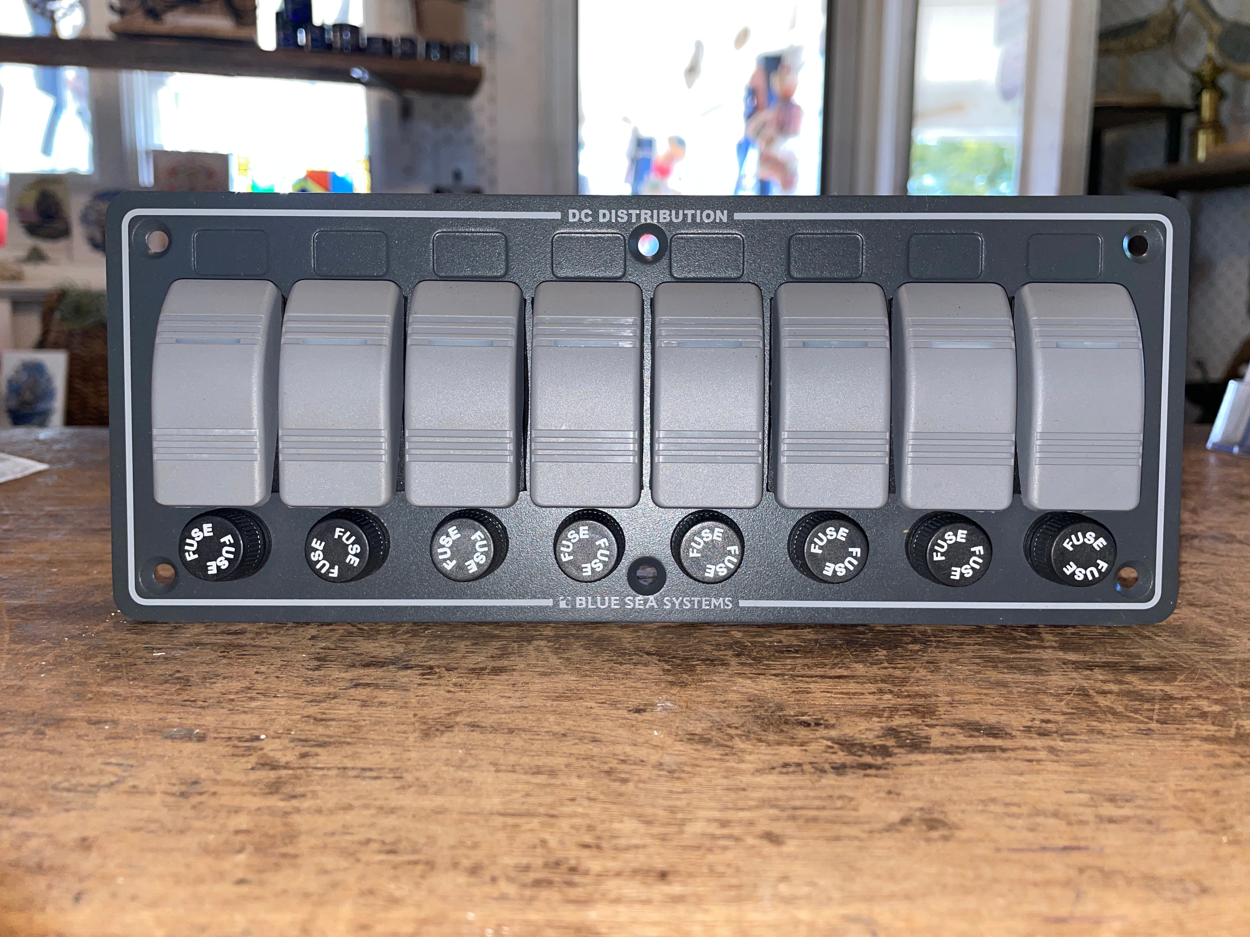 This brand new BSS 8 switch waterproof distribution panel is 12/24 volt DC. PN is 8261. The panel sits horizontally and is 9 3/8” long x 3 7/8” wide x 3” deep (with the wires sticking out). Comes with new packet of the sticker labels.
