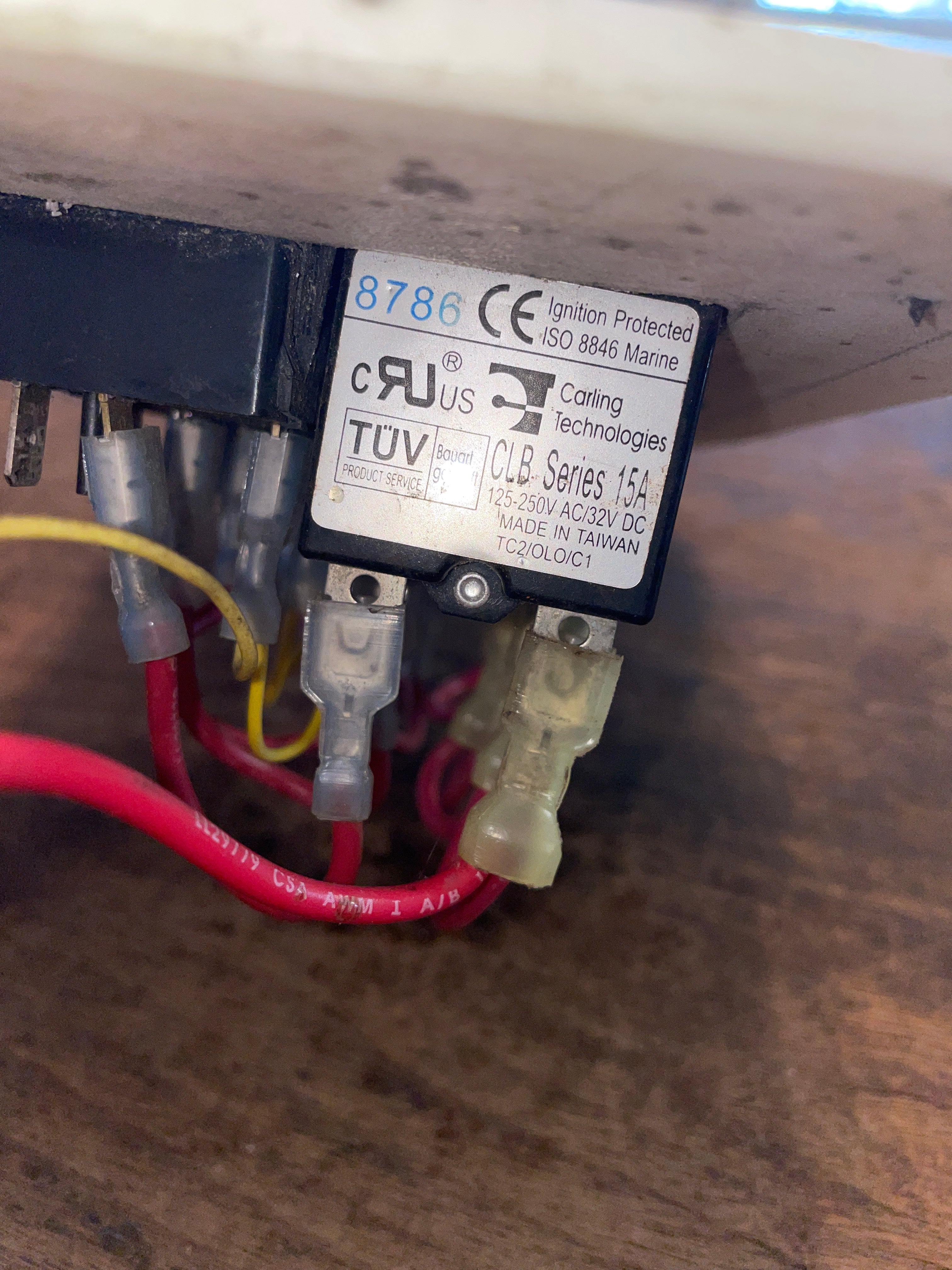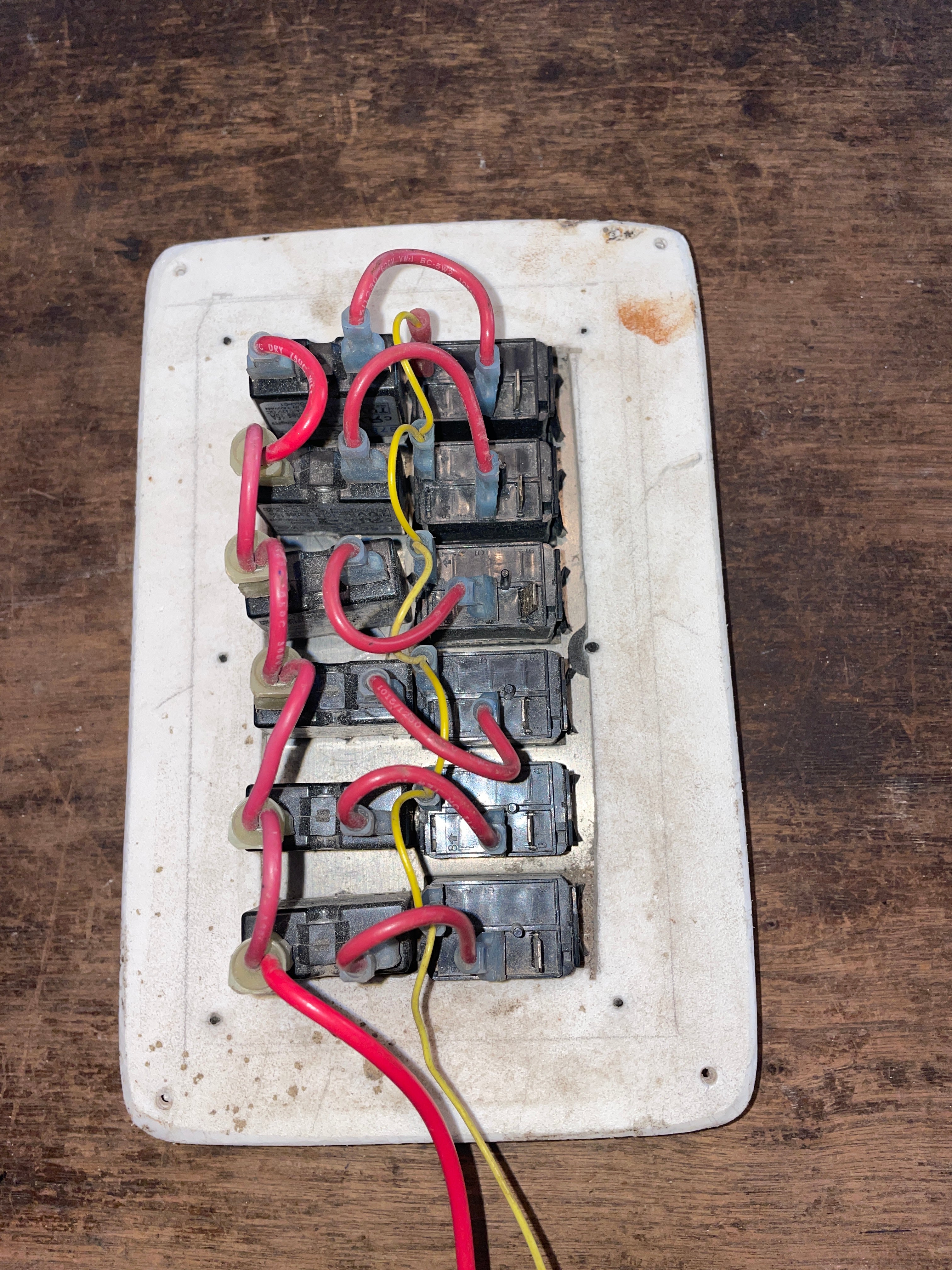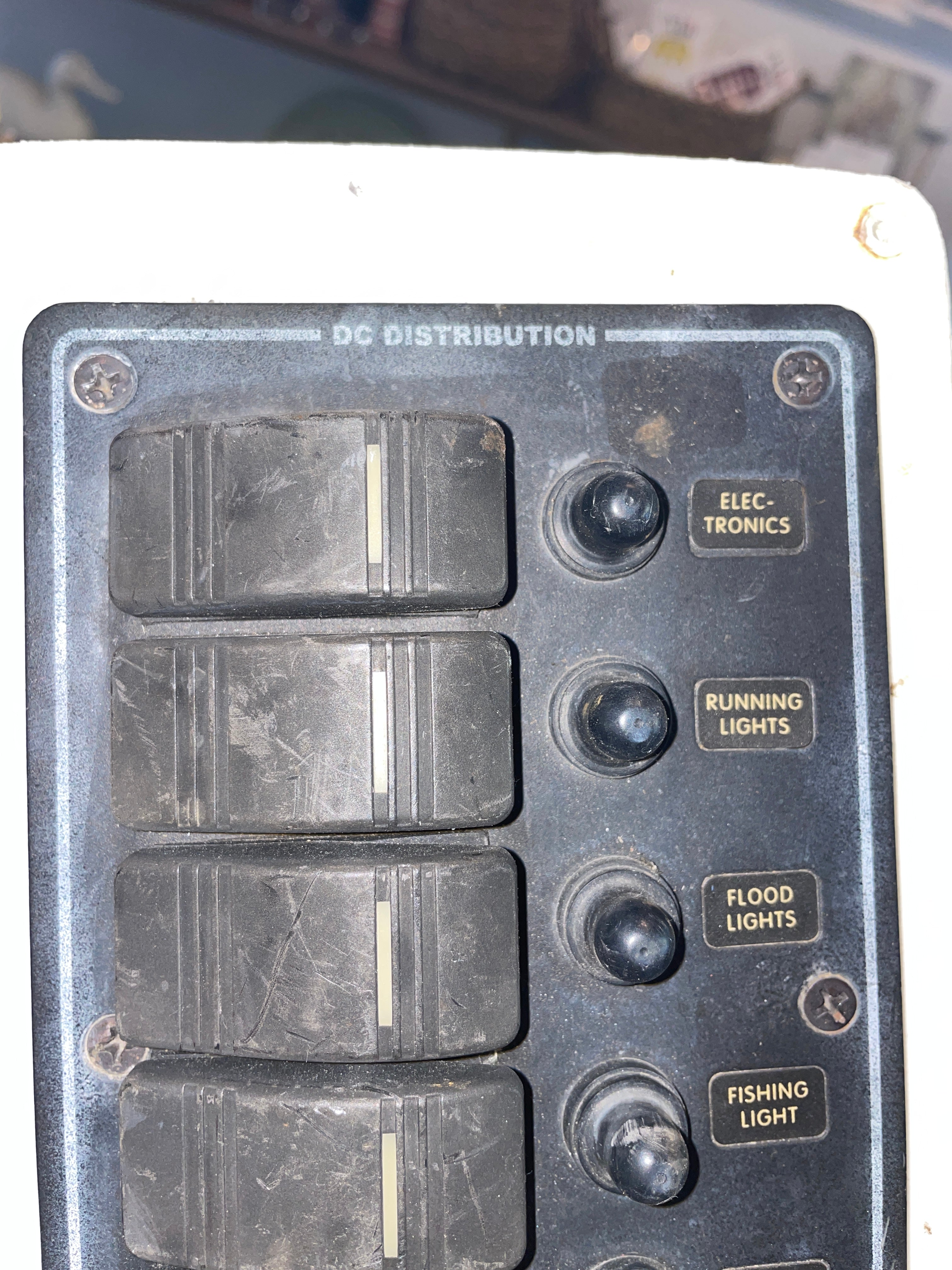 This 6 switch DC distribution panel is in good condition. All switch work as should. Measures 7 1/2” long x 4 1/2” wide x 3” deep. With the backing plate is measures 9” long x 6” wide.