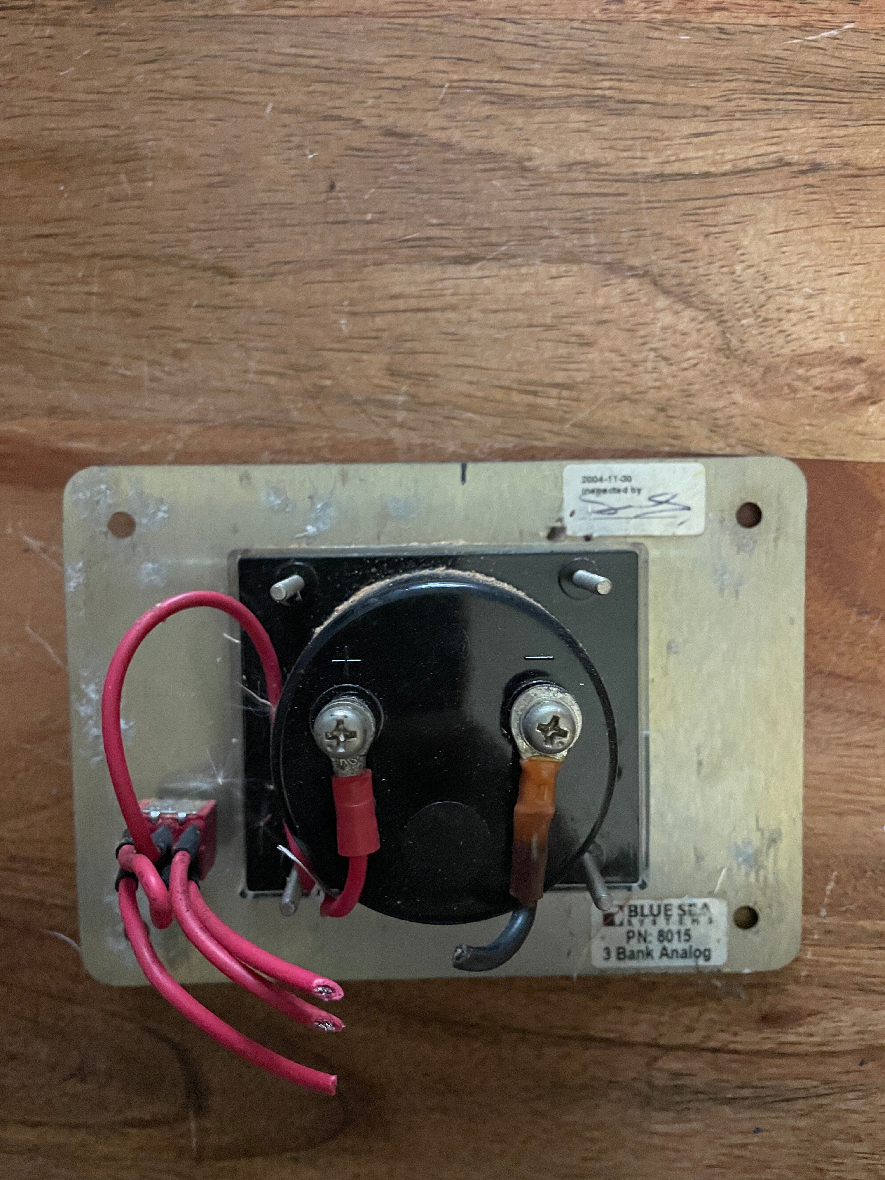 This blue sea systems DC Volts gauge in the panel is in great condition. It measures 5 1/4” long x  3/4” wide x 2” deep. PN 8015. 3 bank analog.