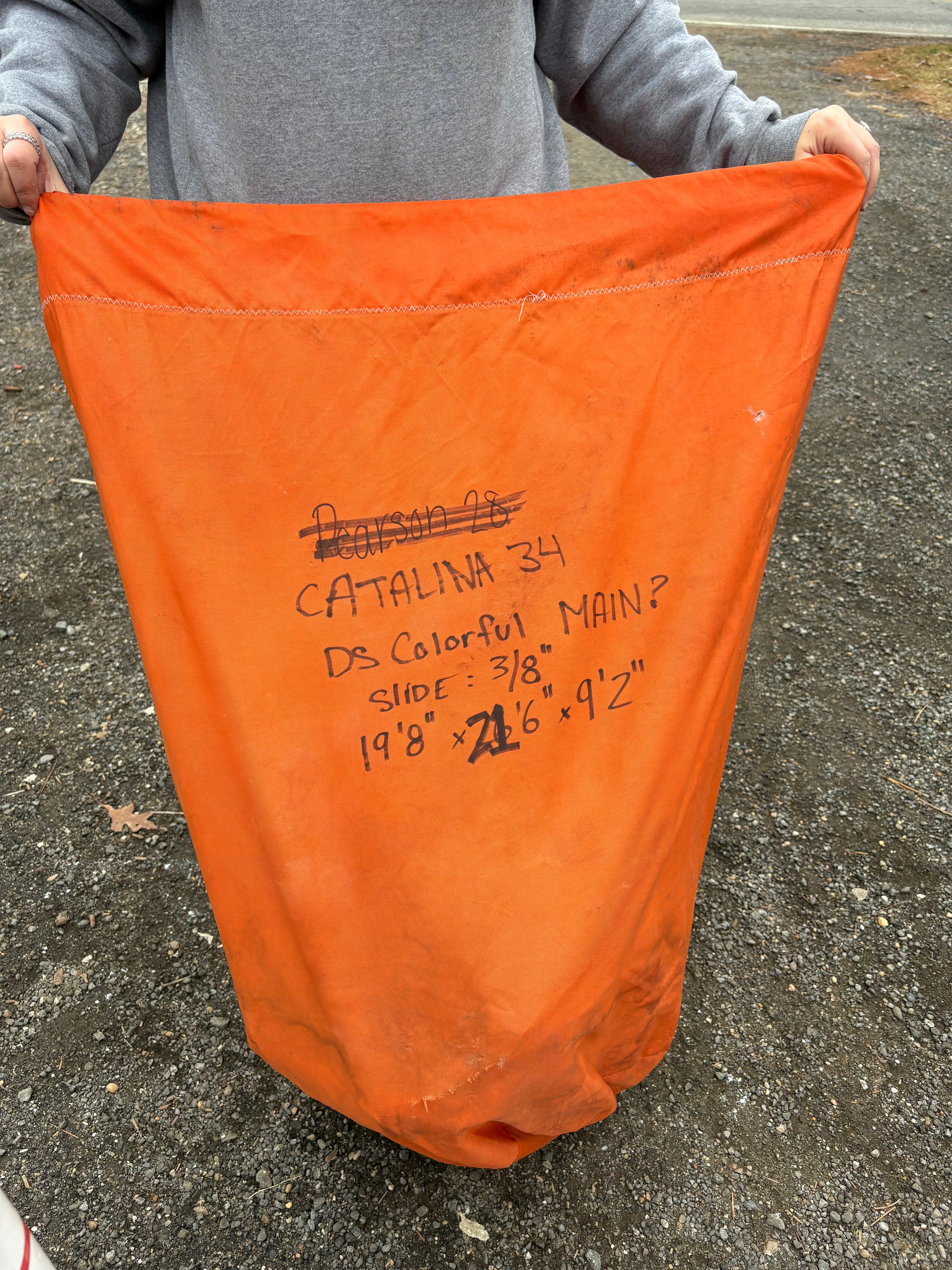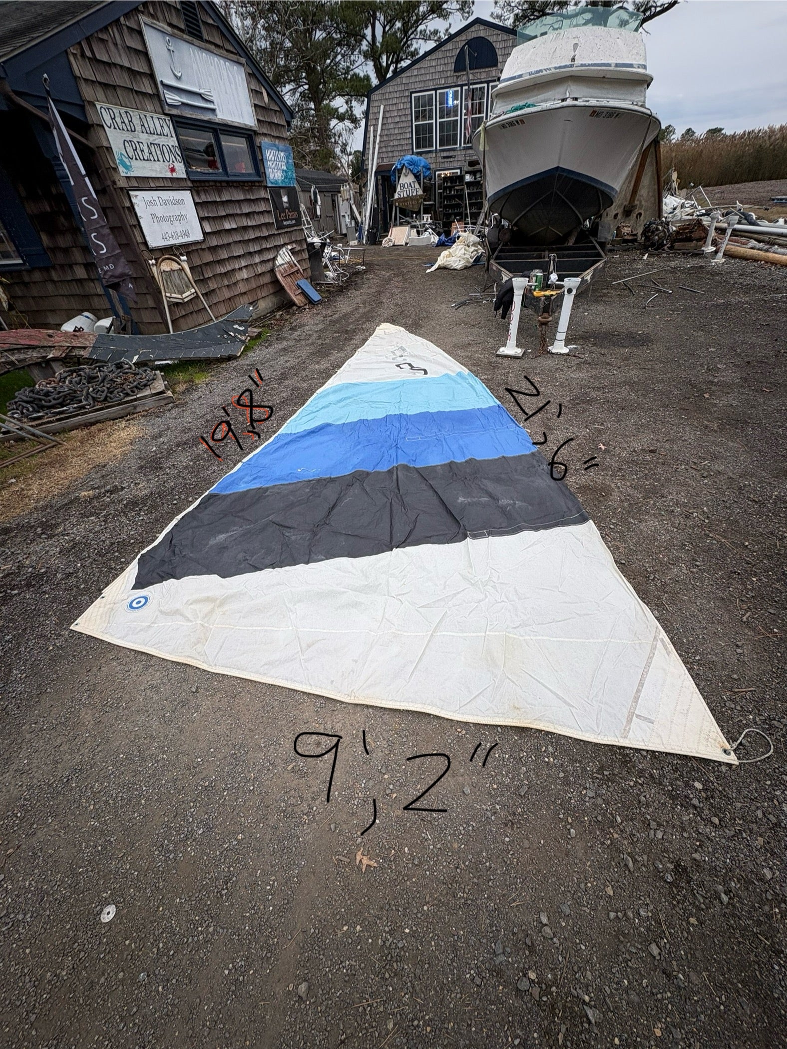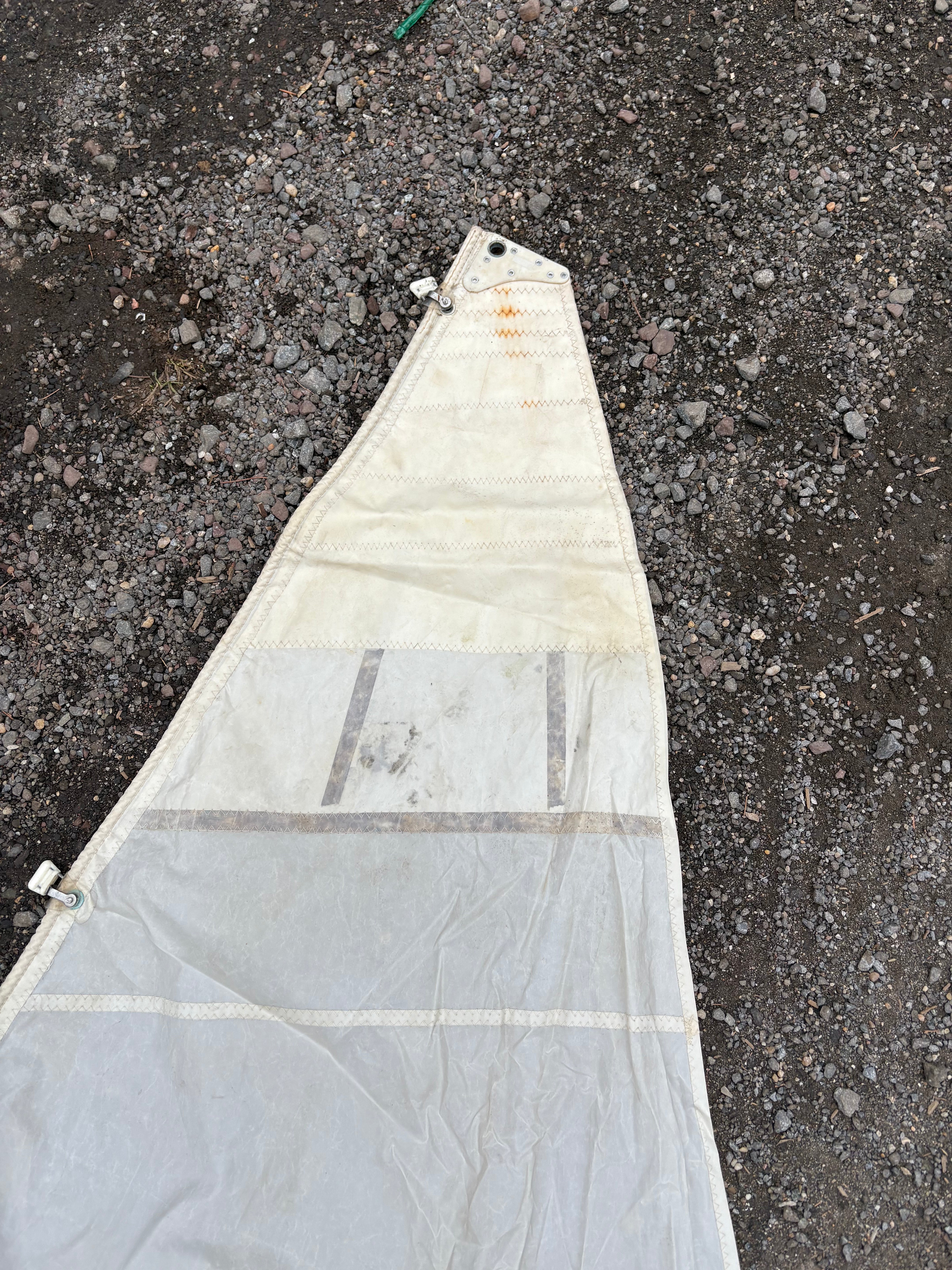 This sail is in great condition. Removed off a Catalina 34 sailboat. The sail I believe is a main sail but could be wrong. The slide is 3/8" diameter. The side with the slide is the luff measuring 19'8". The leech is 21'6" and the foot is 9'2". Comes with a bag.