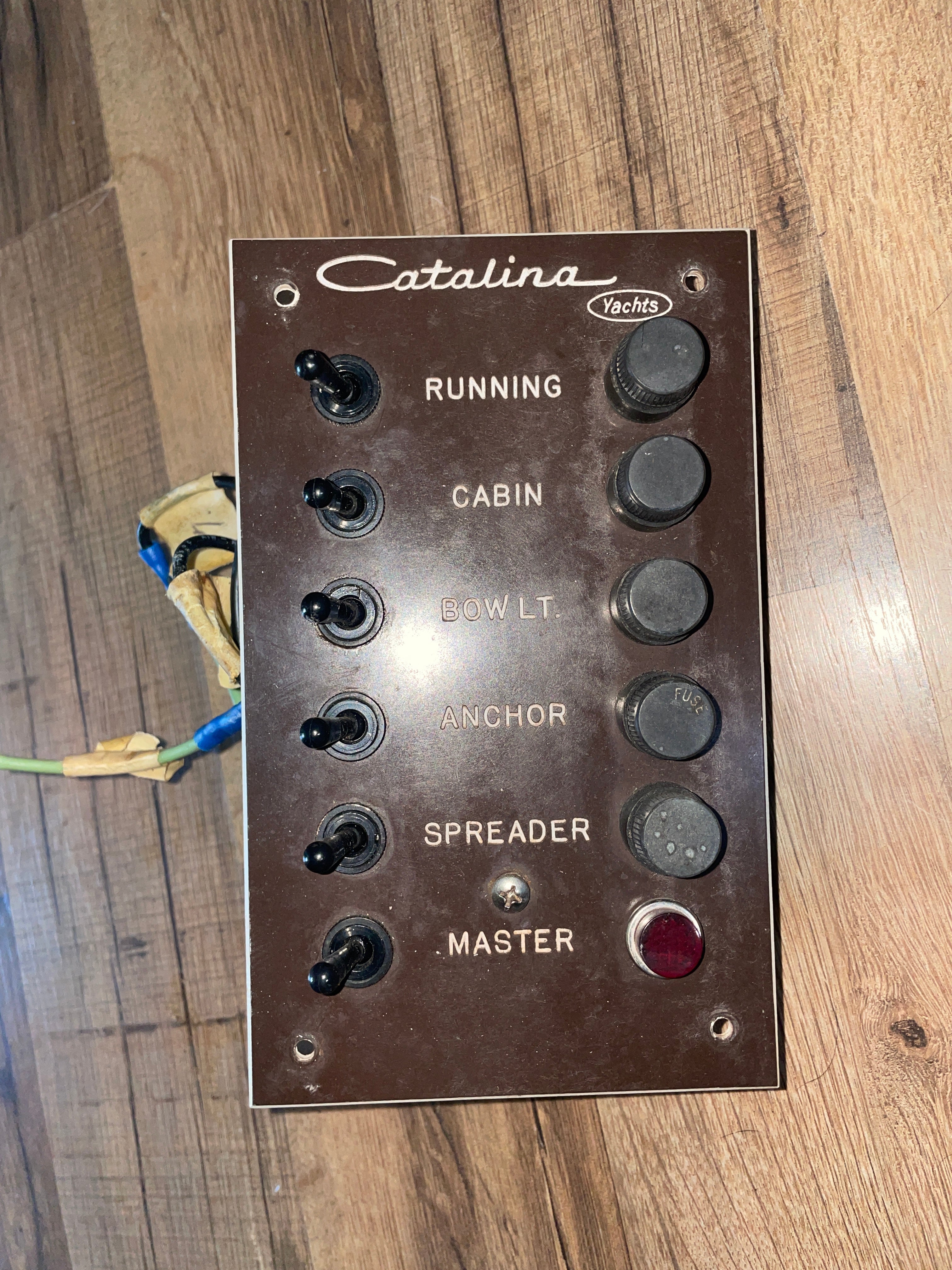 This Catalina yachts 6 switch panel is in great condition. Very clean. It was removed off a Catalina 25 sailboat. Measures 7” long x 4 1./4” wide x 1 1/2” deep.