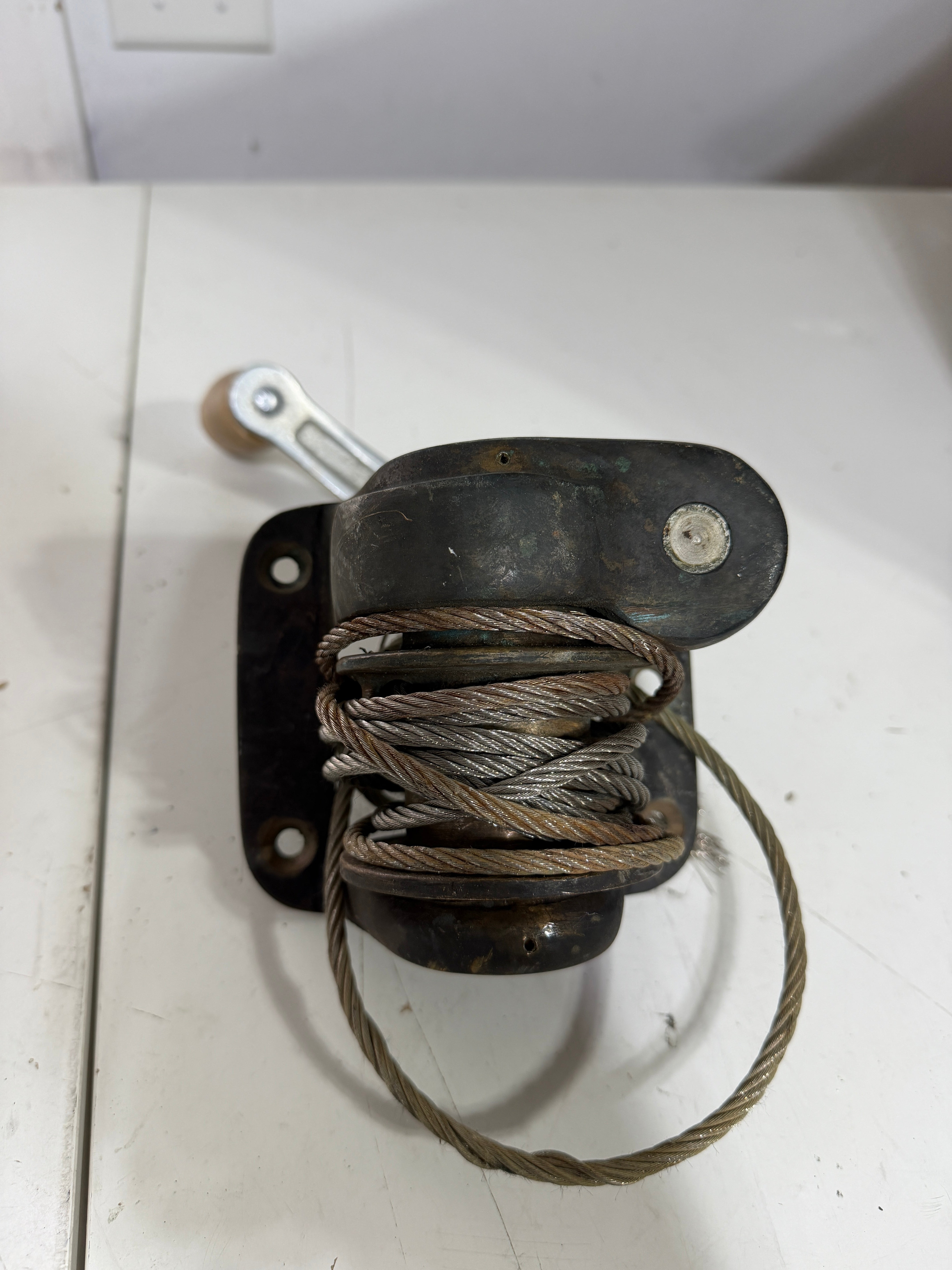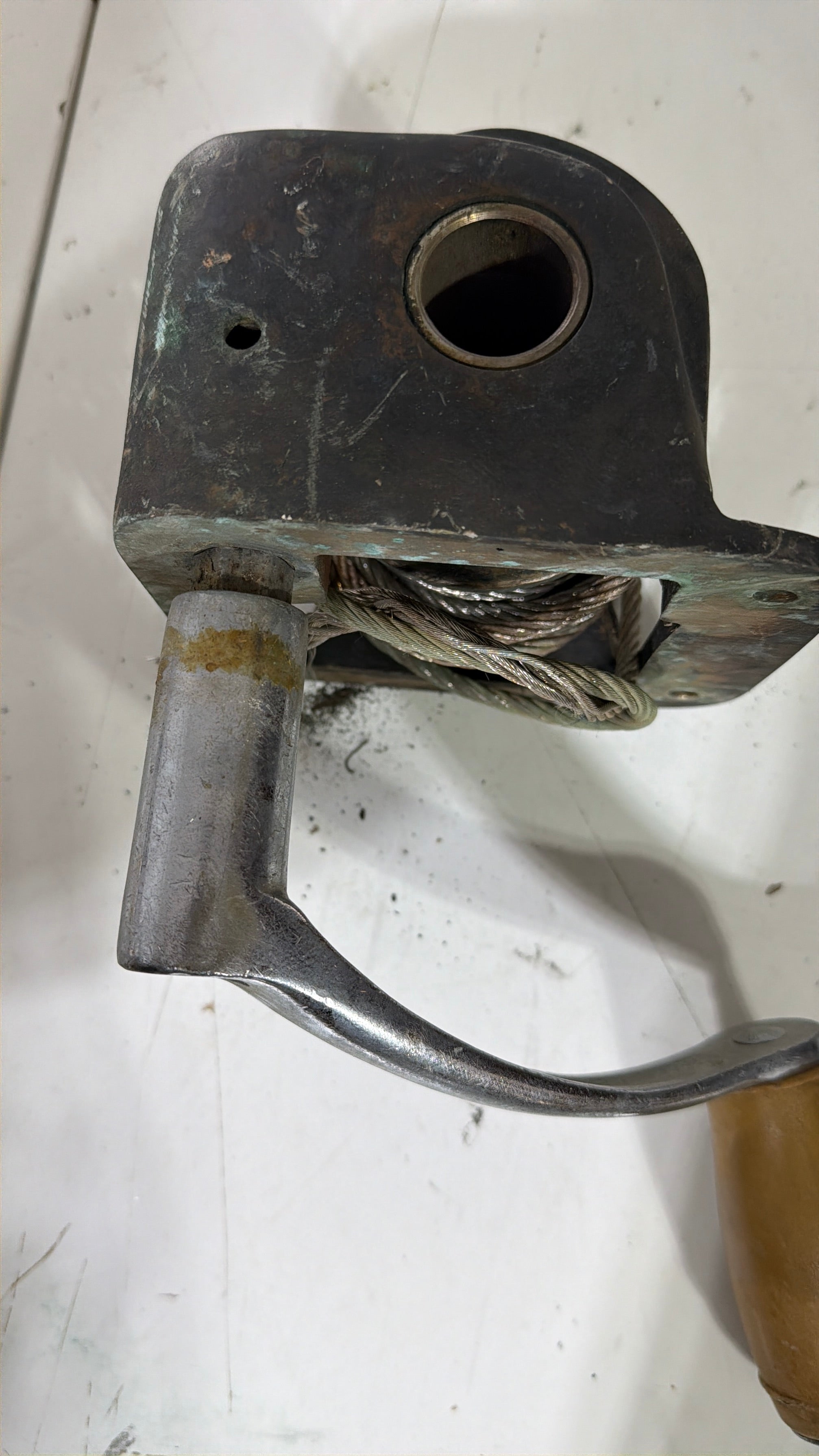 This center board winch with handle was removed off an allied Seabreeze 33. The winch itself is solid bronze. The base measures 5" long x 4 1/2" wide x 3 1/2" tall. The mounting holes are 3" apart on the farther side and 1 3/4" apart on the shorter side. Currently has 3/16" cable (was cut so it is useless - left on so we knew appropriate cable size used). The crank handle is chromed bronze.