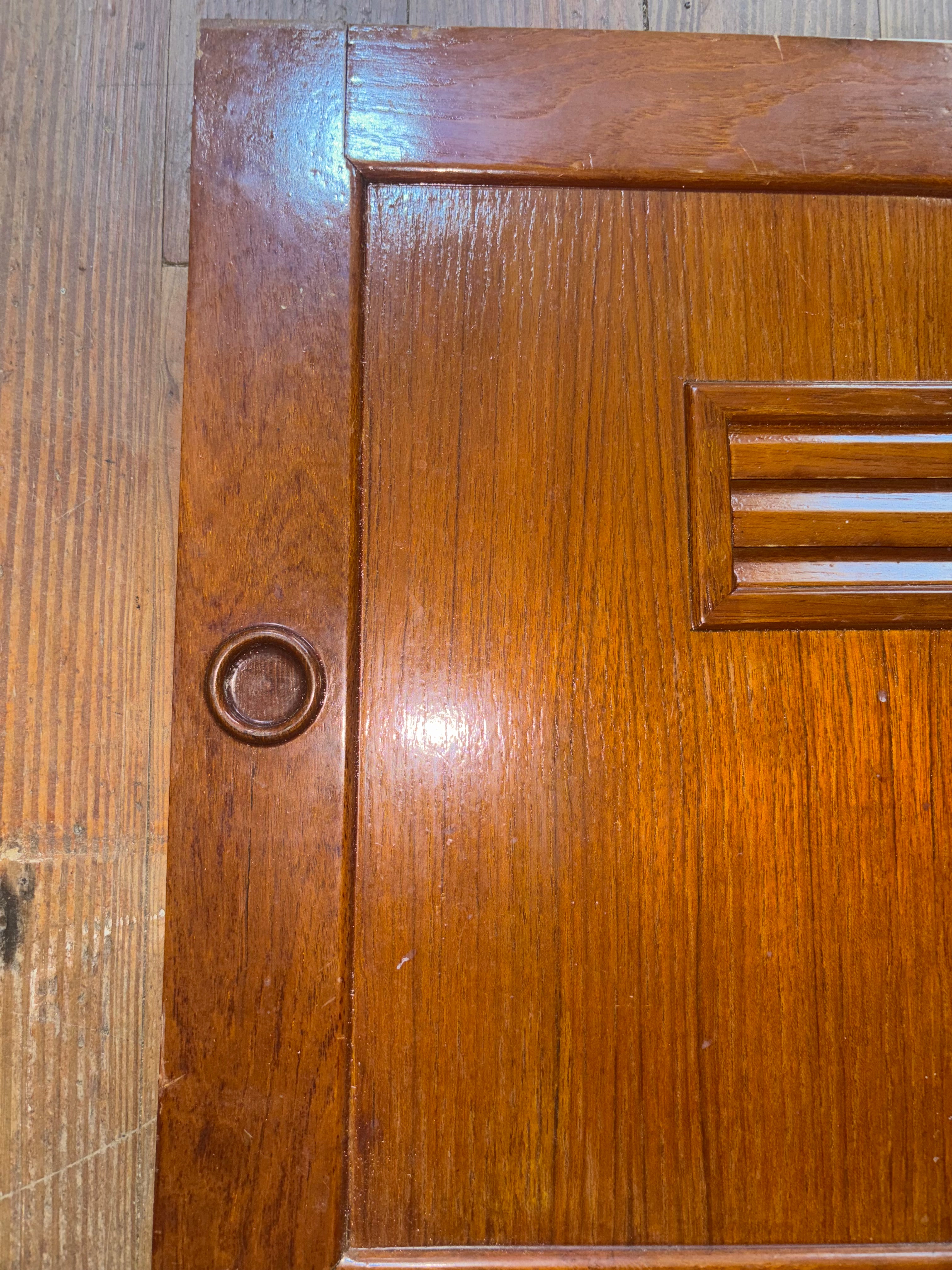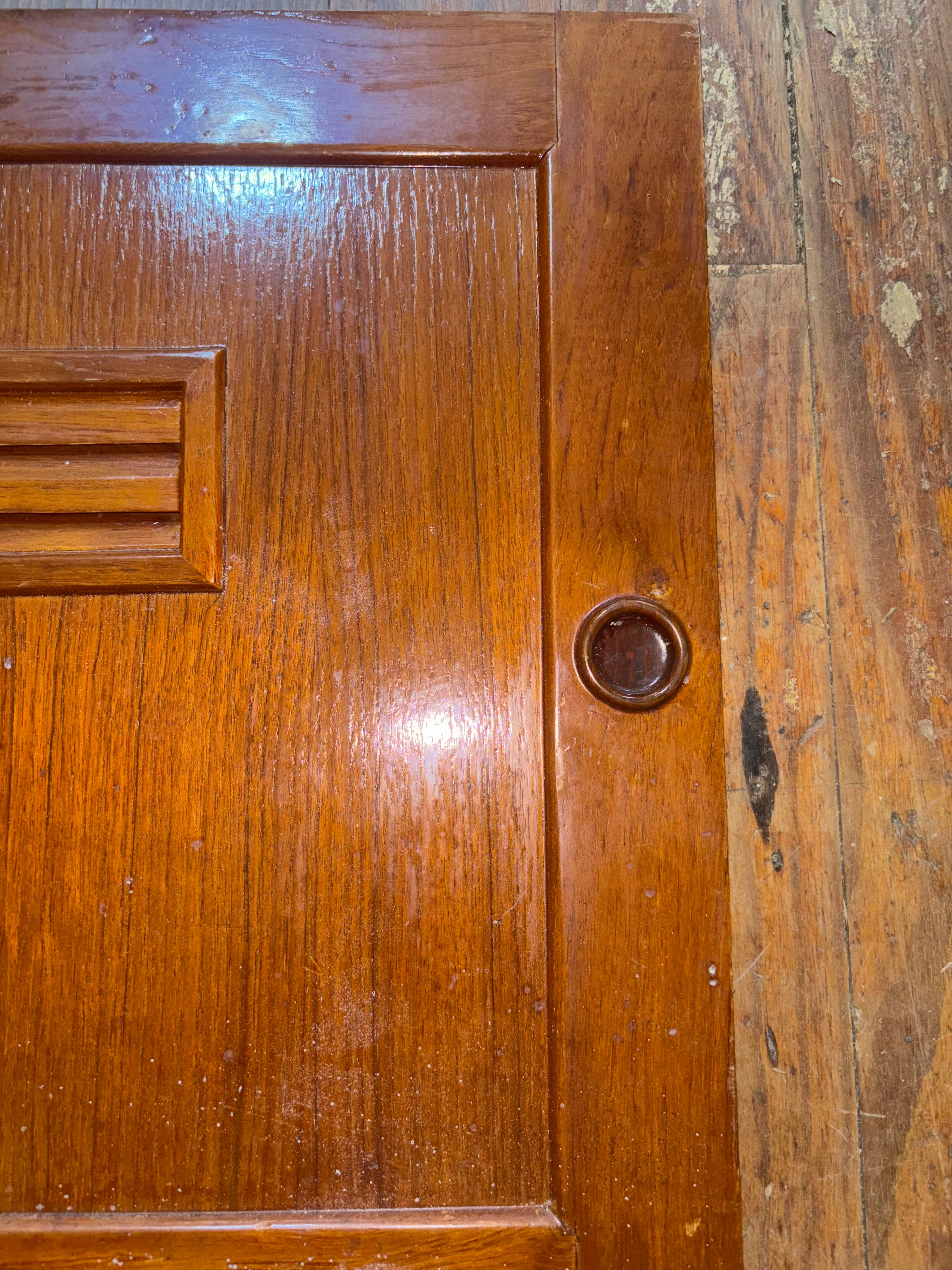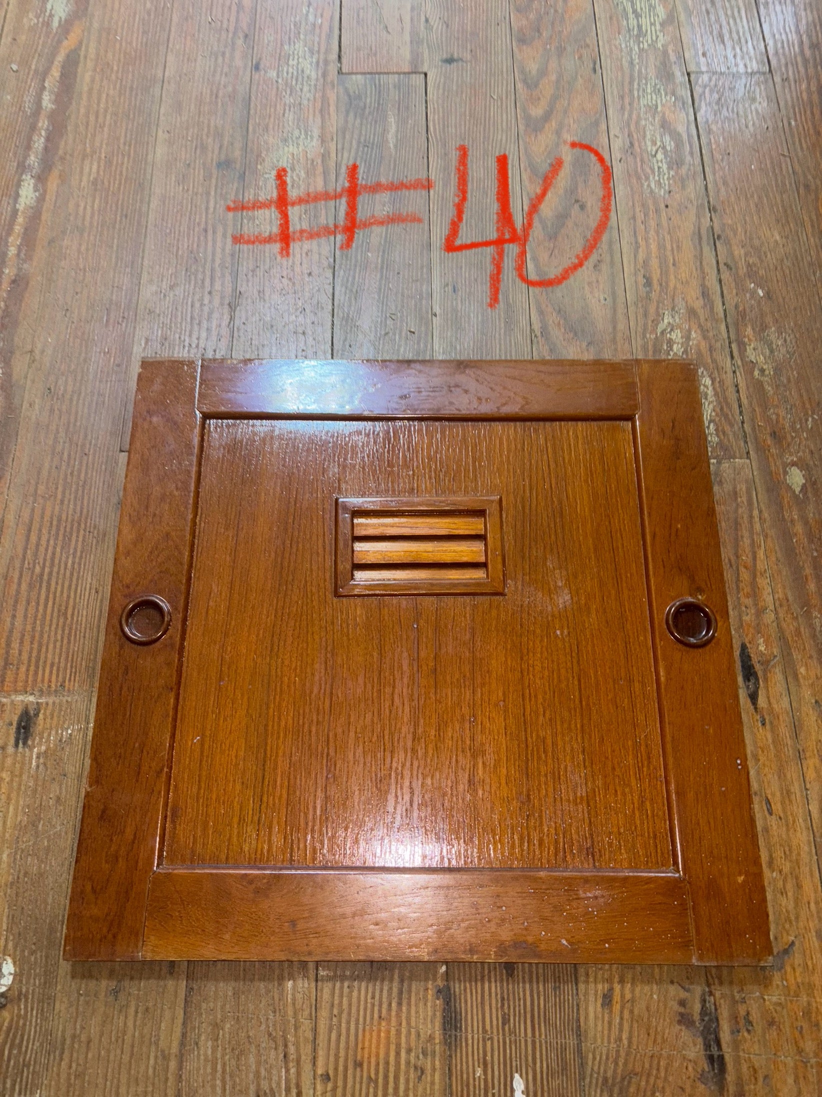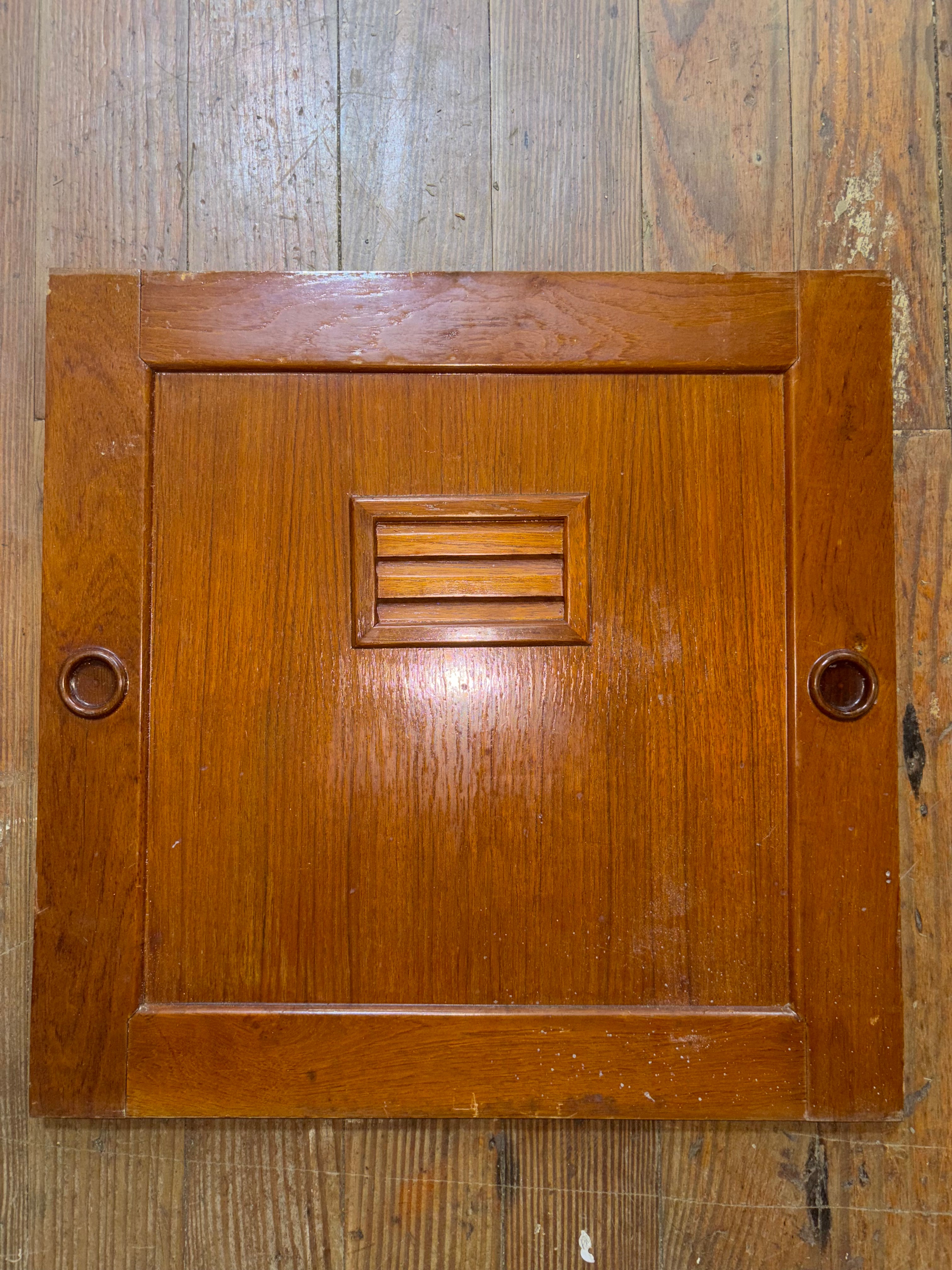 This interior cabinet door was removed off a cheoy lee 36. It is in very nice condition. Has a nice shiny varnish, very minimal scratching and the hinges are in good working condition. The door measures 17 1/2" x 17 1/4".