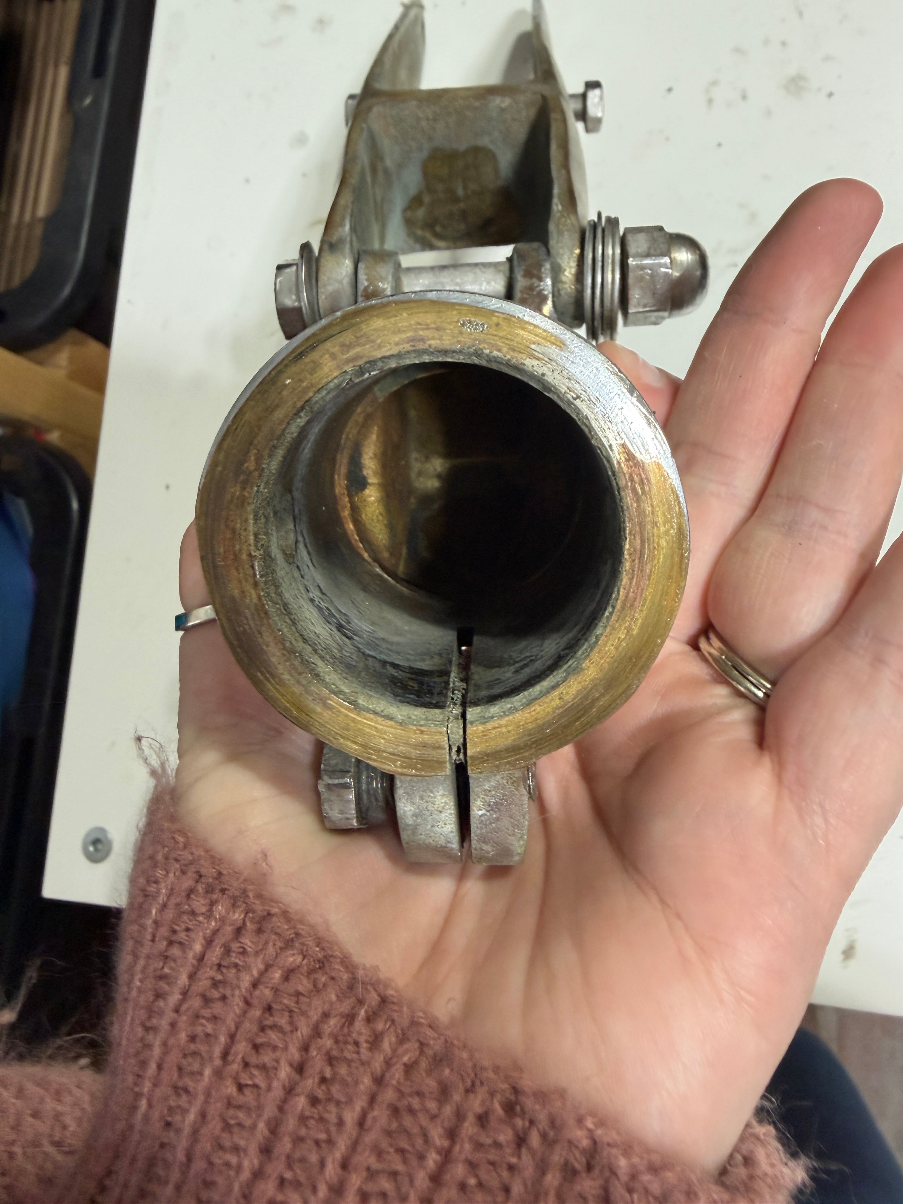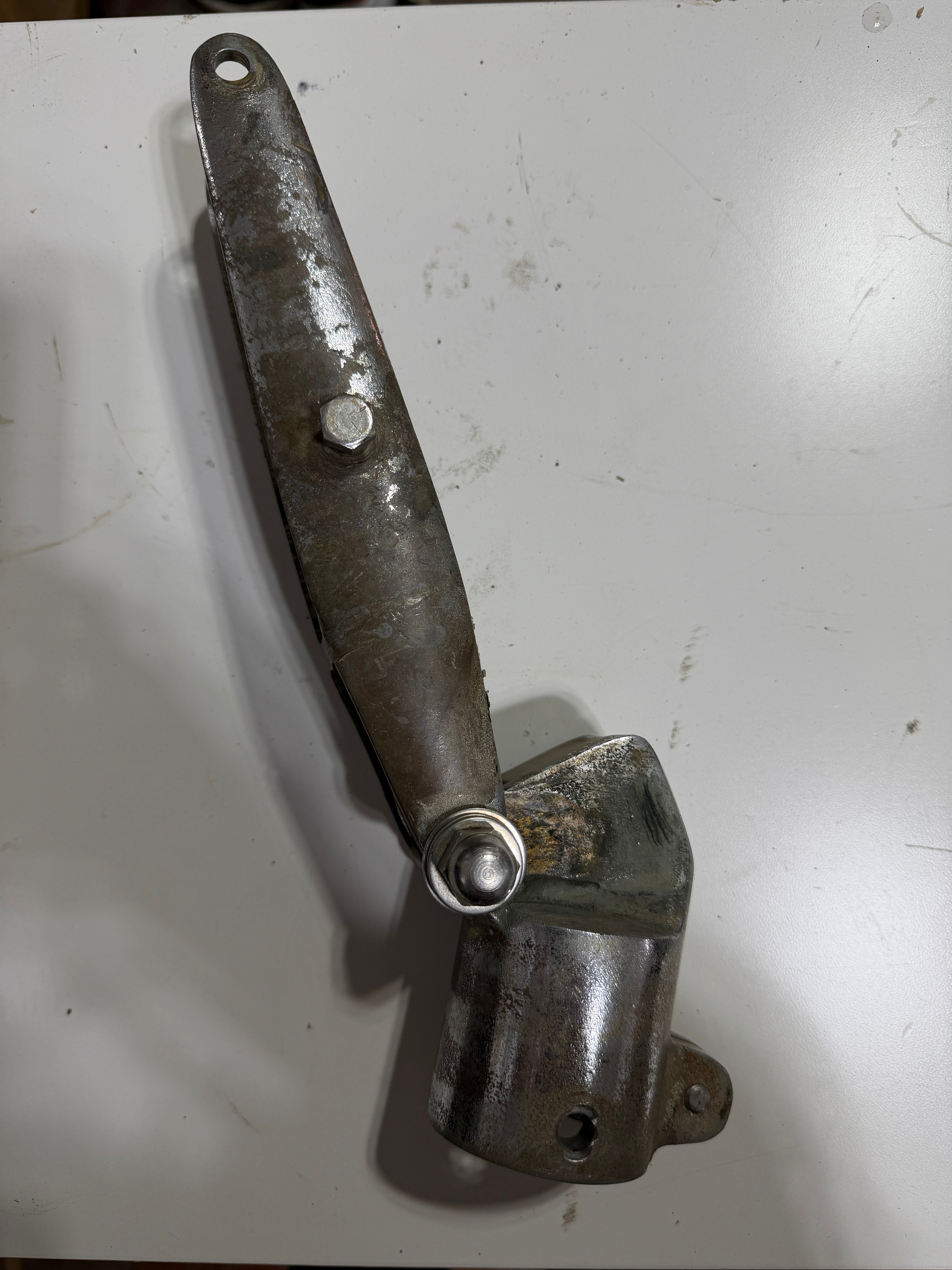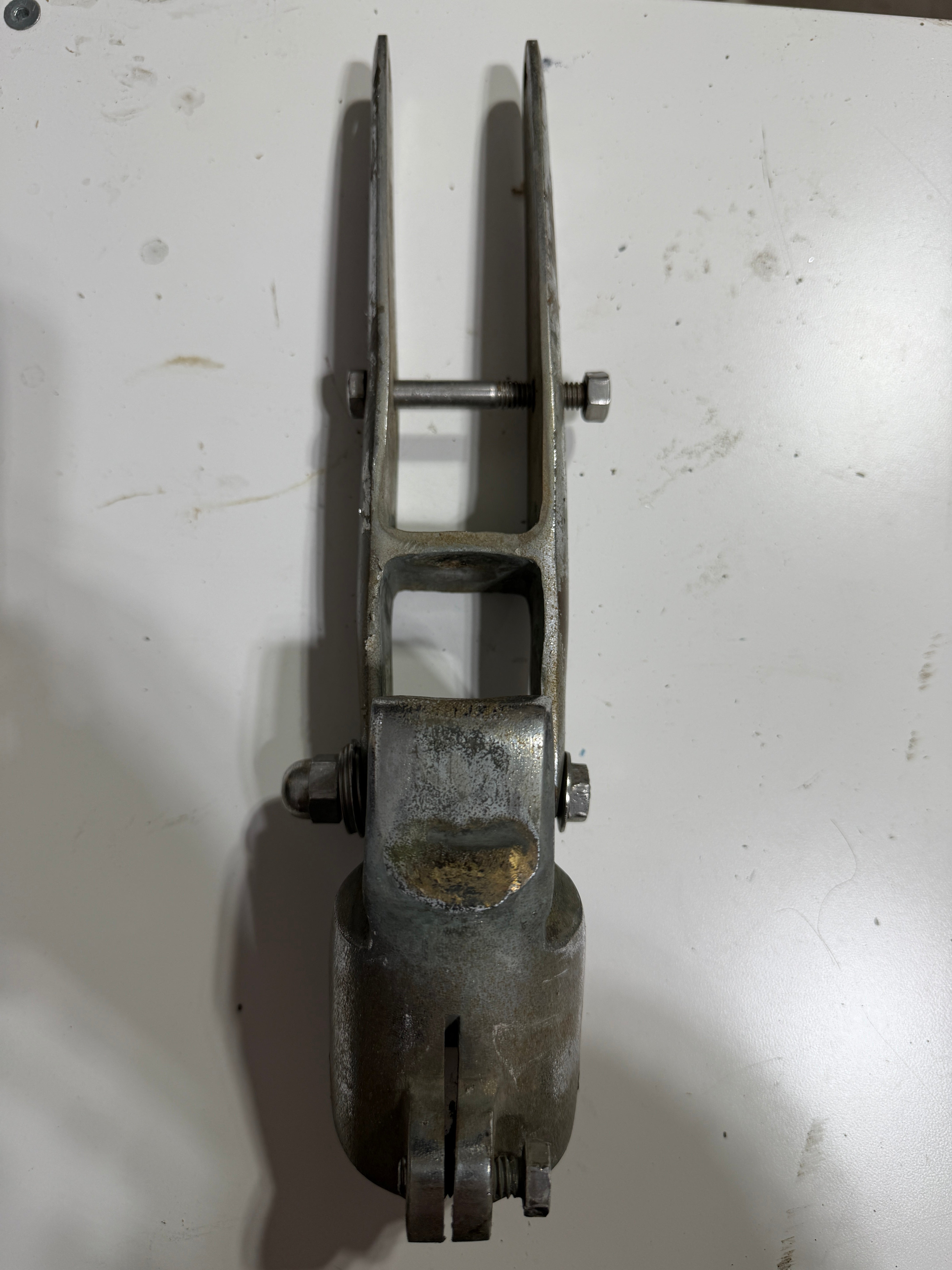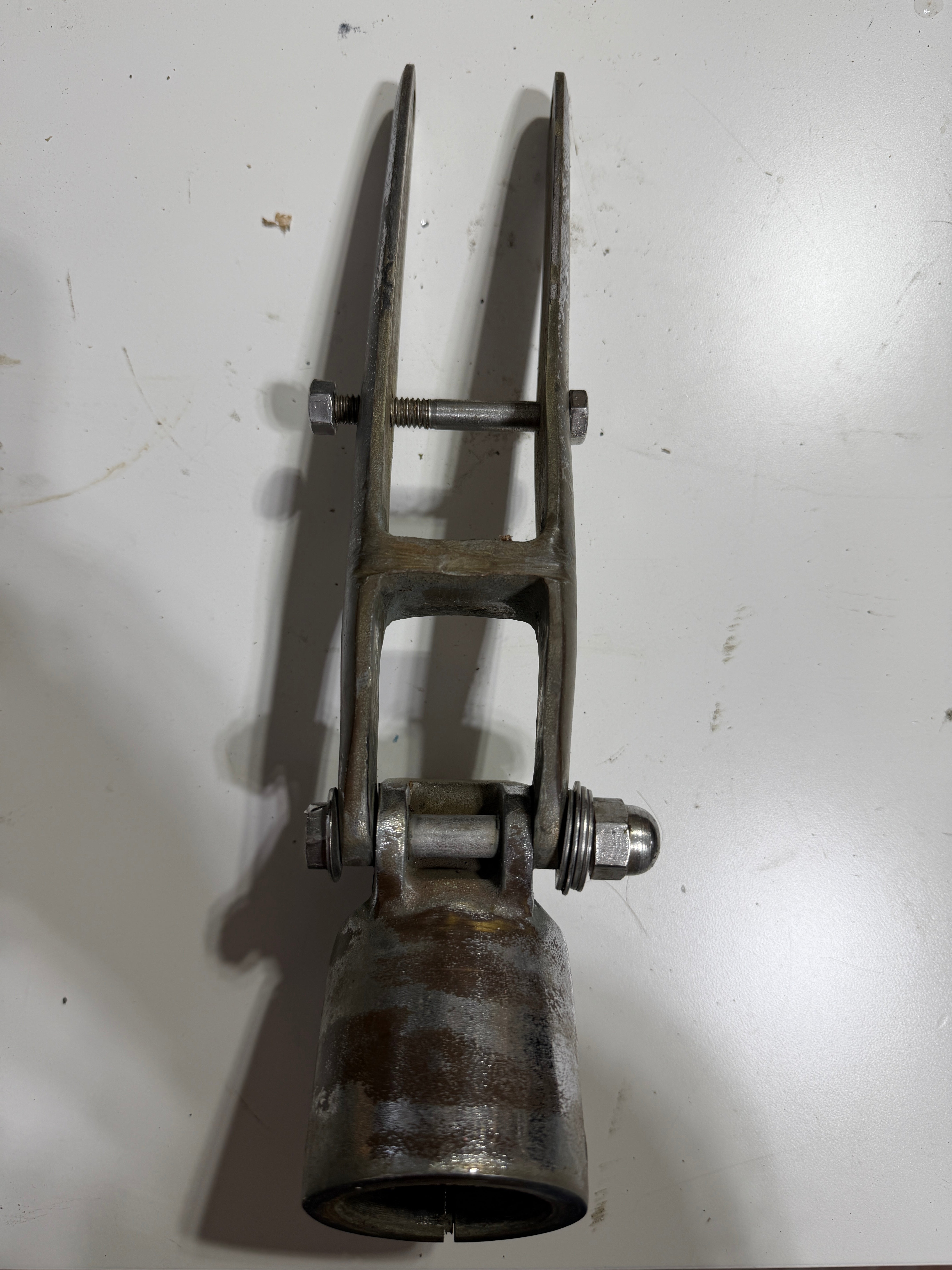 This chromed bronze tiller hardware and rudder cap are in good condition. The tiller hardware is 9" in length and has a 1 1/2" diameter. The bolt is 3/8" diameter. The rudder cap has a 1 5/8" diameter.
