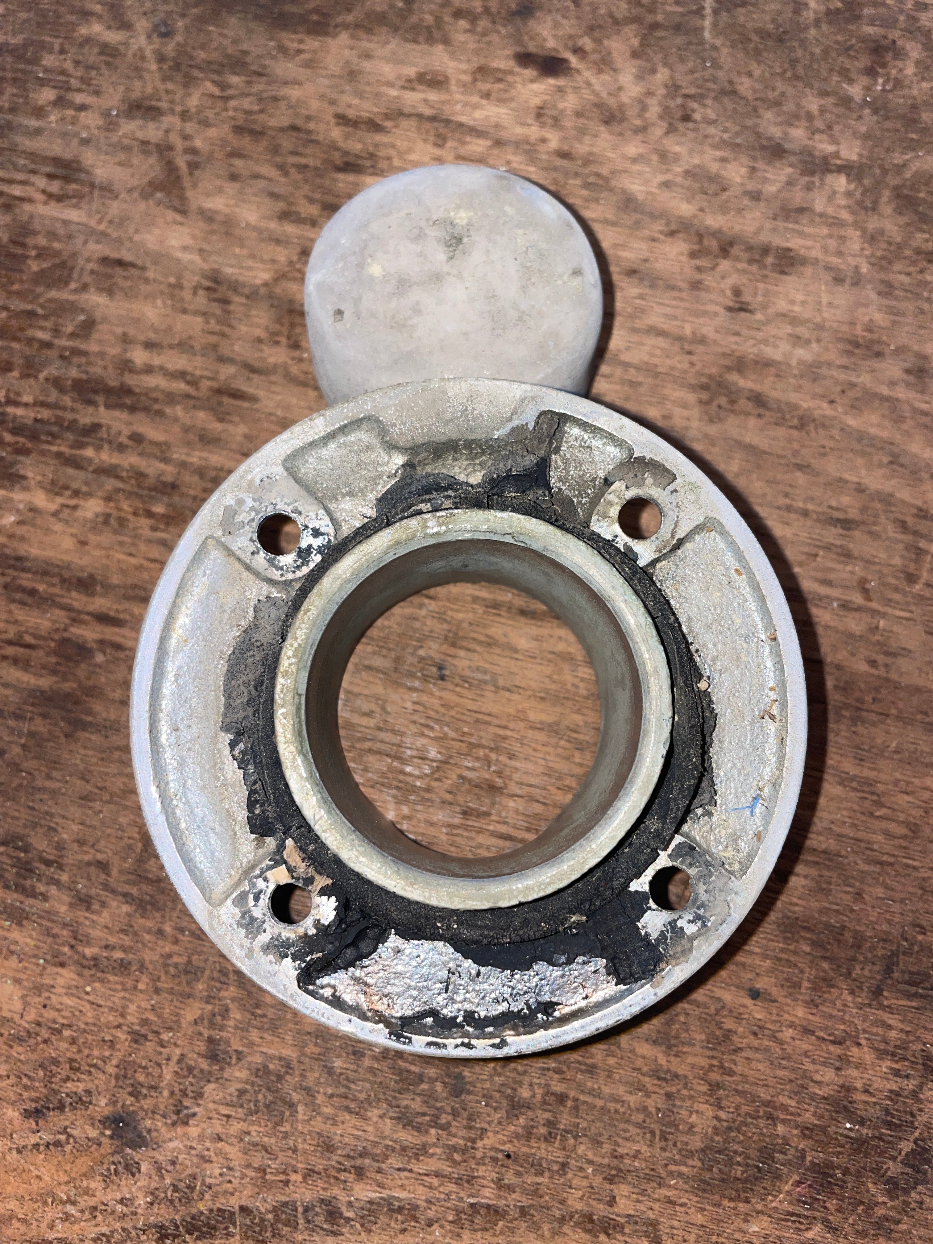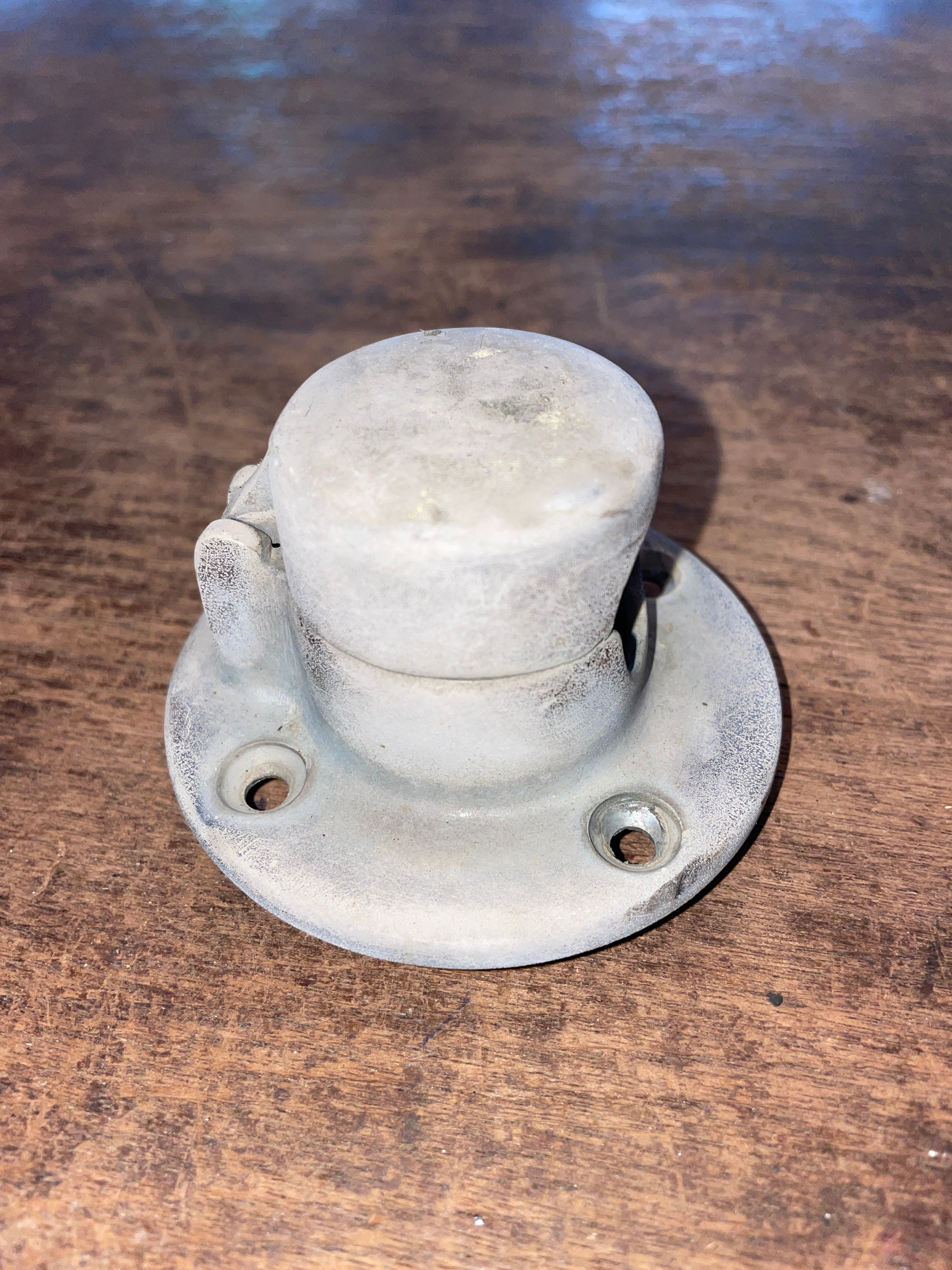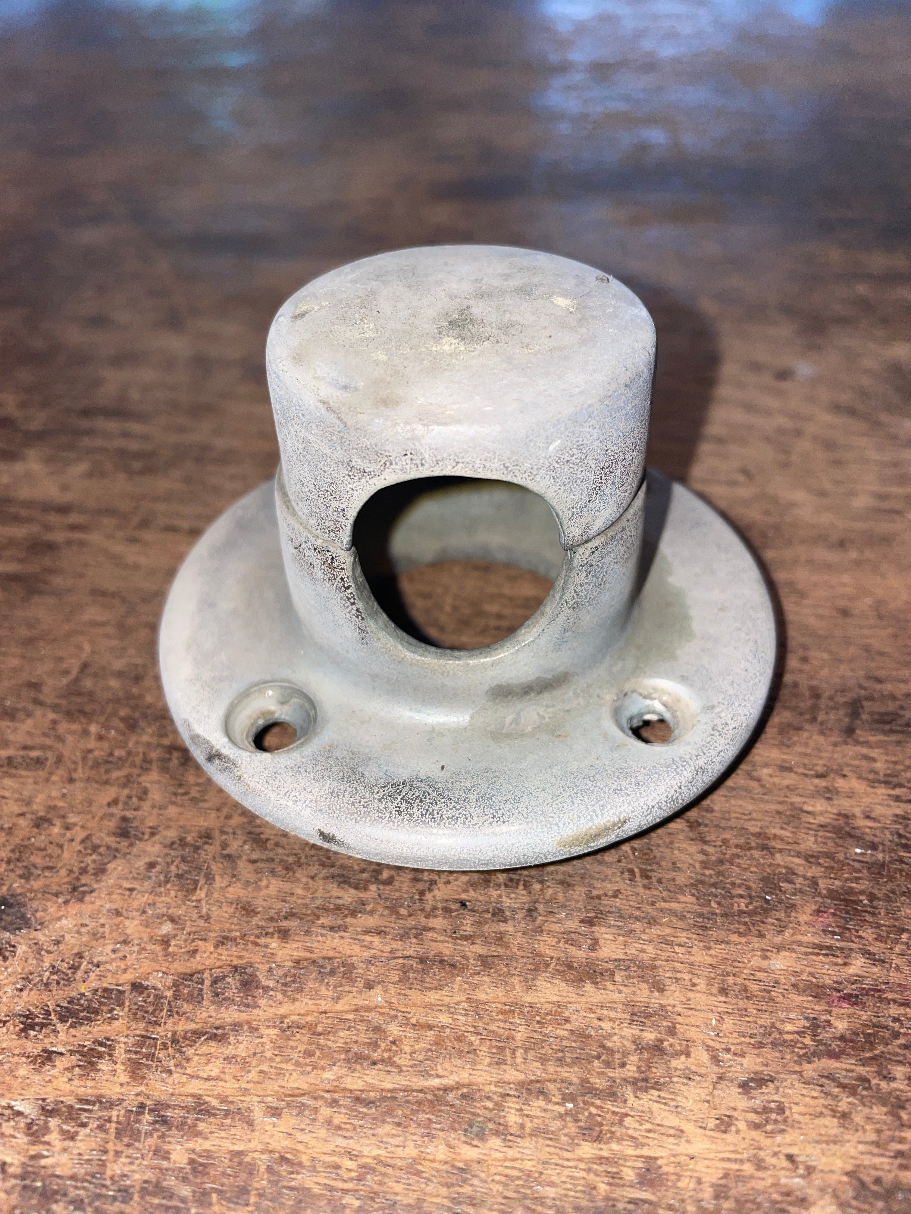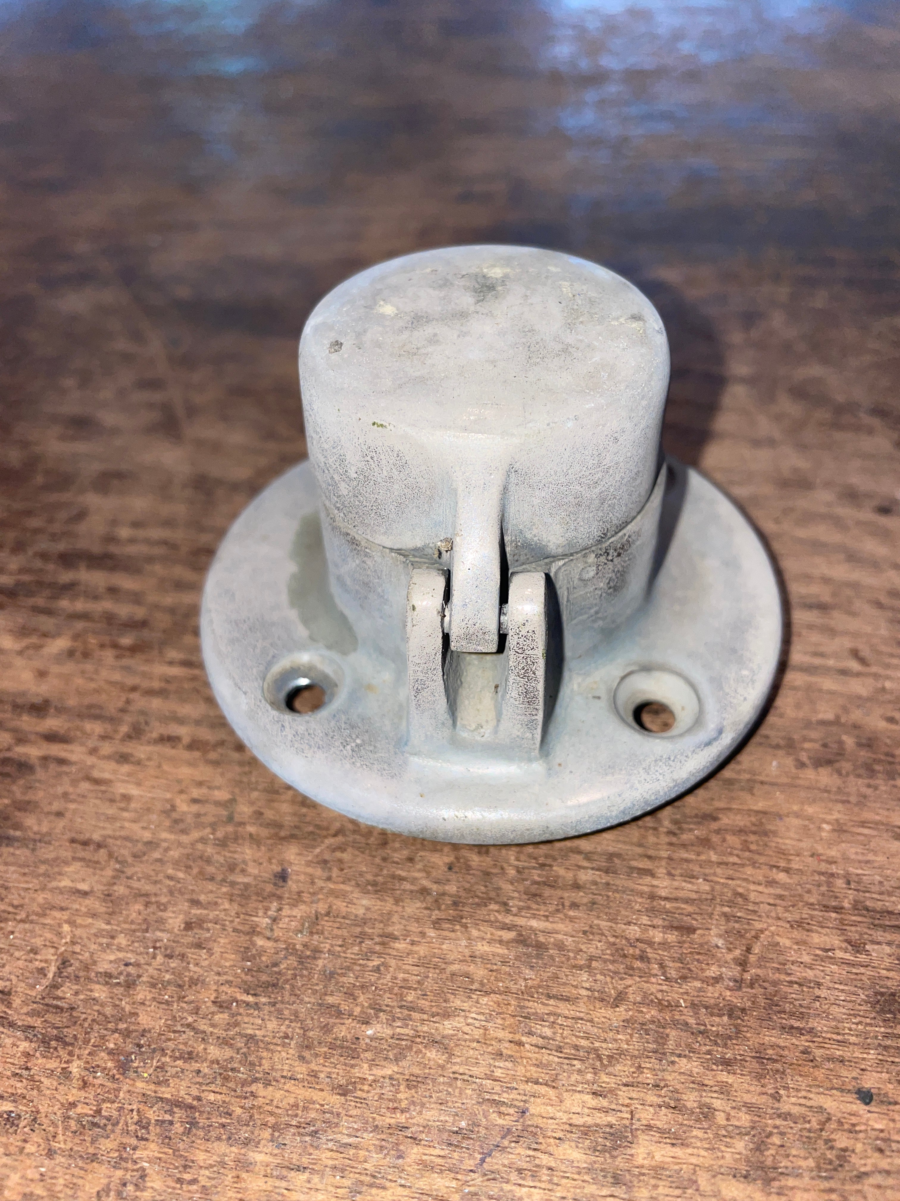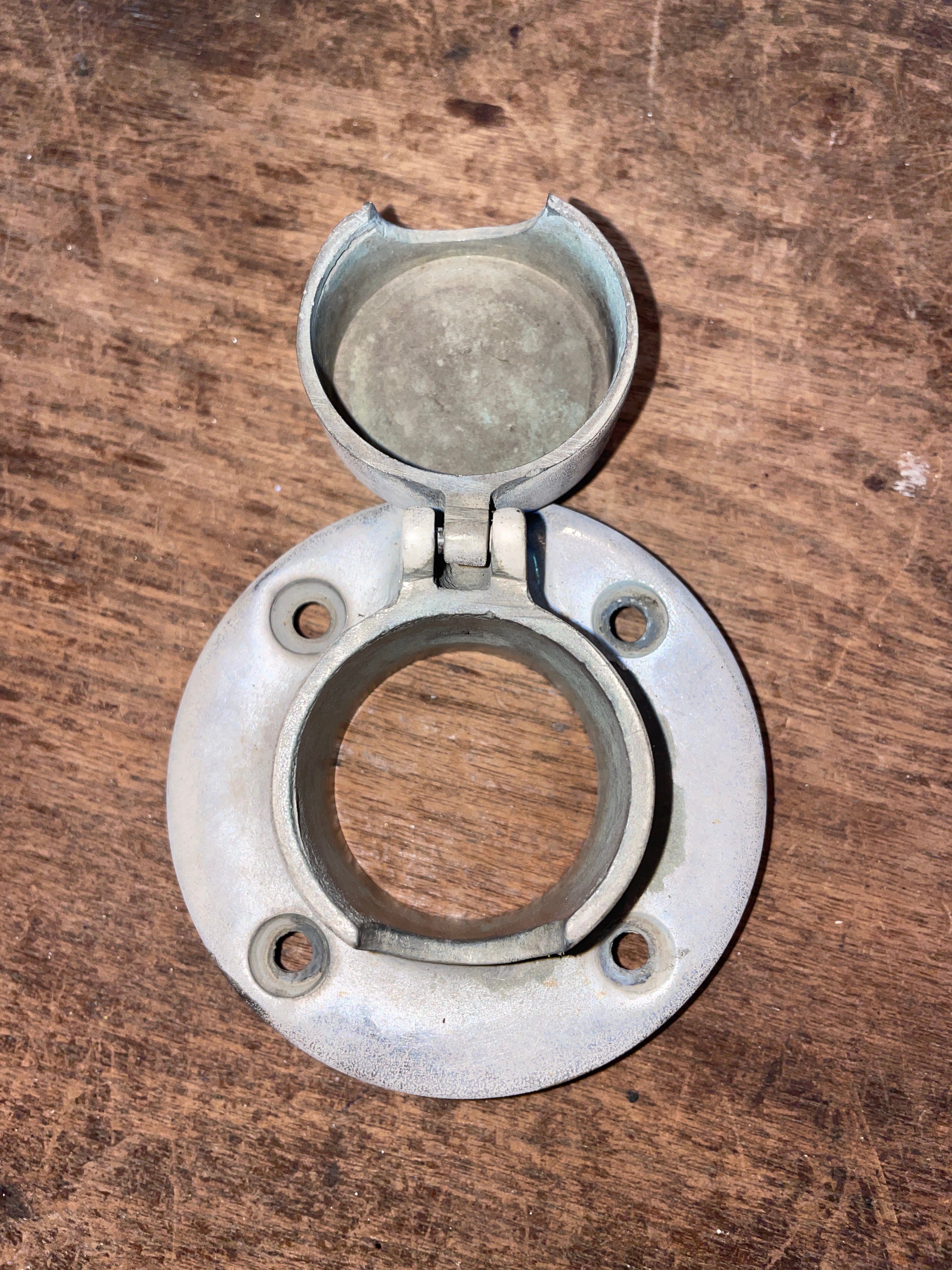 This chromed bronze anchor pipe Hawse is in good condition. The lid is hinged. The insert for the deck is 1 3/4”. The total diameter of the base where it is 4 screw install is 3 1/8”. Width of gap is 7/8” circle.