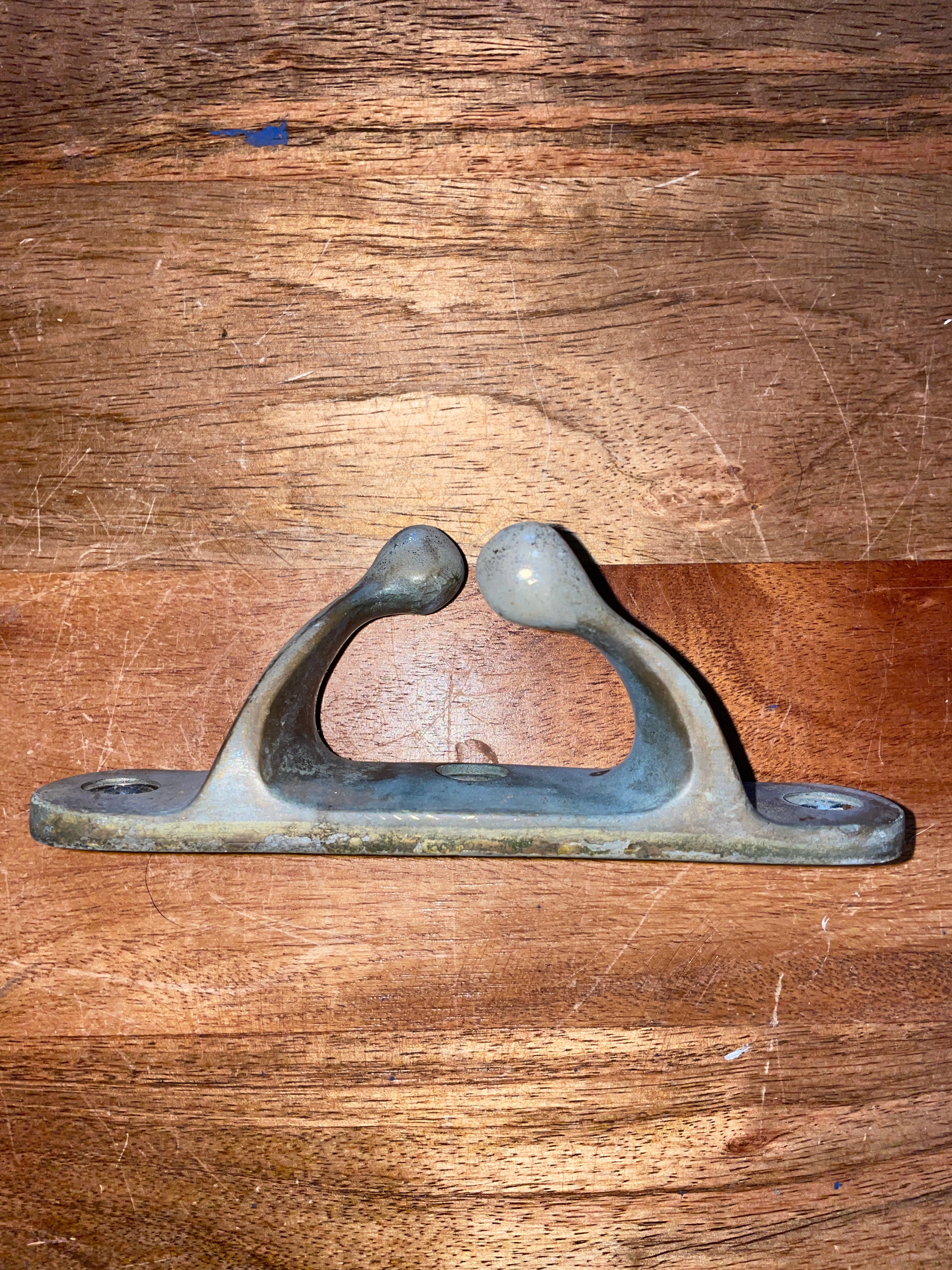 This chromed bronze chock cleat is is great condition. Has the super cool round end design. This cleat is 5 5/8” long at the base. The width of the cleat is 1 1/4”. The width for line between the chock is 1/2”. Stands 2” tall.