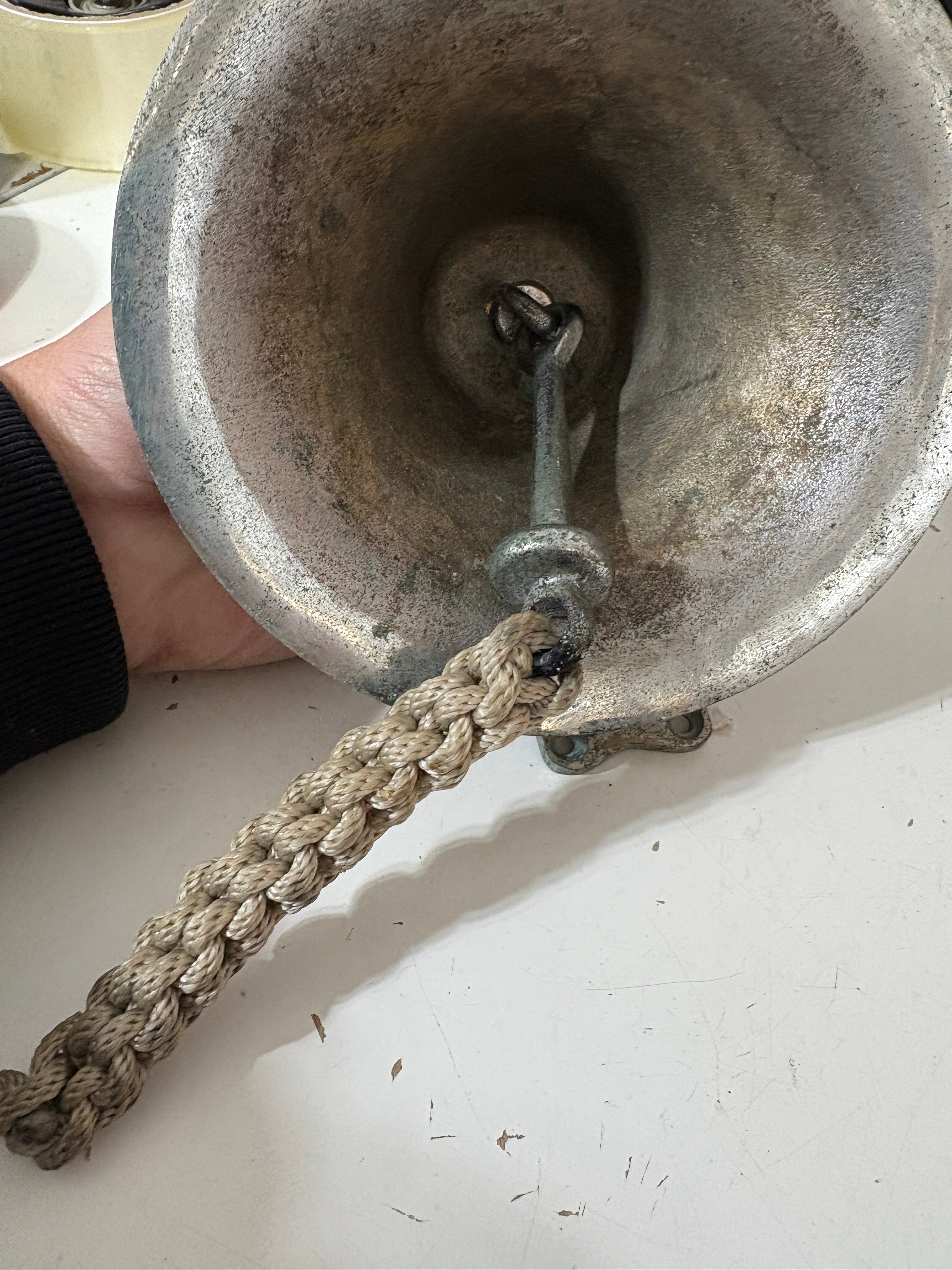 Chromed Bronze 6" dia Ships Bell. Stands 4" tall. This is a heavier bell than most. Pitting but may clean up. very nice braided pull.
