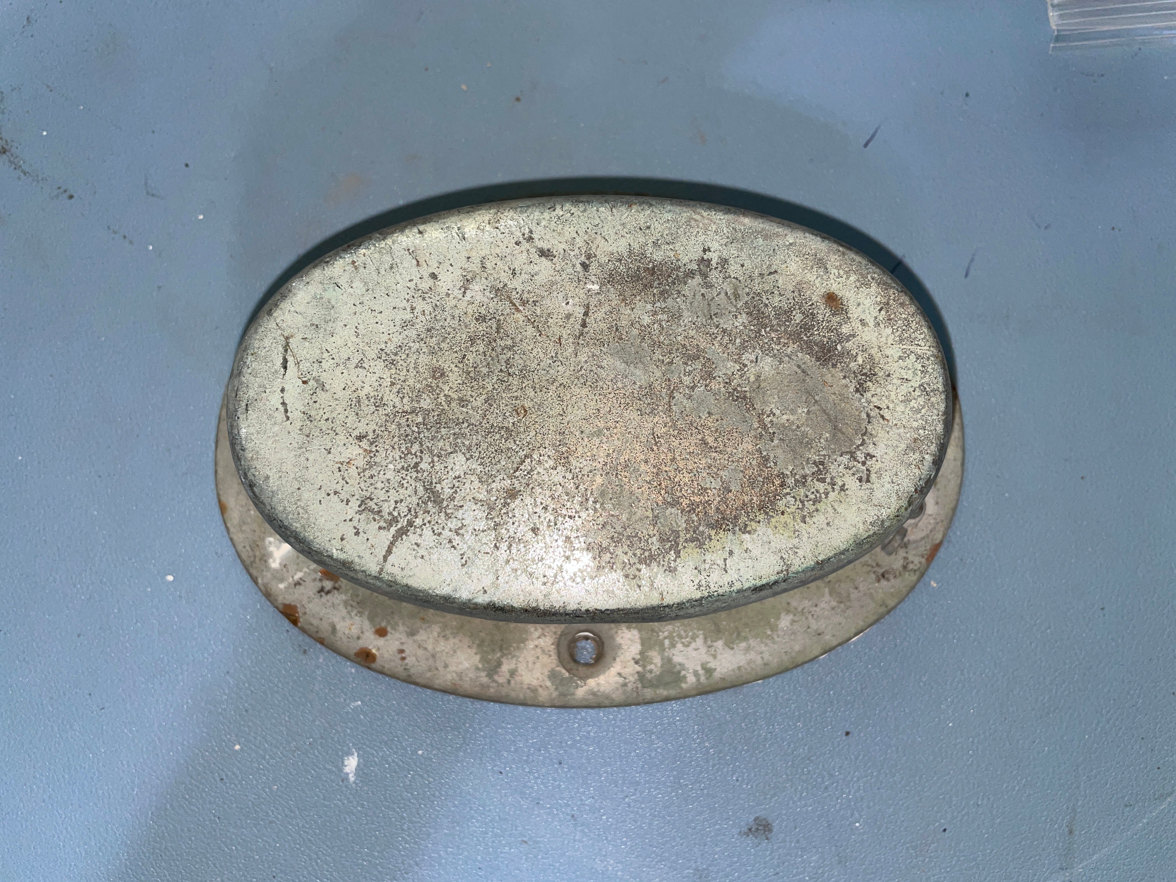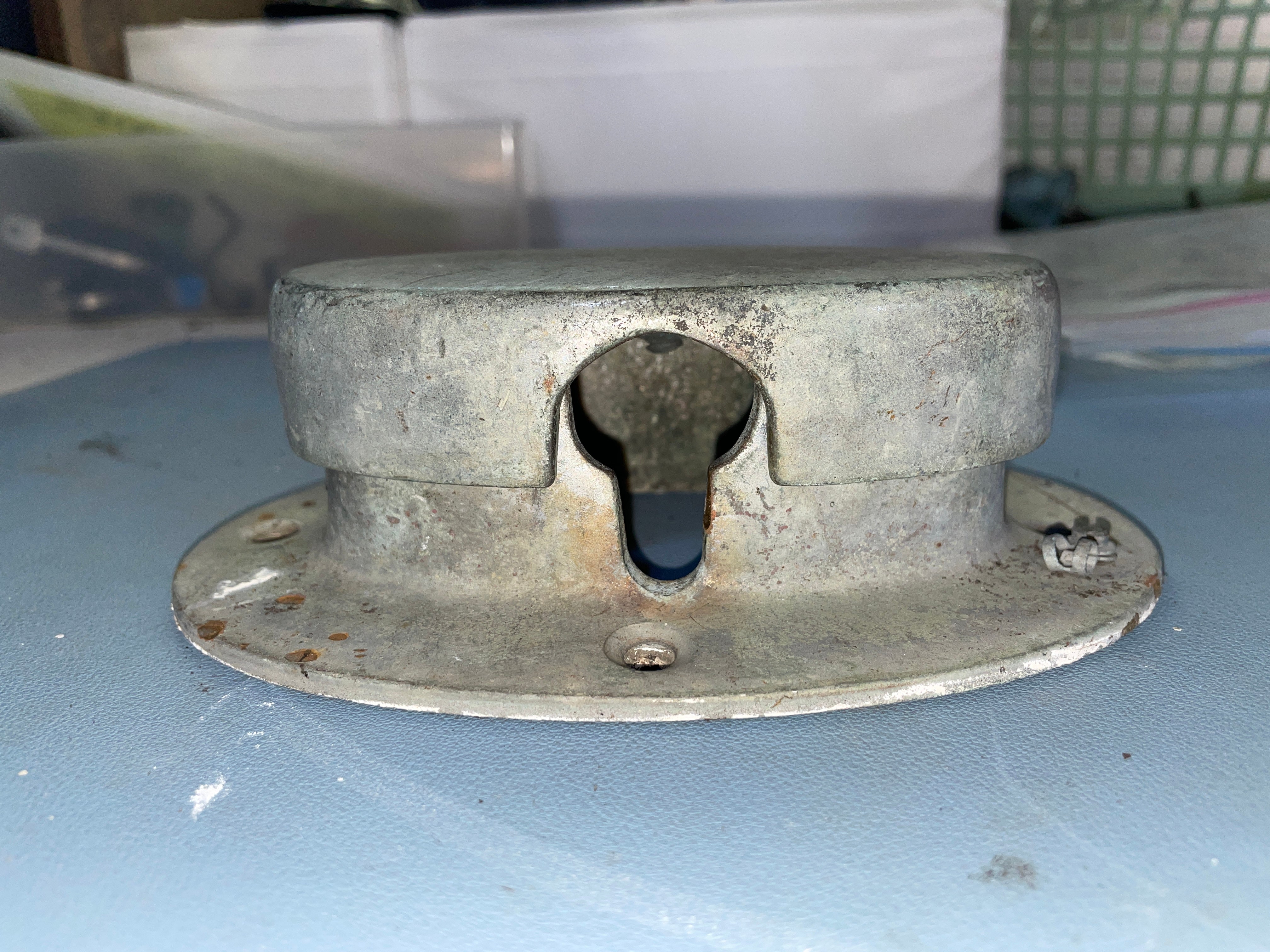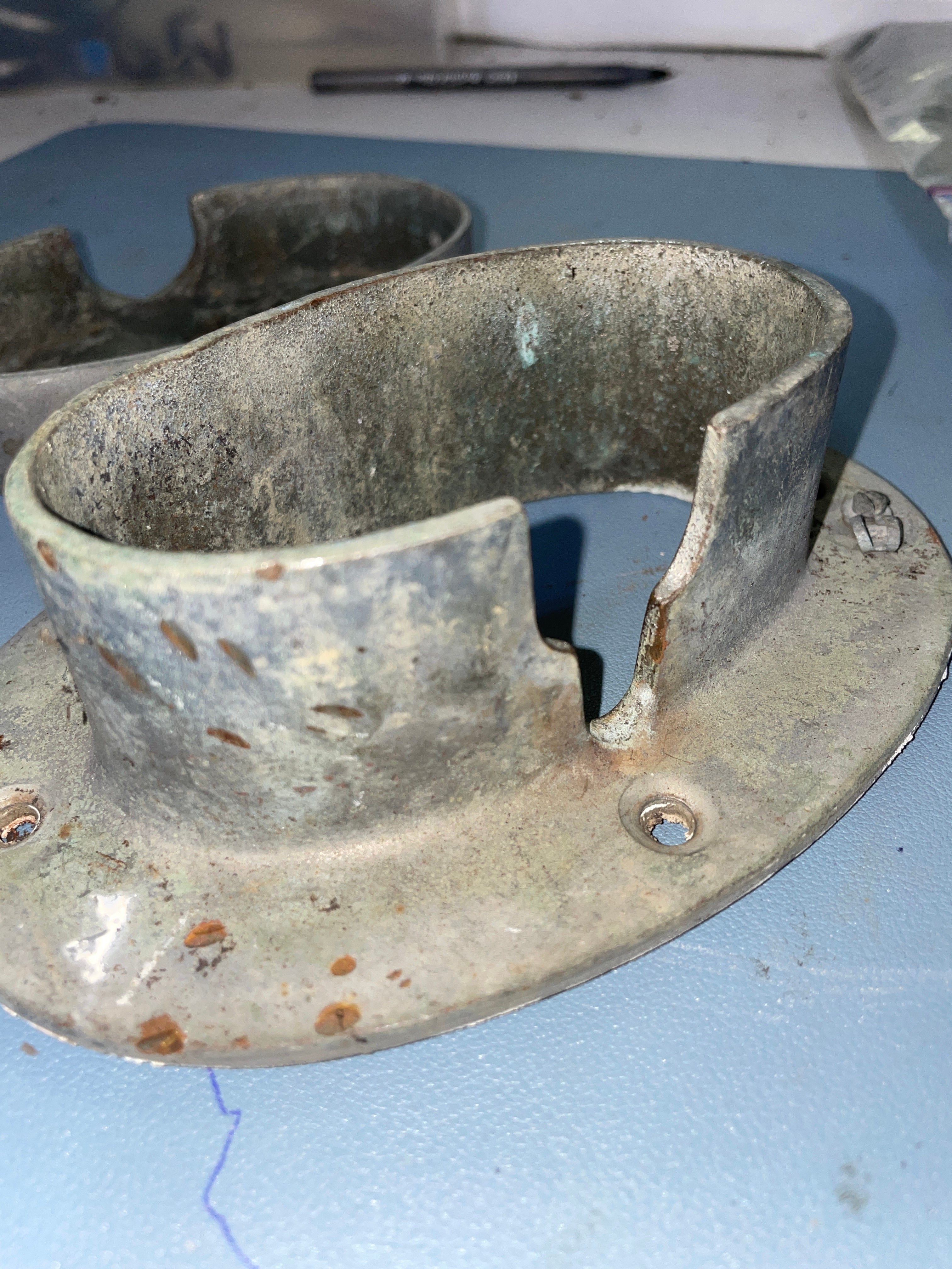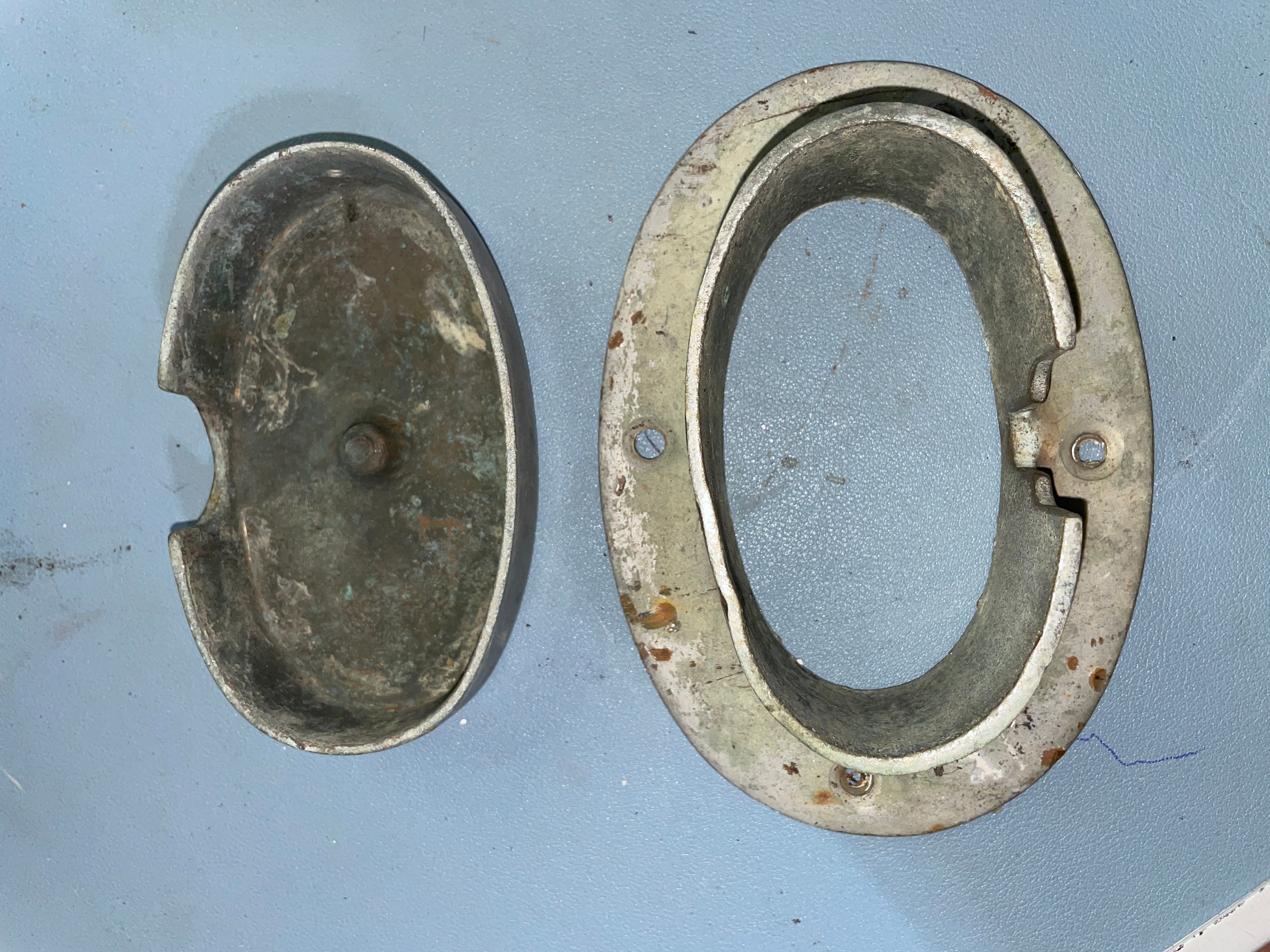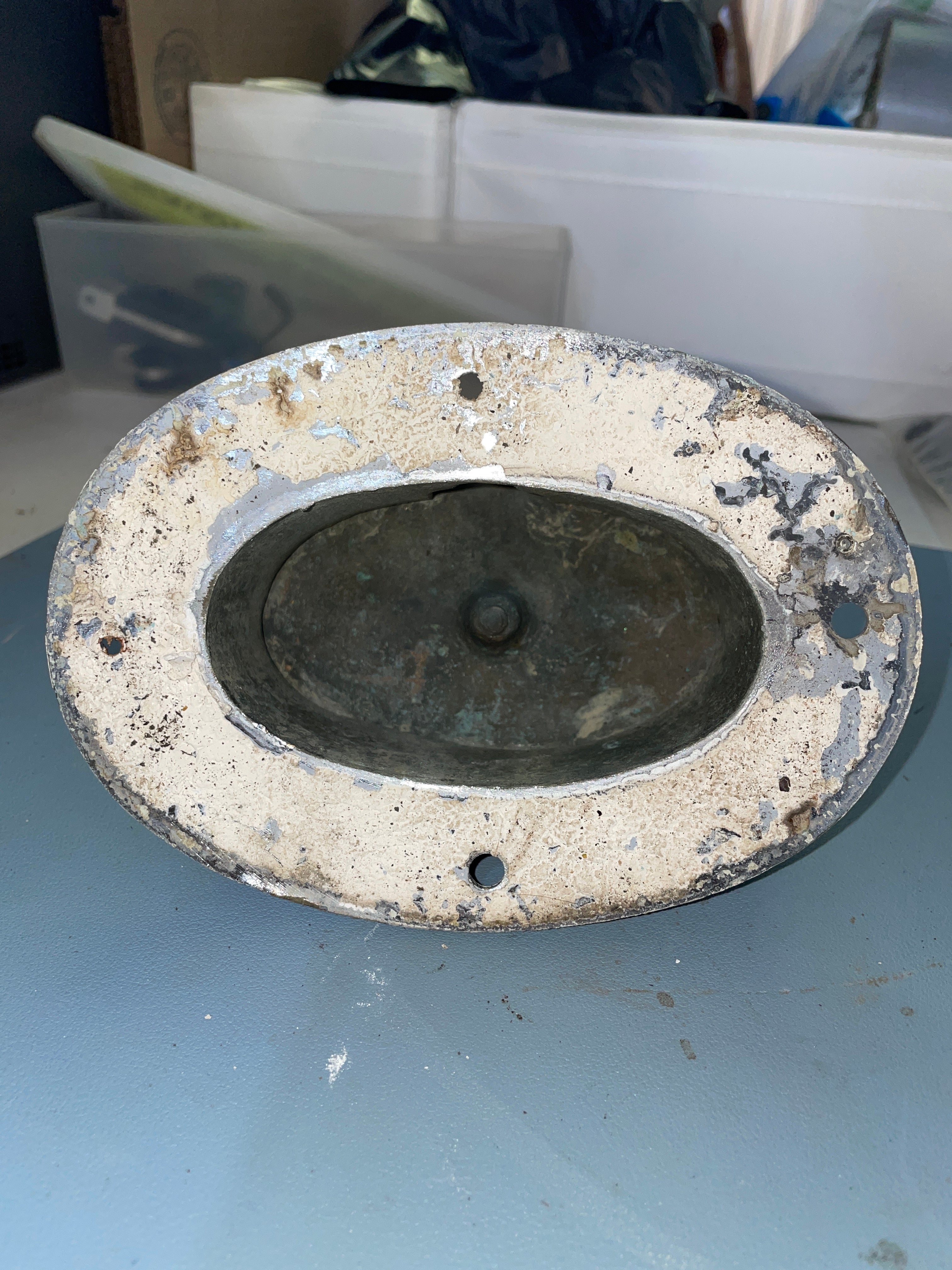 This chromed bronze anchor hawse is in good condition. There is no chain or hook on this hawse. The outside diameter measures 6 1/4" long x 4 3/8" wide. The inside diameter measures 3 7/8" long x 2 1/8" wide. The hole area where it feeds through the front is 1" x 1 1/4".