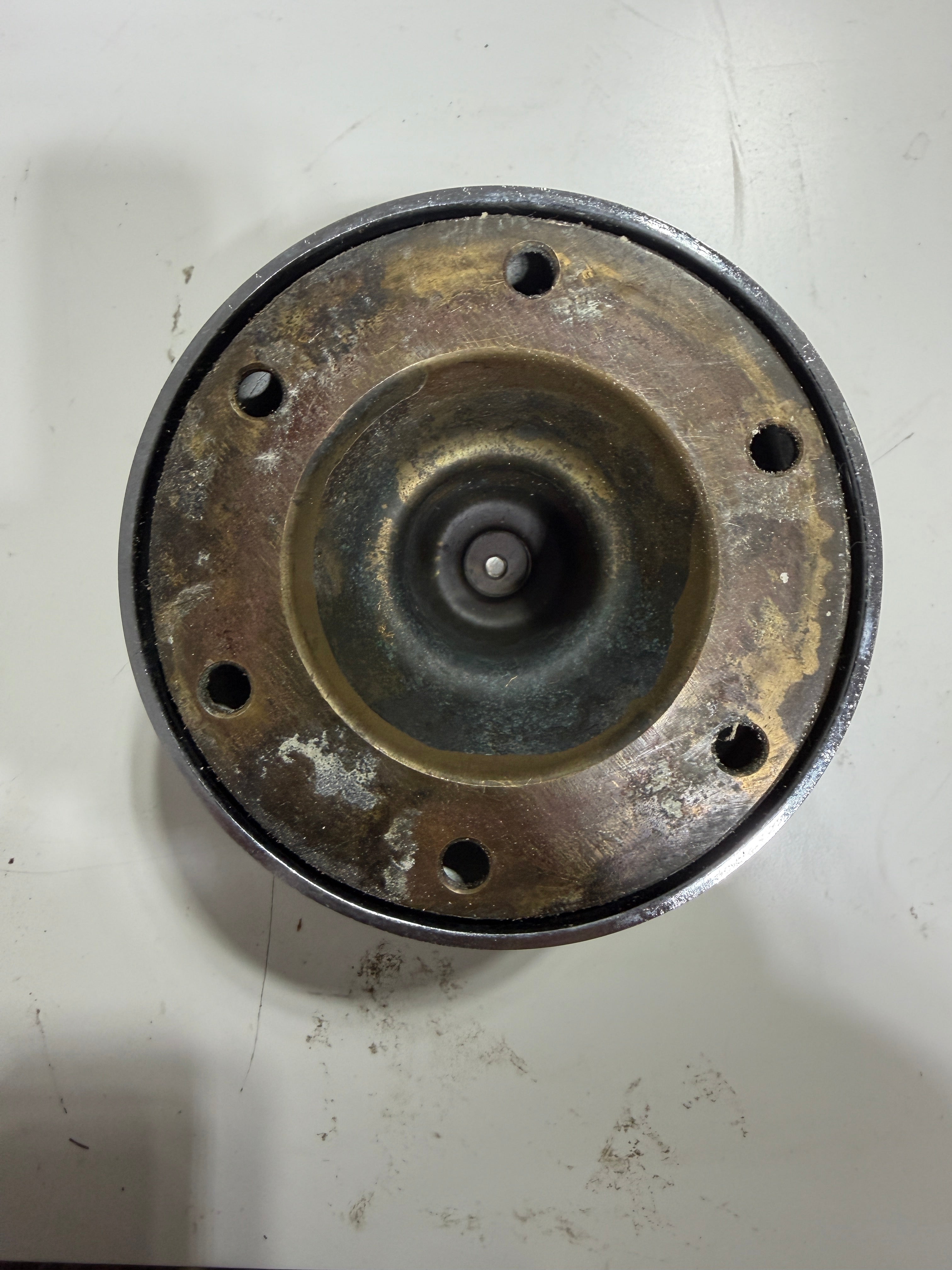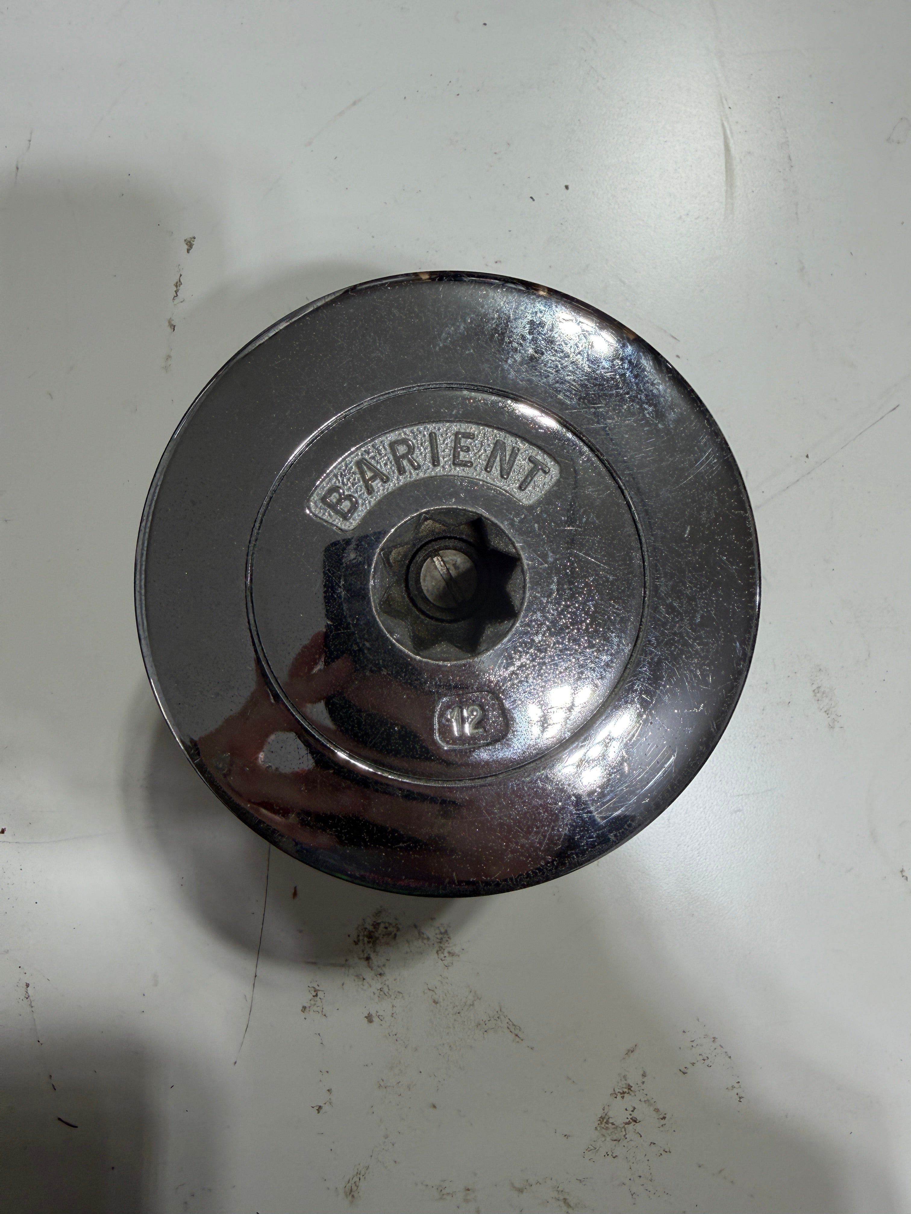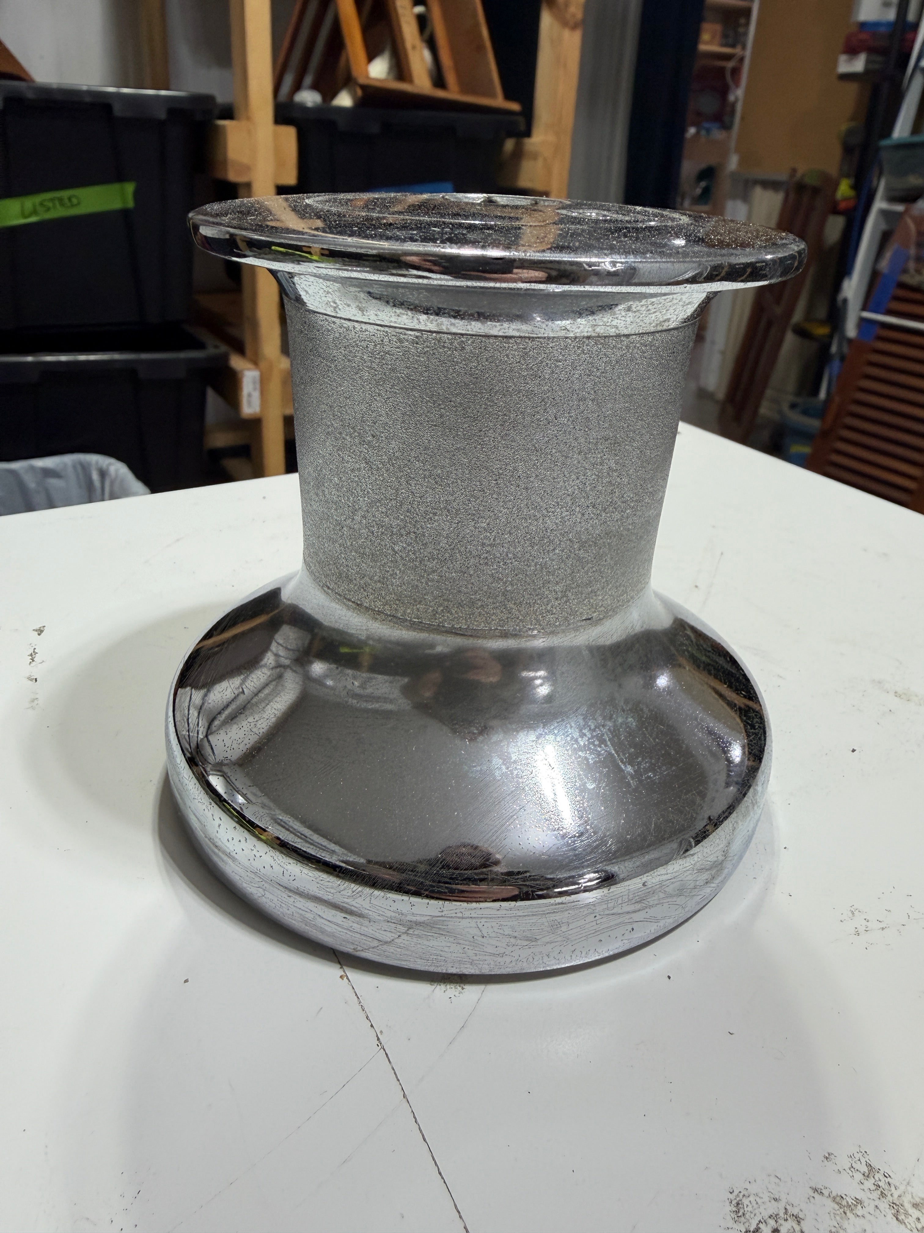 This chromed bronze barient 12 winch is in great condition. I believe it is double speed - moves one way when cranked and also cranks the other way but does not move. The winch base is 5 1/4" and it stands 4 3/4" tall. There is 6 bolt install. 4" straight across, 3 1/2" and 2".