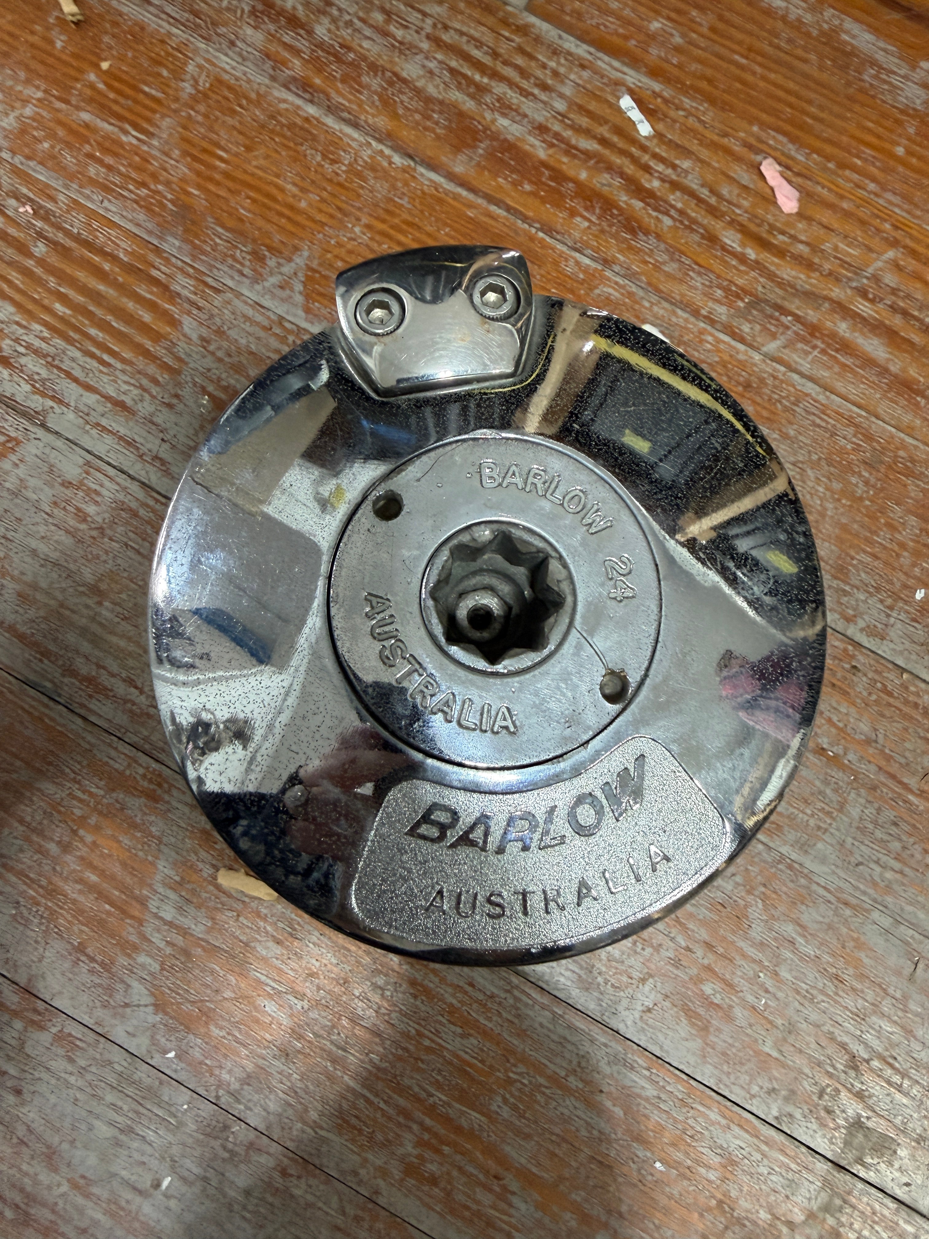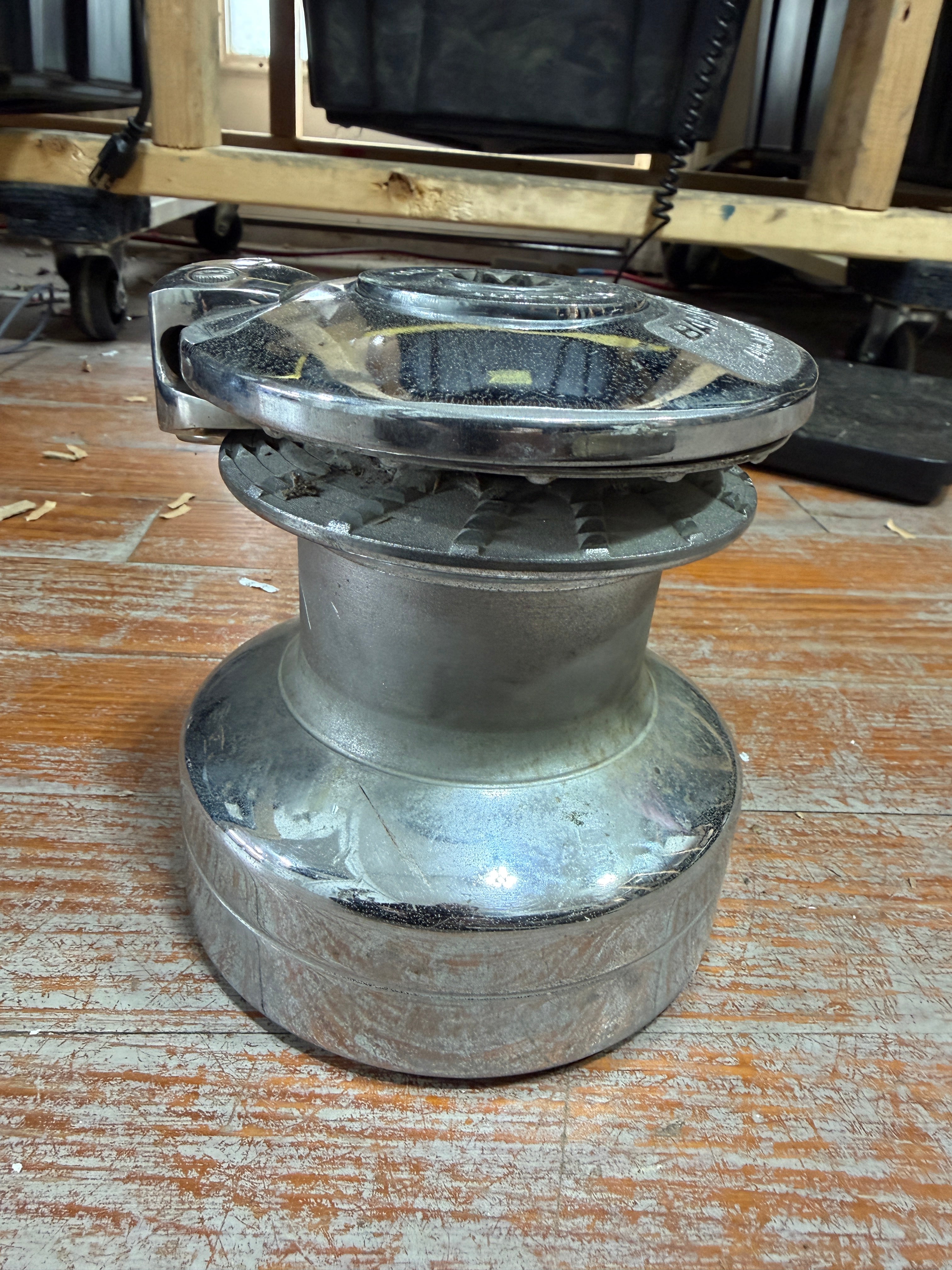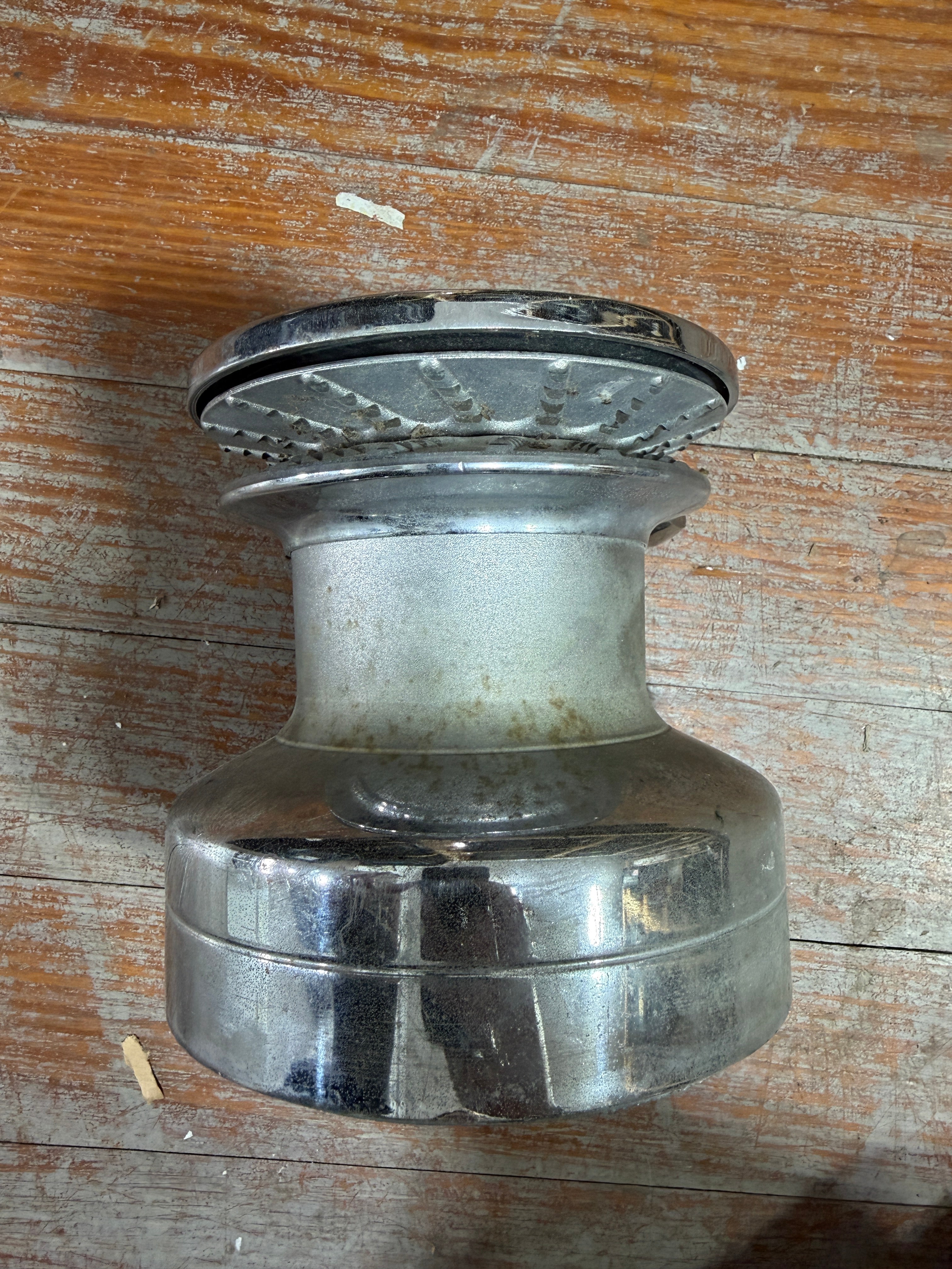 This chromed bronze single speed winch is in good condition - has been serviced and it works as it should. The winch stands 6 1/2" tall. Fits 1/2" line diameter. The base is 5 3/4" diameter. 6 bolt pattern mounting. The mounting holes are 2 1/4" apart. This is a heavy winch.