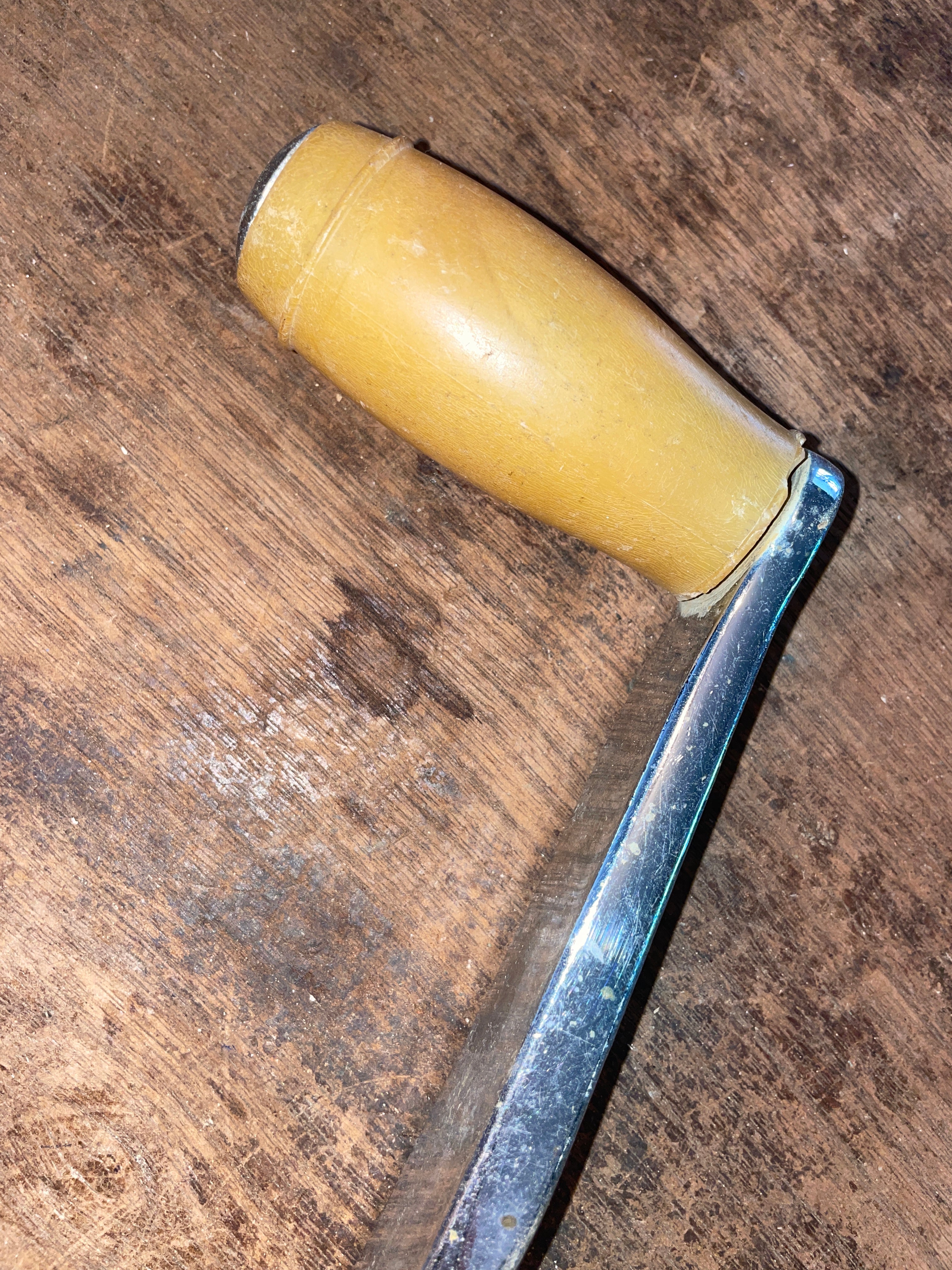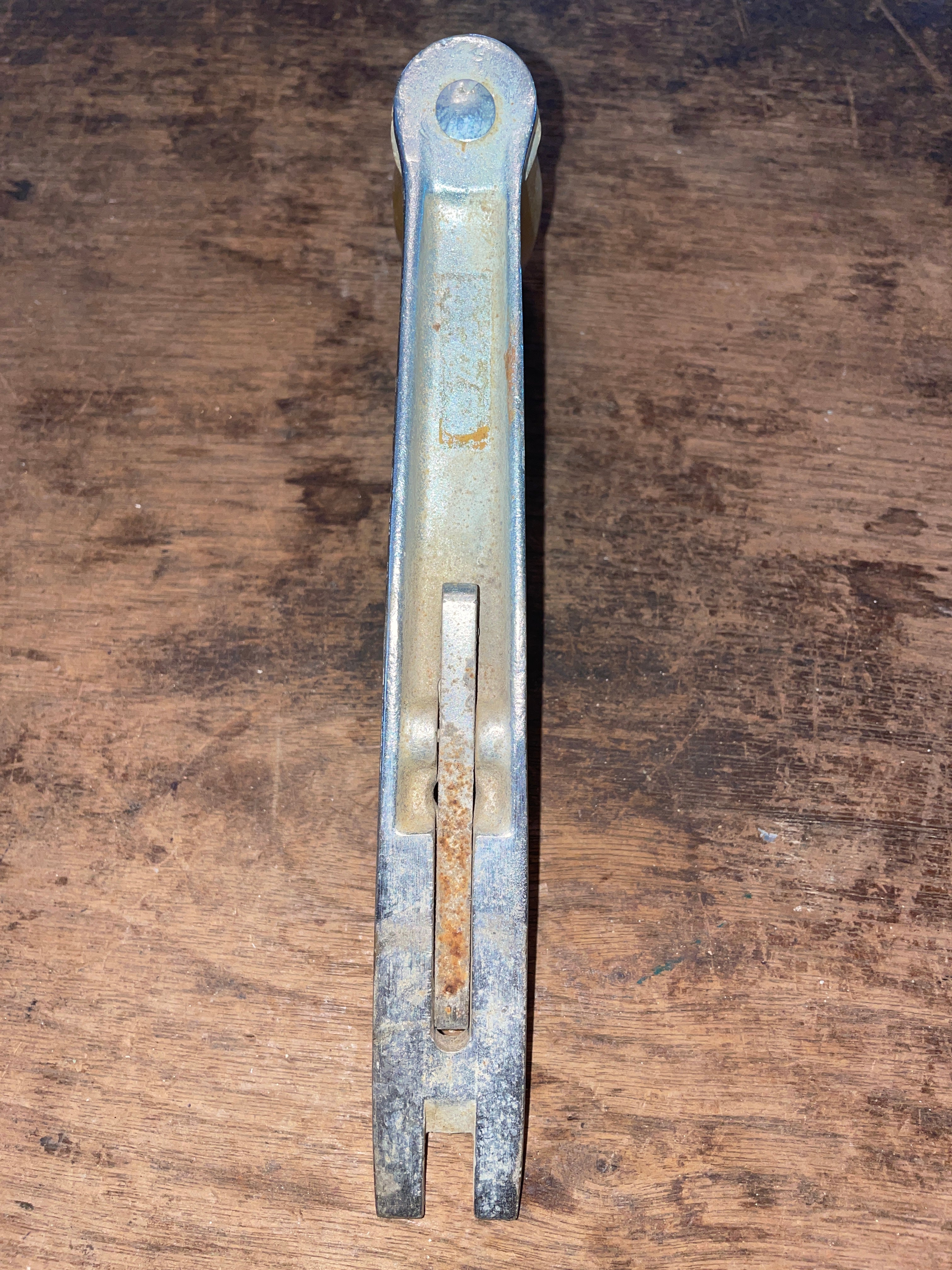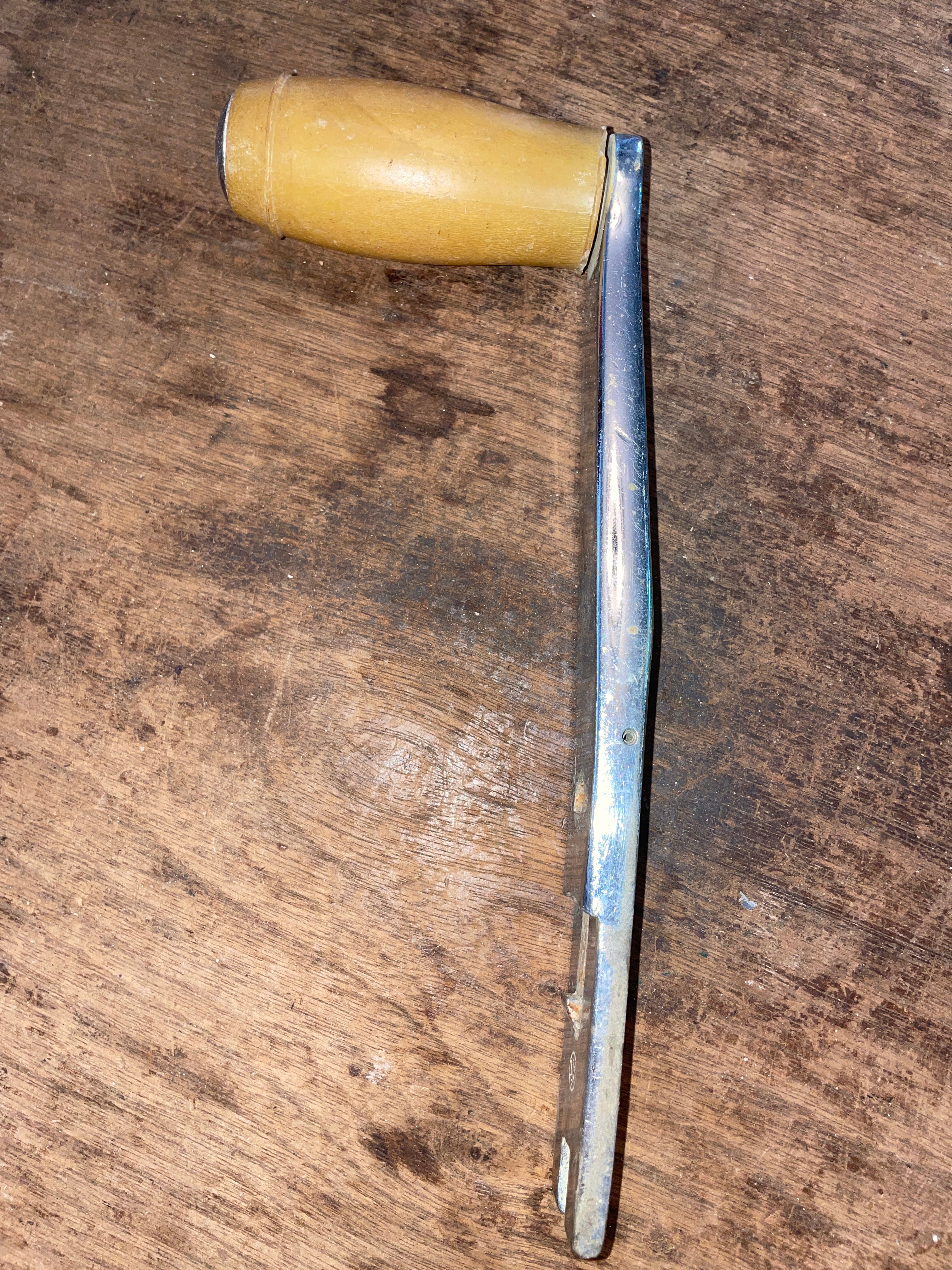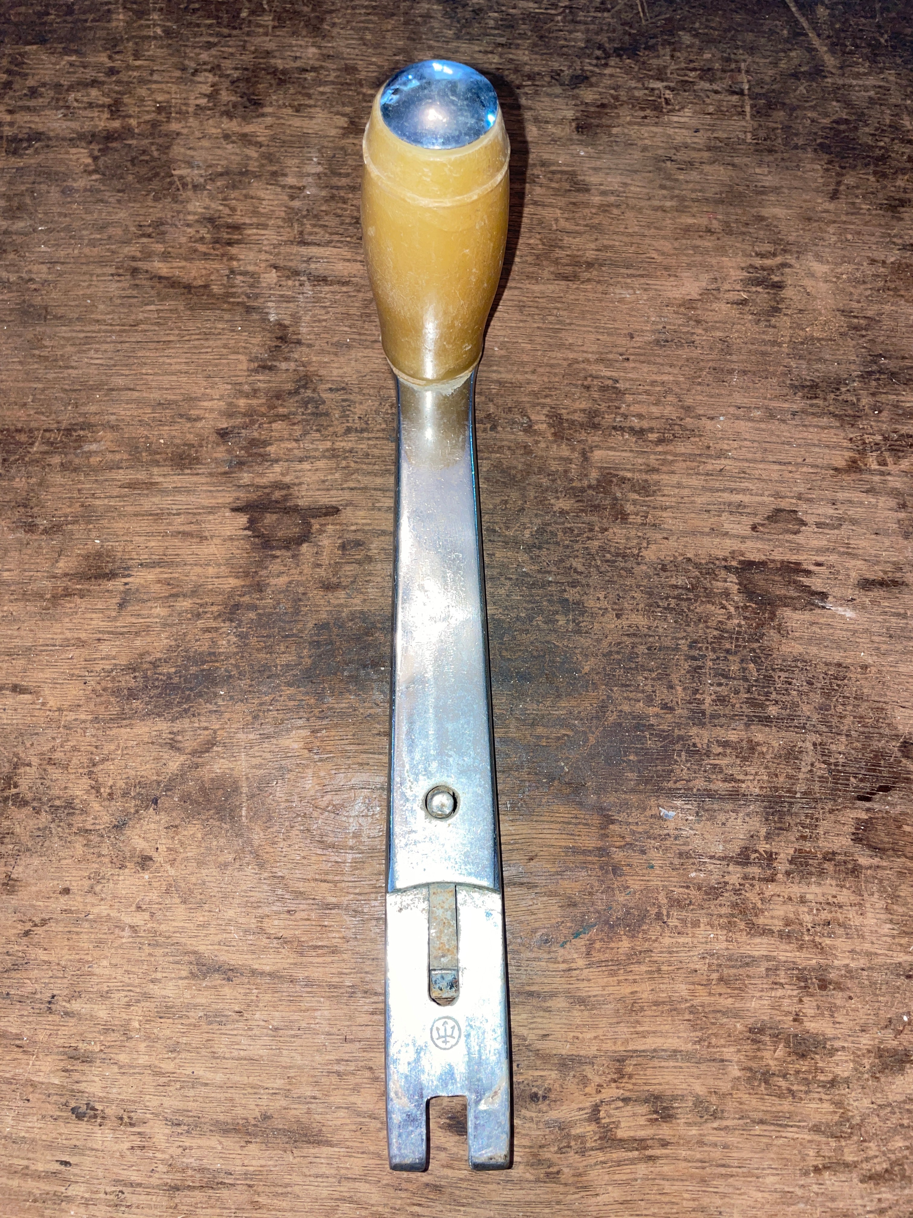 This chromed bronze merriman winch handle is in good condition. The handle is 8” total length and the insert is 1 1/8” width. The yellow plastic handle is in good condition. It does have a few broken pieces off the end that touches the handle.