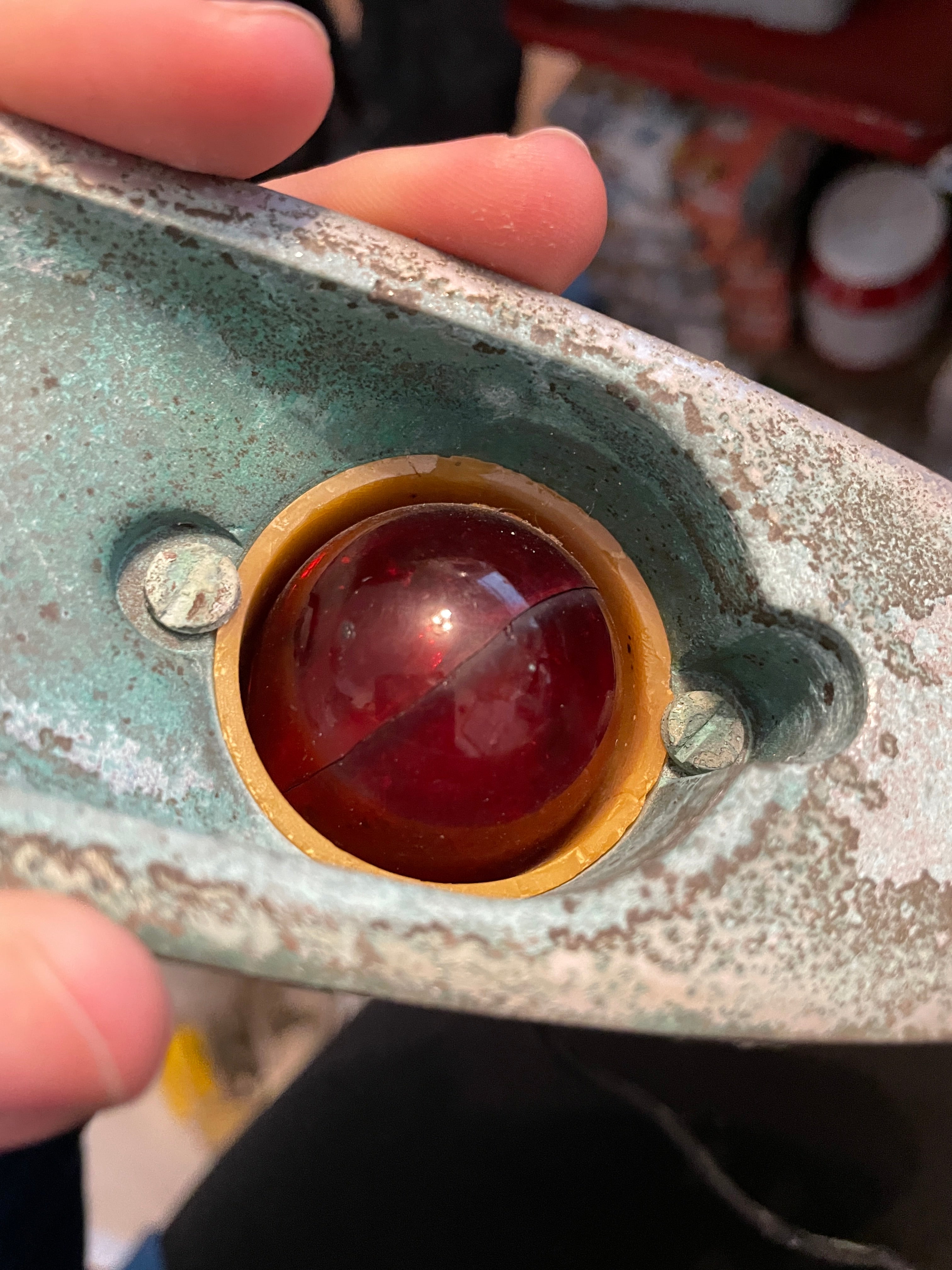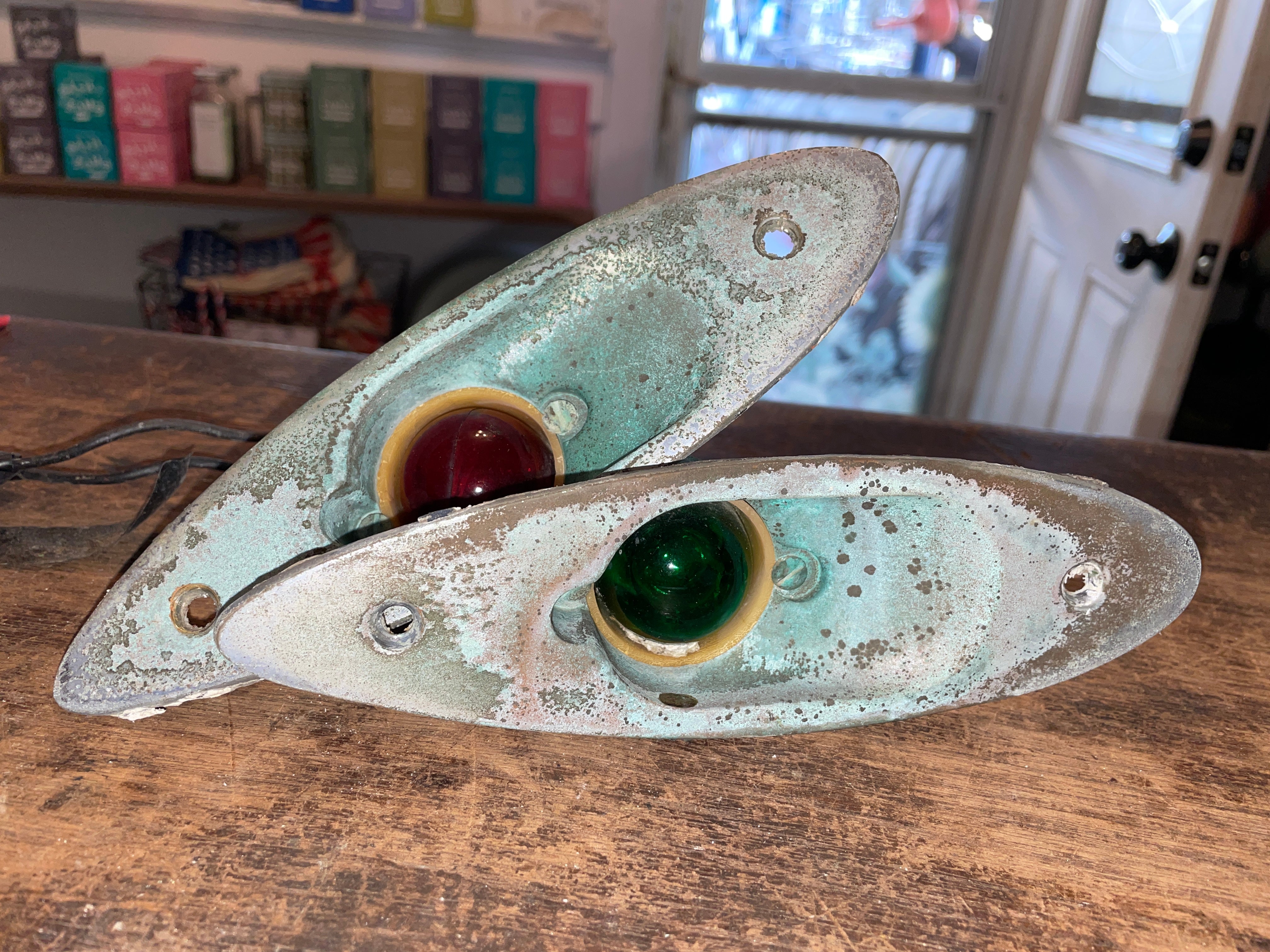 This pair of chromed bronze navigation lights is in good condition. Most of the chroming has come off so they’re mainly bronzed now. The green lens is glass and the red is plastic that is cracked (would be like new with a new lens). 7 5/8” long x 2 1/4” wide. 2 screw mounting 5 1/4” apart.
