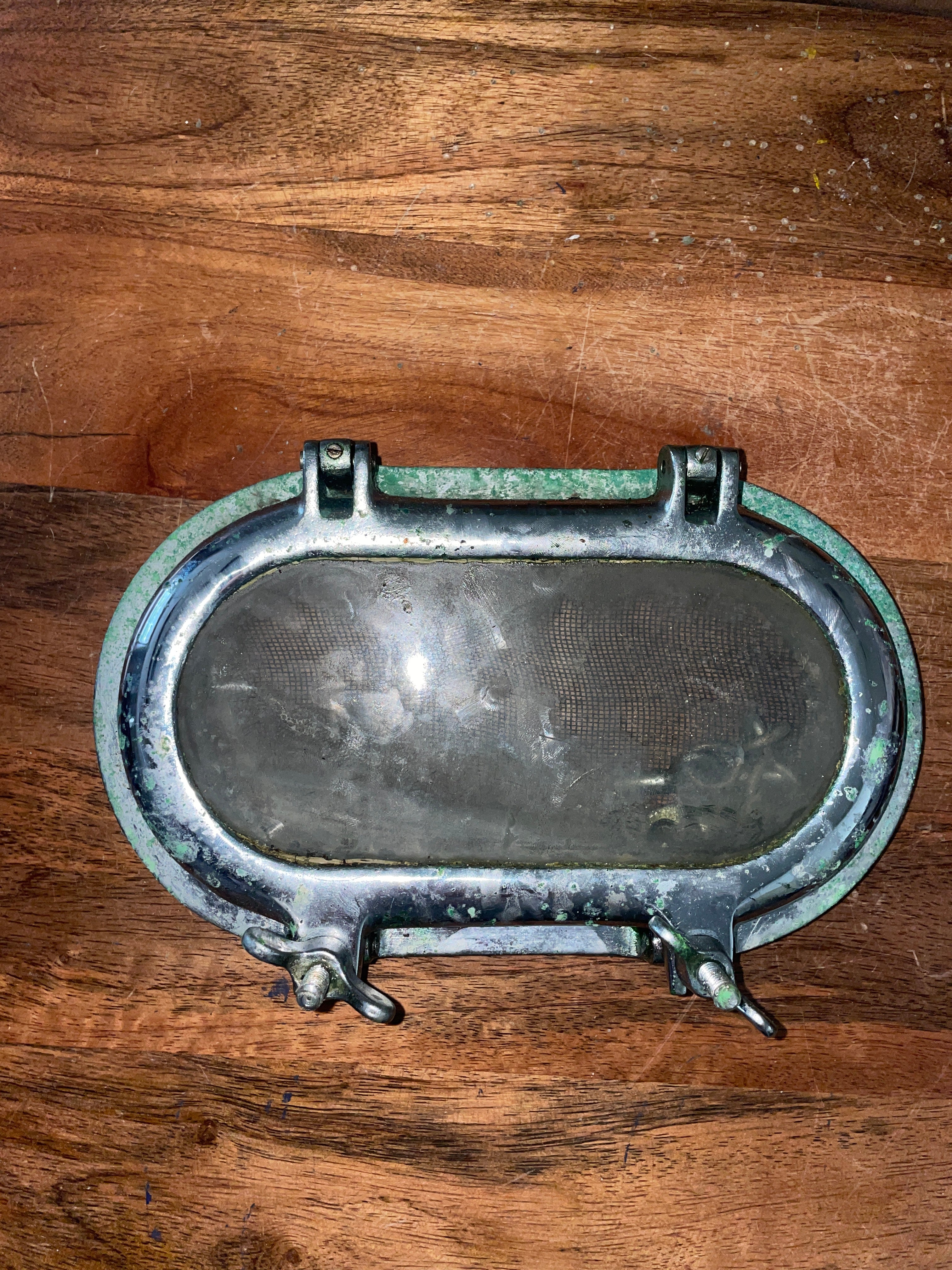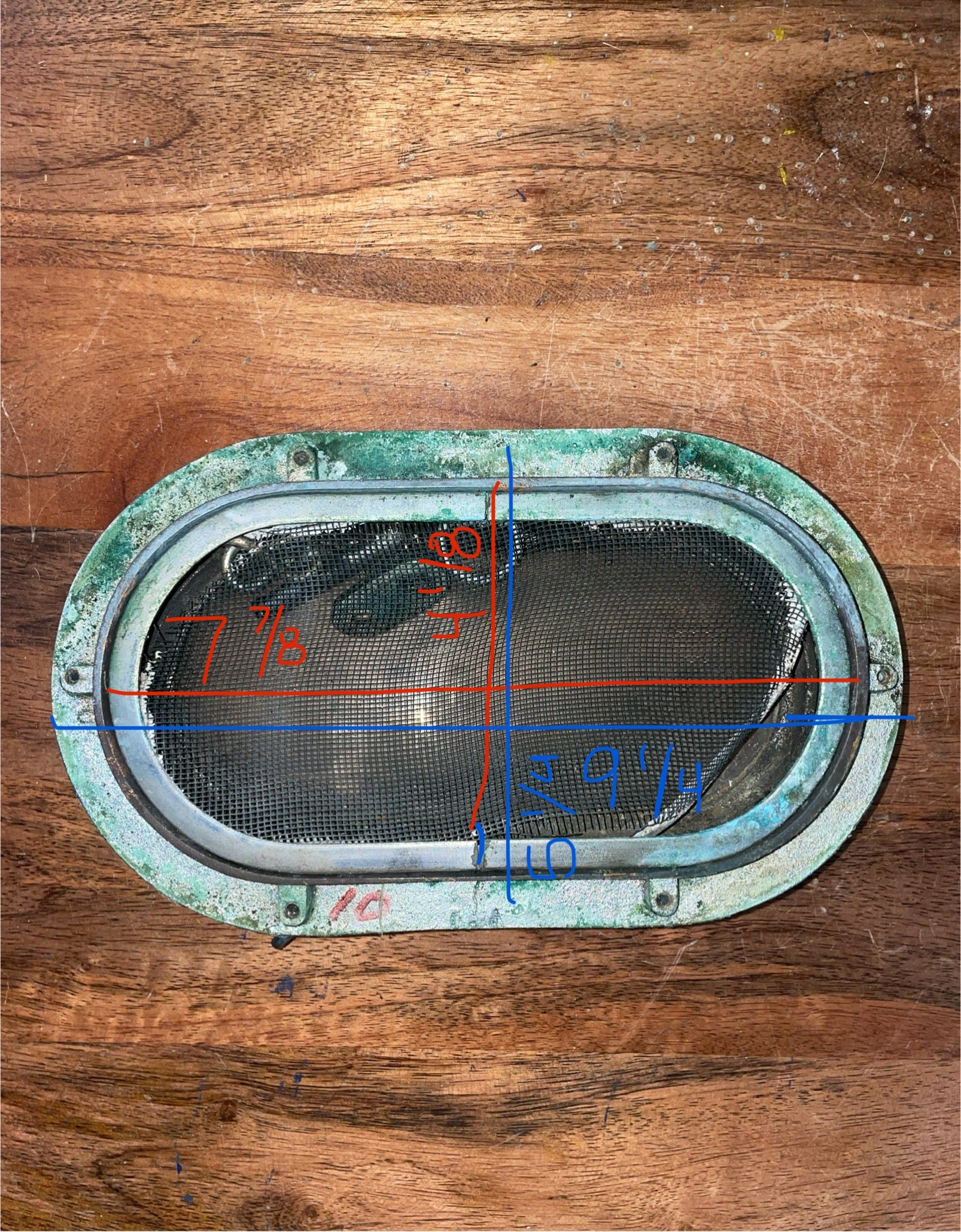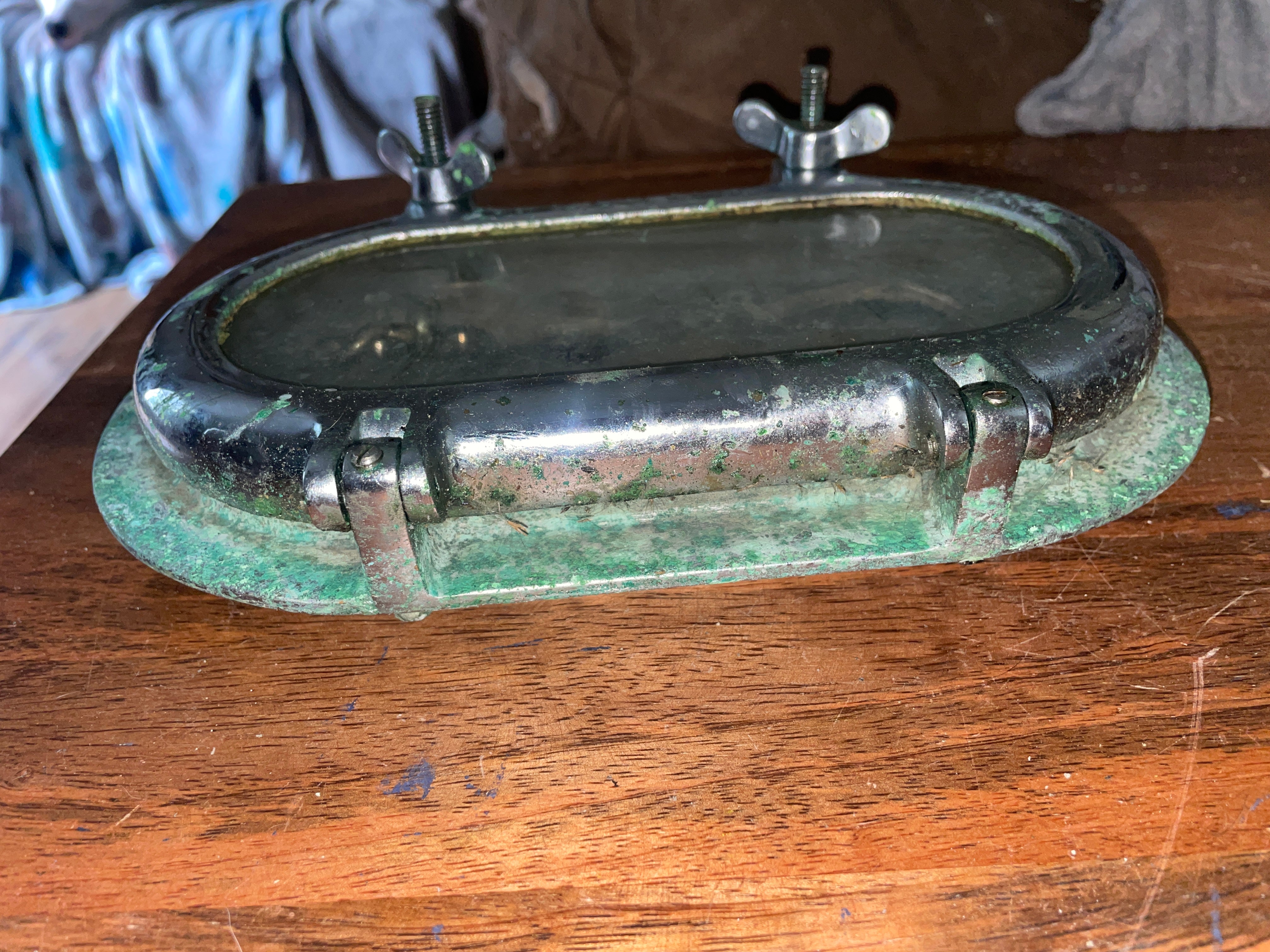 This chromed bronze opening portlight is in good condition. Has the pitting on the outside as you can see. Opens as it should. This portlight is glass. The screen is ripped so would need to be replaced. The inside diameter of the port is 8” long x 4 1/8” wide. The other all diameter of the port is 9 1/4” long x 5 1/4” wide.