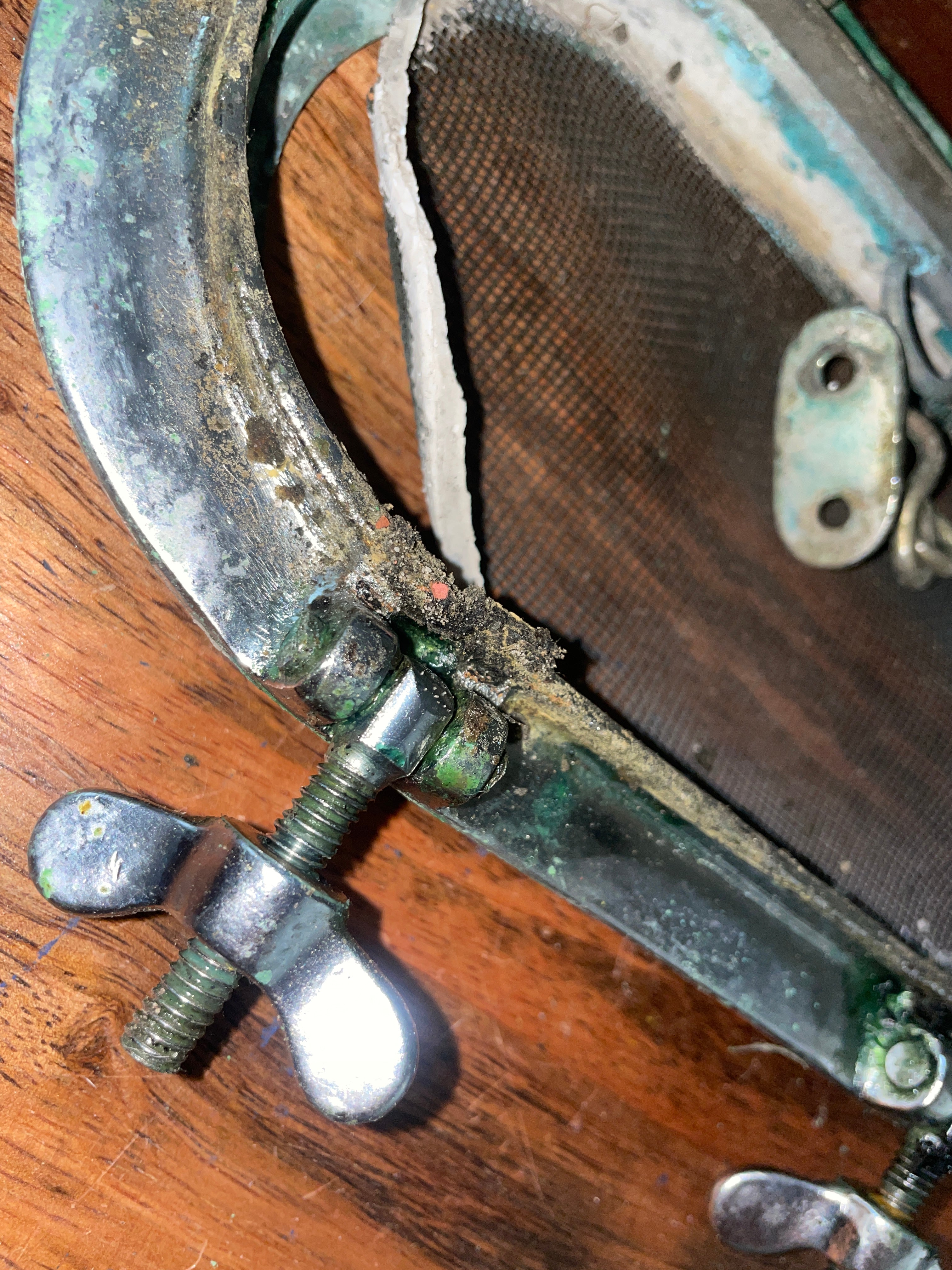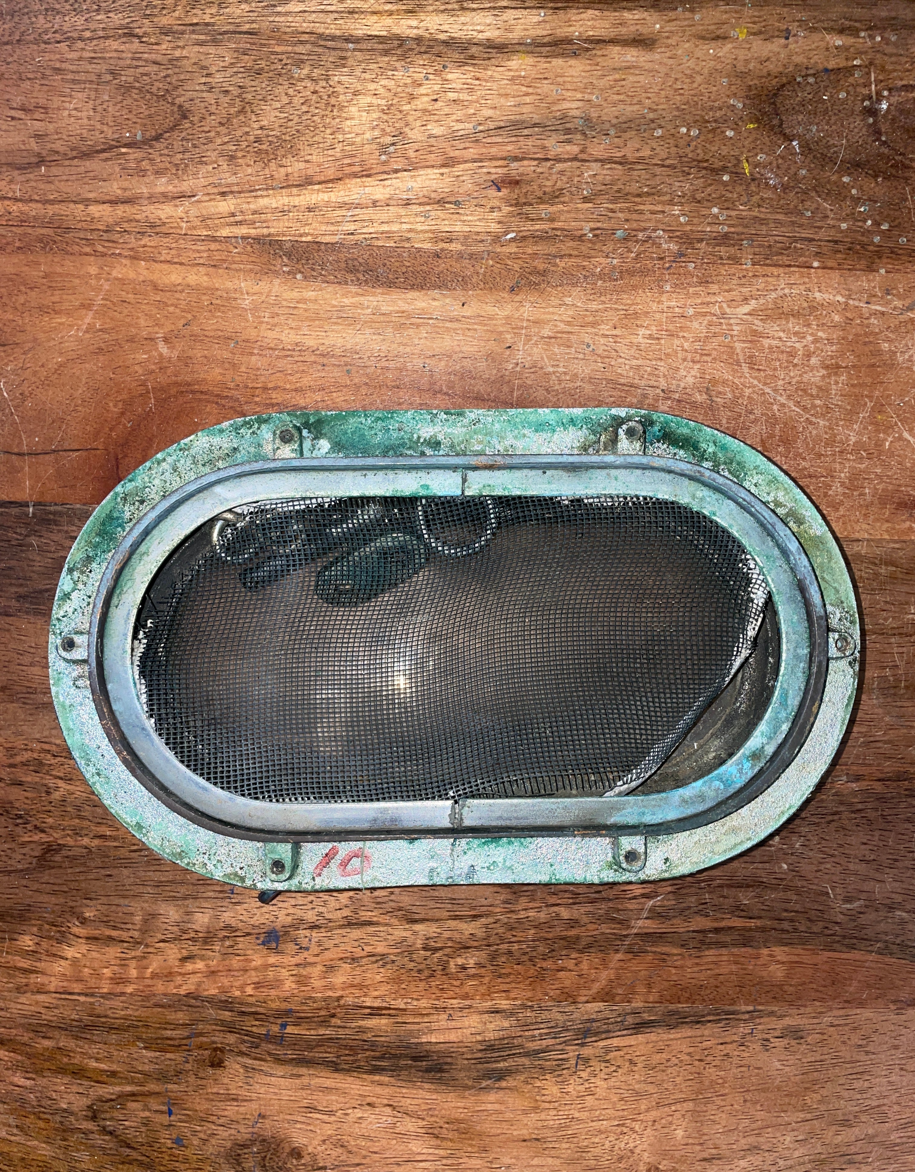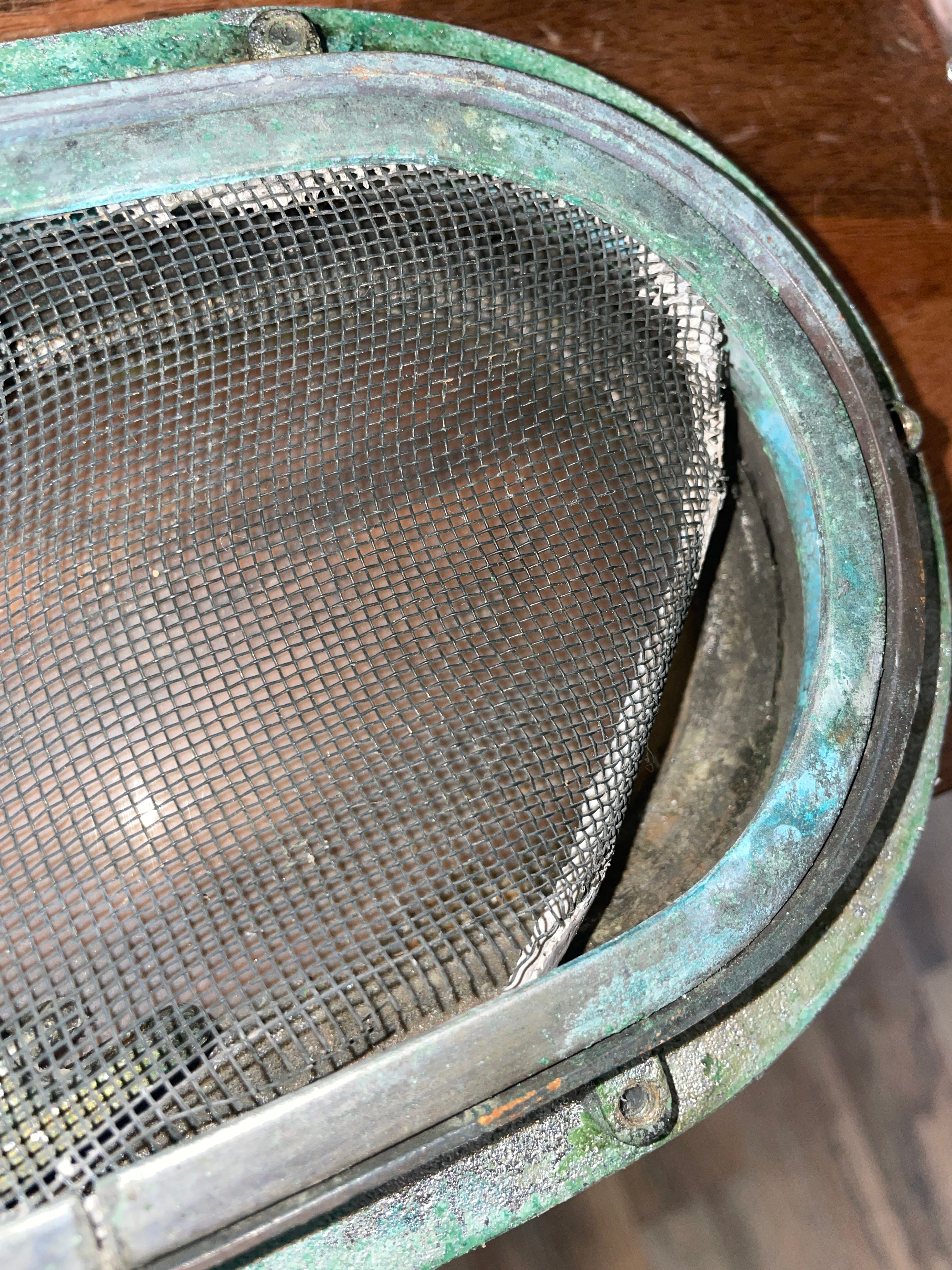 This chromed bronze opening portlight is in good condition. Has the pitting on the outside as you can see. Opens as it should. This portlight is glass. The screen is ripped so would need to be replaced. The inside diameter of the port is 8” long x 4 1/8” wide. The other all diameter of the port is 9 1/4” long x 5 1/4” wide.