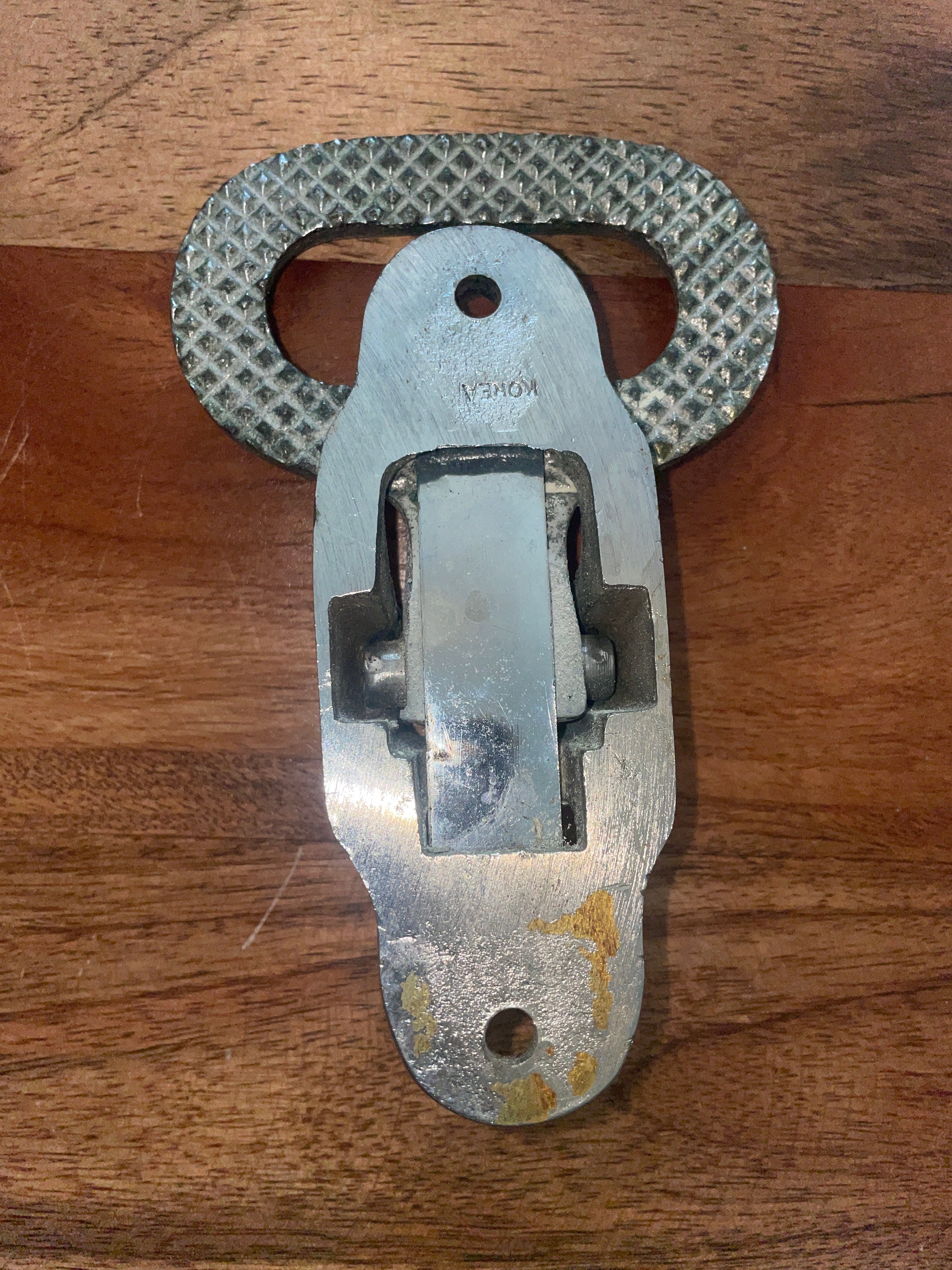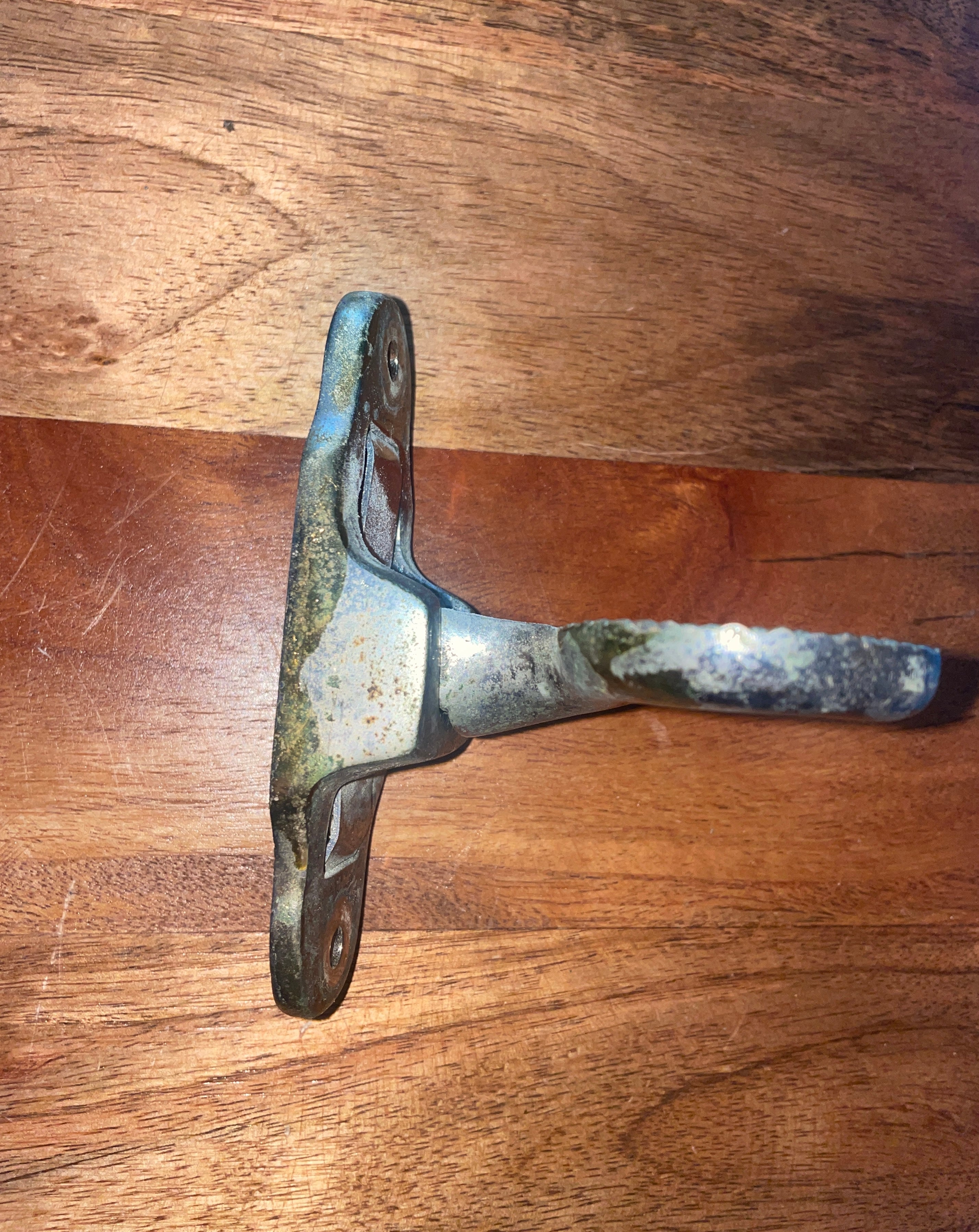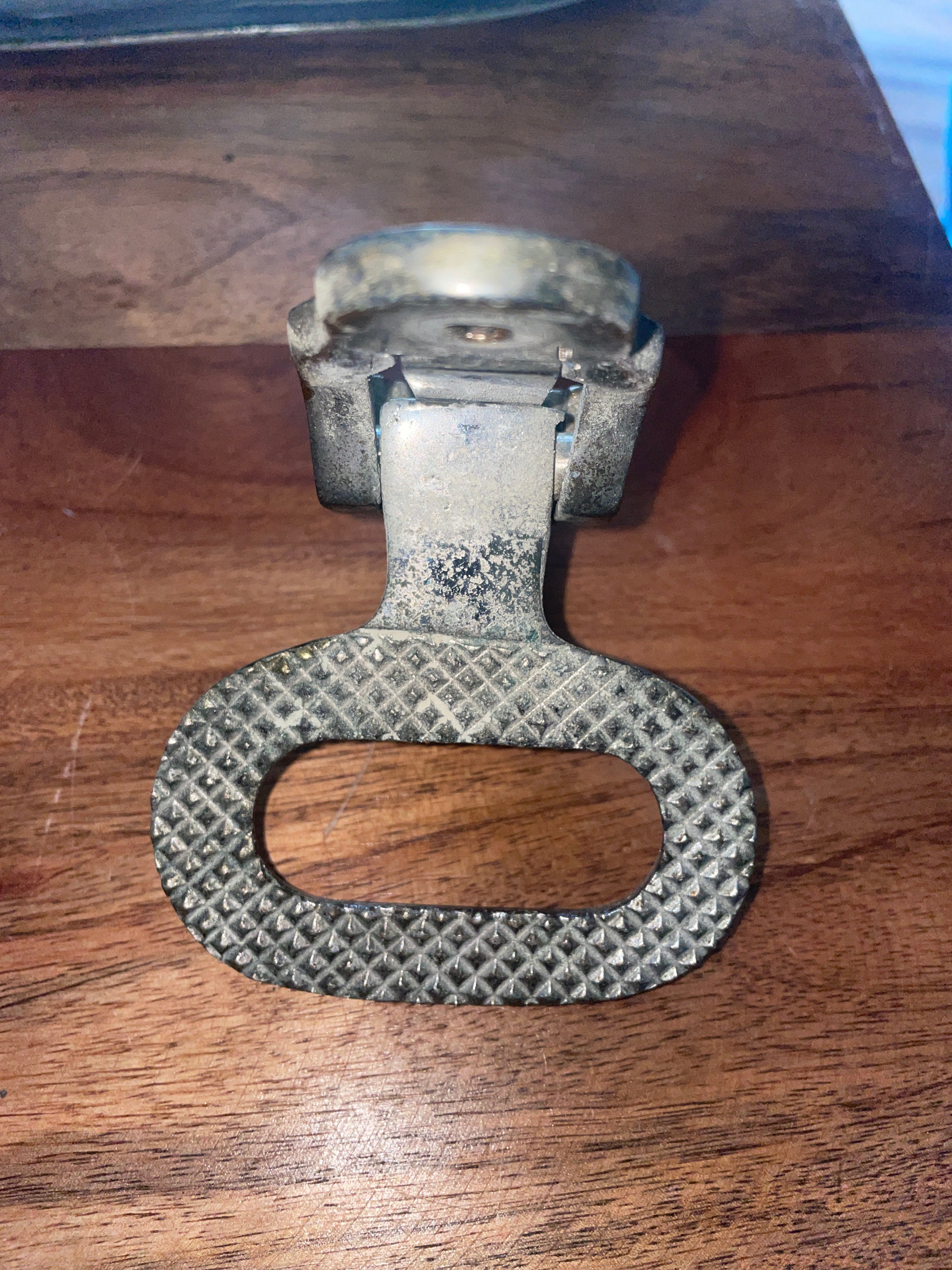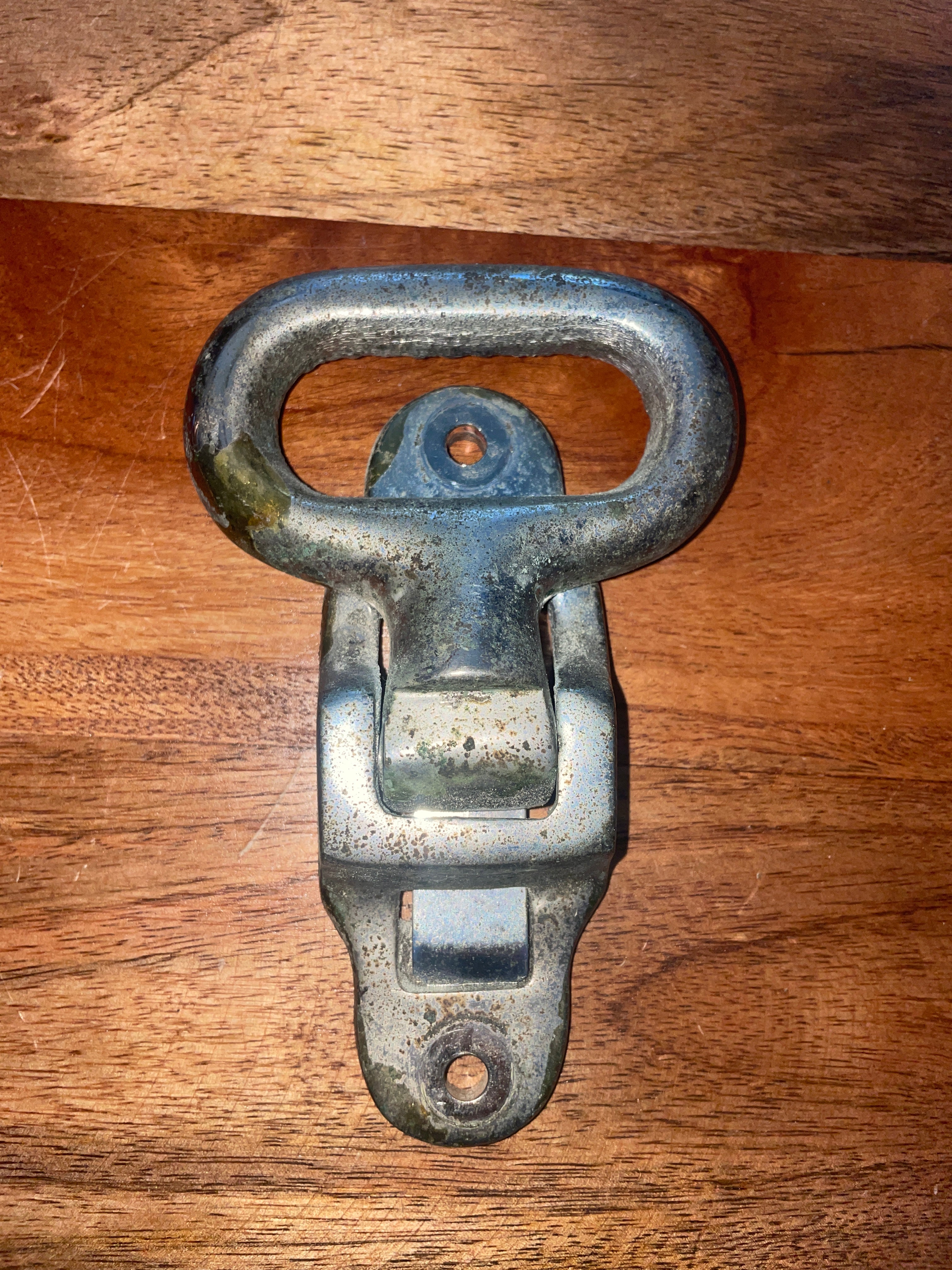 This chromed floating mast step is in great working condition. It has some pretty bad pitting damage to the outside. It may clean up some. The mounting base is 4 3/8” long x 1 7/8” wide. 2 bolt mounting is 3 5/8” apart.