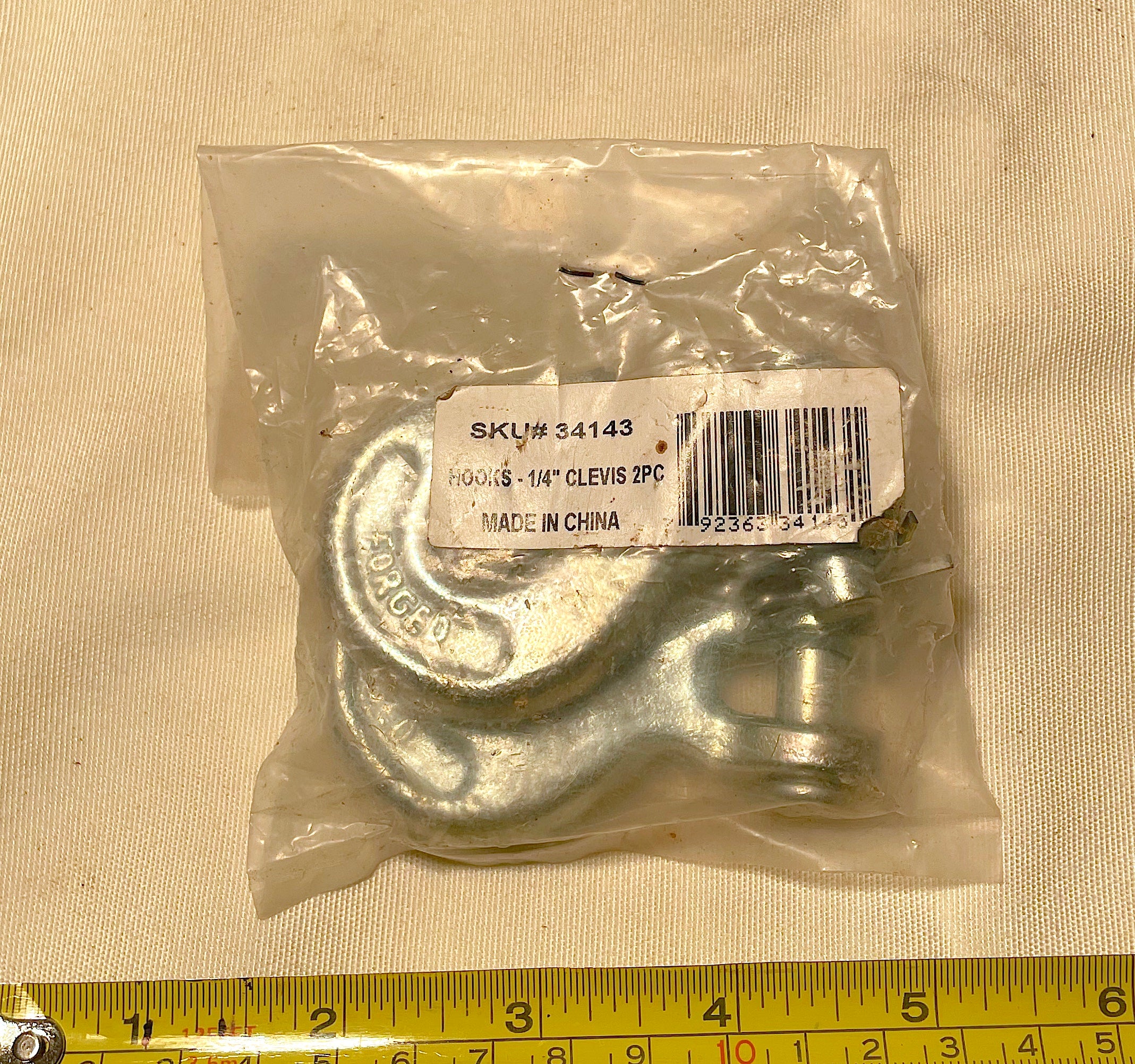 New in packaging. (2) 1/4" Forged Clevis Hooks.