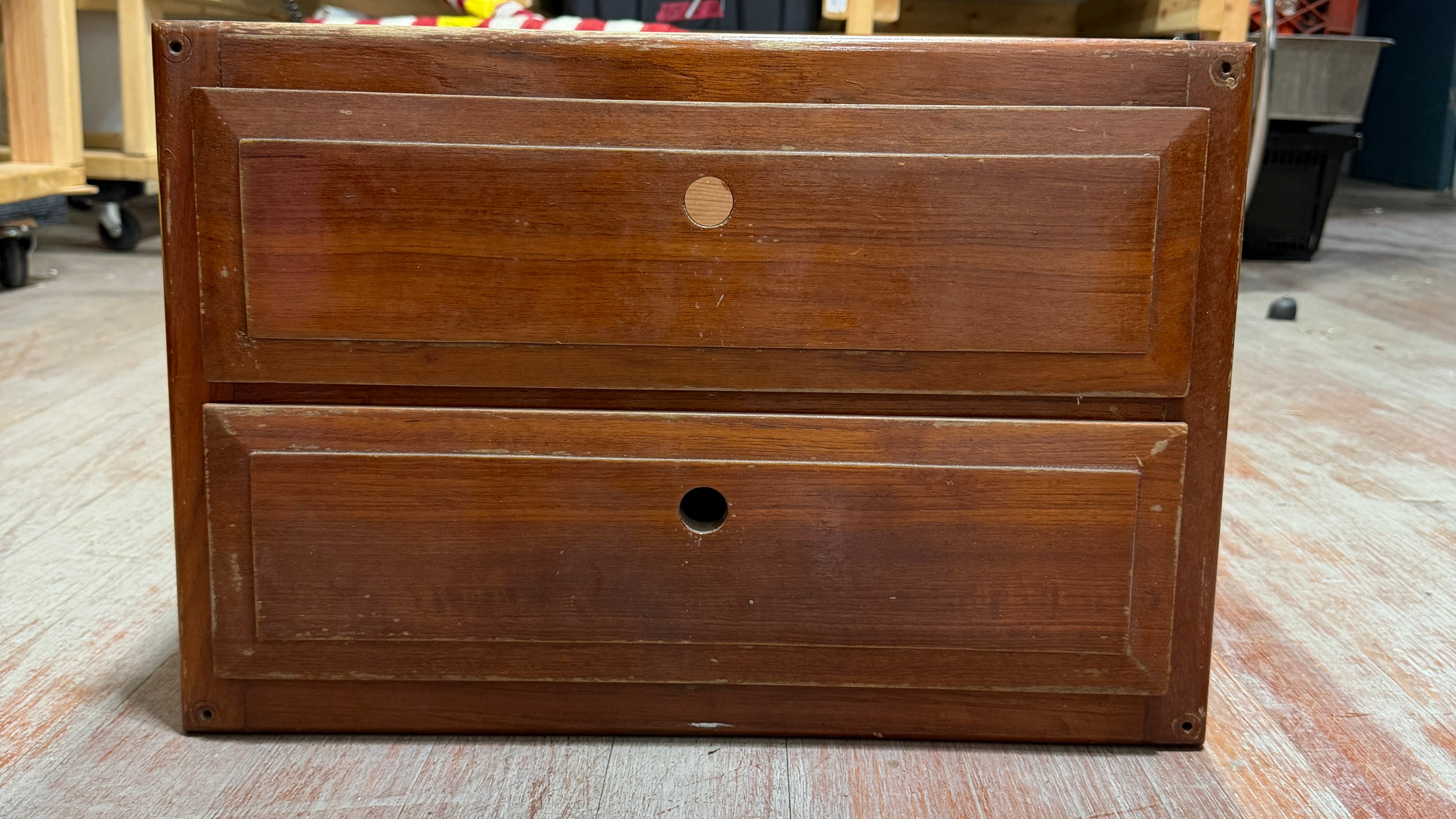 This 2 drawer cabinet was removed off a Columbia 36. The face of the drawers measures 19 1/4" long x 13" tall x 12" deep. The insert measures 17 7/8" long x 11" deep x 11 5/8" tall. Drawers pull out smoothly. Usual surface scratches.