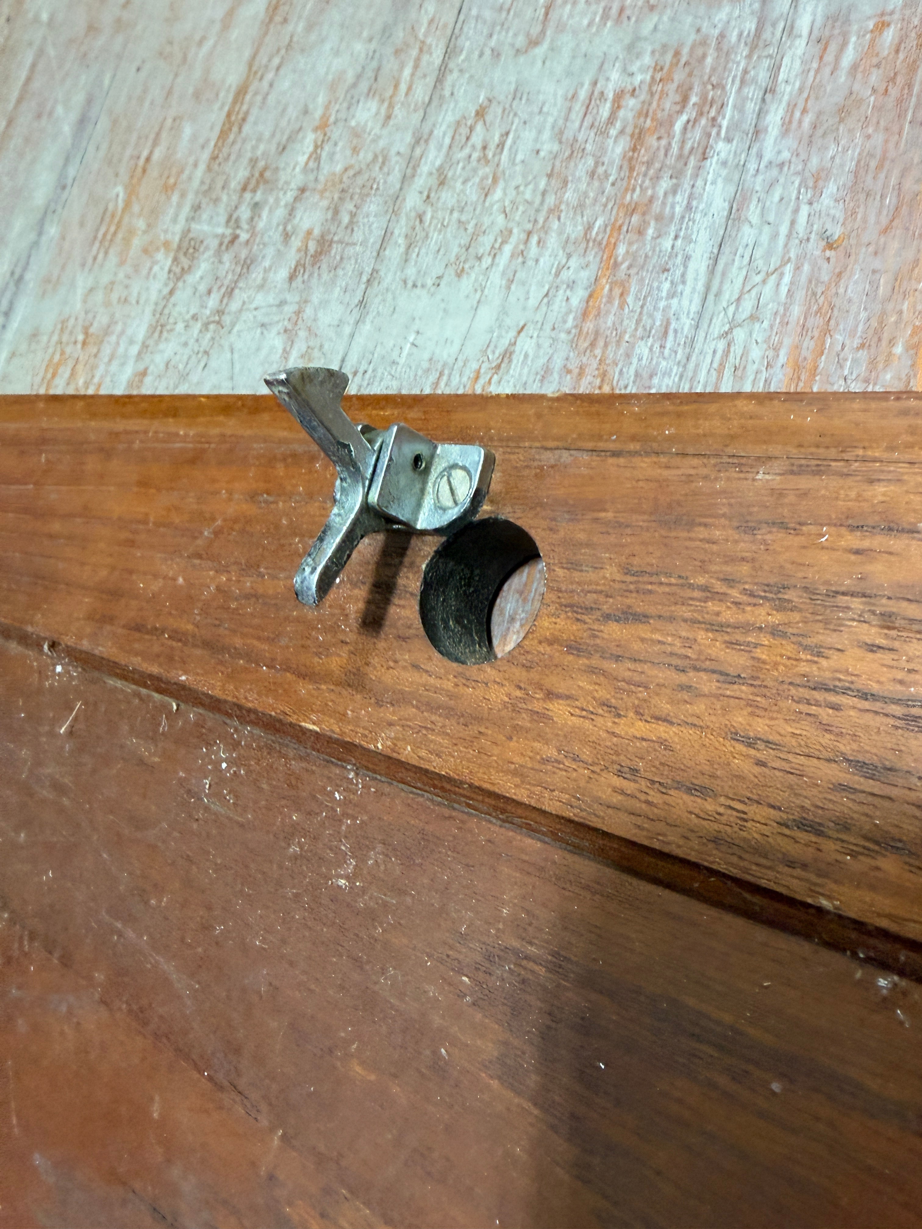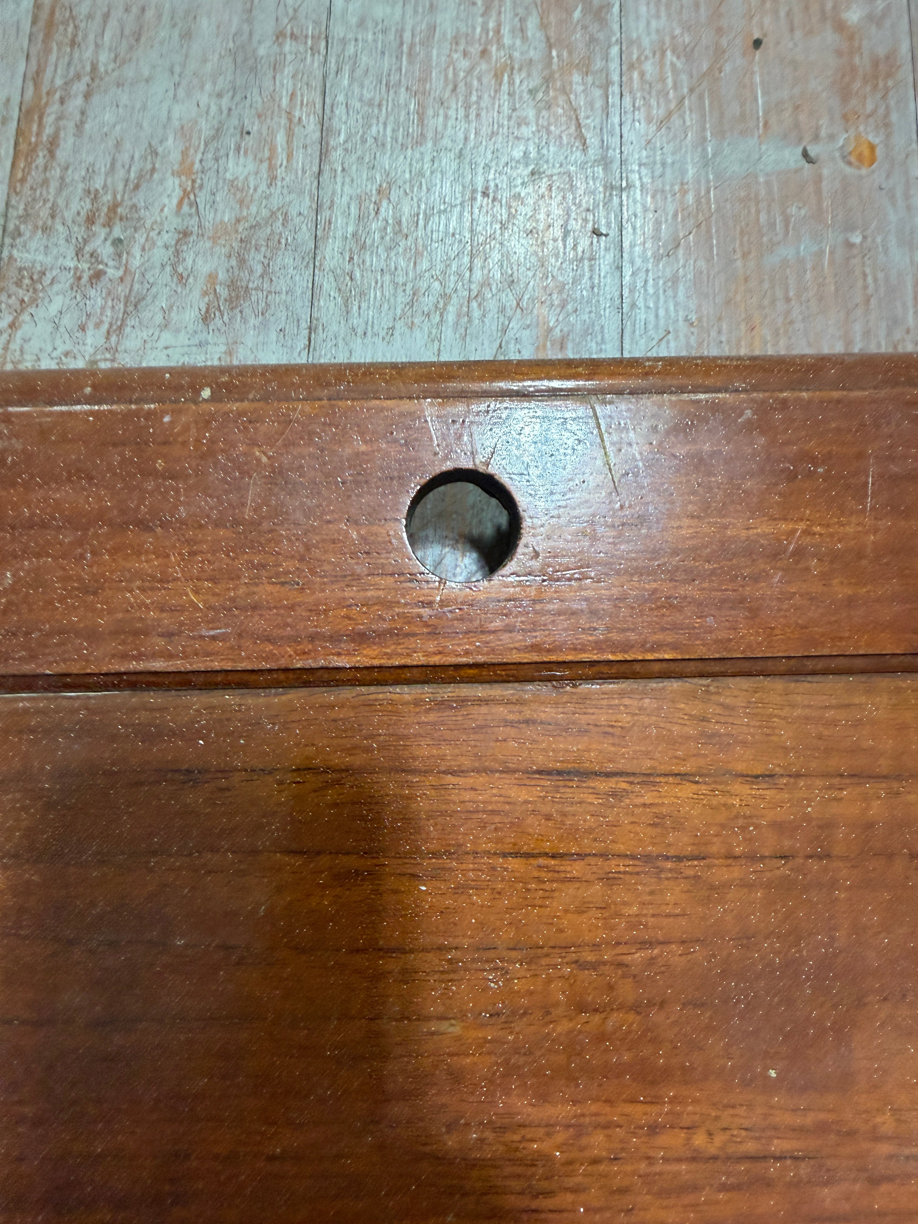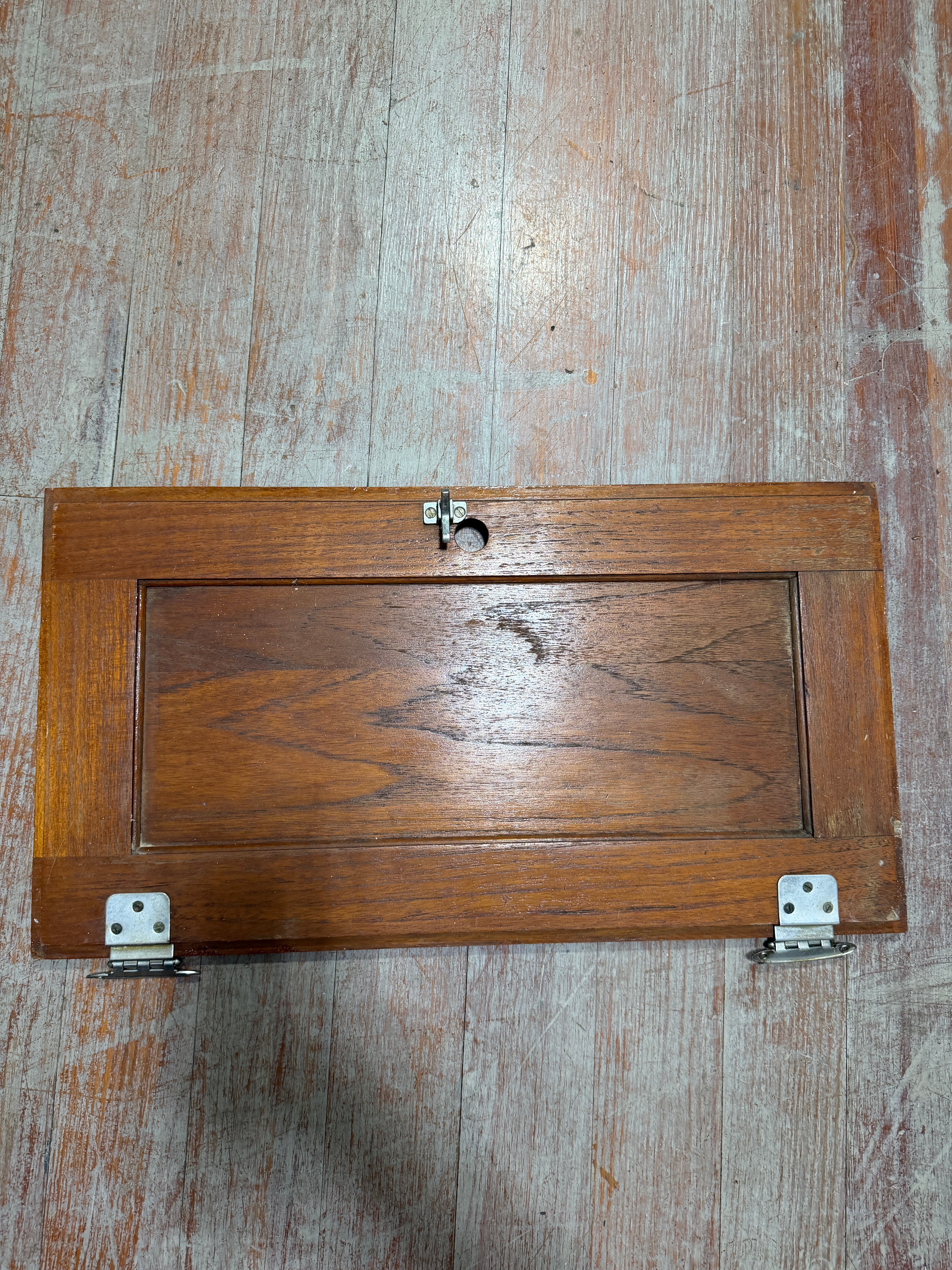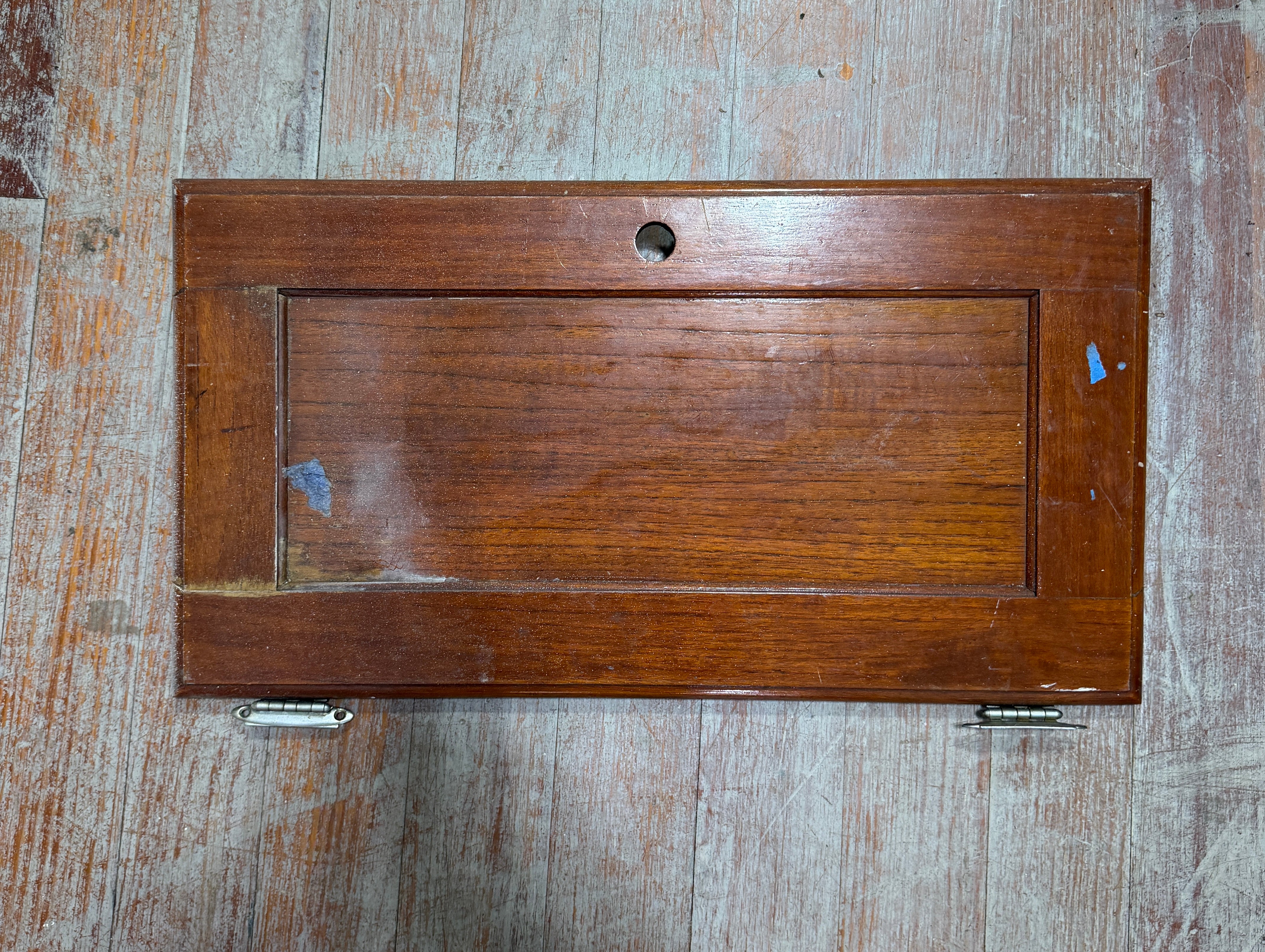This interior cabinet door was removed off a Columbia 36 sailboat. The door is in good condition and the hinges are good though 1 is slightly bent. The inside diameter of the door measures 21" long x 10 7/8" wide x 3/8" thick. The outside diameter of the door measures 21 3/4" long x 11 5/8" wide. Usual scratching. Some slight varnish issues.