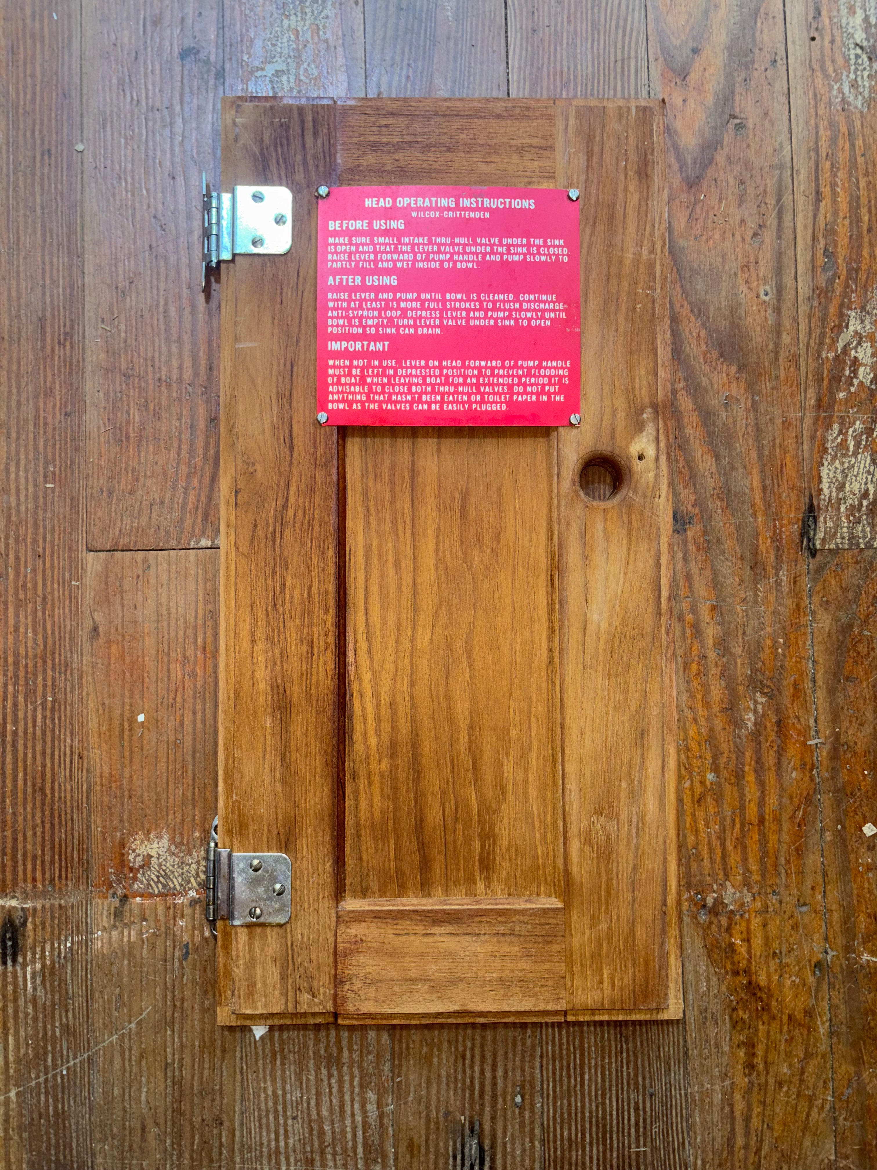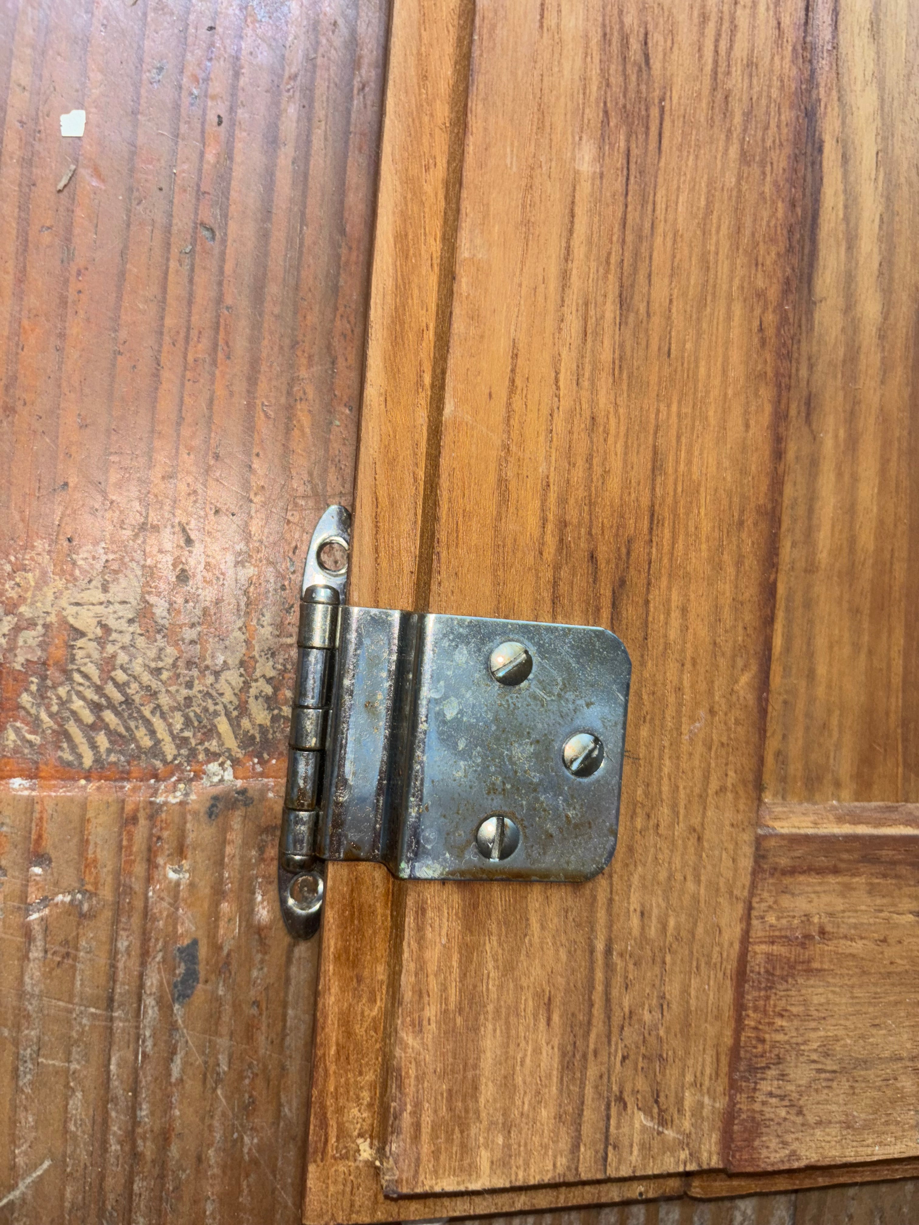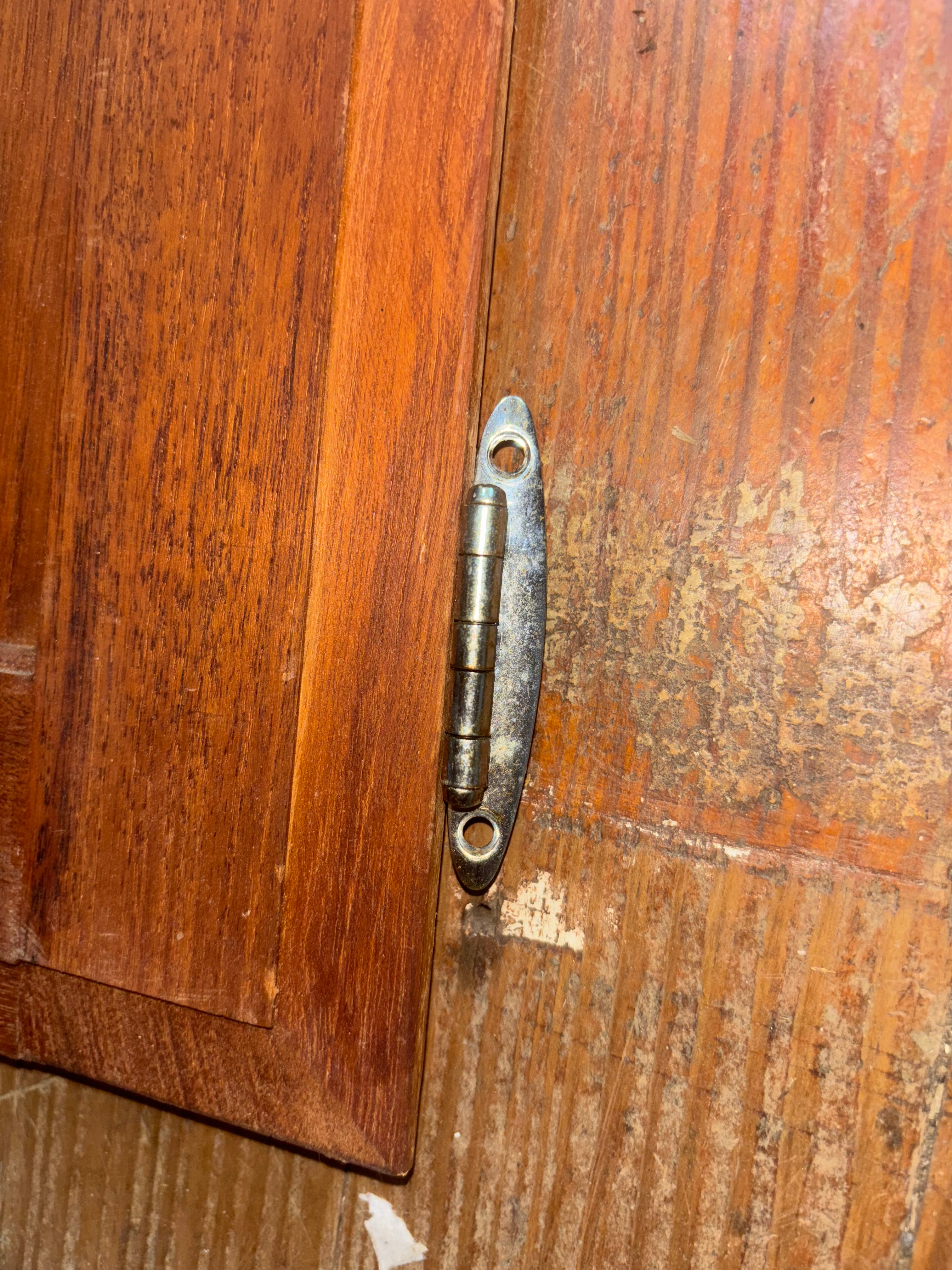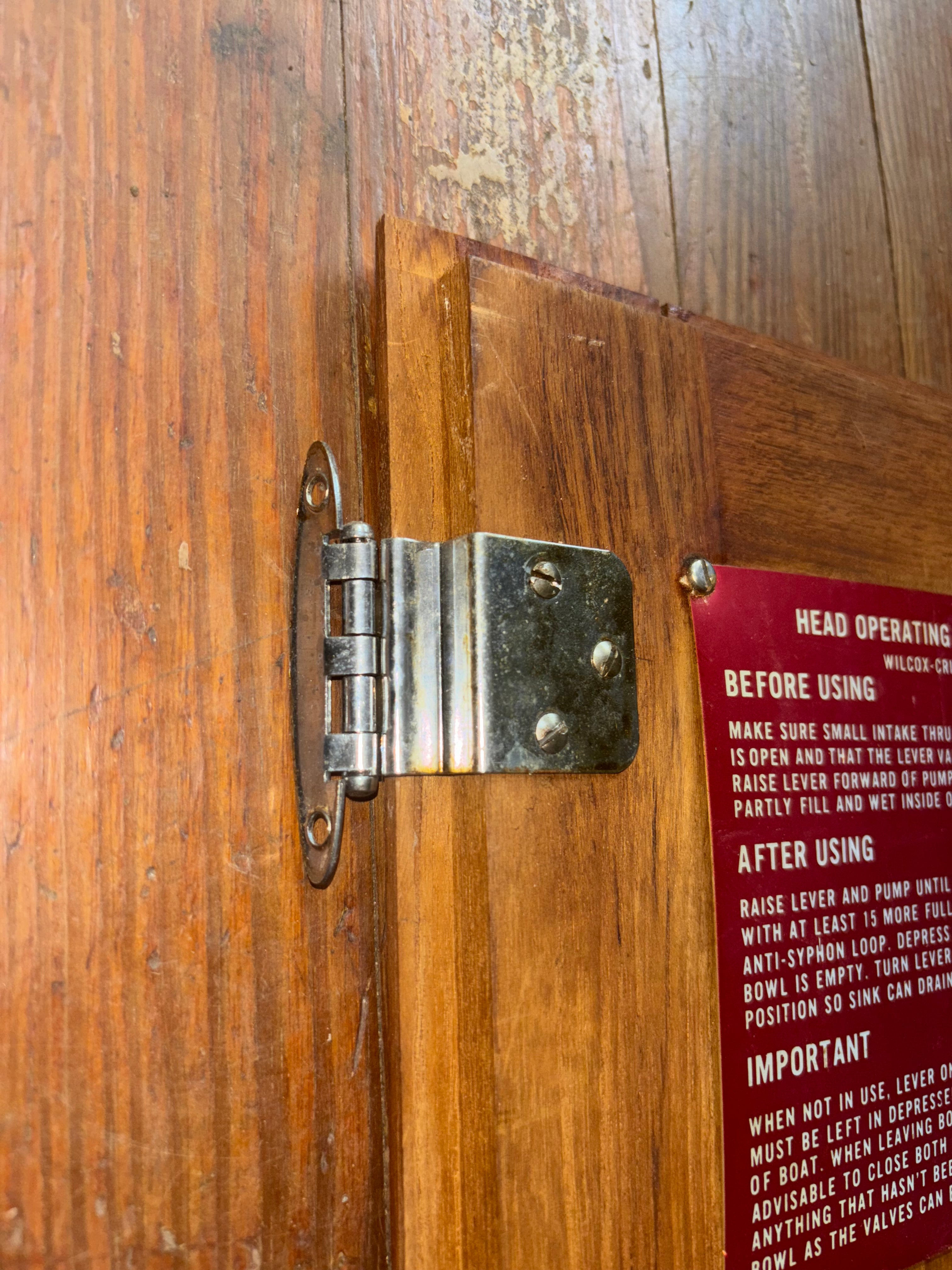 This interior left side cabinet door was removed off a Columbia 8.7 sailboat. The inside diameter of this door is 19 3/4" long x 9 1/4" wide. The outside diameter is 20 1/2" long x 10" wide. Has usual surface scratching. The hinges are in good shape!