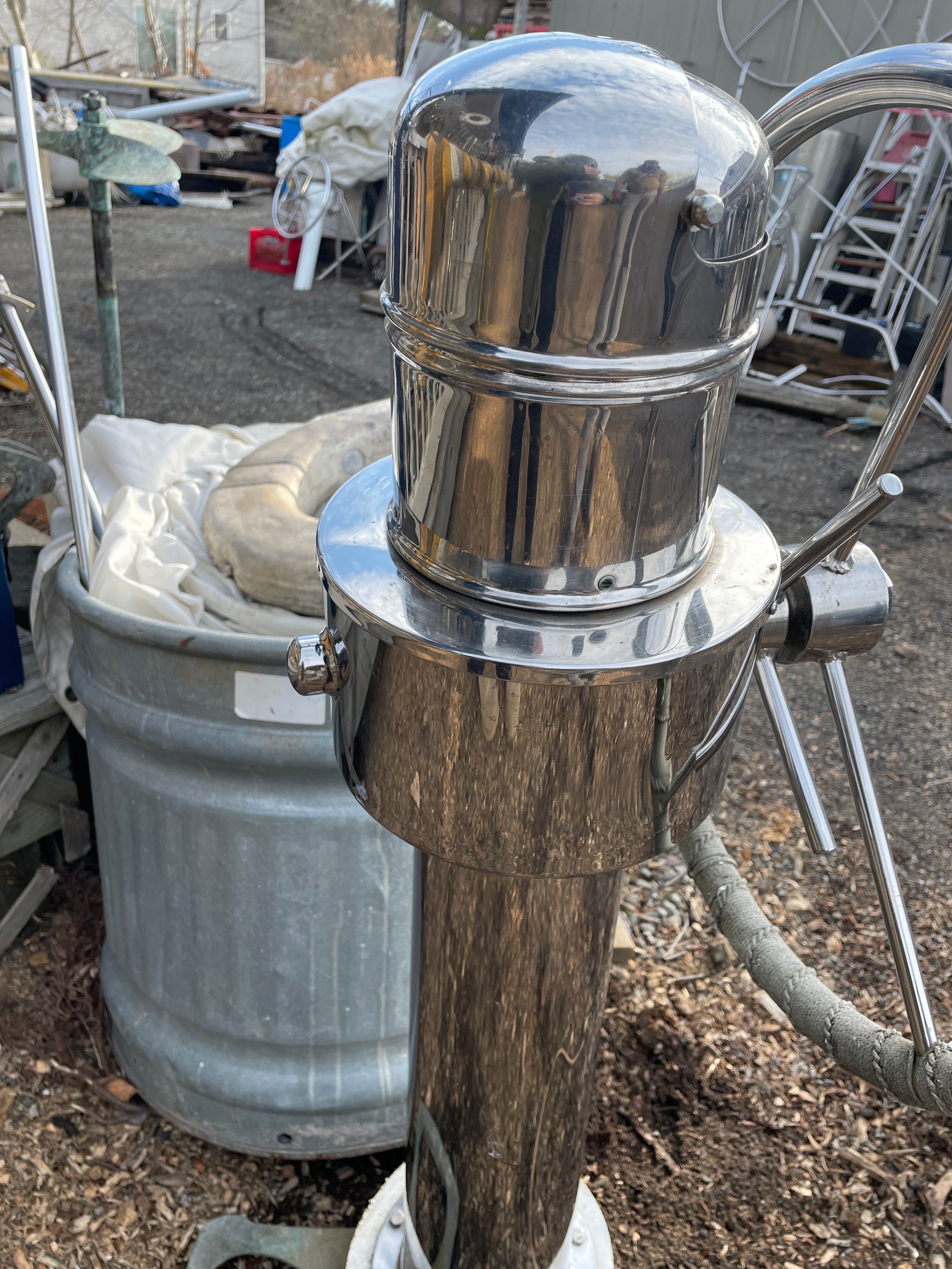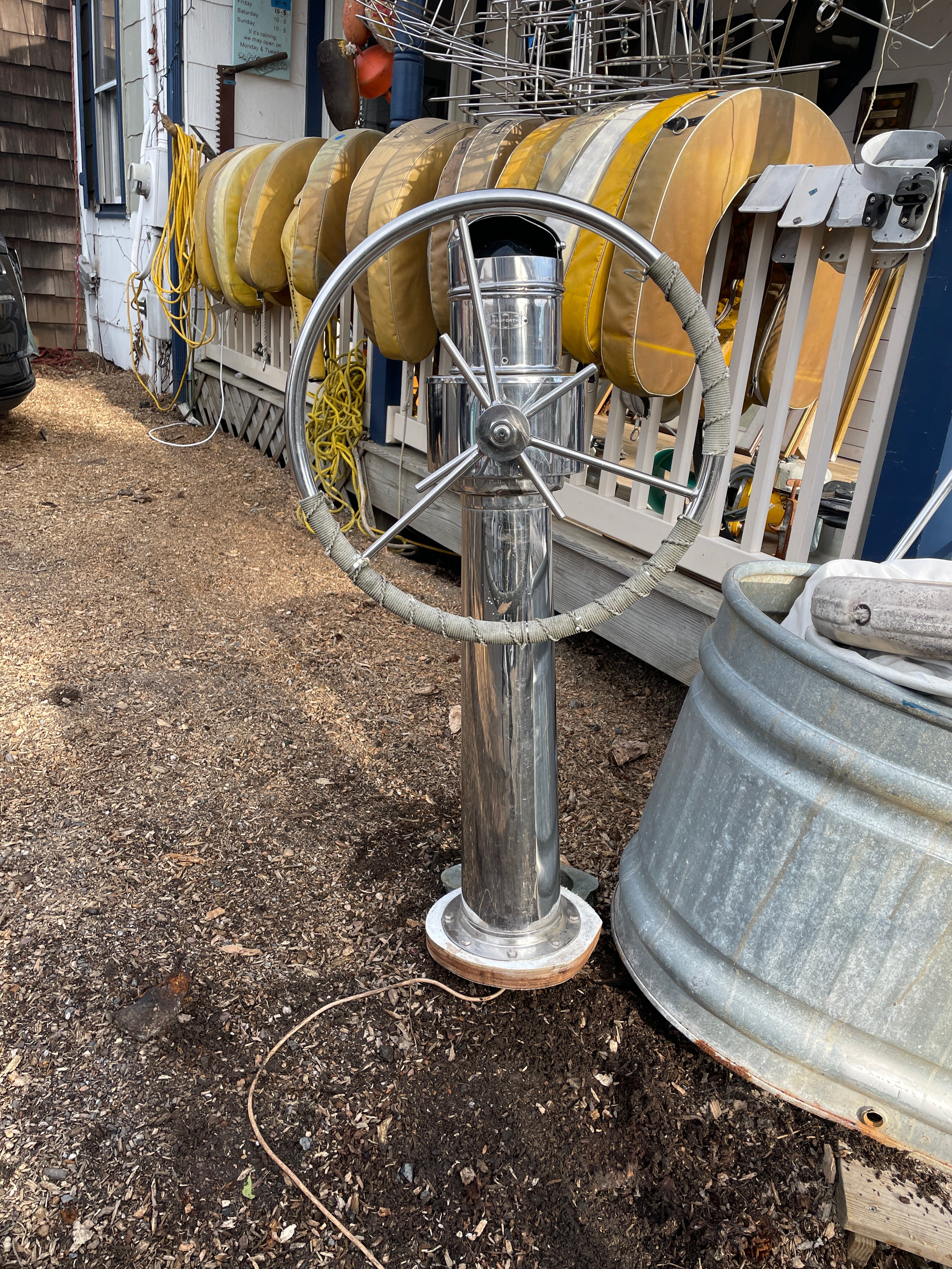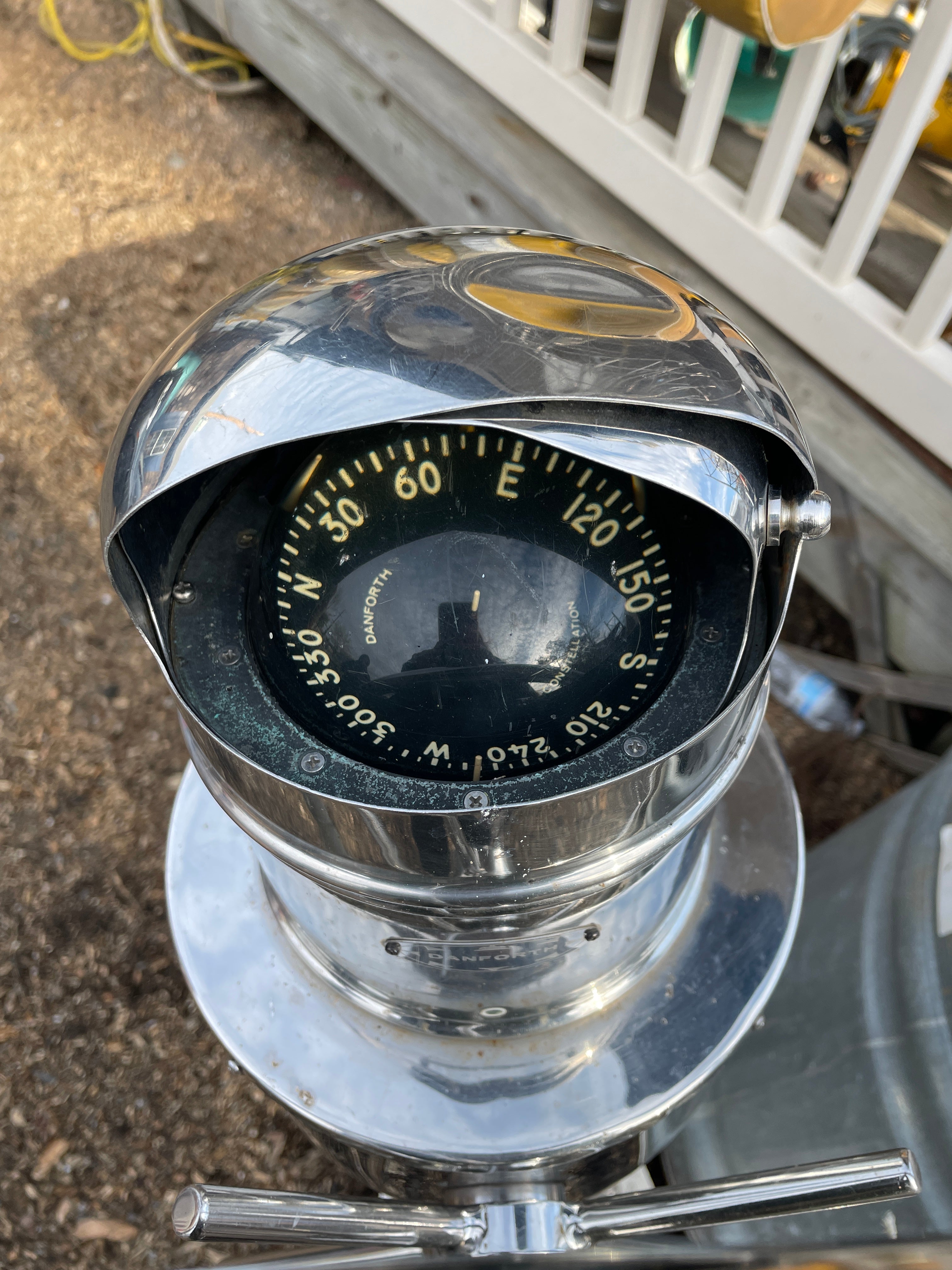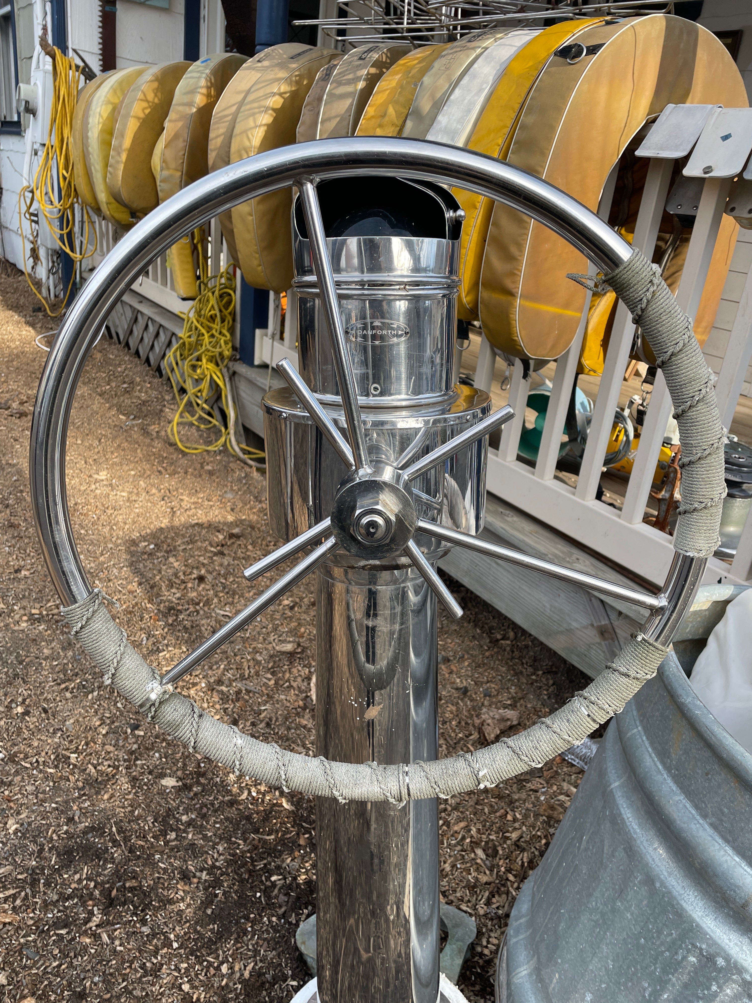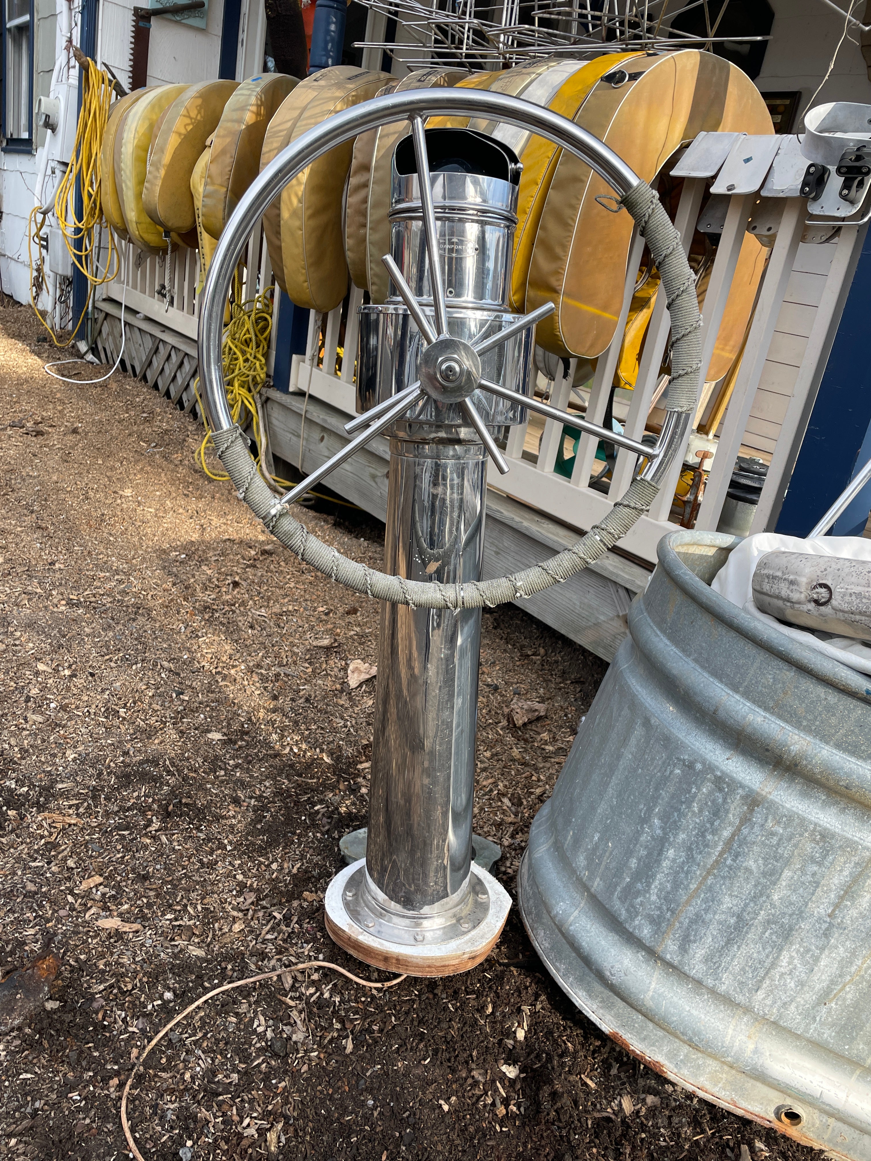 This complete stainless steel pedestal system is in excellent condition. Being all stainless you have your usual small dings and dents but there is no major issues. This pedestal stands 40” total height (this is from the base to the top of the compass). The wheel is 21” diameter. This compass comes with a Ritchie Constellation Compass that sits inside a very nice danforth housing. The housing does have the usual issue where the lid that slides is not connected. So it does not slide smoothly. The compass with housing is 9” diameter. The very base of the pedestal is 8” diameter. This particular pedestal does not have the pulley wheel system at the base. It has this bar that was connected for steering. This pedestal is insanely heavy. It will be a local pick up item only.