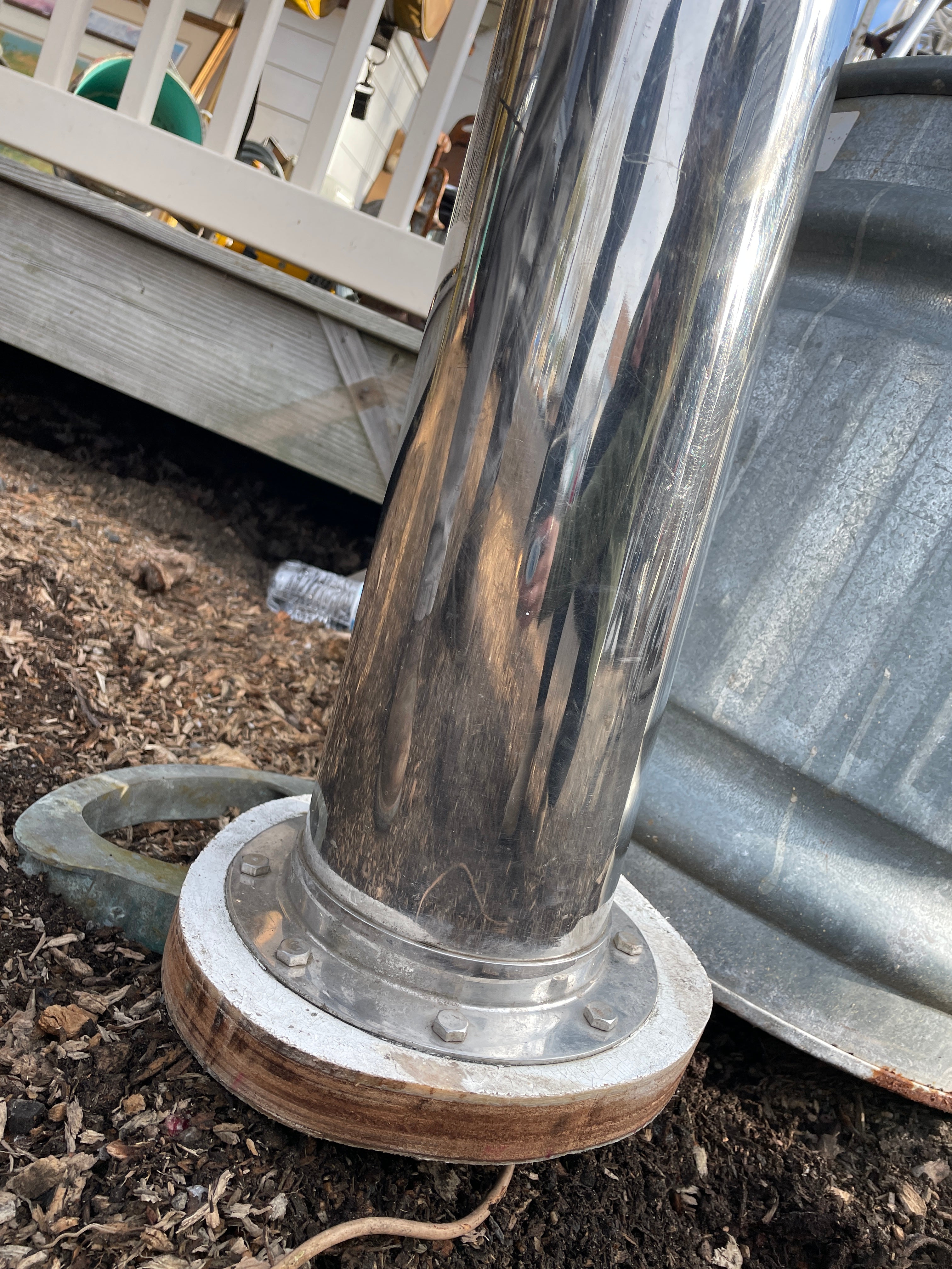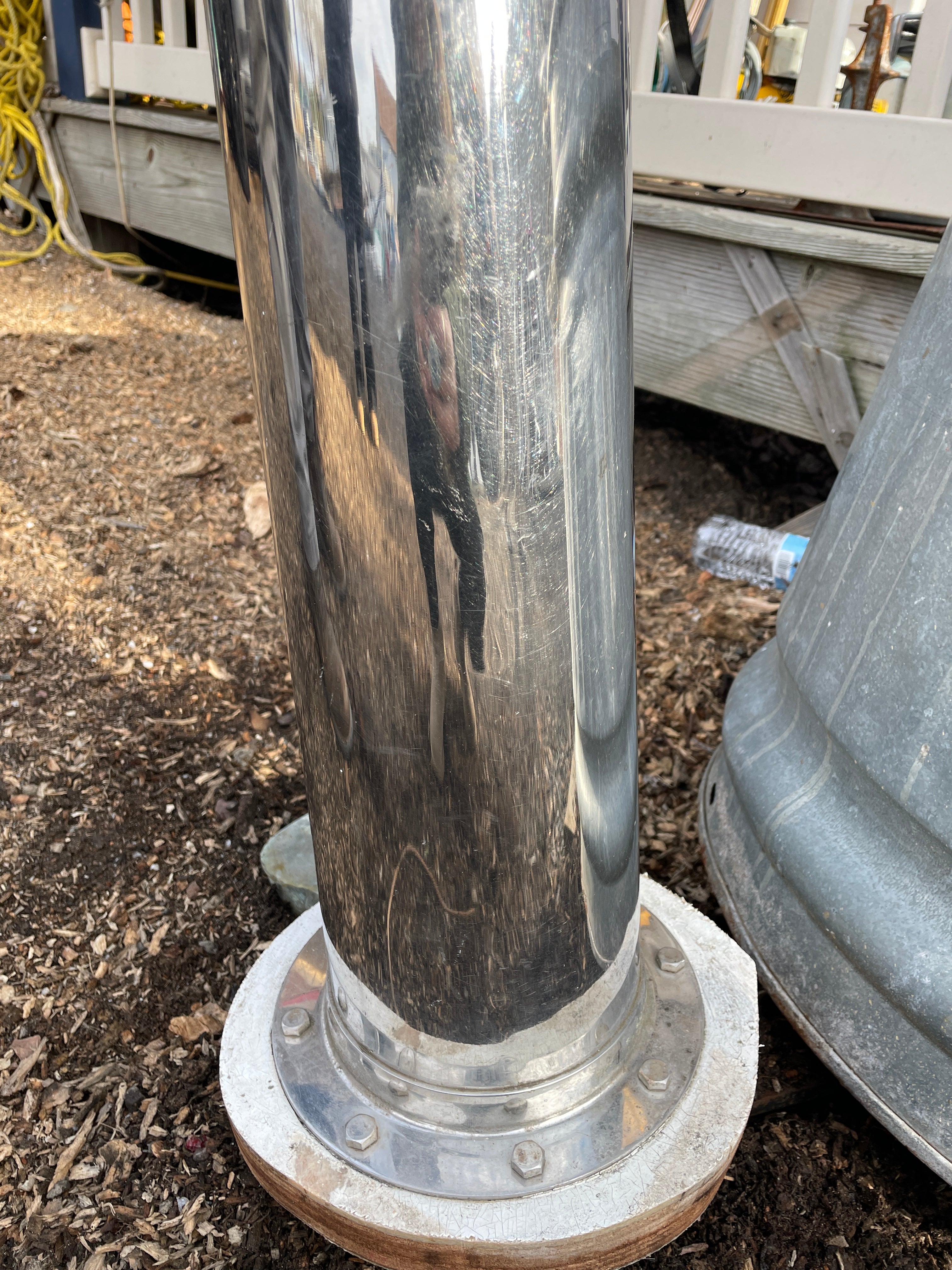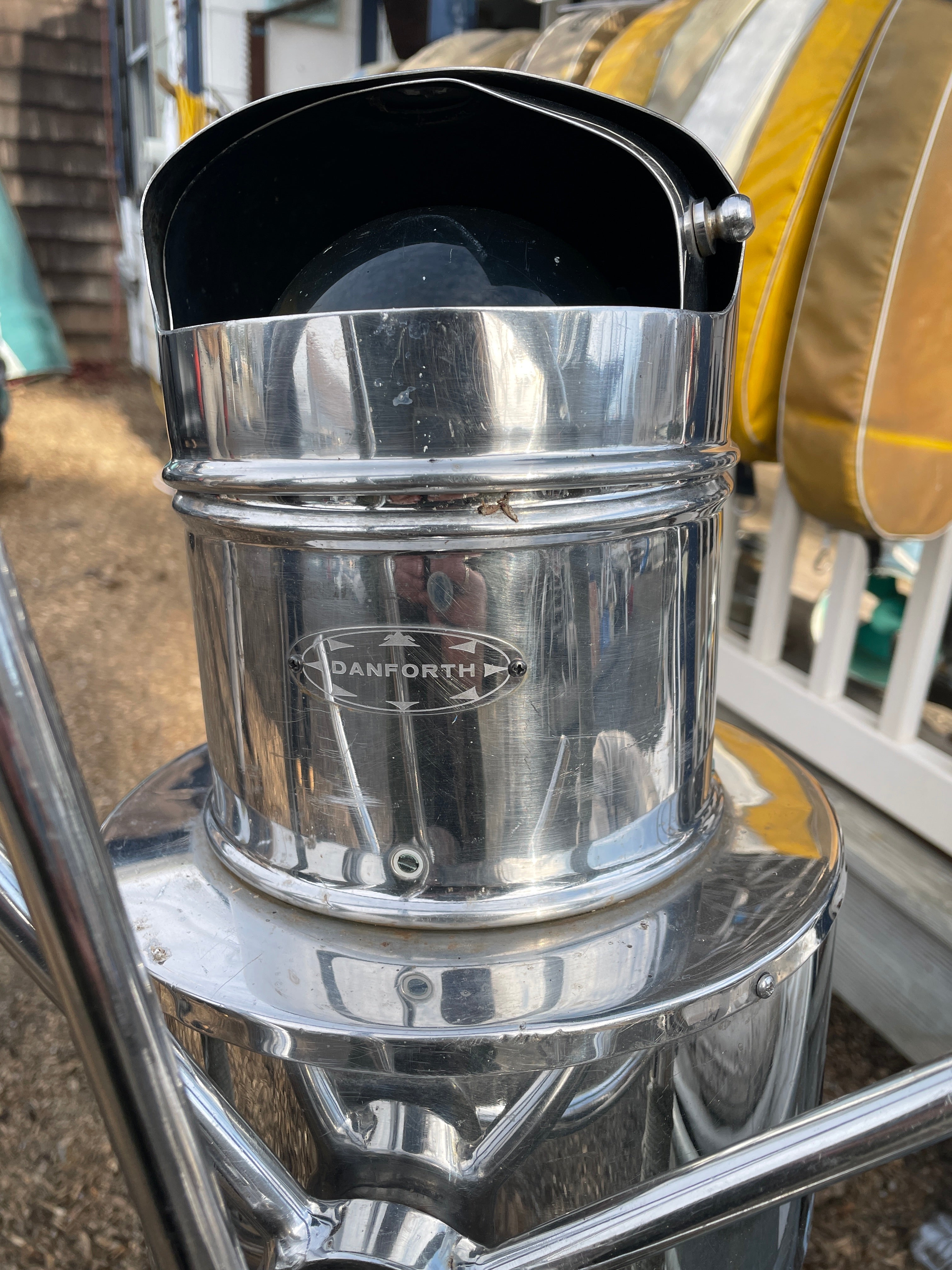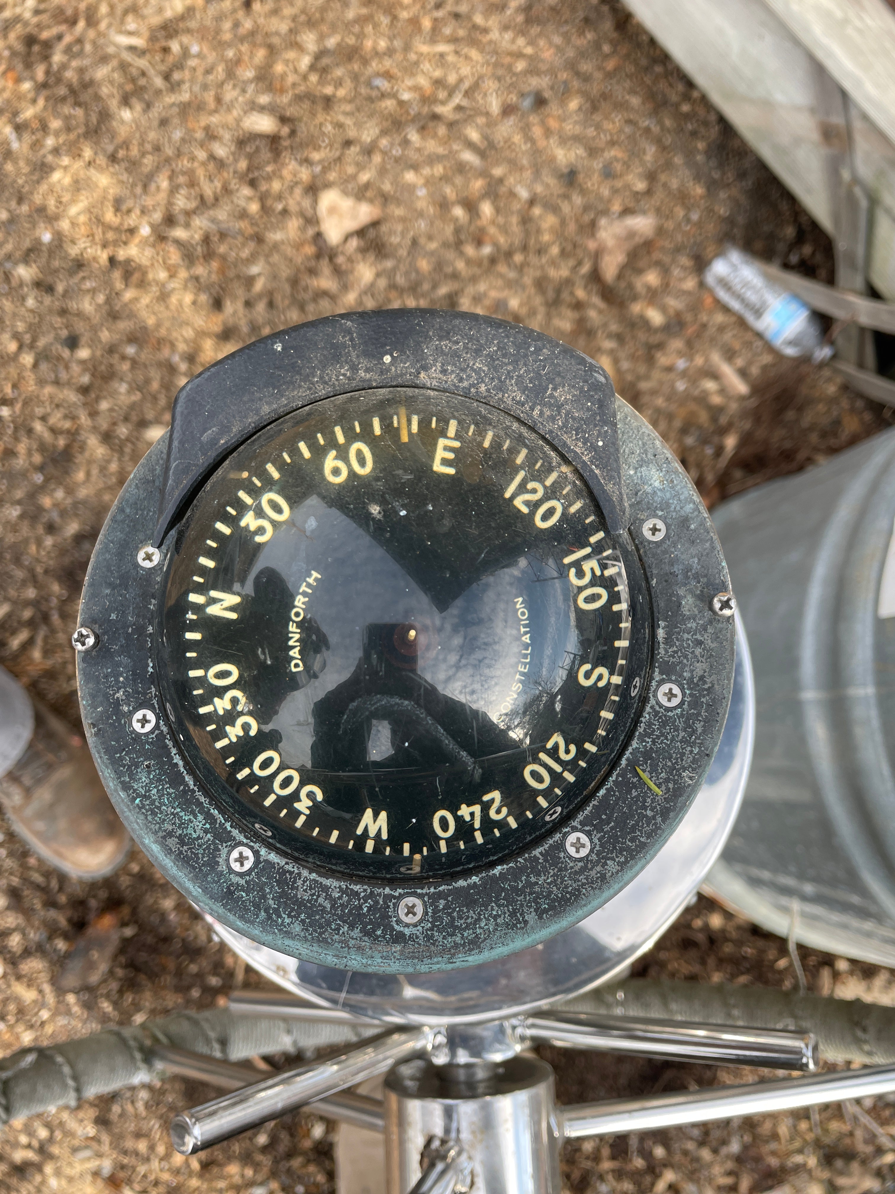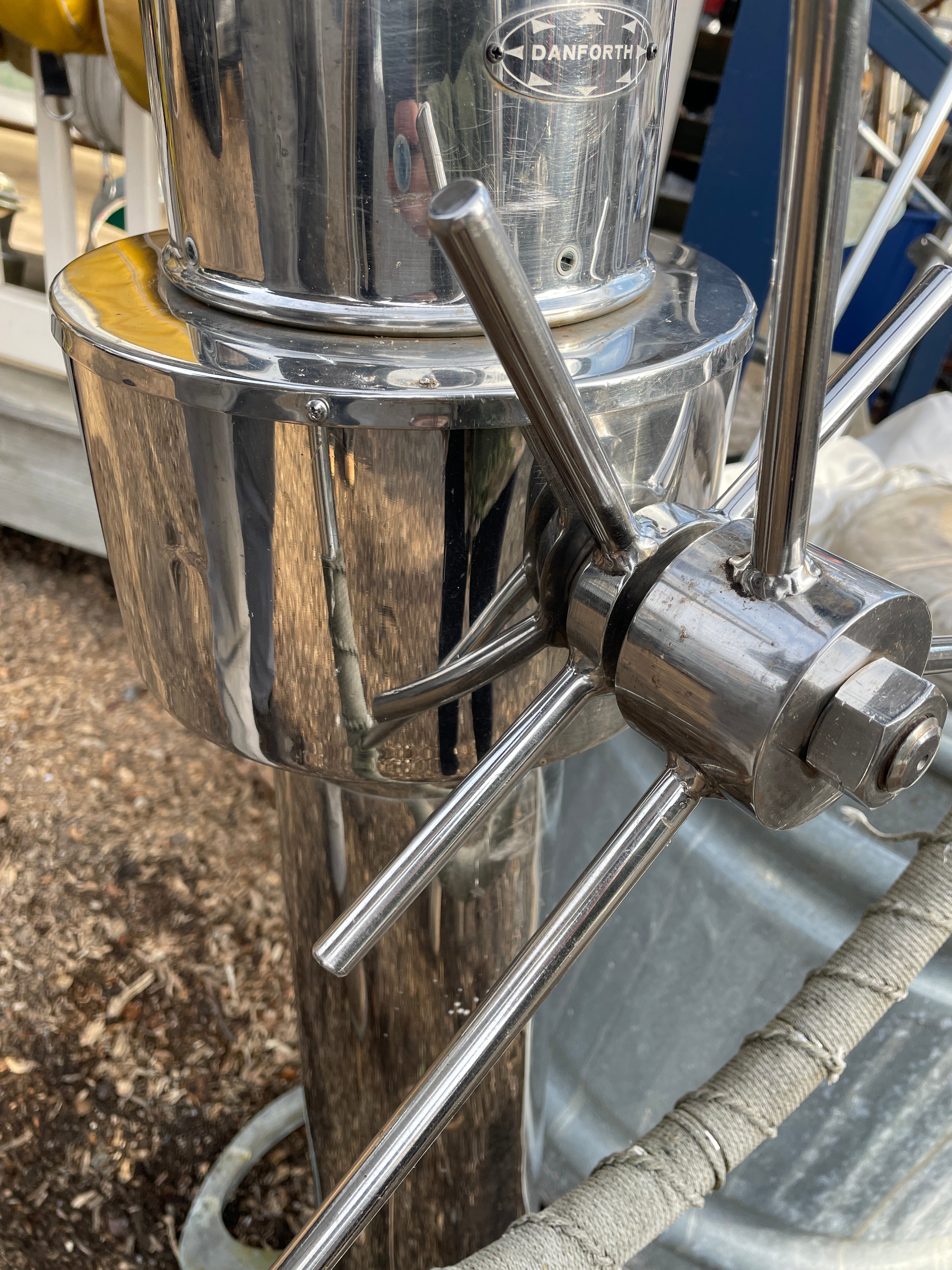 This complete stainless steel pedestal system is in excellent condition. Being all stainless you have your usual small dings and dents but there is no major issues. This pedestal stands 40” total height (this is from the base to the top of the compass). The wheel is 21” diameter. This compass comes with a Ritchie Constellation Compass that sits inside a very nice danforth housing. The housing does have the usual issue where the lid that slides is not connected. So it does not slide smoothly. The compass with housing is 9” diameter. The very base of the pedestal is 8” diameter. This particular pedestal does not have the pulley wheel system at the base. It has this bar that was connected for steering. This pedestal is insanely heavy. It will be a local pick up item only.