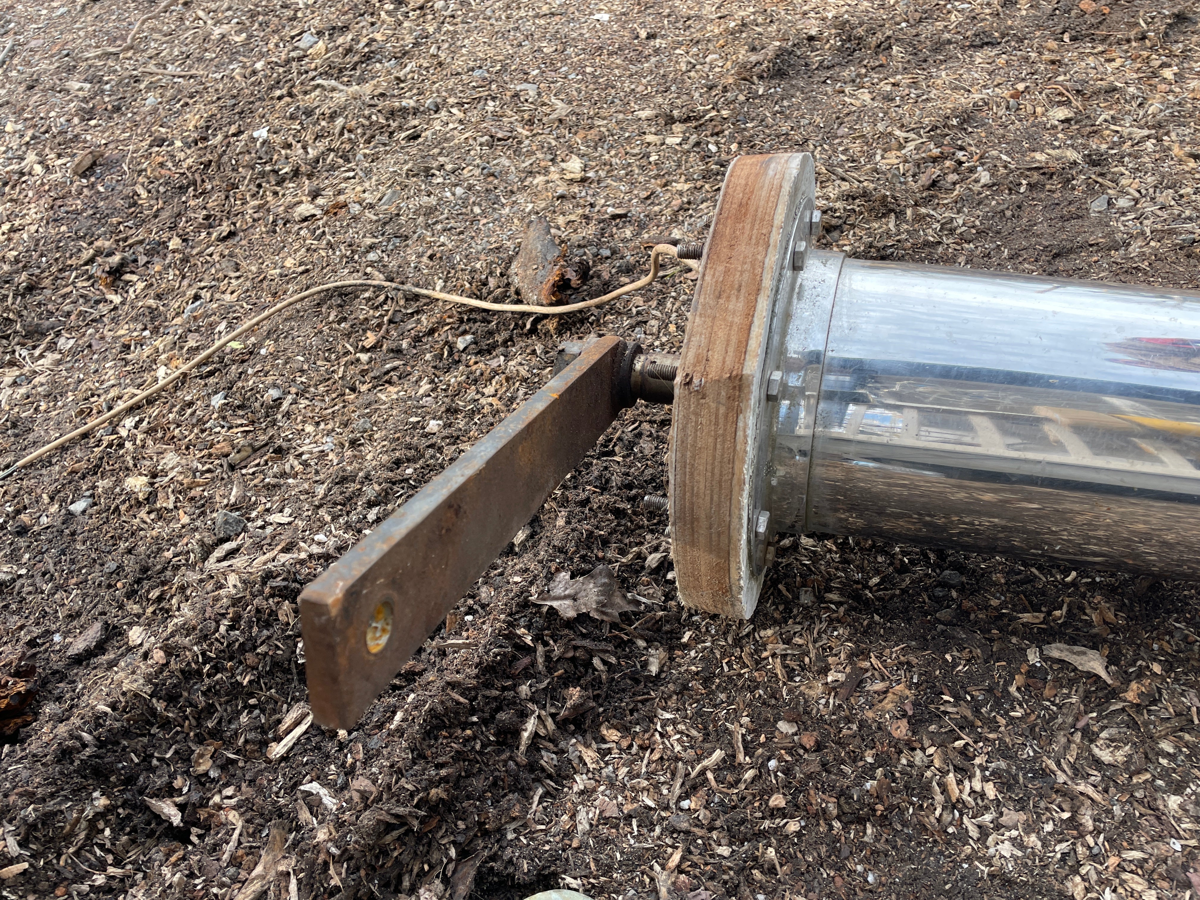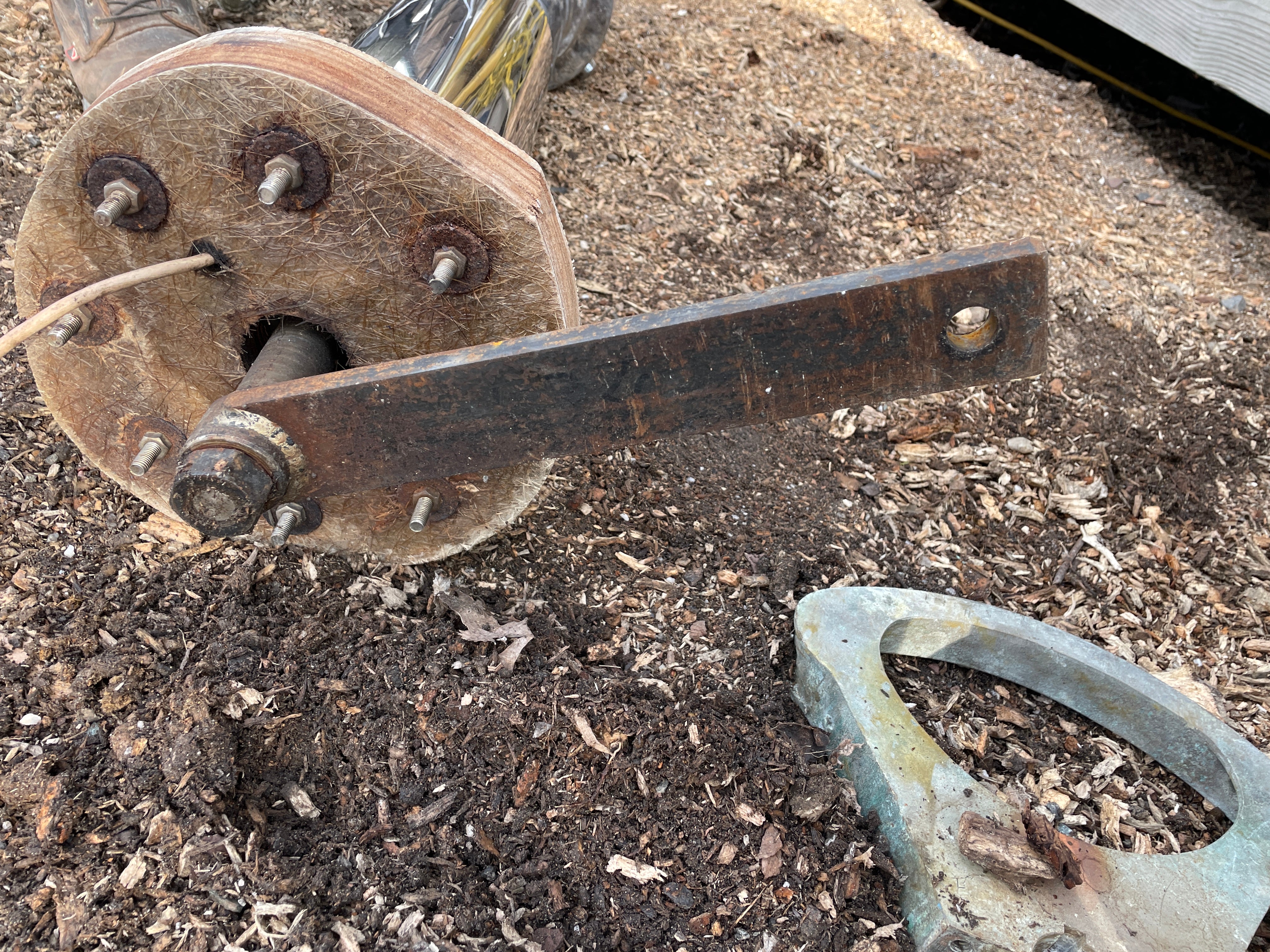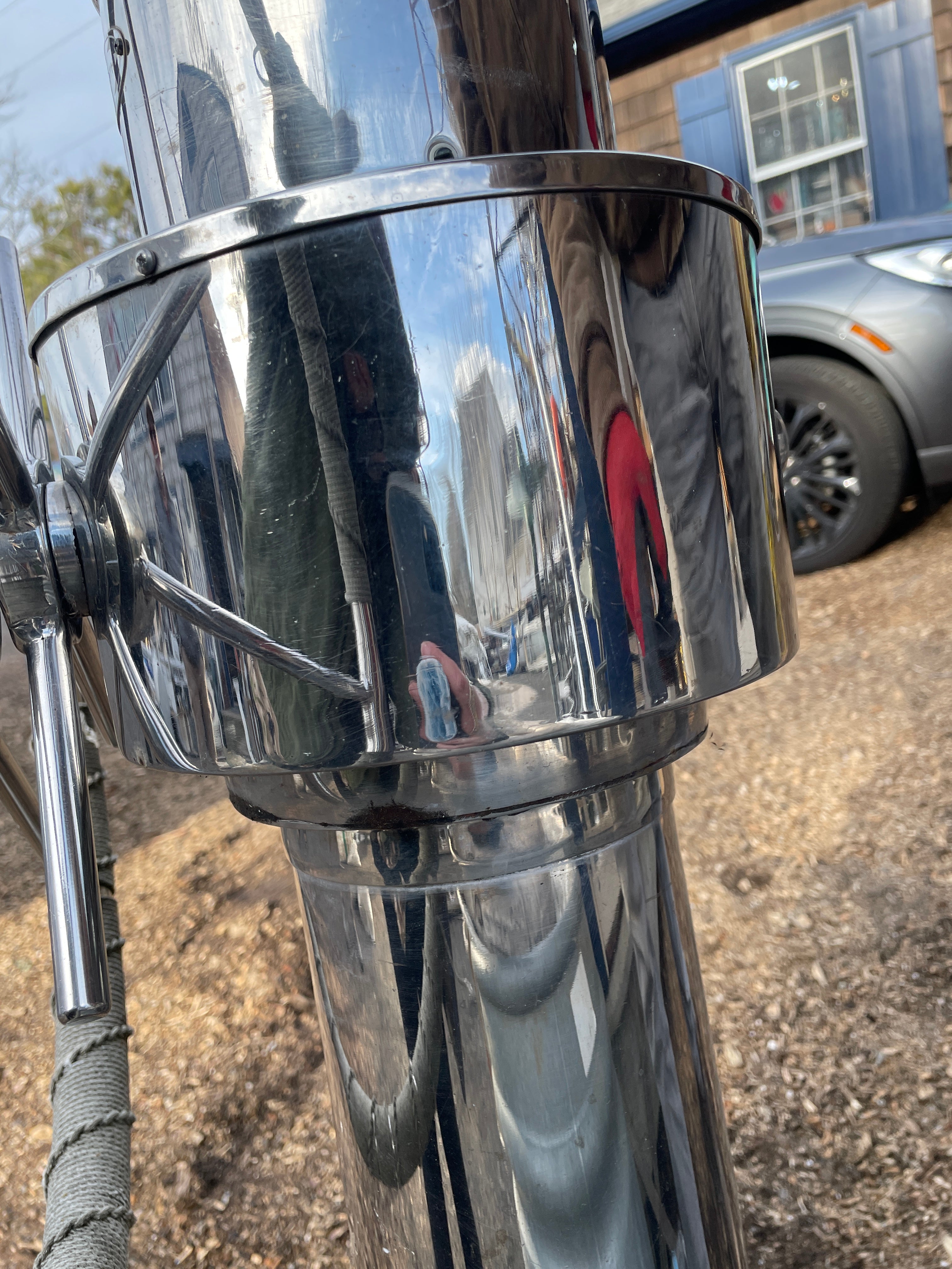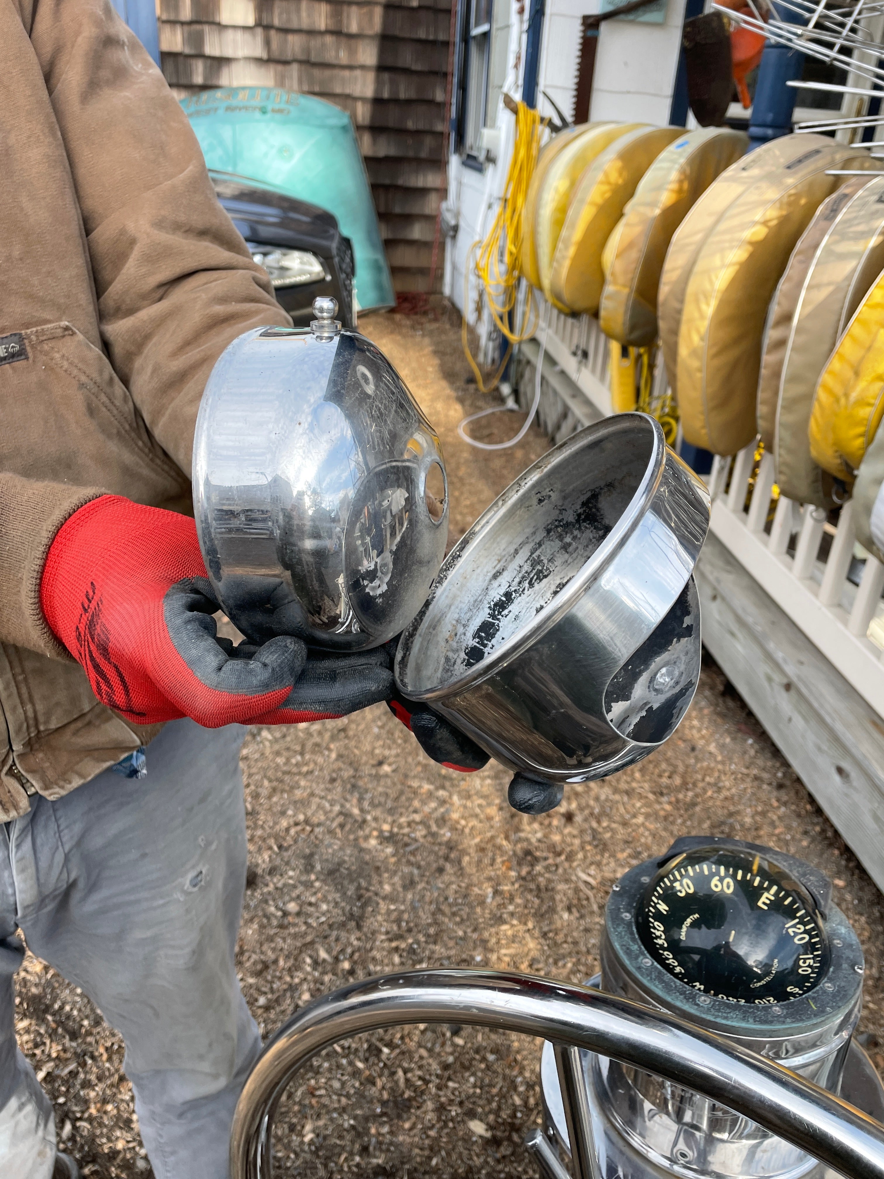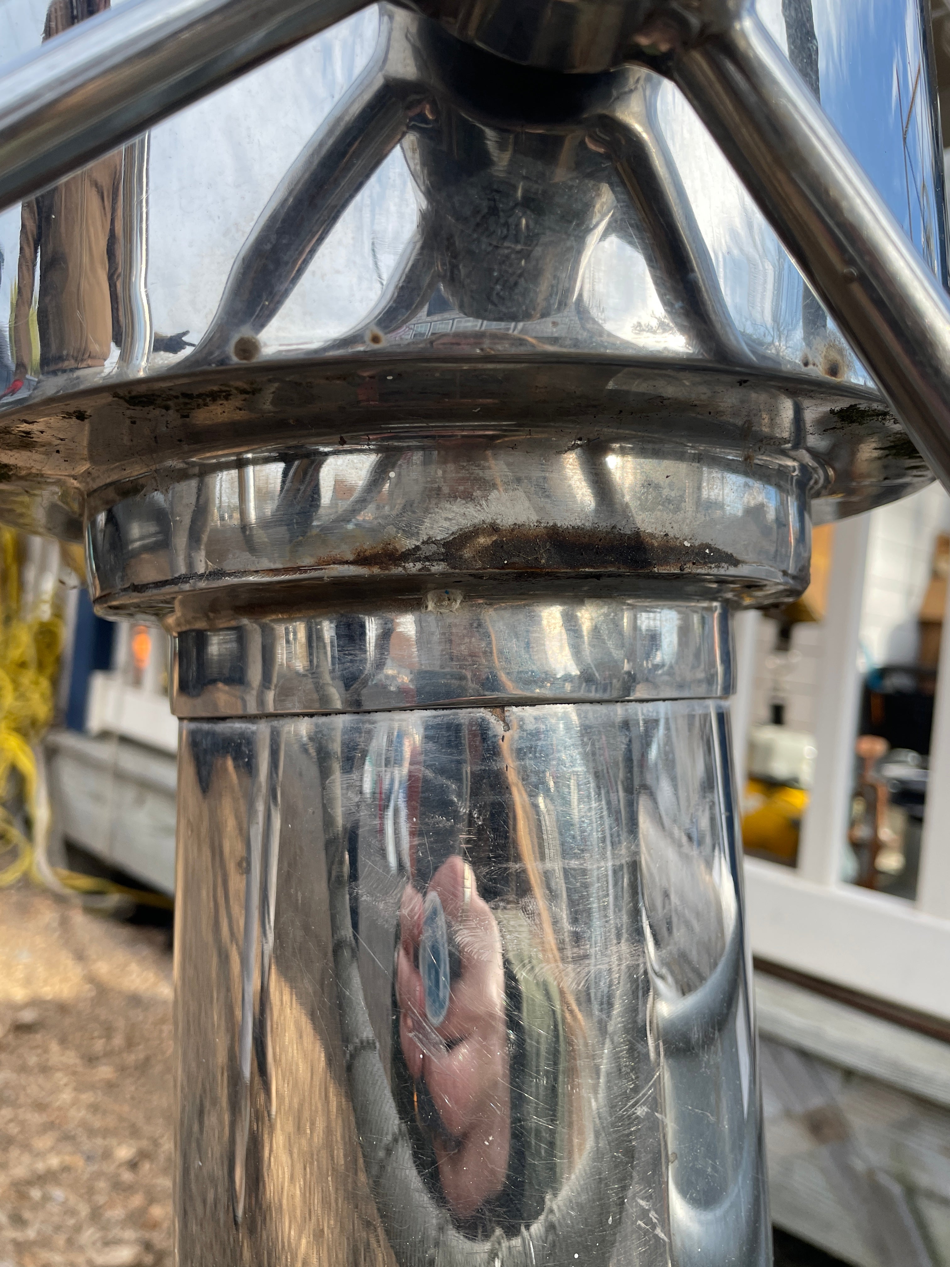 This complete stainless steel pedestal system is in excellent condition. Being all stainless you have your usual small dings and dents but there is no major issues. This pedestal stands 40” total height (this is from the base to the top of the compass). The wheel is 21” diameter. This compass comes with a Ritchie Constellation Compass that sits inside a very nice danforth housing. The housing does have the usual issue where the lid that slides is not connected. So it does not slide smoothly. The compass with housing is 9” diameter. The very base of the pedestal is 8” diameter. This particular pedestal does not have the pulley wheel system at the base. It has this bar that was connected for steering. This pedestal is insanely heavy. It will be a local pick up item only.