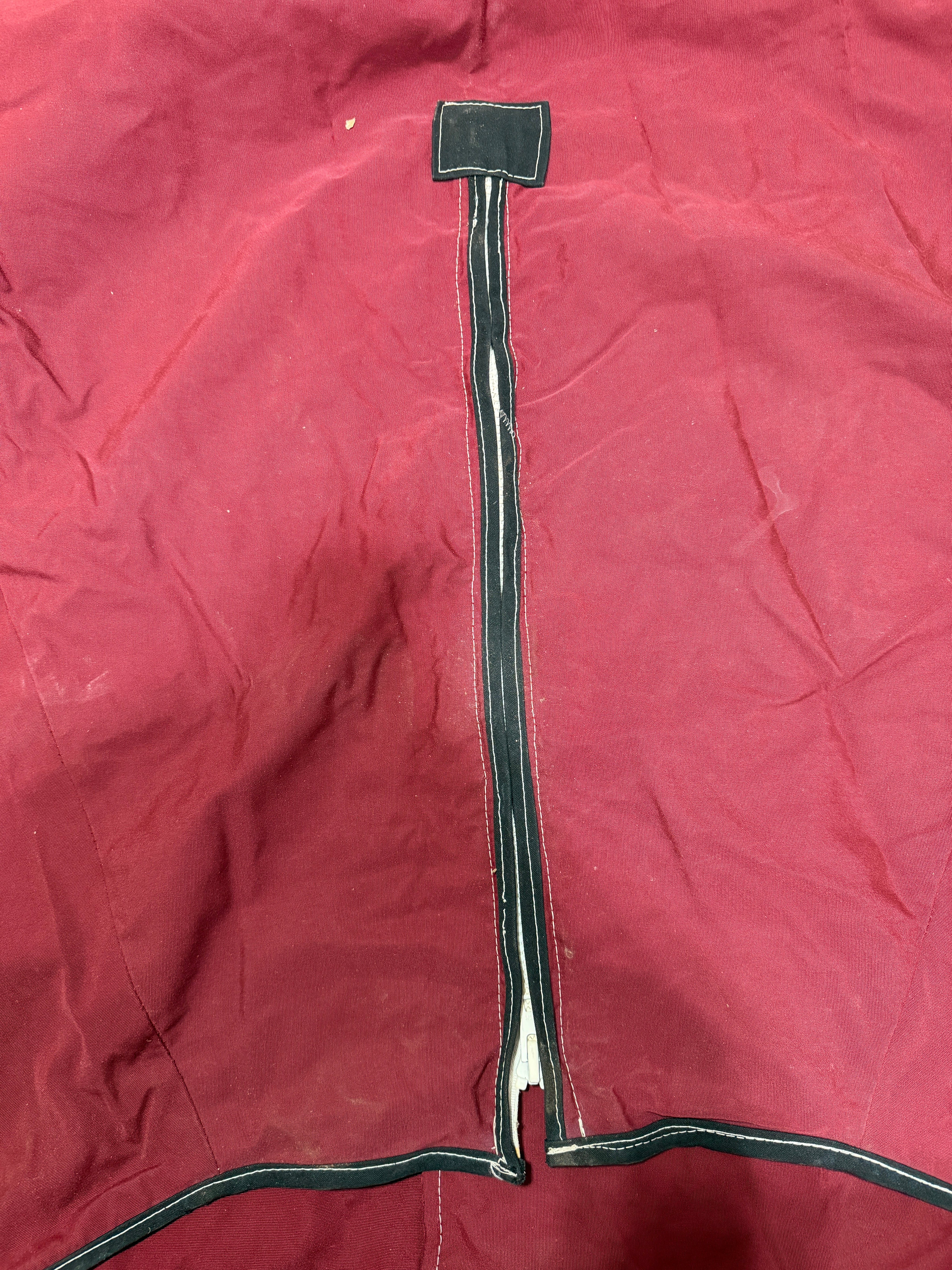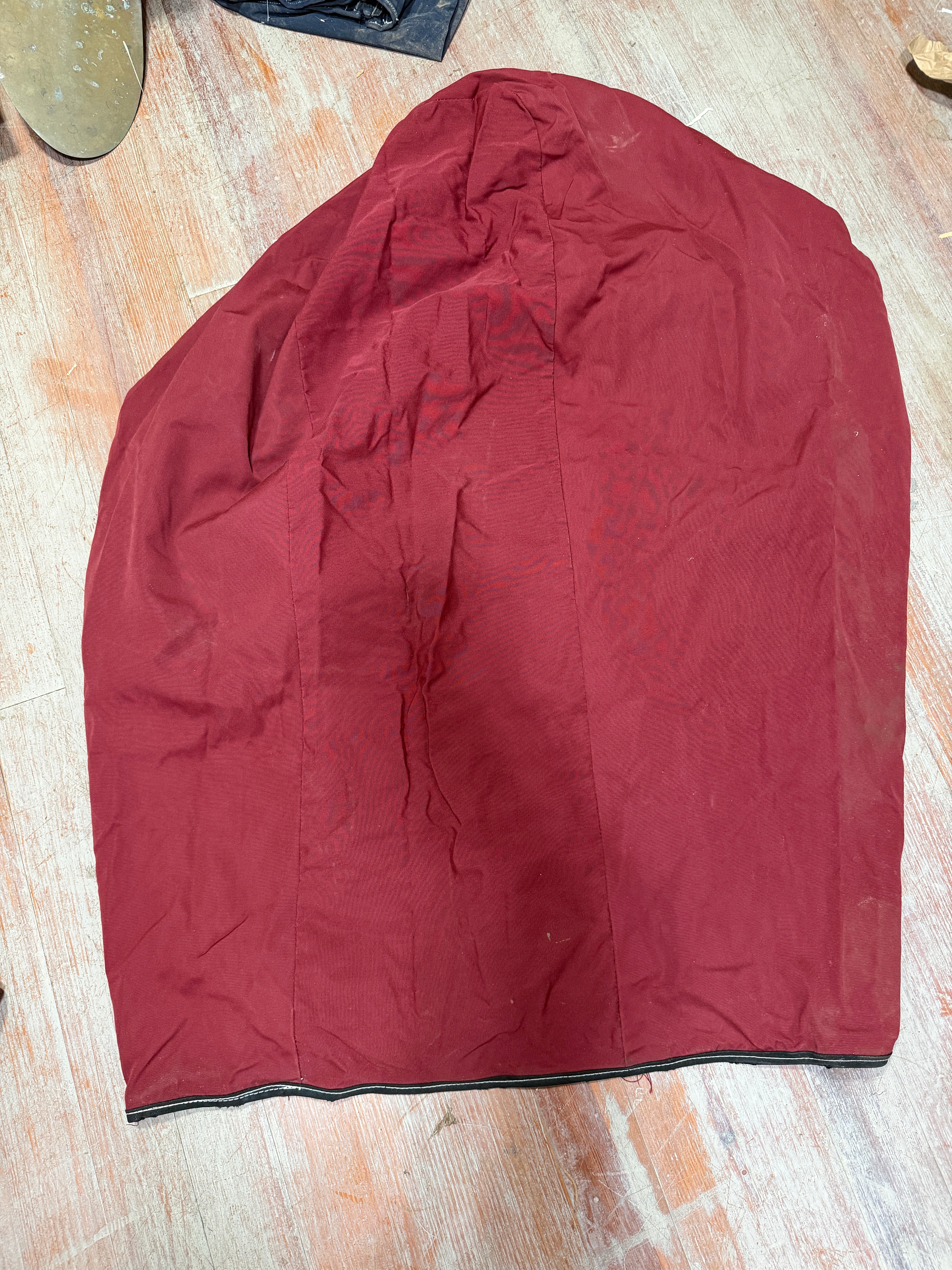 This burgundy canvas wheel cover was removed off a Coronado 30 sailboat. I believe it fits a 32" wheel. There are no major holes. All stitching good. Zipper works as should. The width at the base is 29". The total is about 44".