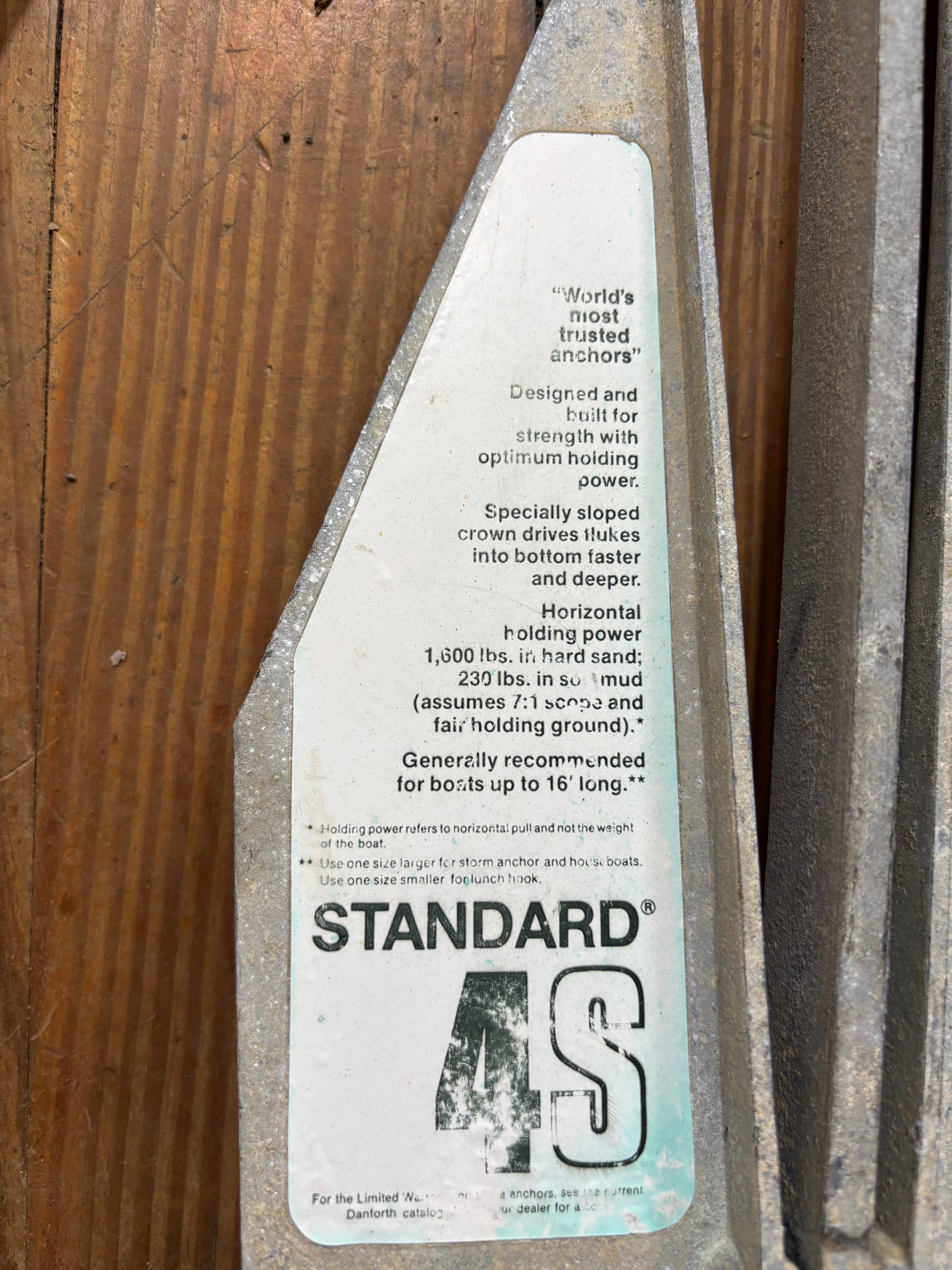 This small danfroth 4S galvanized anchor is in great condition. Works for boat sup to 16 feet in length. Horizontal holding power is 1600 pounds in soft sand. There is 3.5 feet of chain, has shackle on end.